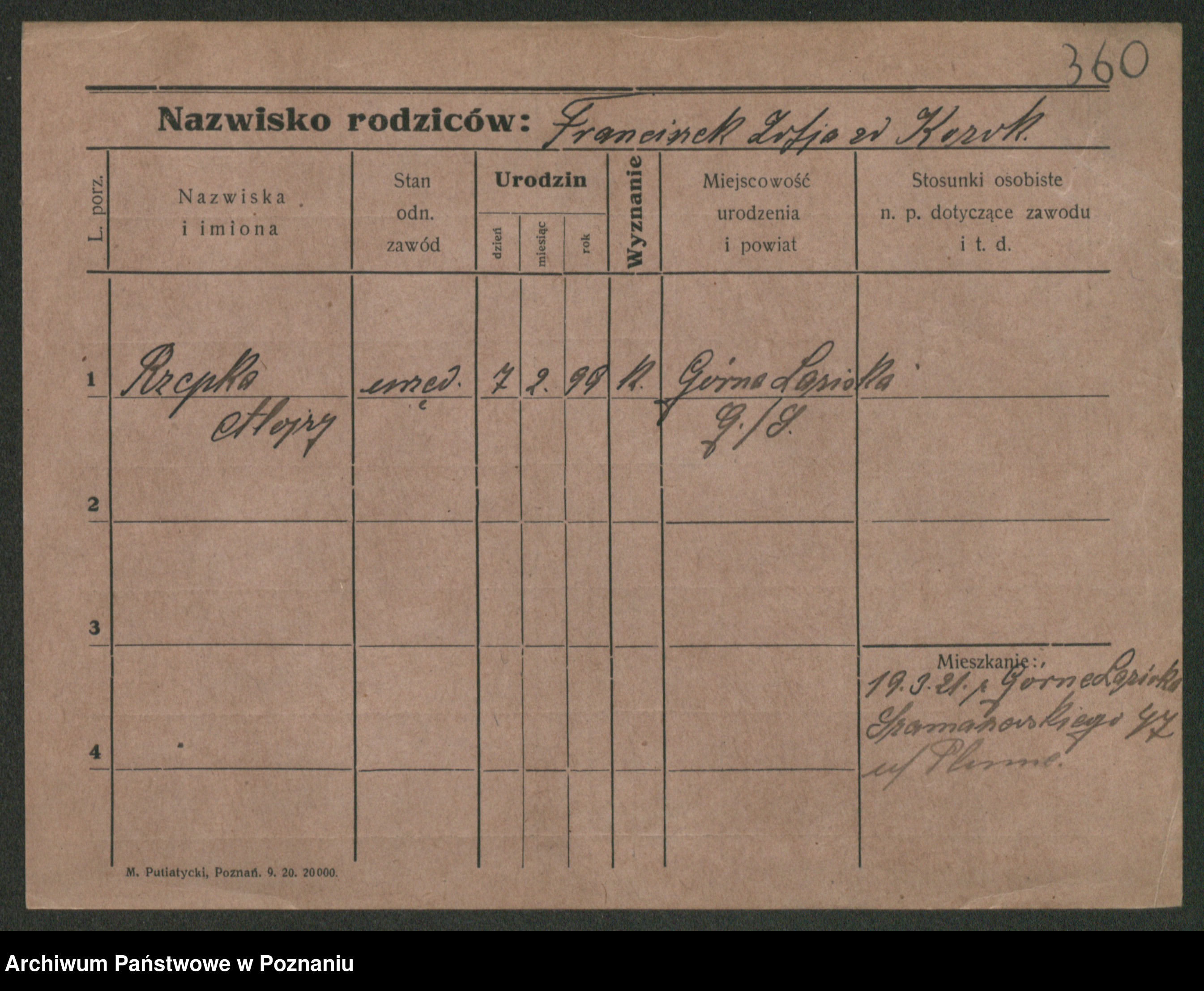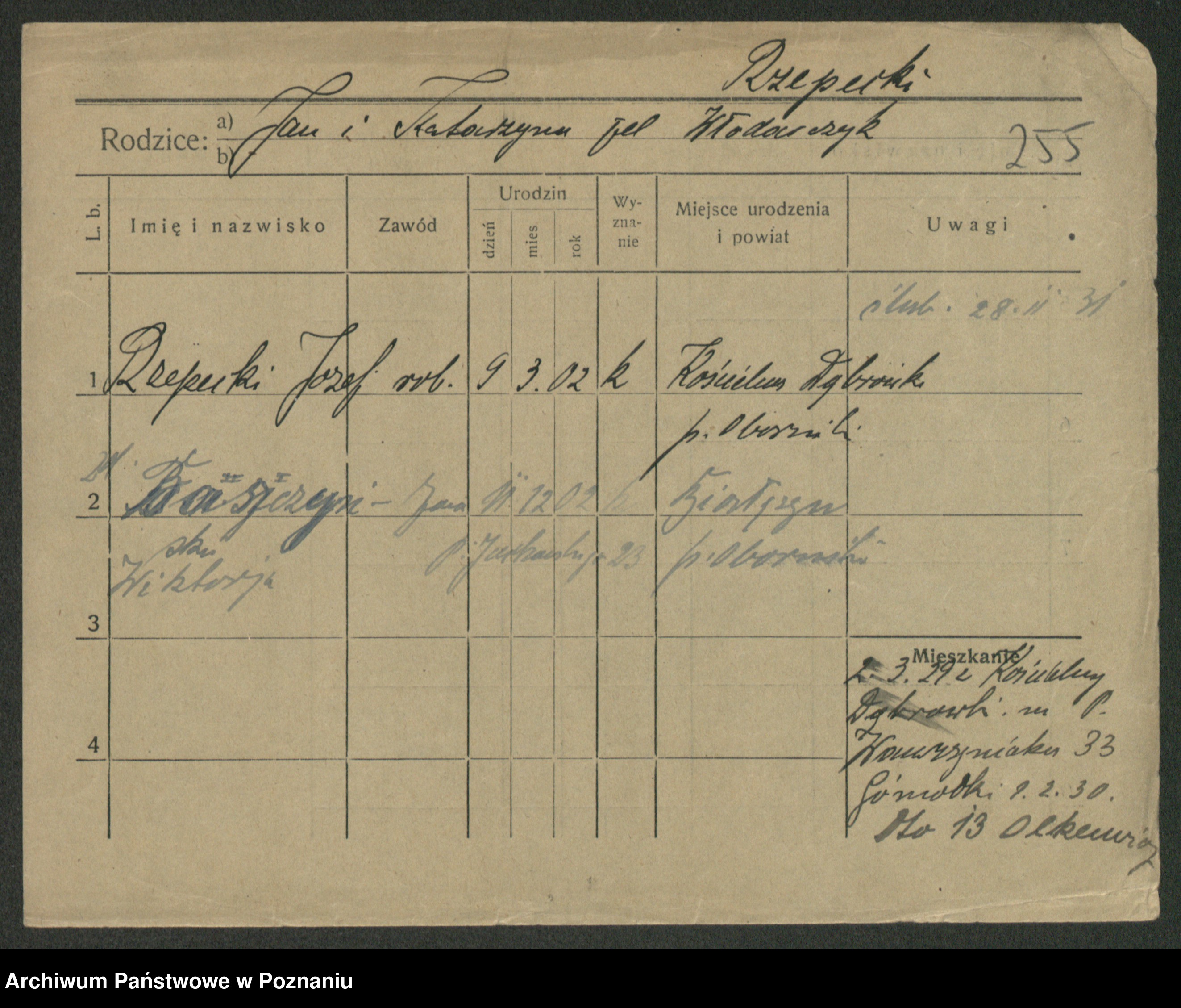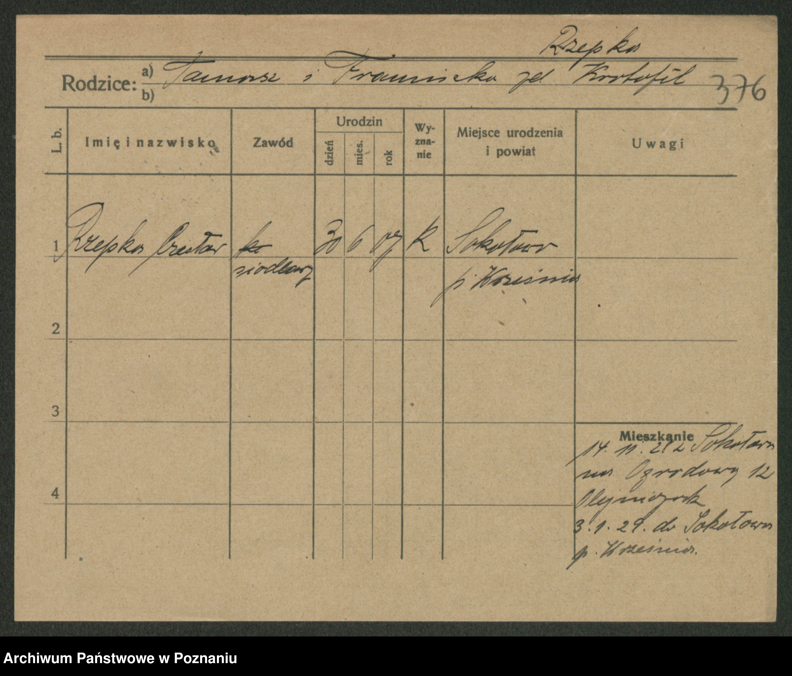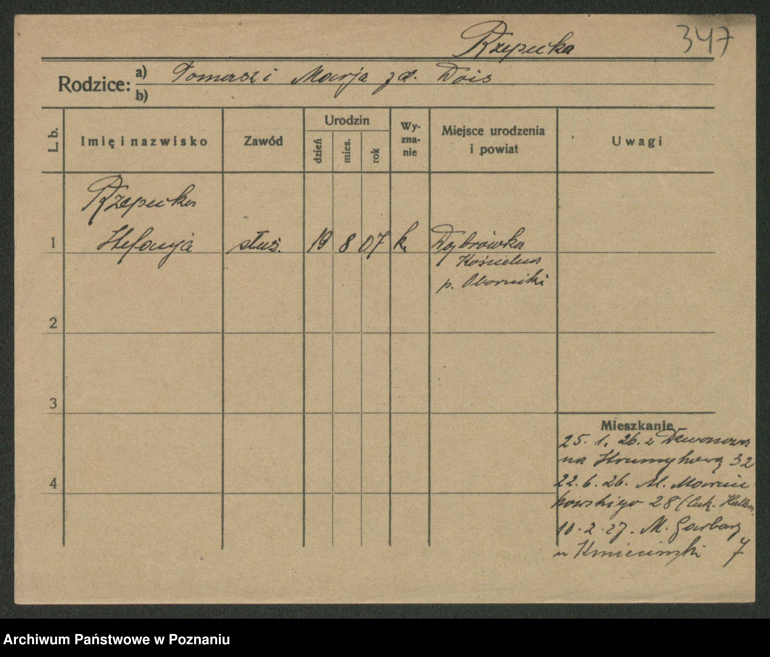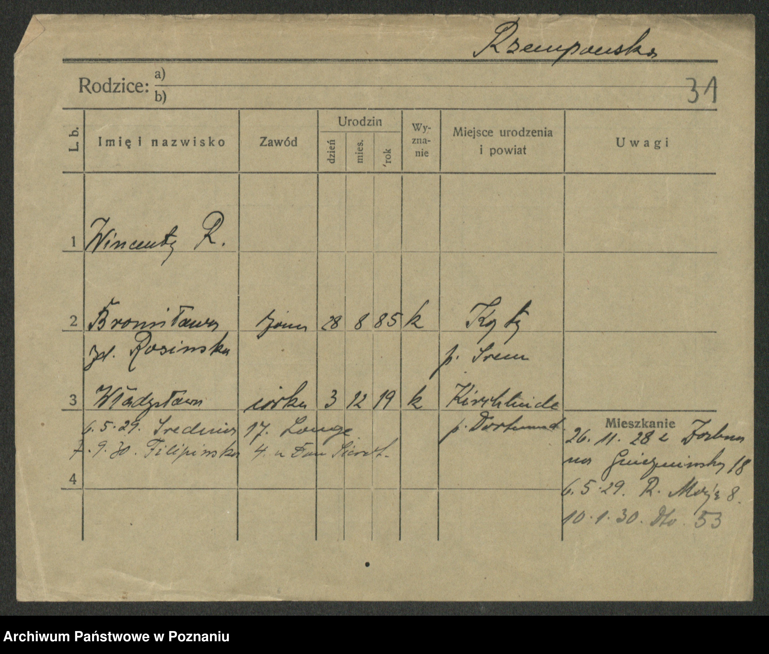 Podgląd karty osobowej dostępny jest po kliknięciu na nazwisko lub ikonkę karty. Można dokonywać powiększenia (ikony na górze) lub przechodzić między kolejnymi skanami (strzałki po bokach).