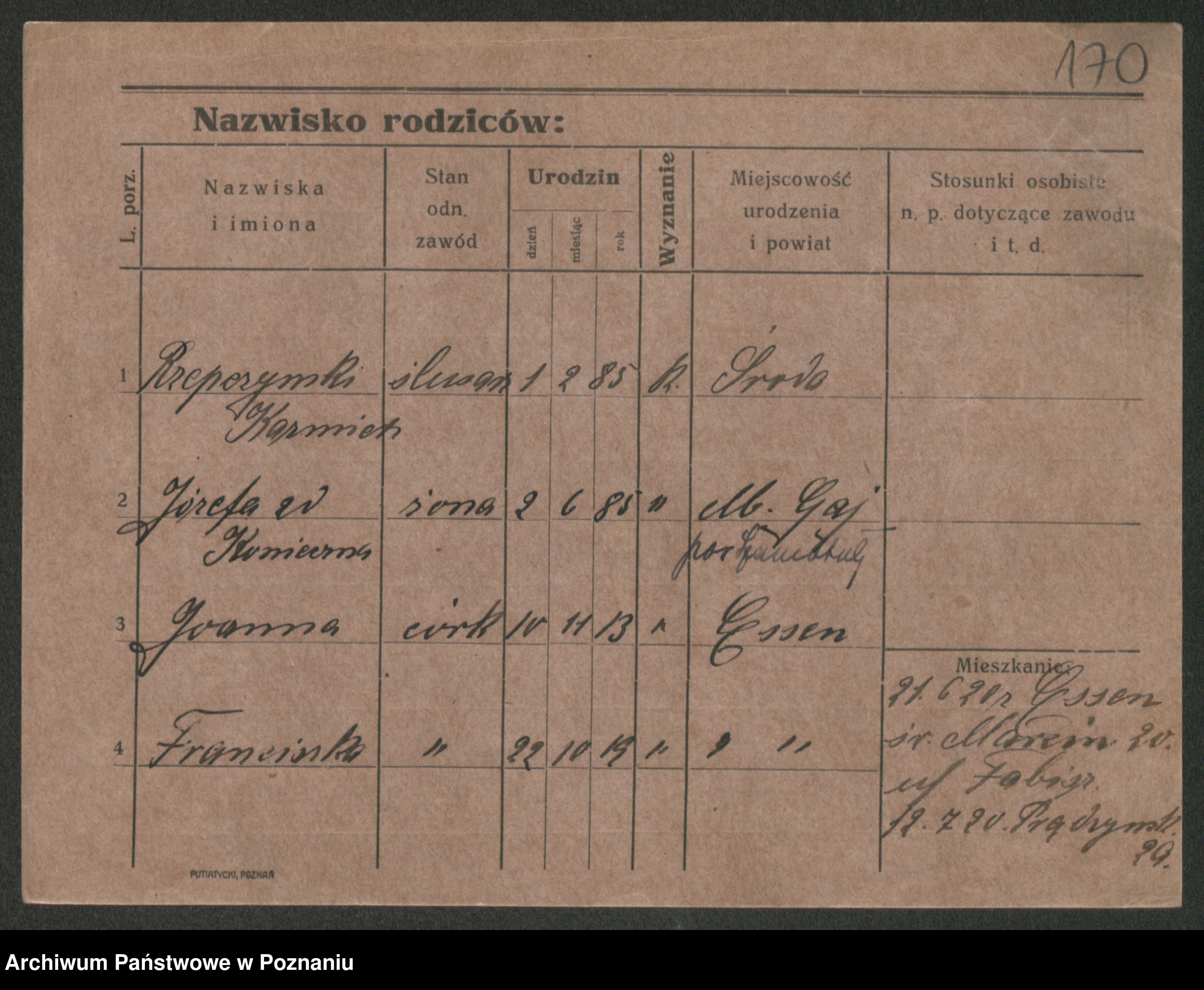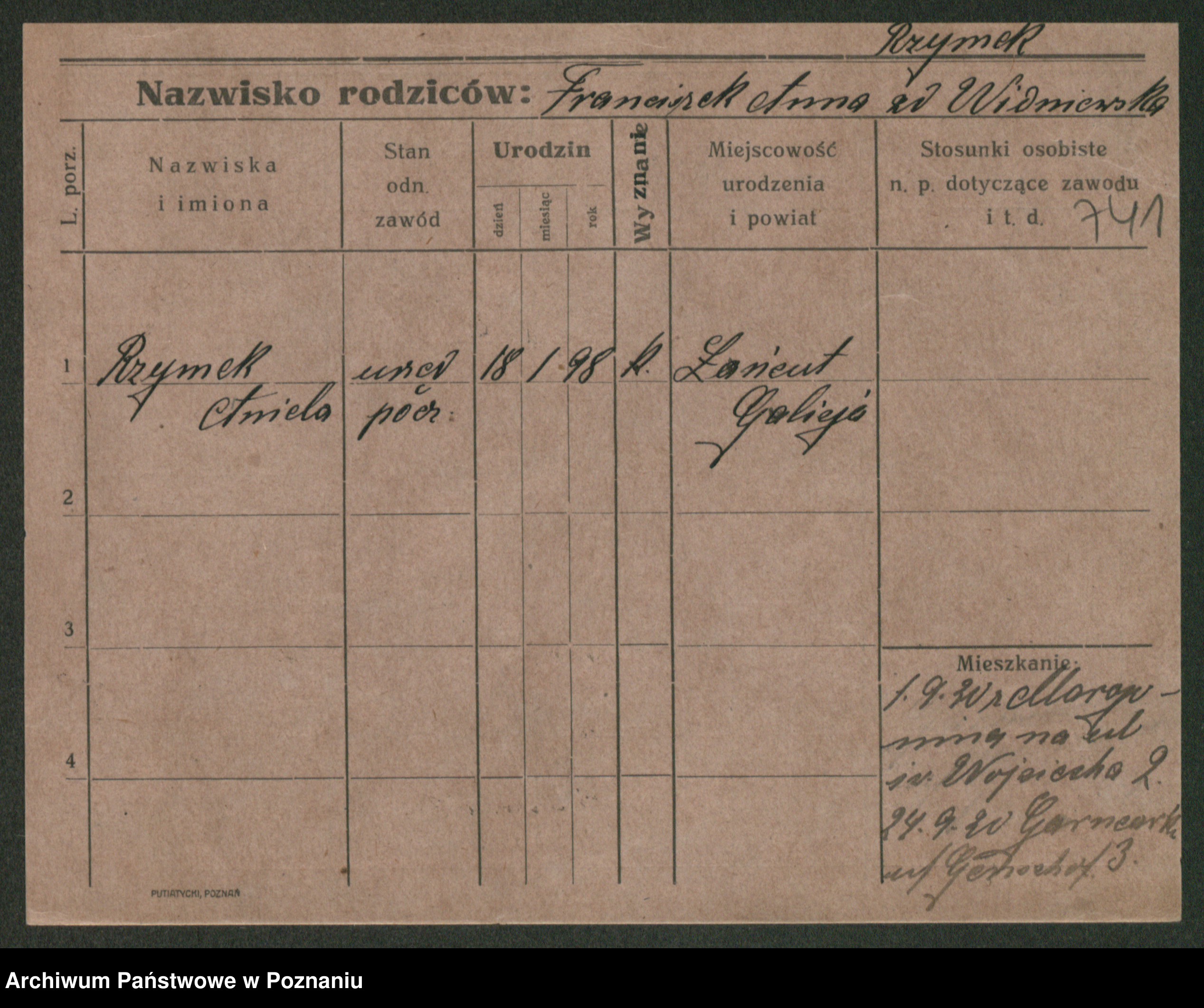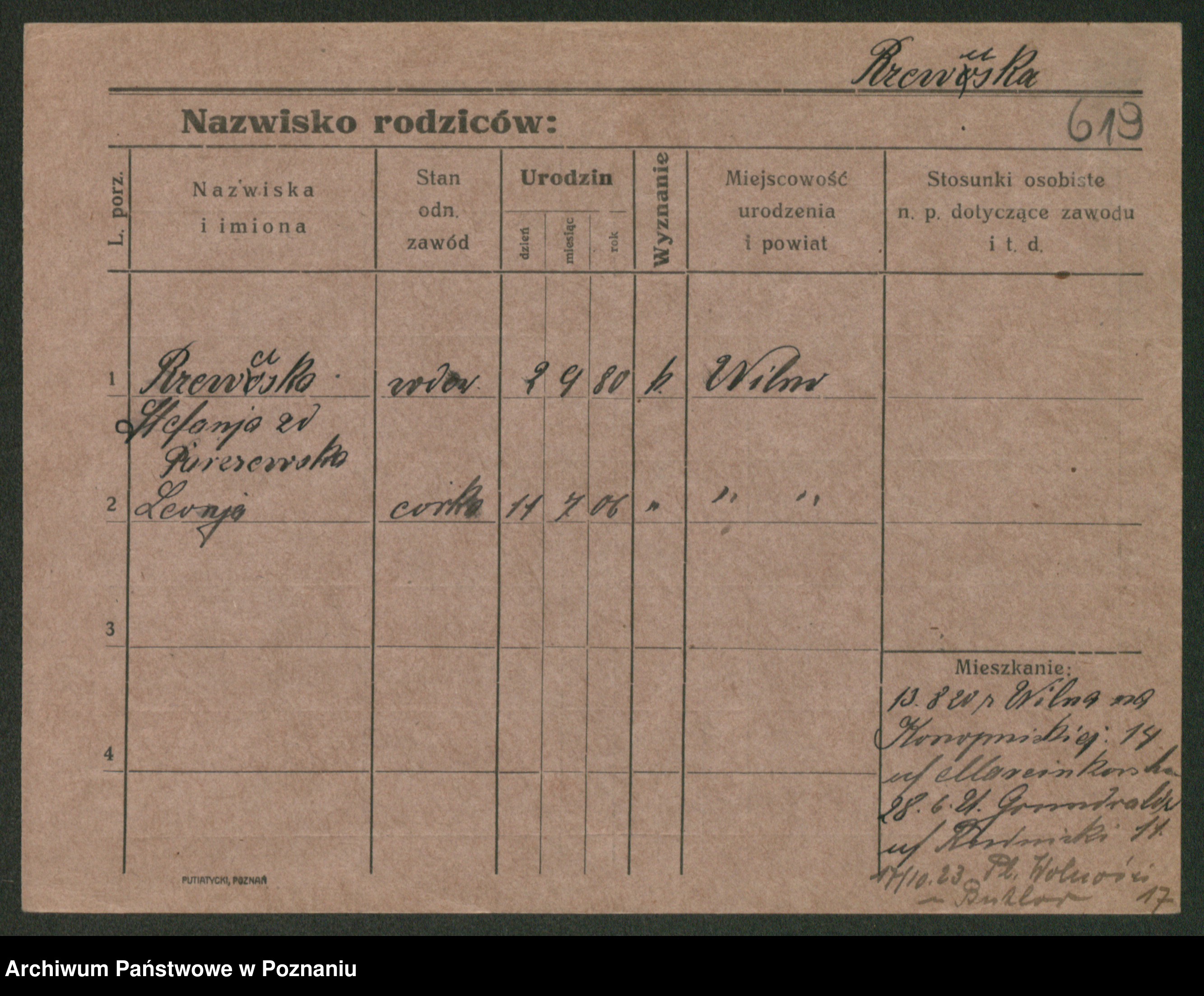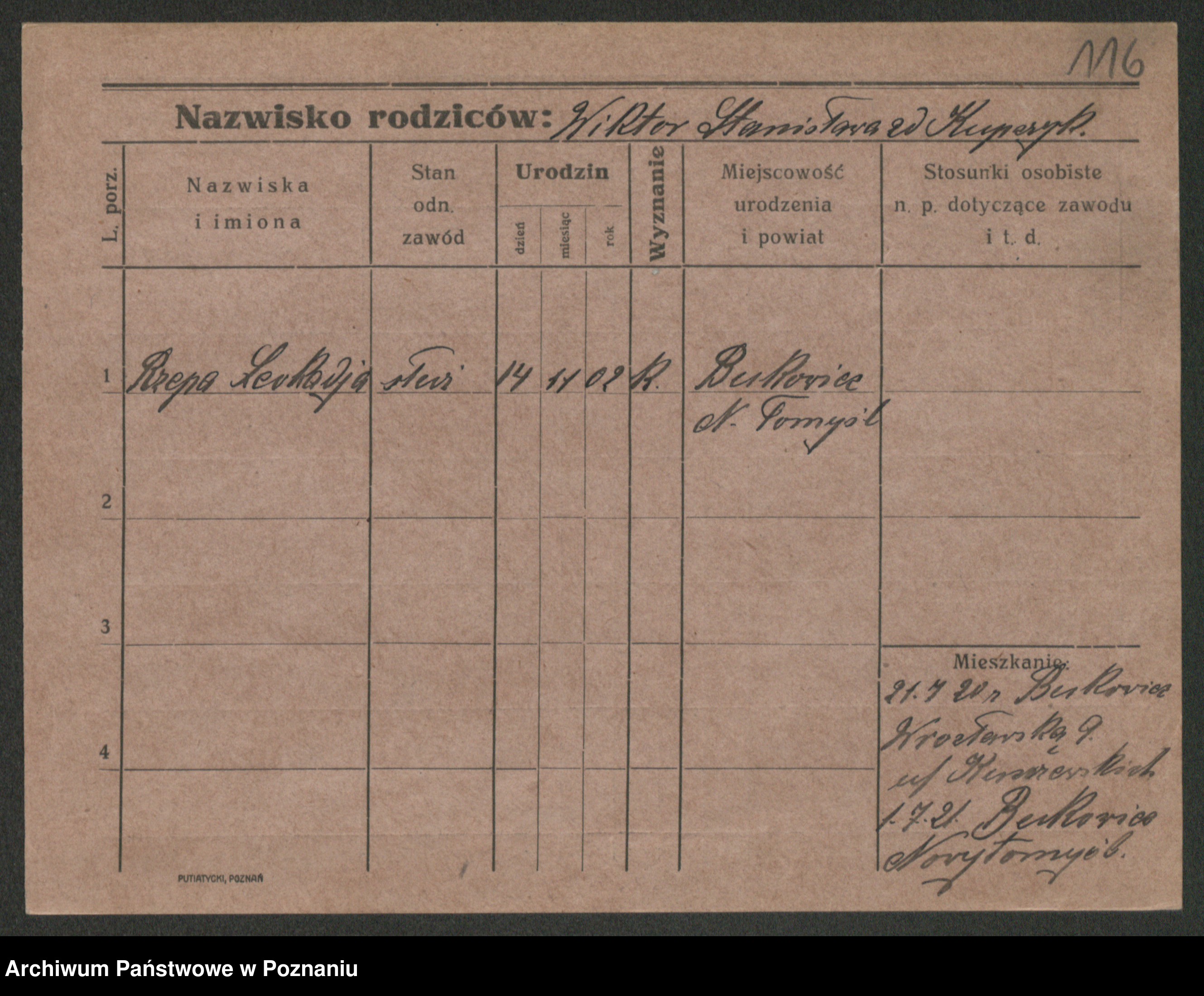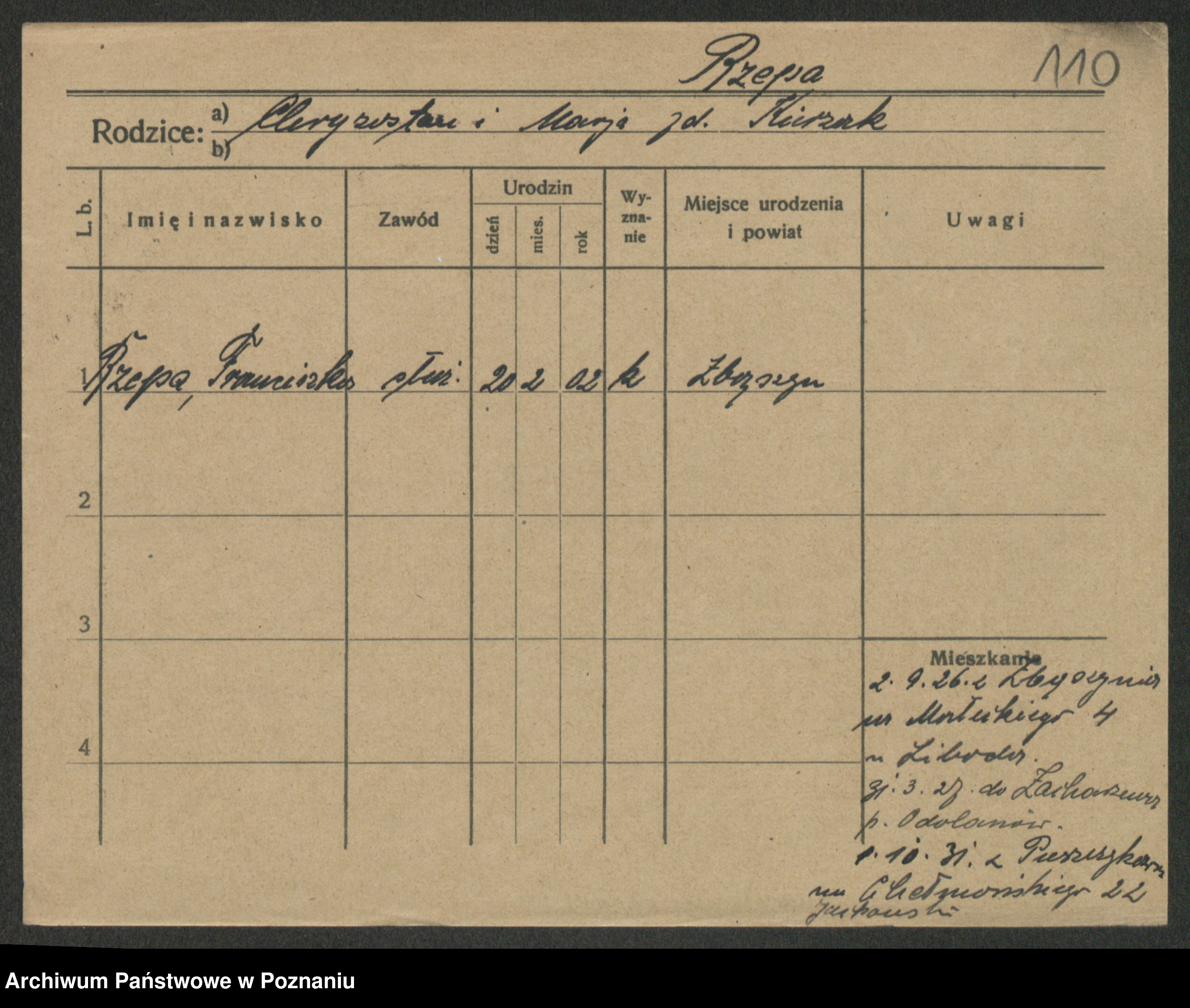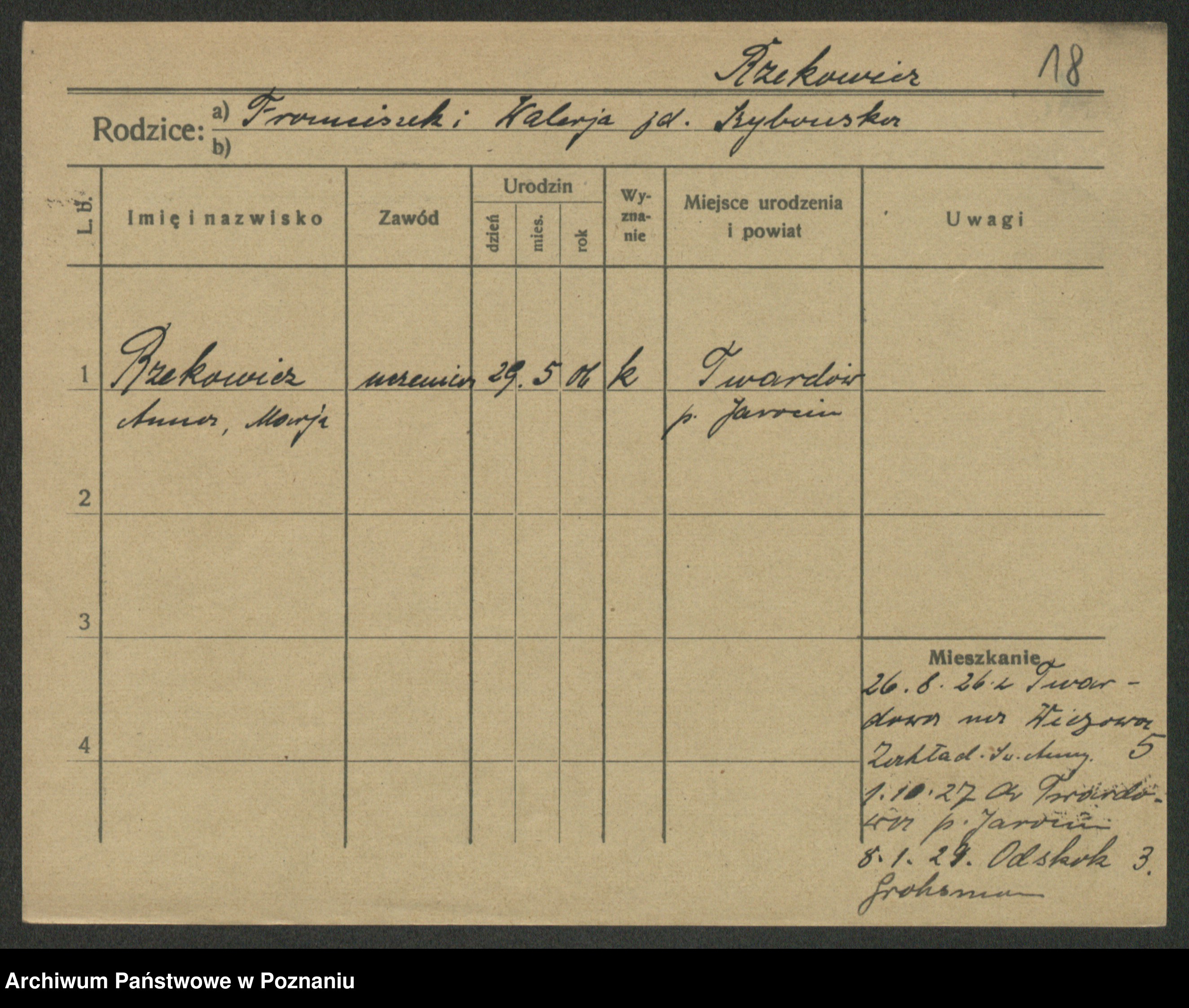 Podgląd karty osobowej dostępny jest po kliknięciu na nazwisko lub ikonkę karty. Można dokonywać powiększenia (ikony na górze) lub przechodzić między kolejnymi skanami (strzałki po bokach).