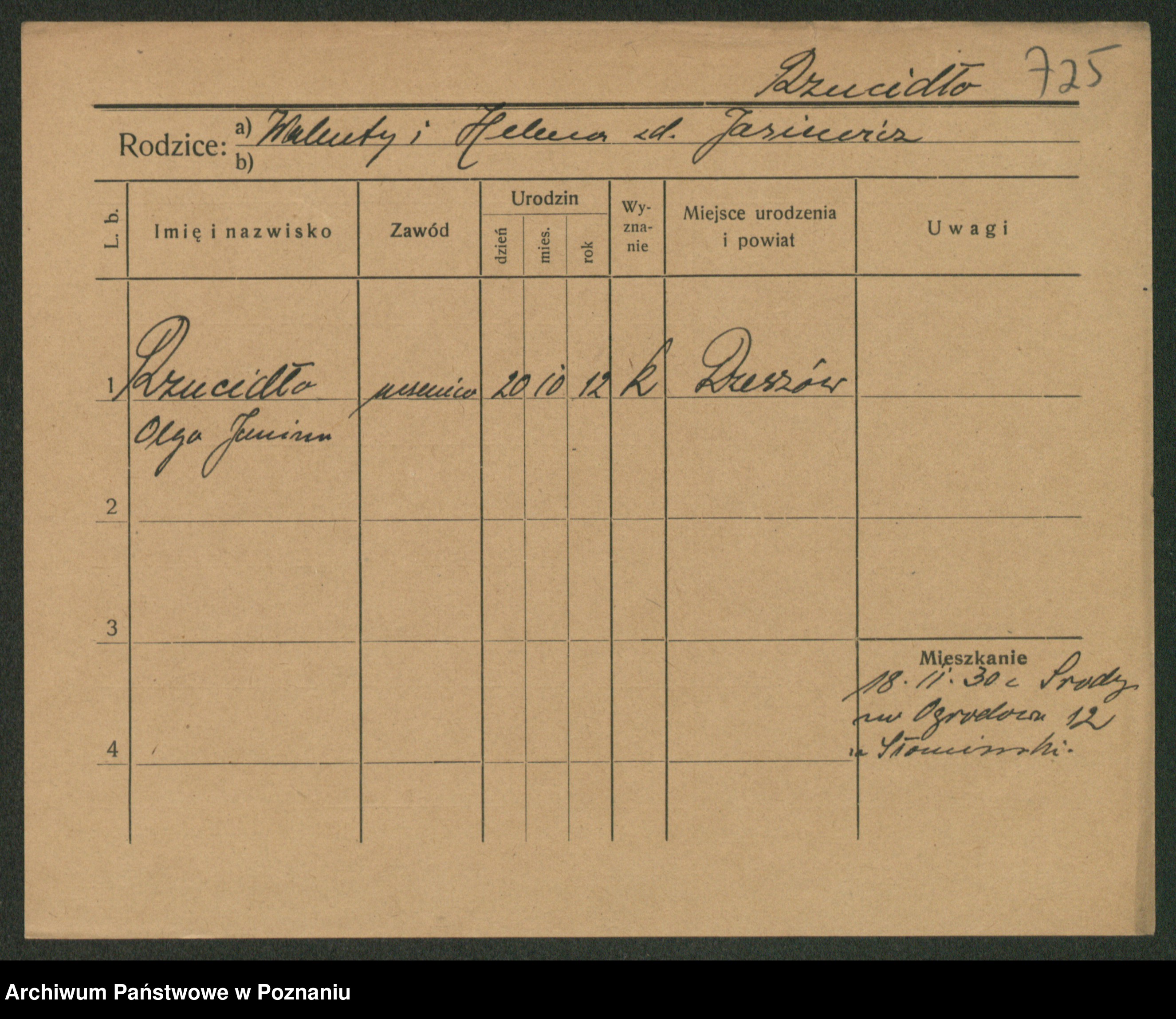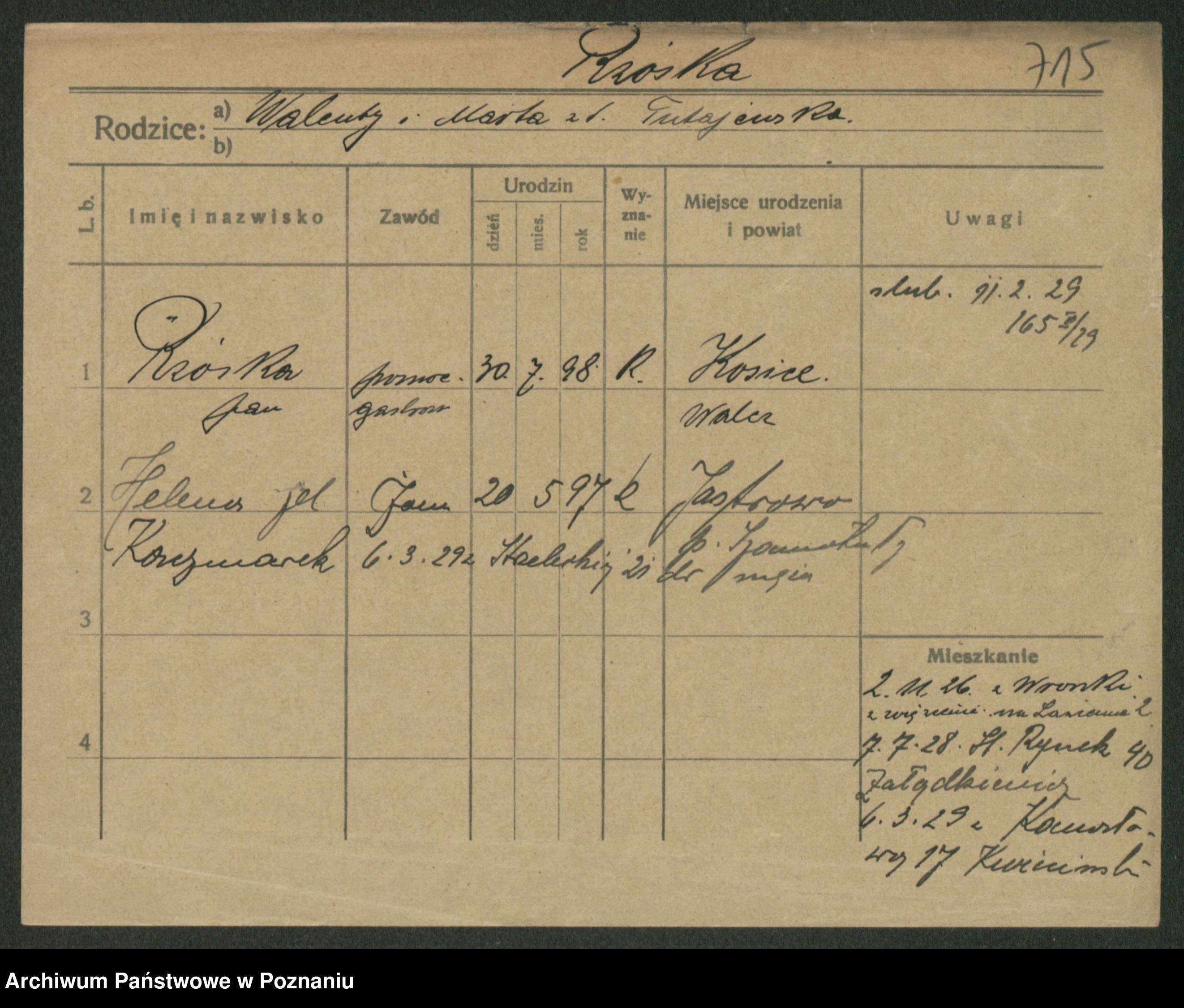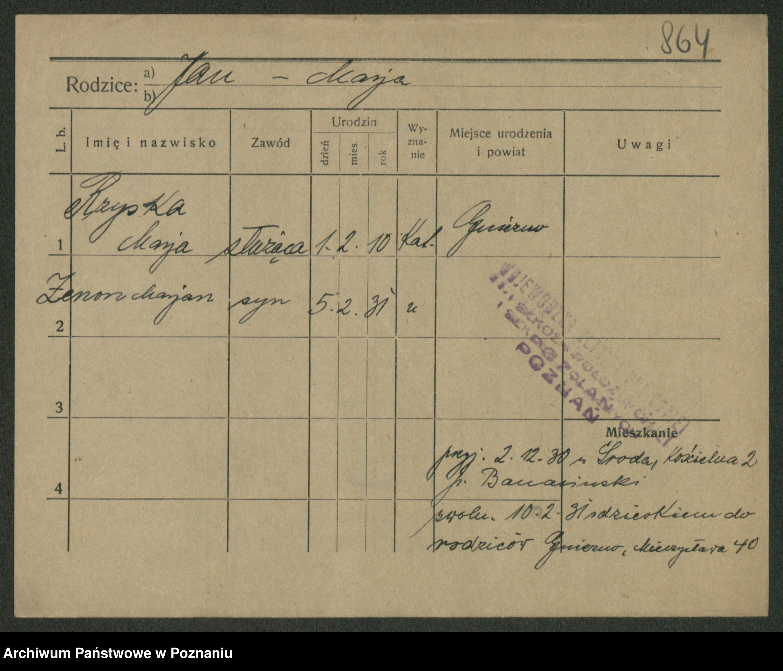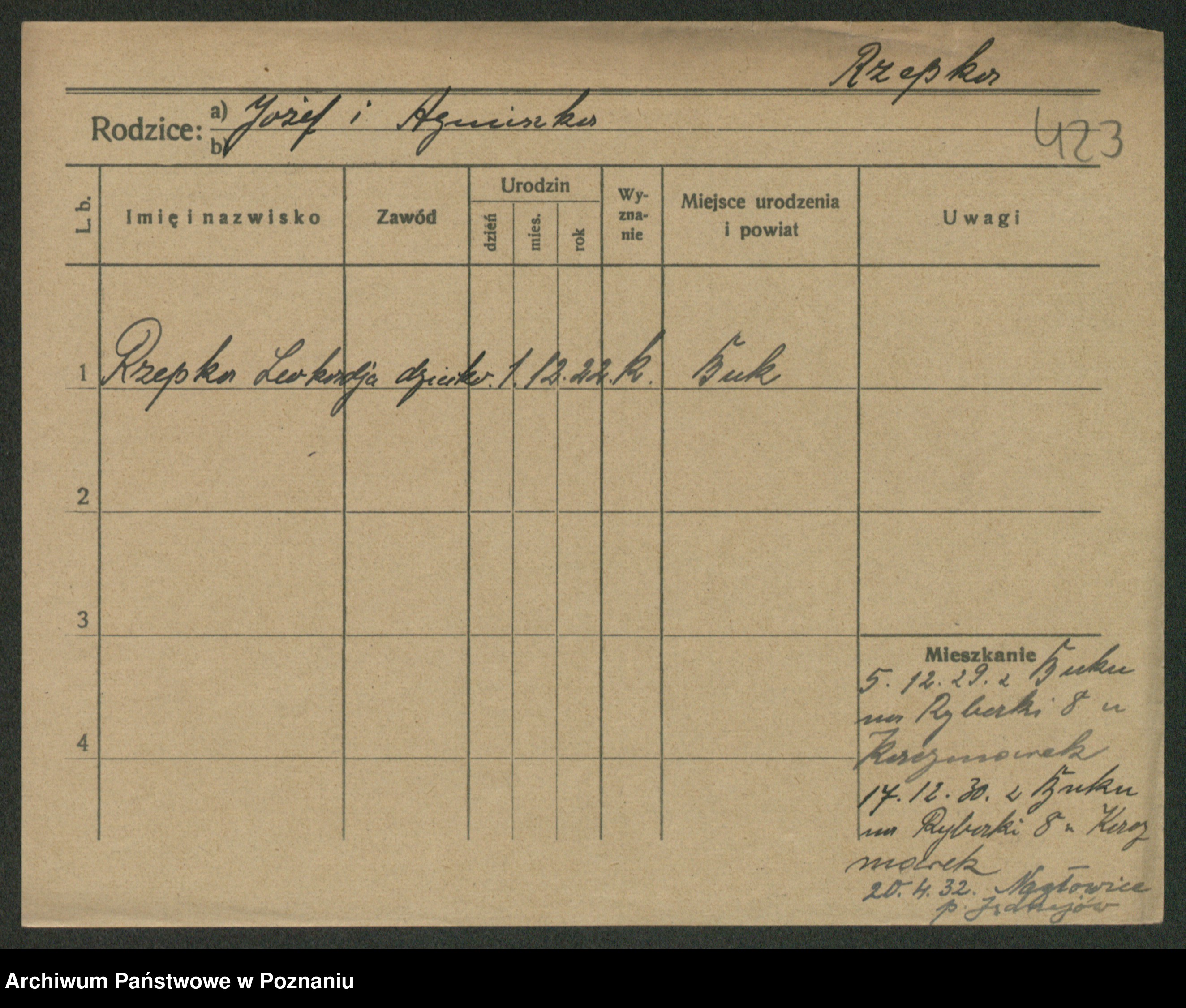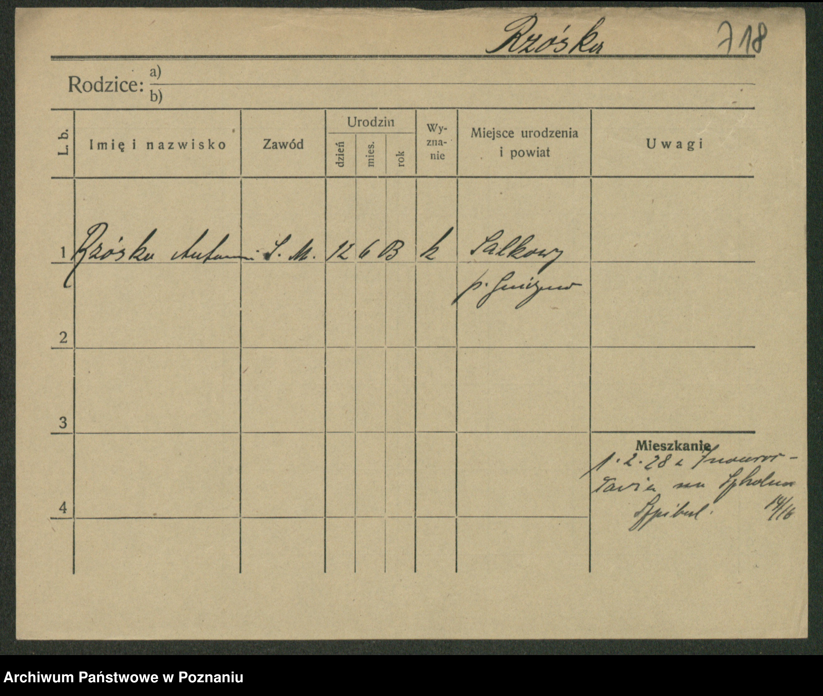 Podgląd karty osobowej dostępny jest po kliknięciu na nazwisko lub ikonkę karty. Można dokonywać powiększenia (ikony na górze) lub przechodzić między kolejnymi skanami (strzałki po bokach).