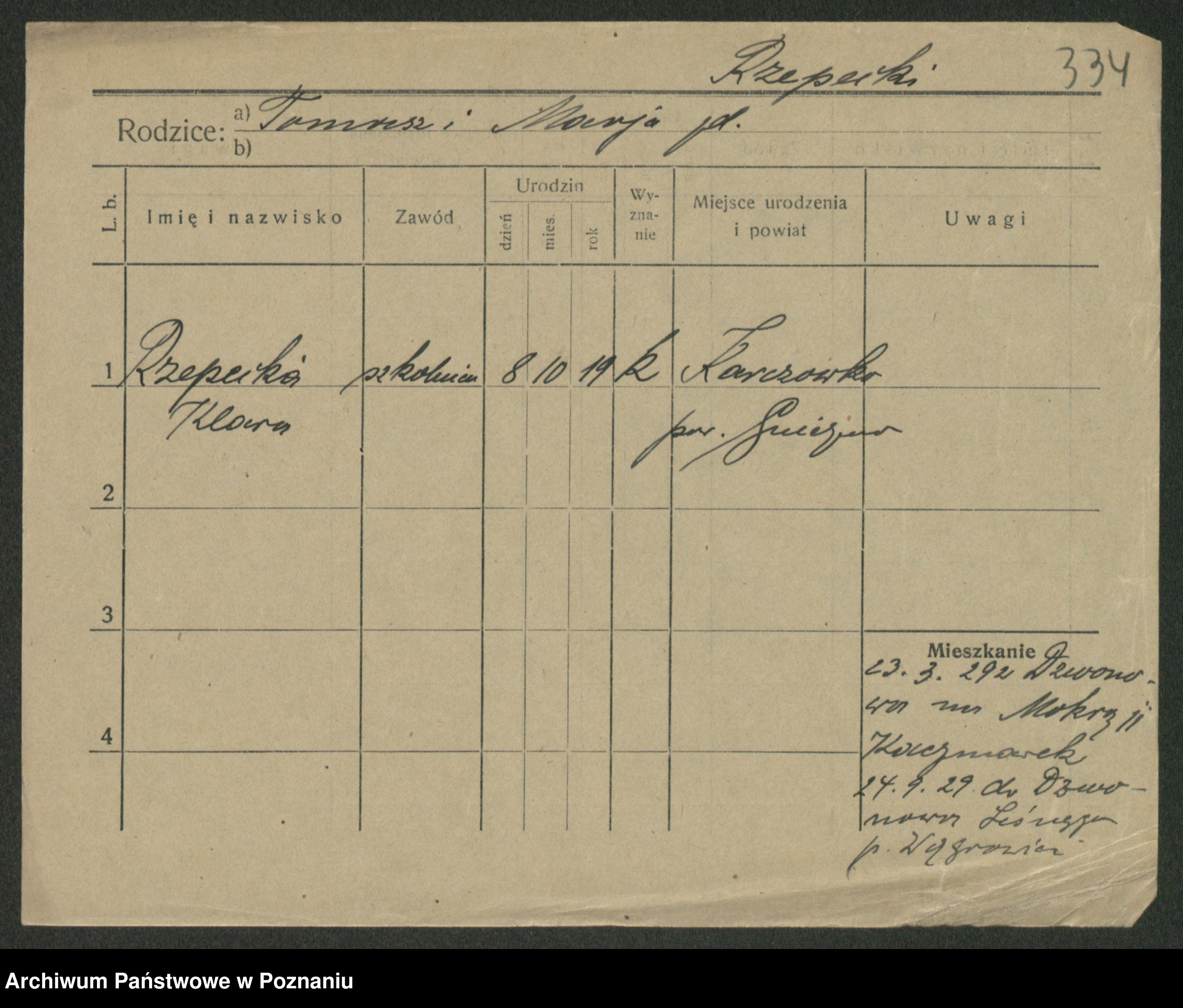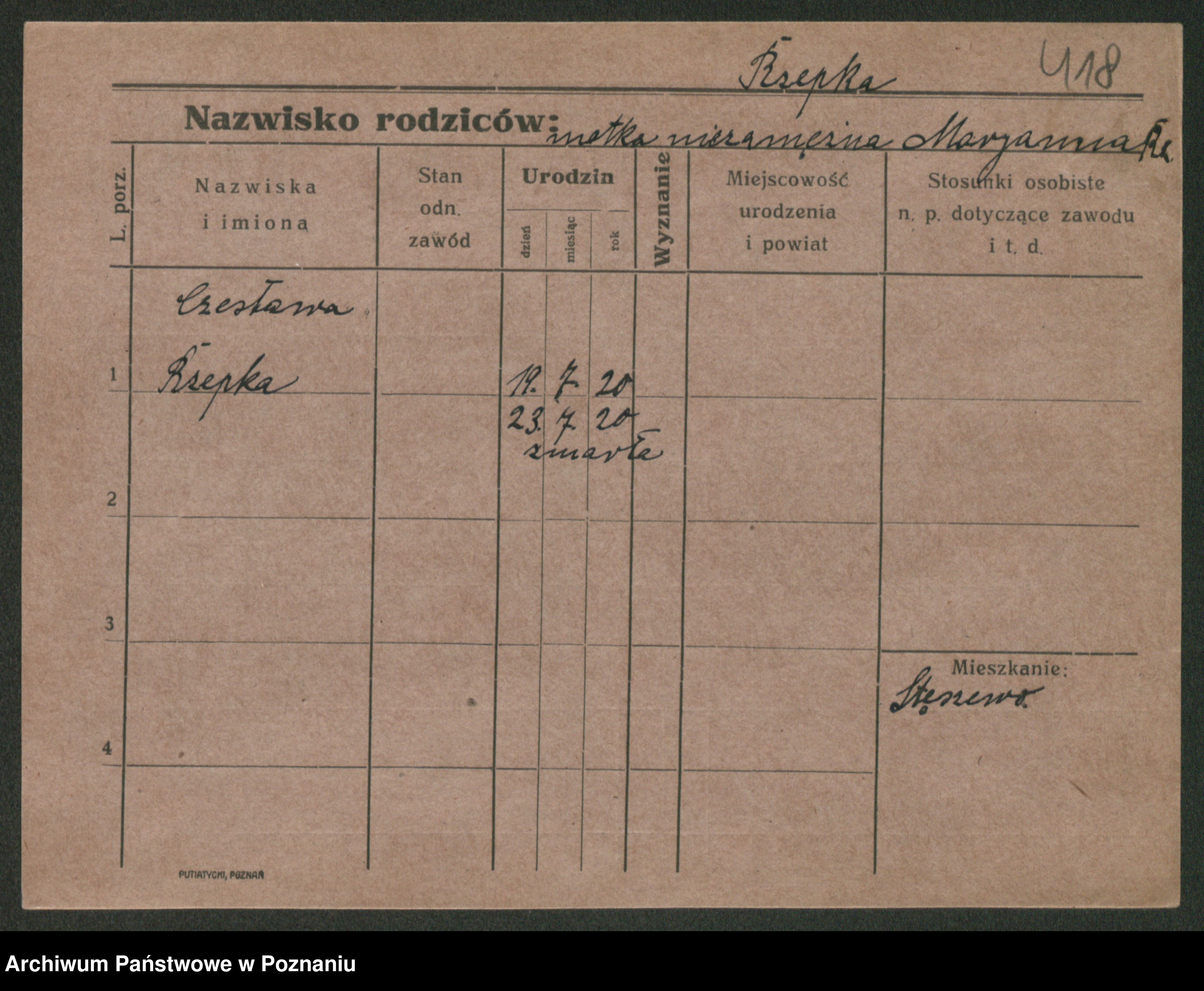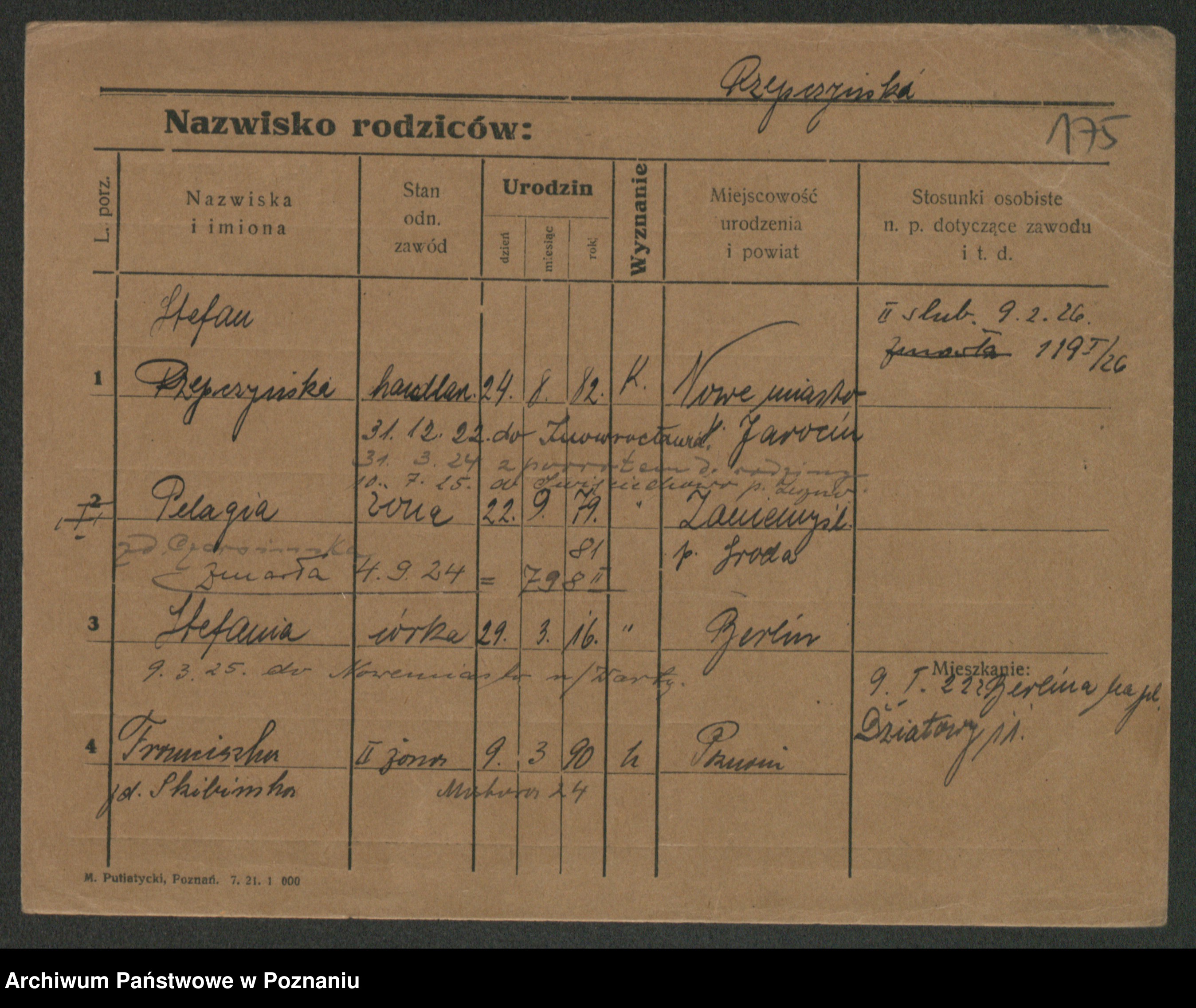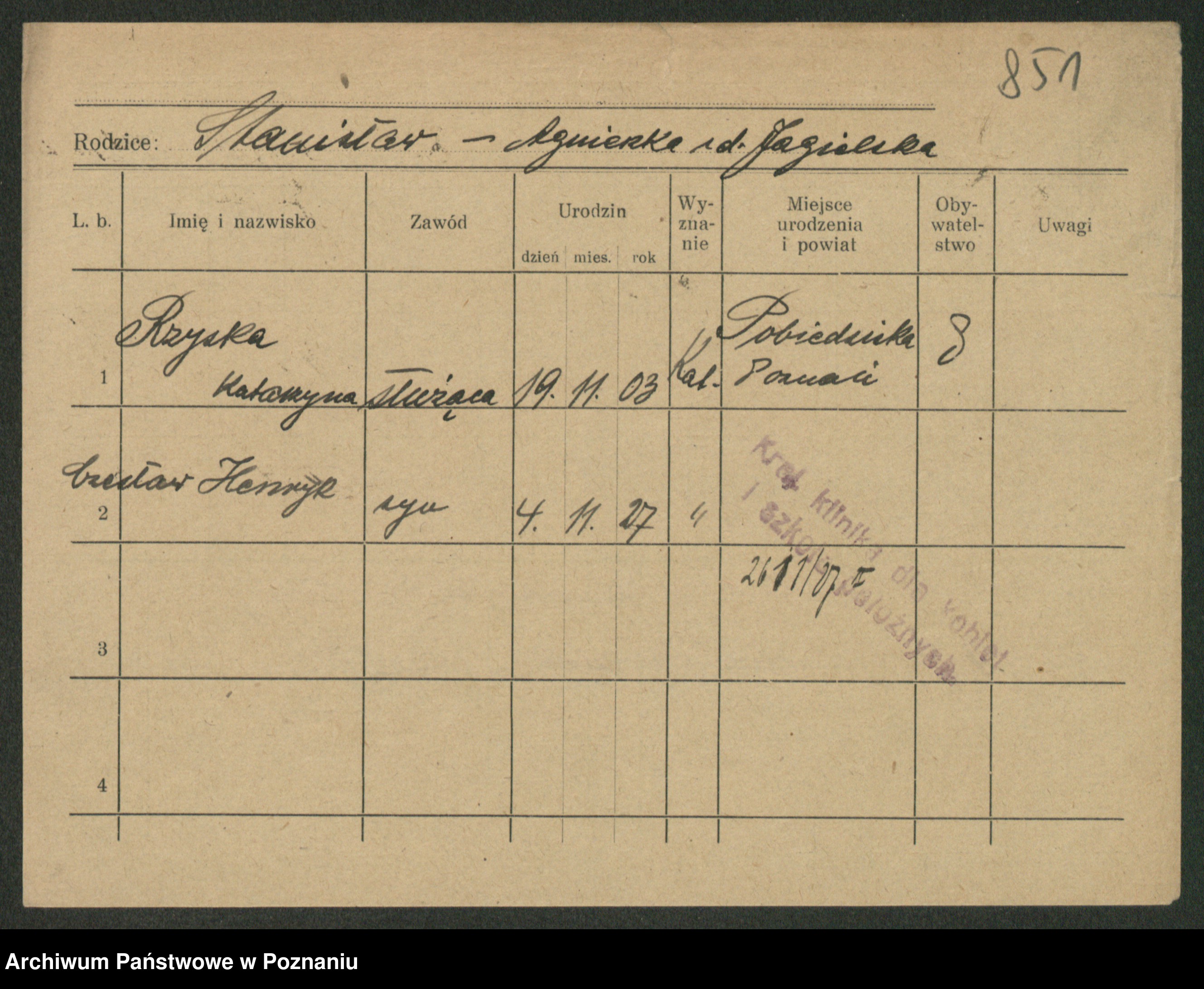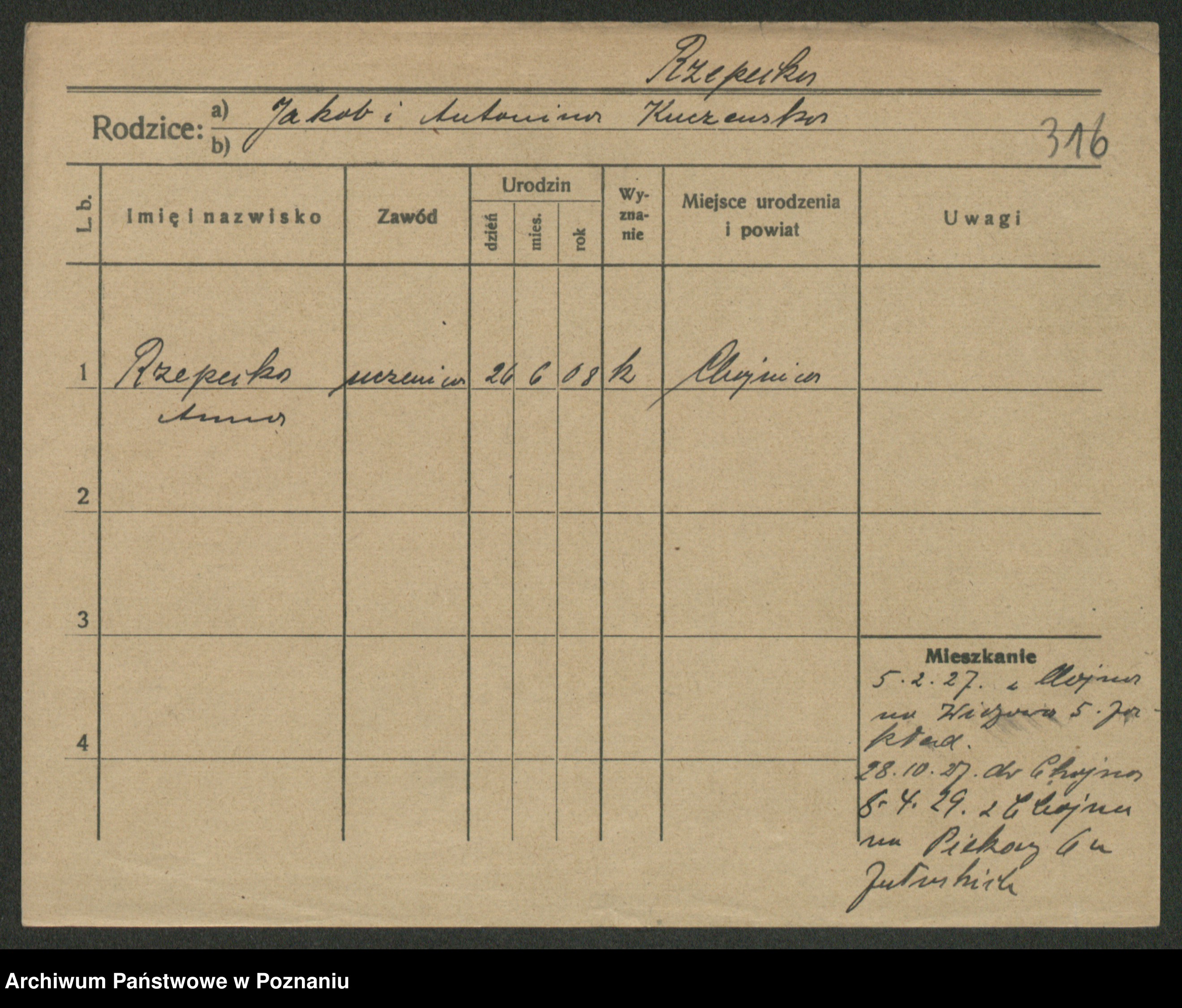 Podgląd karty osobowej dostępny jest po kliknięciu na nazwisko lub ikonkę karty. Można dokonywać powiększenia (ikony na górze) lub przechodzić między kolejnymi skanami (strzałki po bokach).