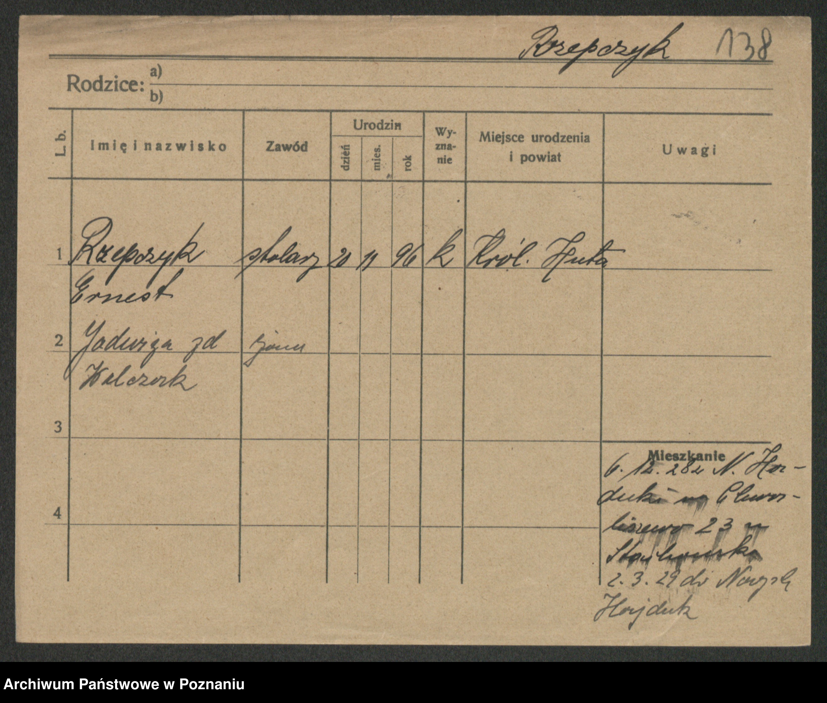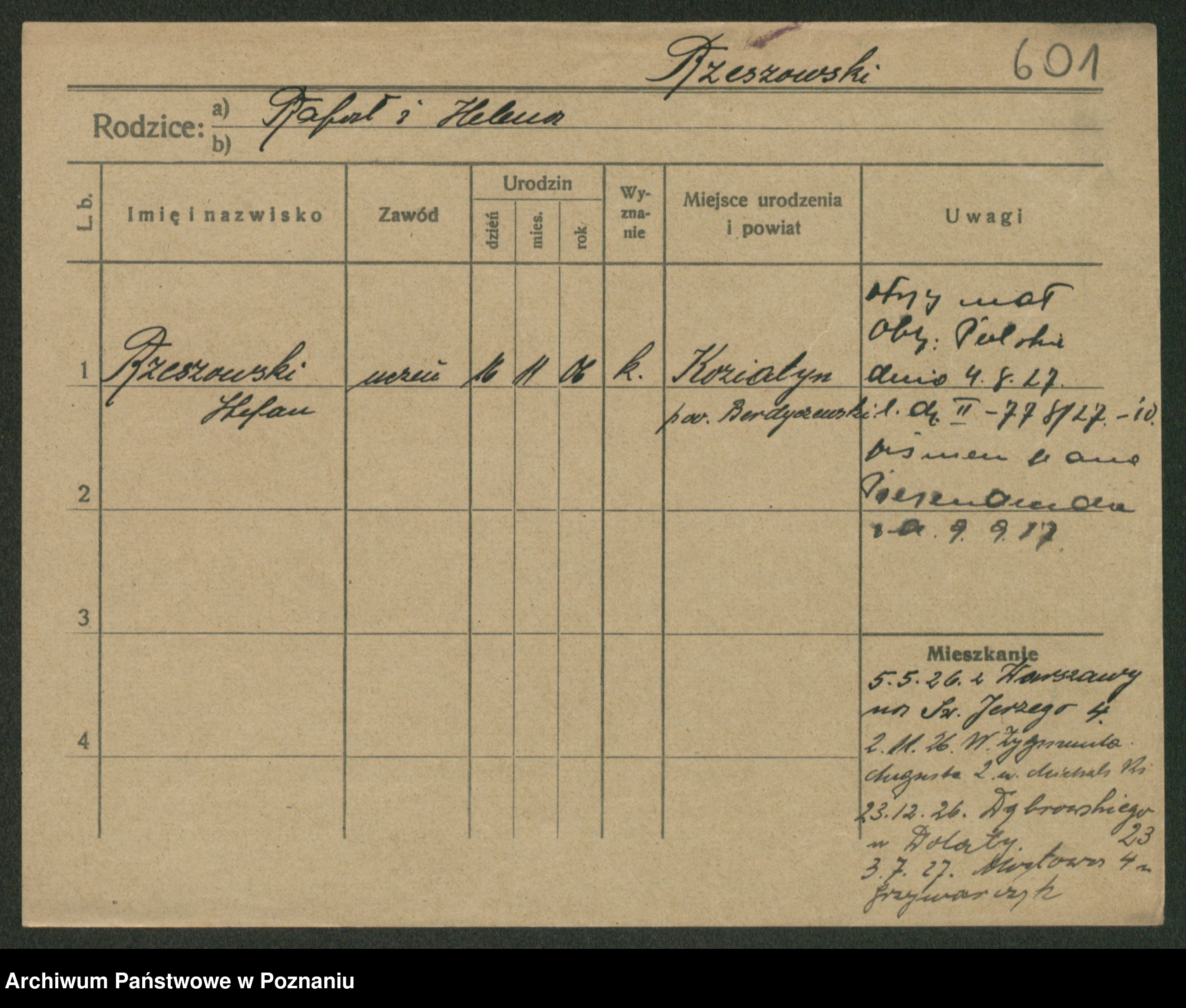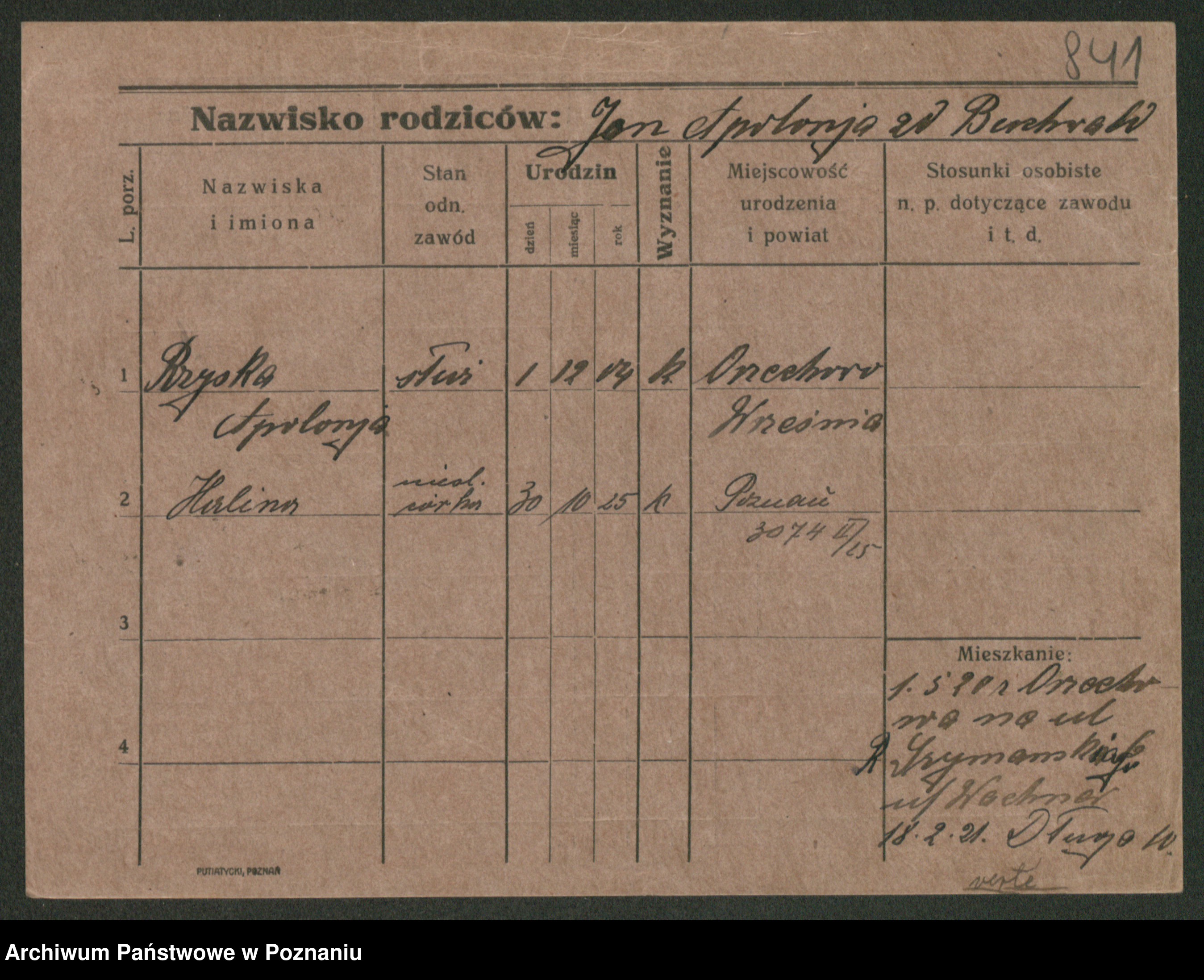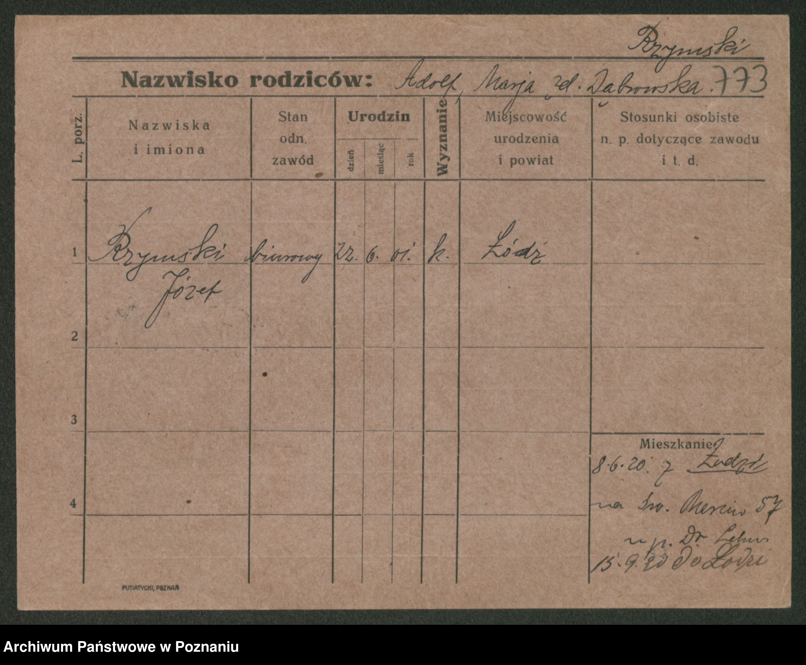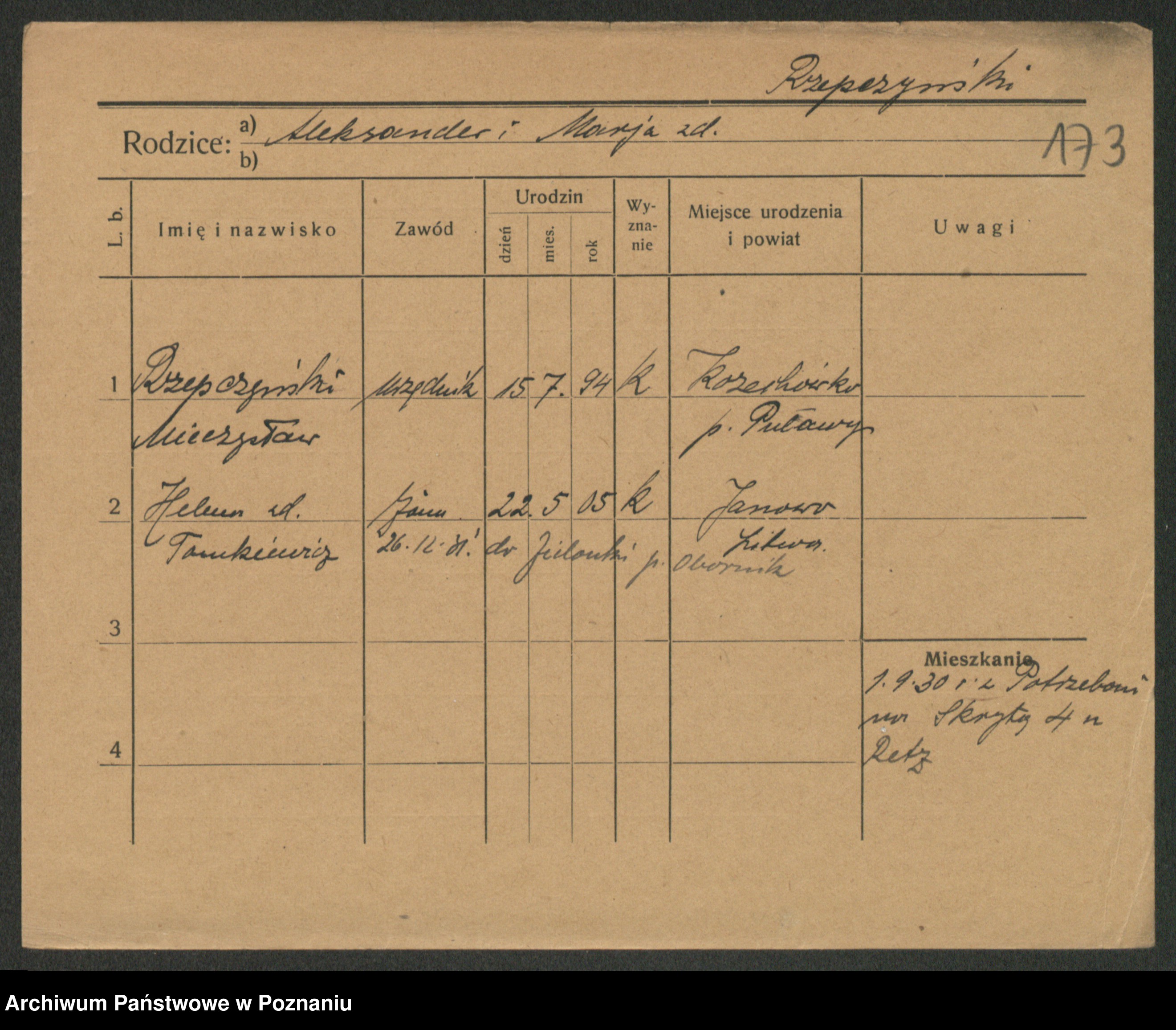 Podgląd karty osobowej dostępny jest po kliknięciu na nazwisko lub ikonkę karty. Można dokonywać powiększenia (ikony na górze) lub przechodzić między kolejnymi skanami (strzałki po bokach).
