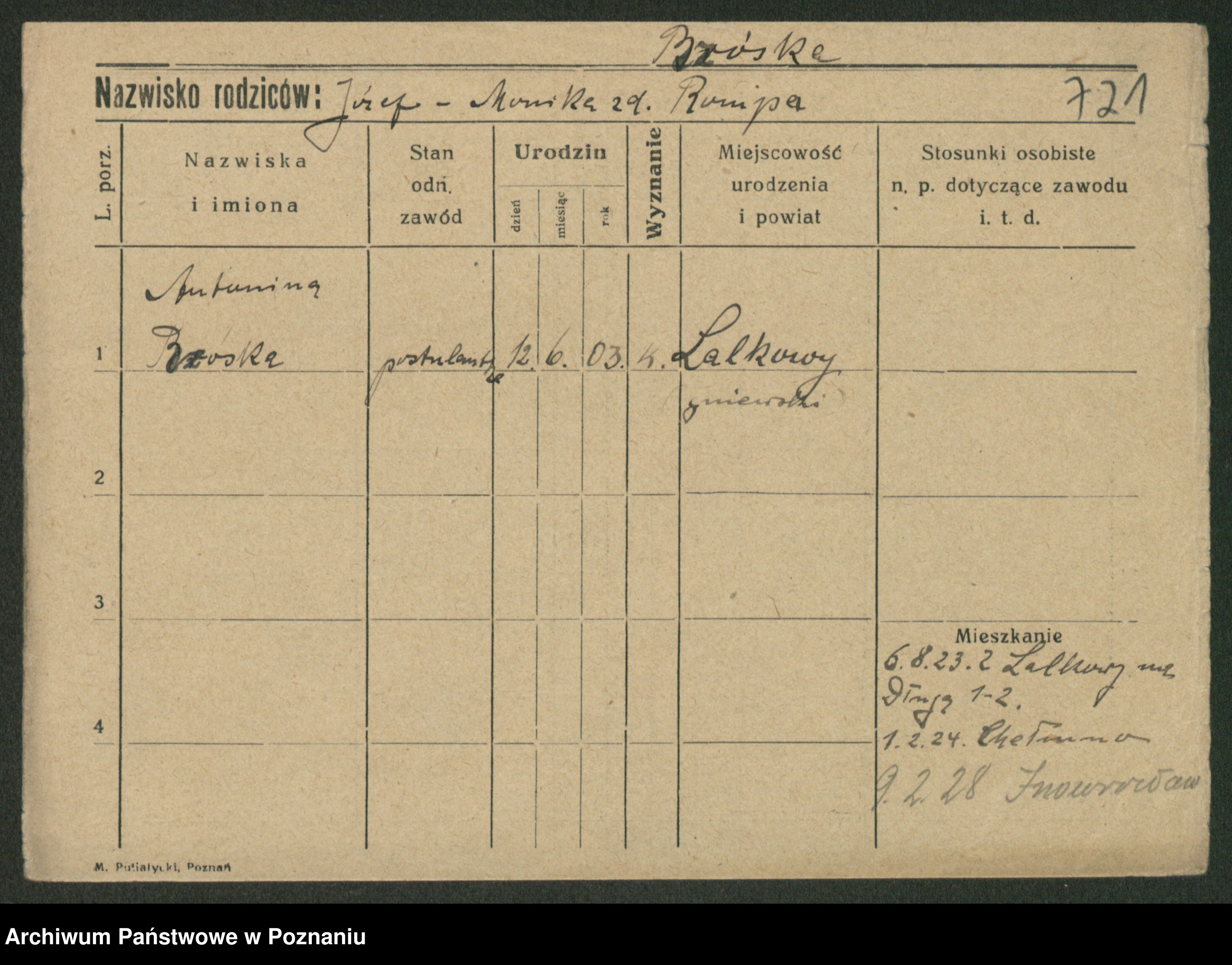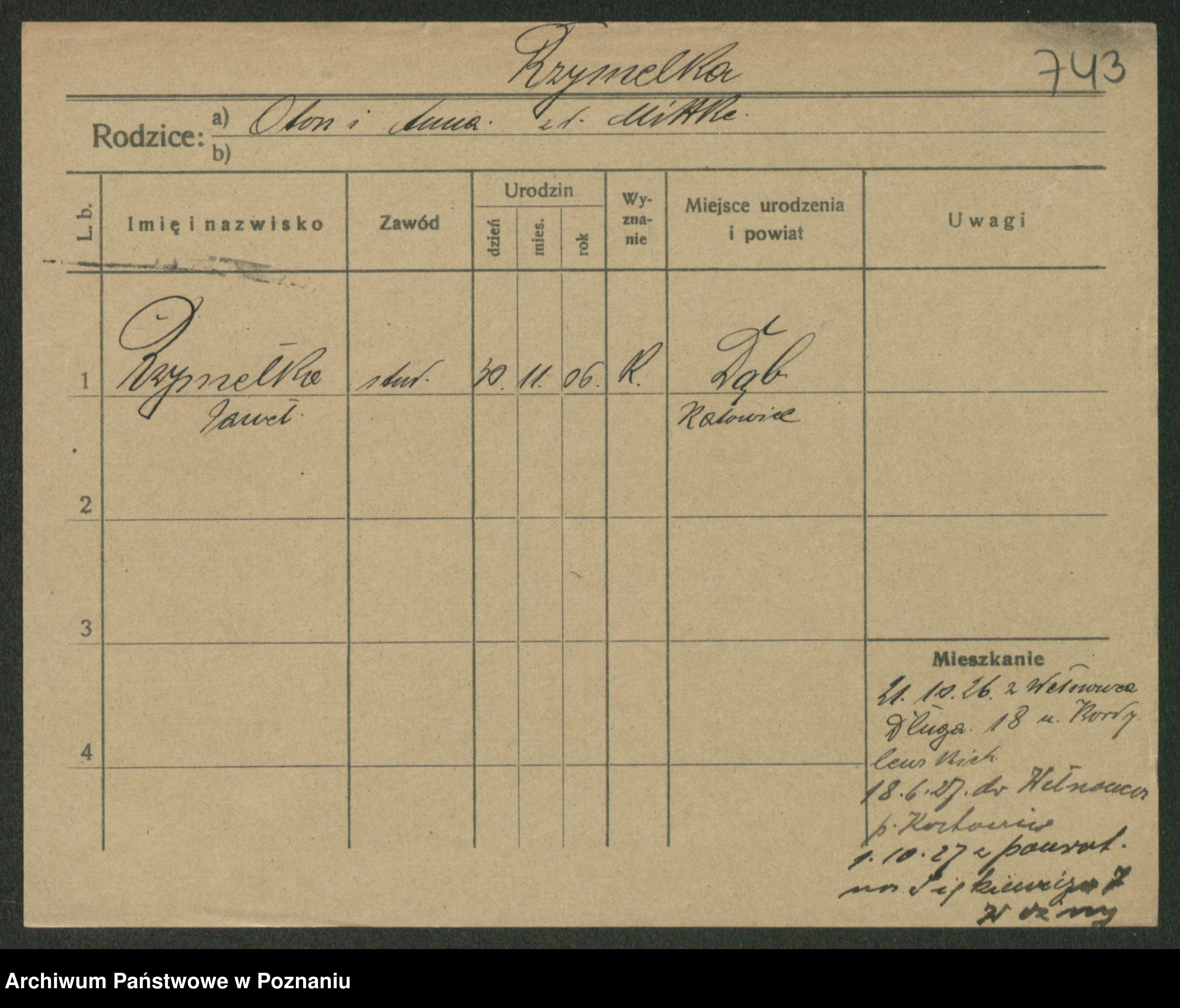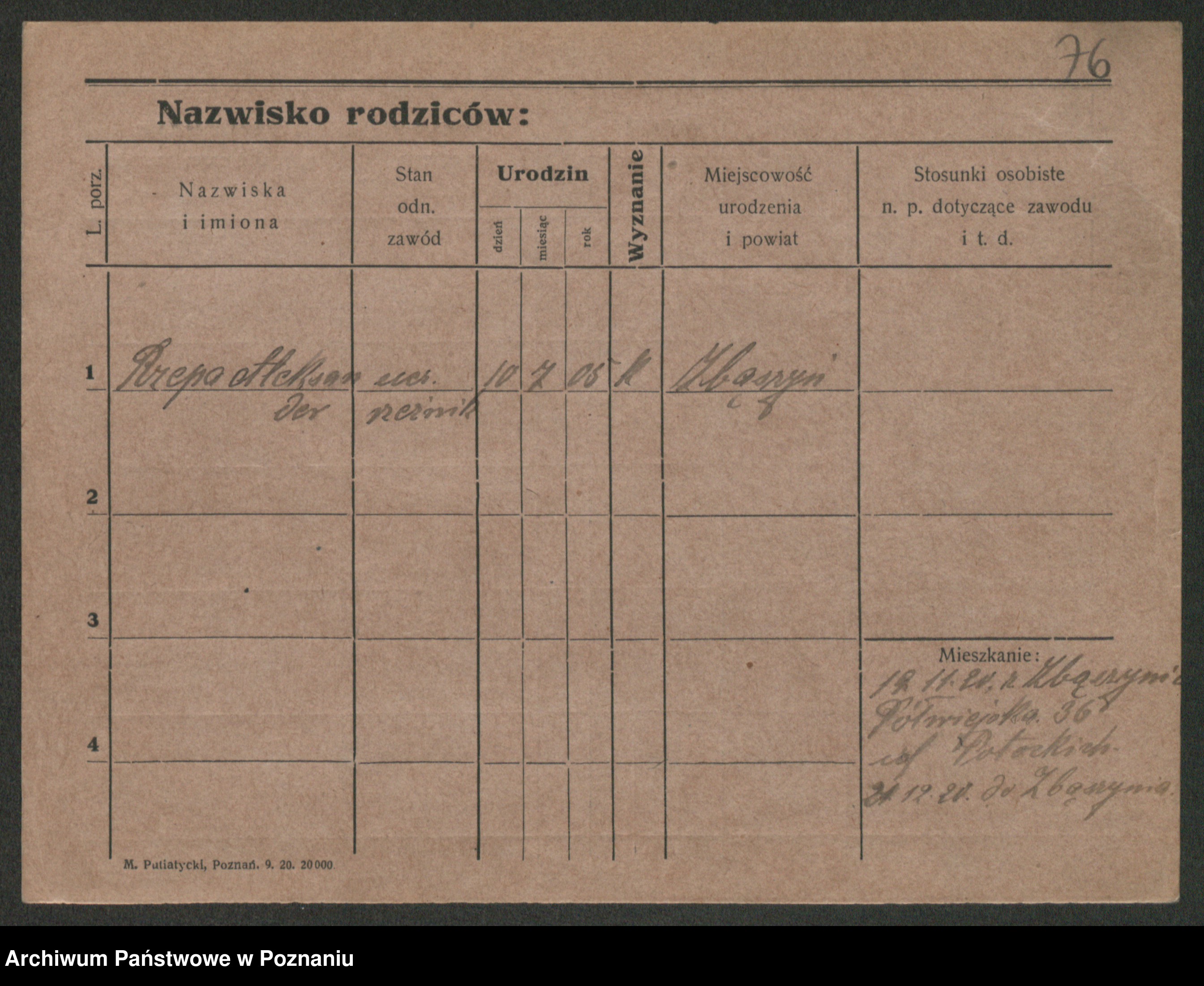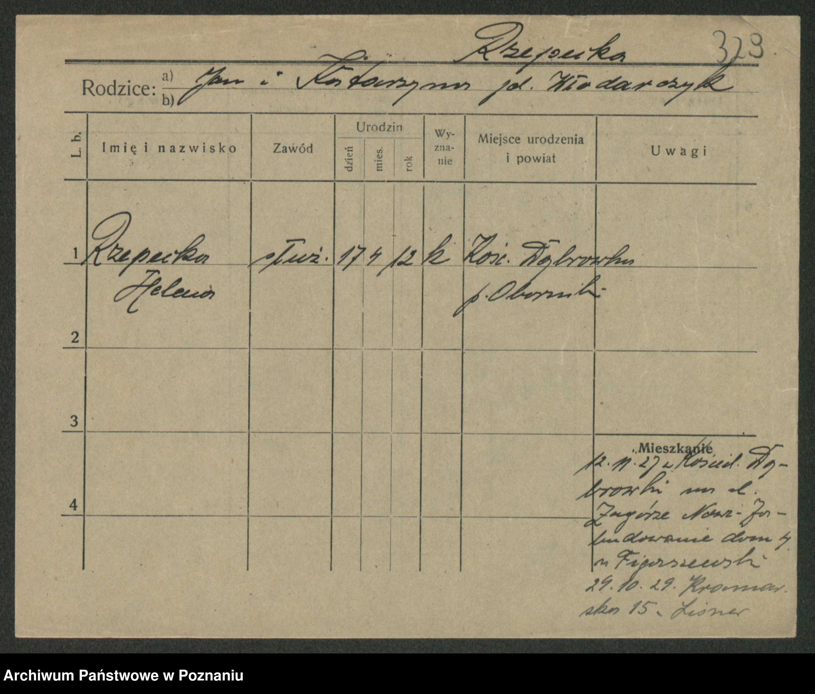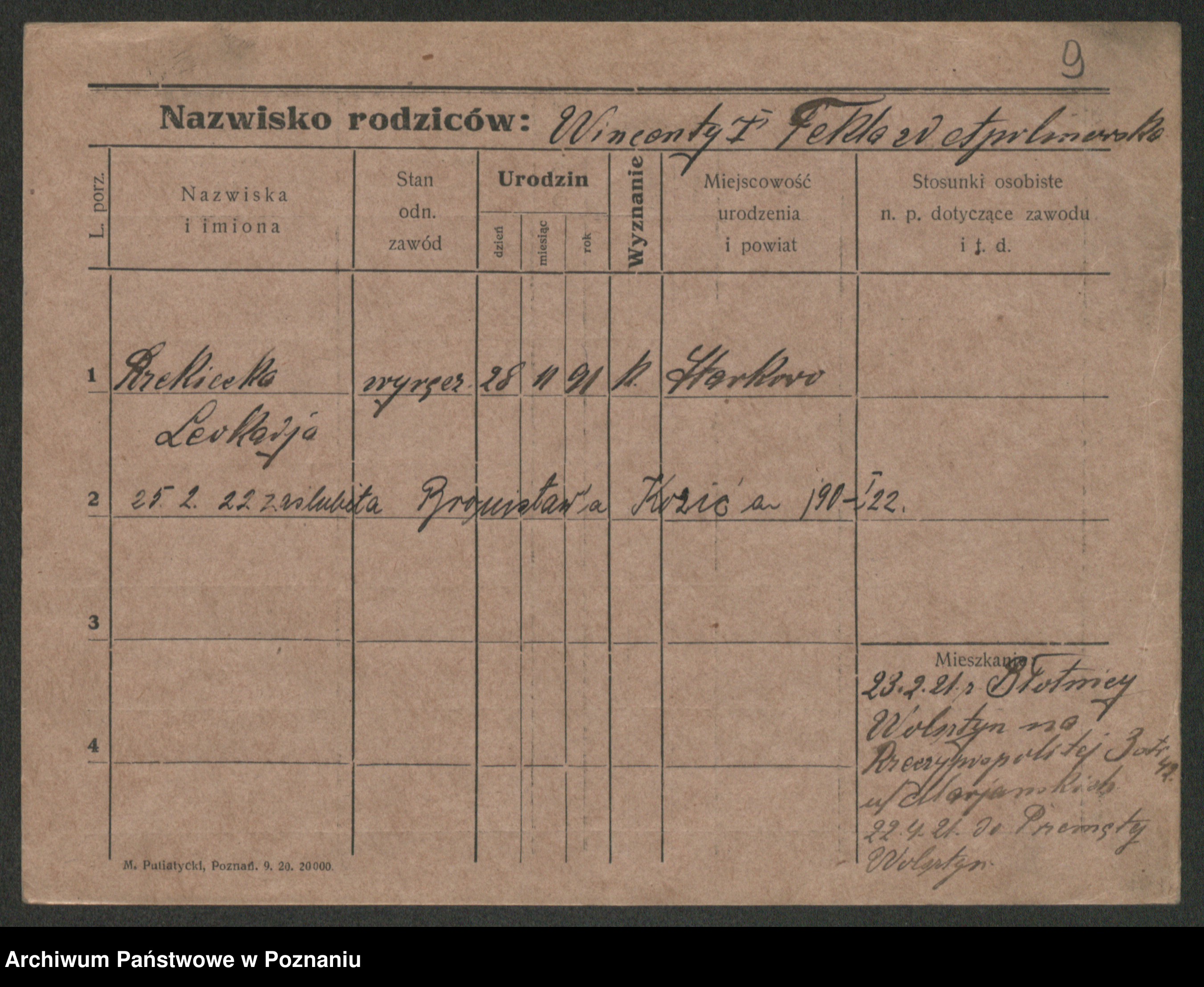 Podgląd karty osobowej dostępny jest po kliknięciu na nazwisko lub ikonkę karty. Można dokonywać powiększenia (ikony na górze) lub przechodzić między kolejnymi skanami (strzałki po bokach).