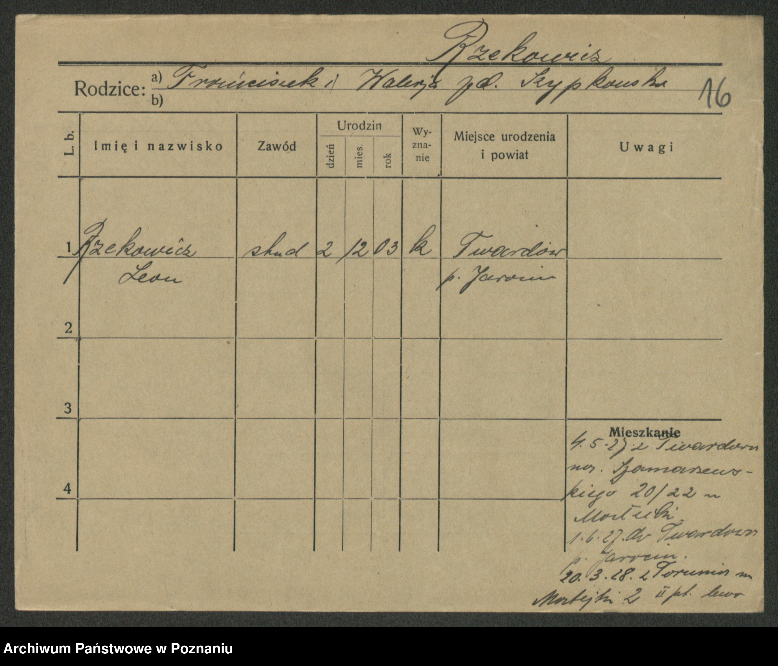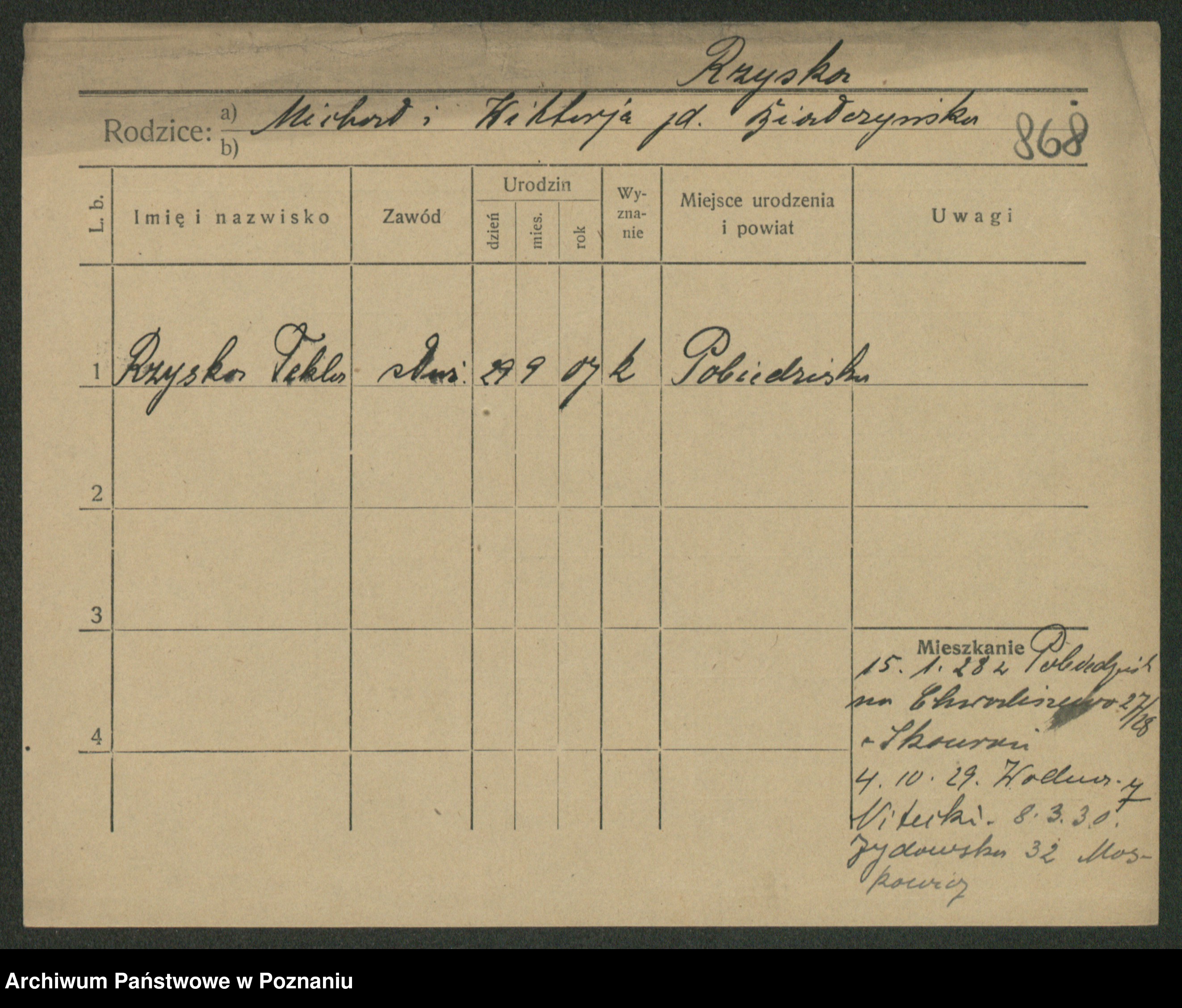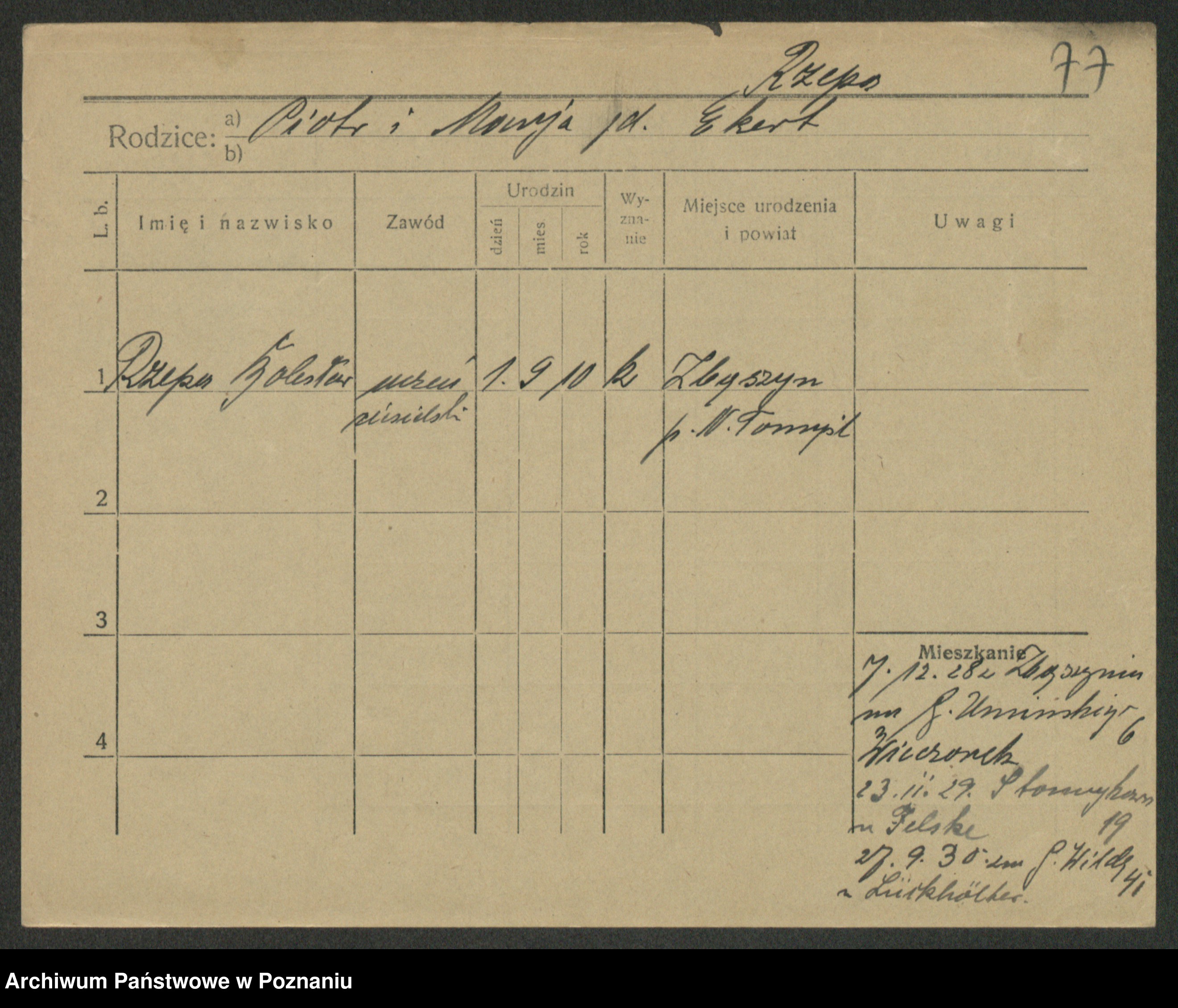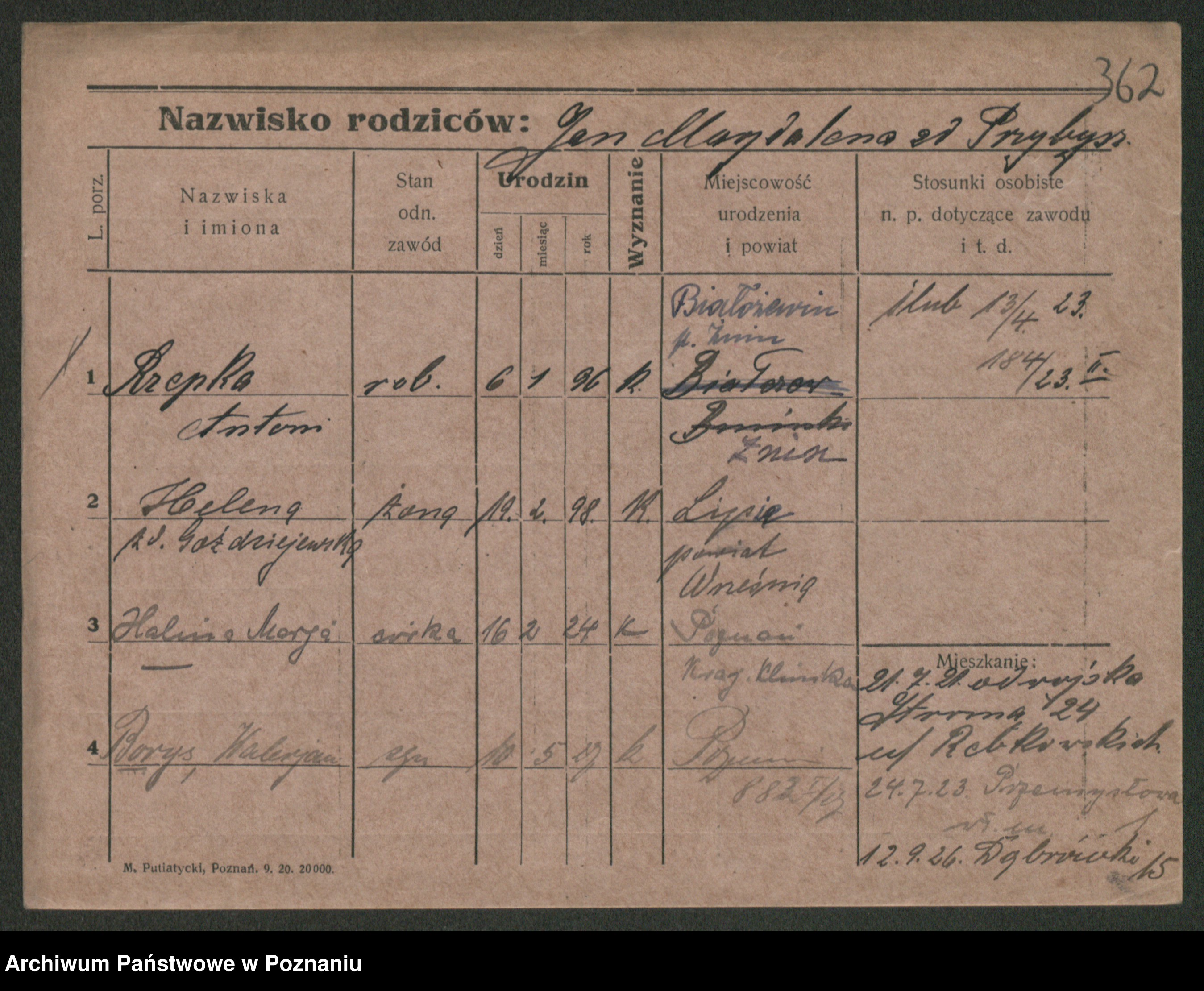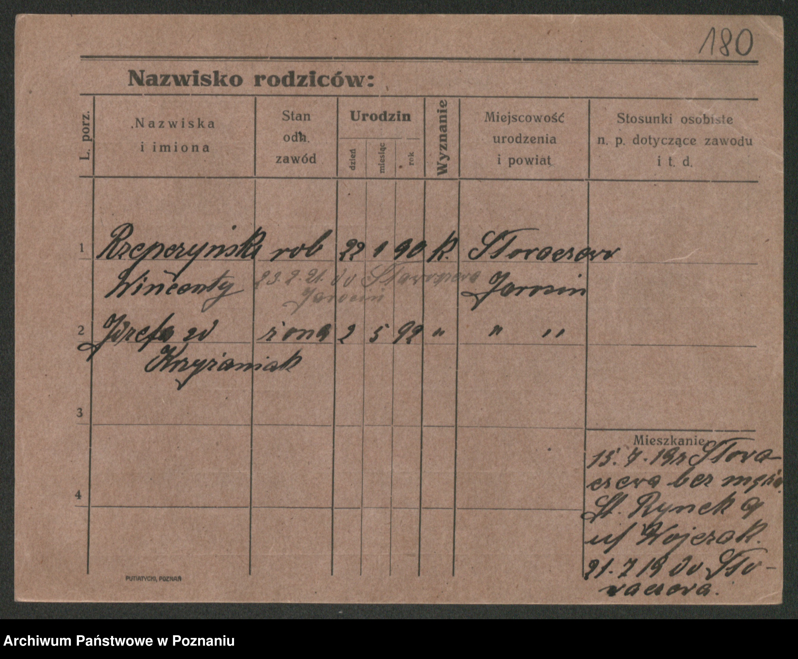 Podgląd karty osobowej dostępny jest po kliknięciu na nazwisko lub ikonkę karty. Można dokonywać powiększenia (ikony na górze) lub przechodzić między kolejnymi skanami (strzałki po bokach).