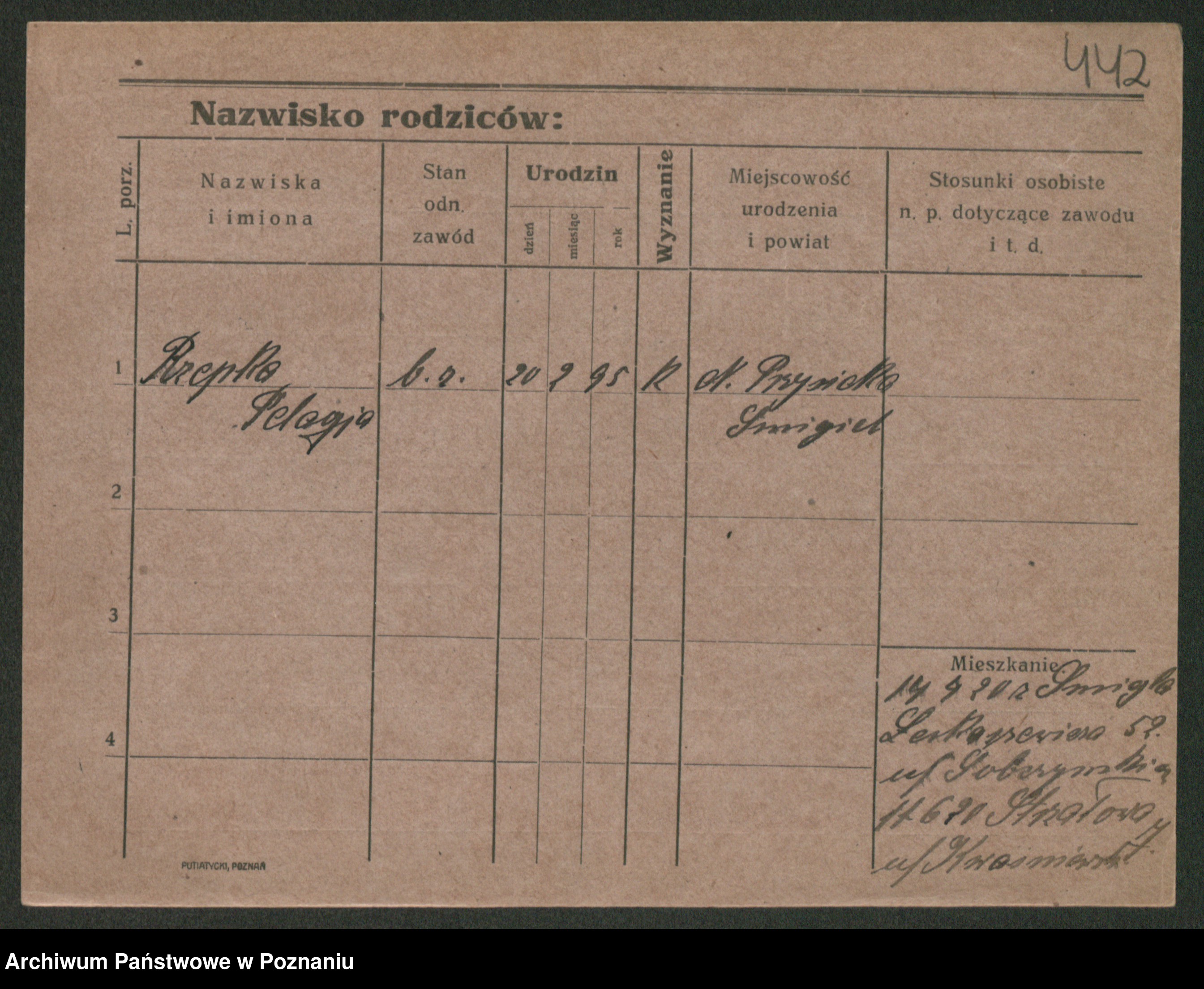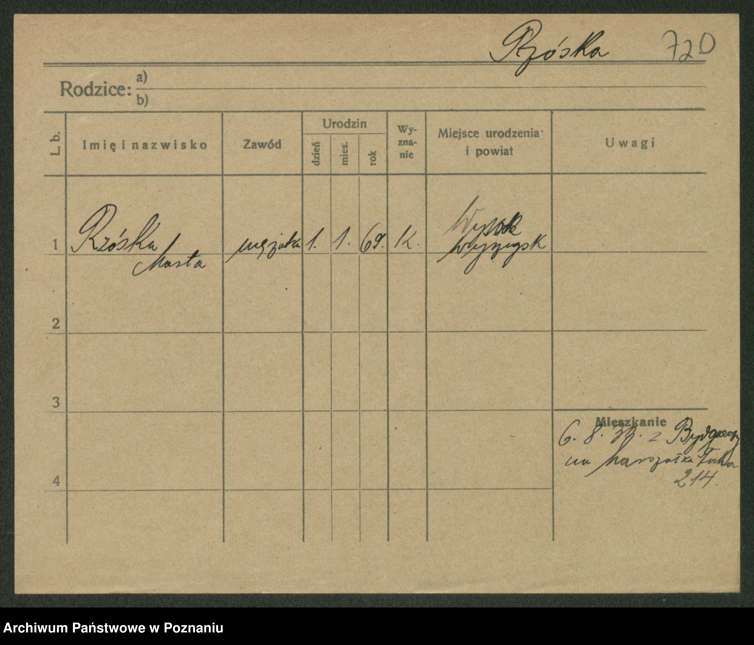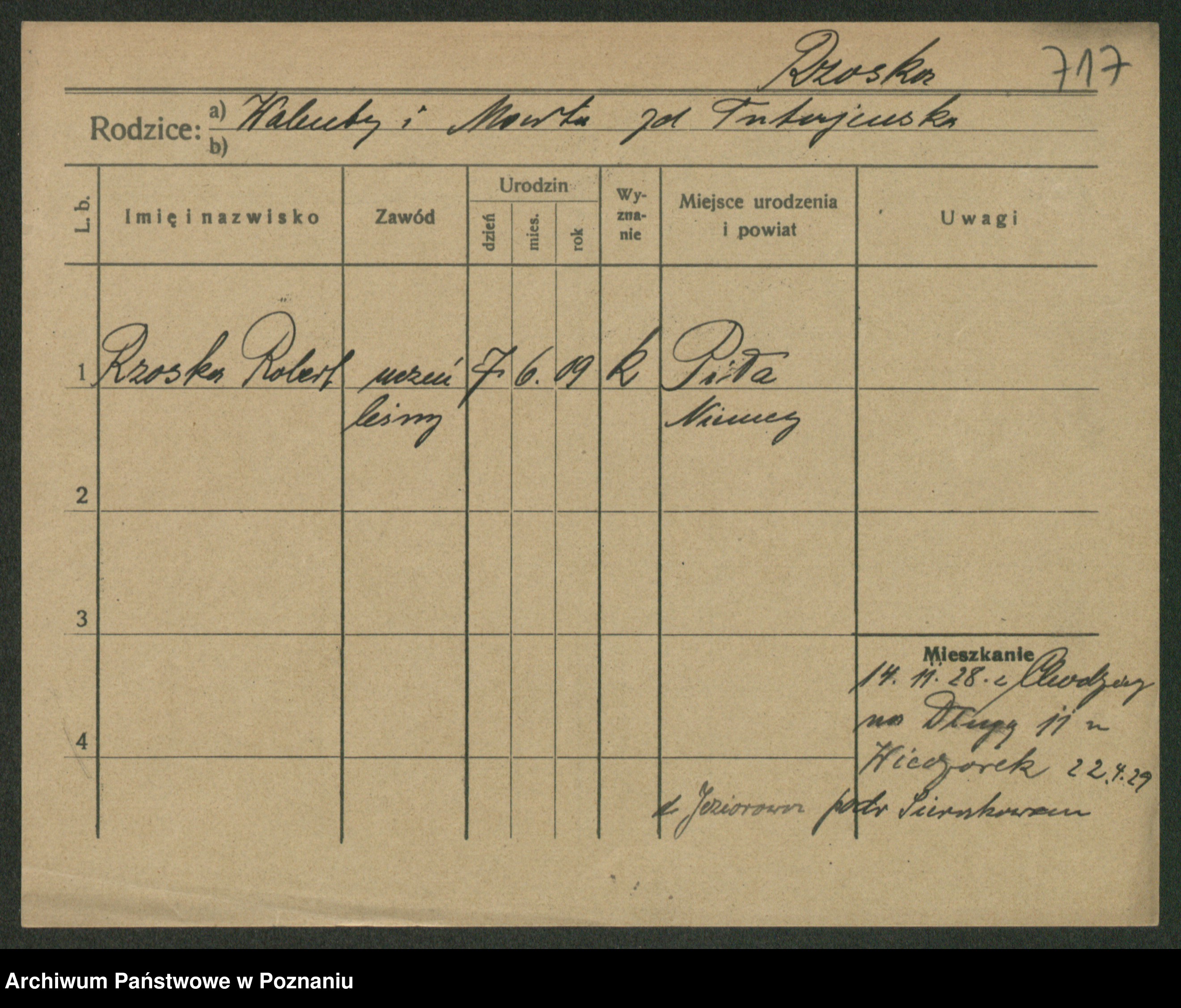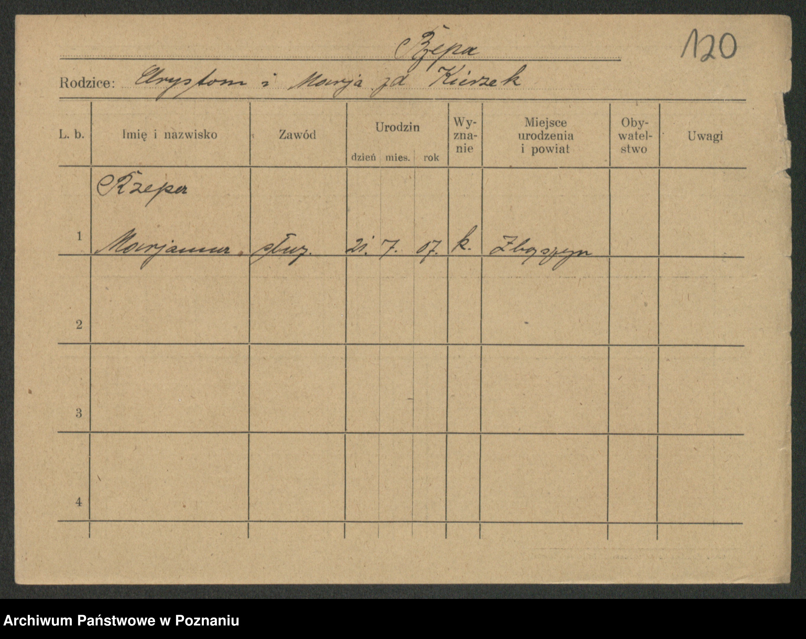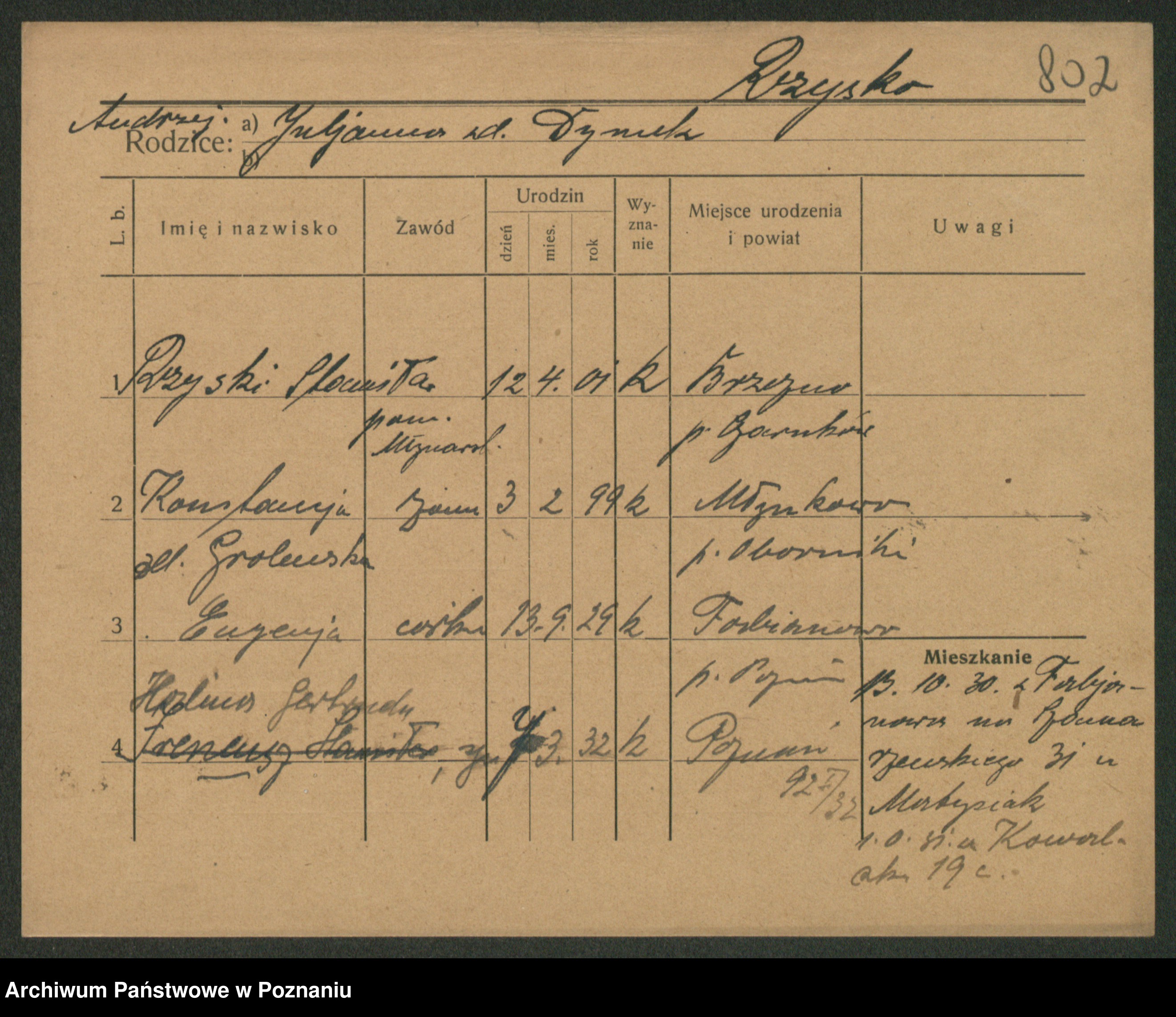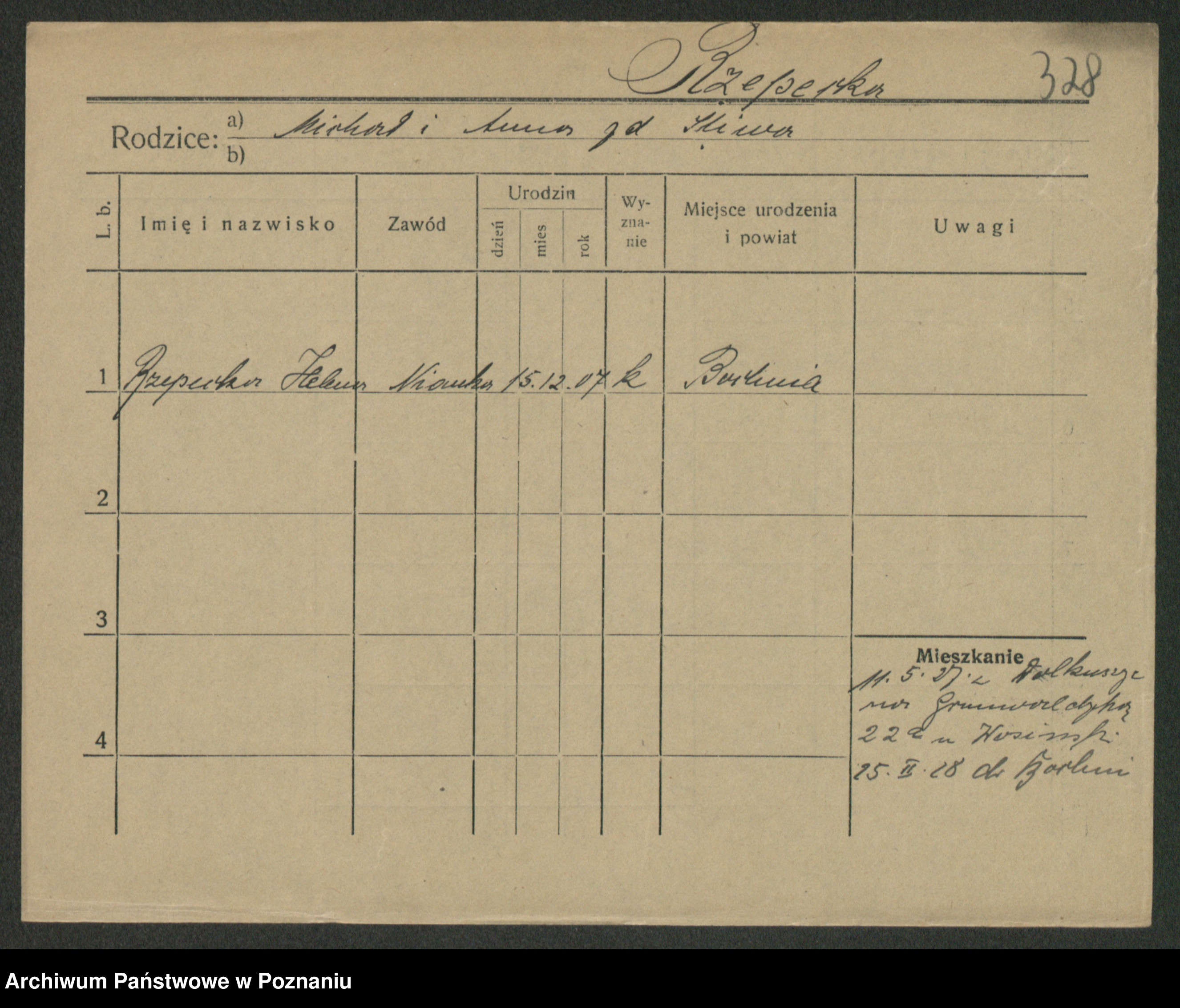Podgląd karty osobowej dostępny jest po kliknięciu na nazwisko lub ikonkę karty. Można dokonywać powiększenia (ikony na górze) lub przechodzić między kolejnymi skanami (strzałki po bokach).