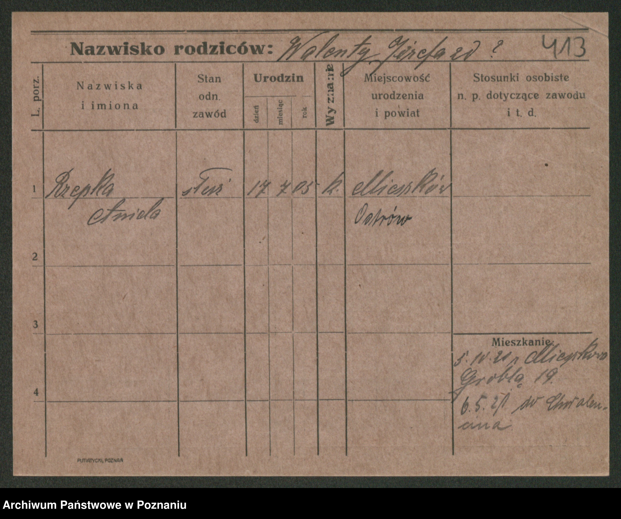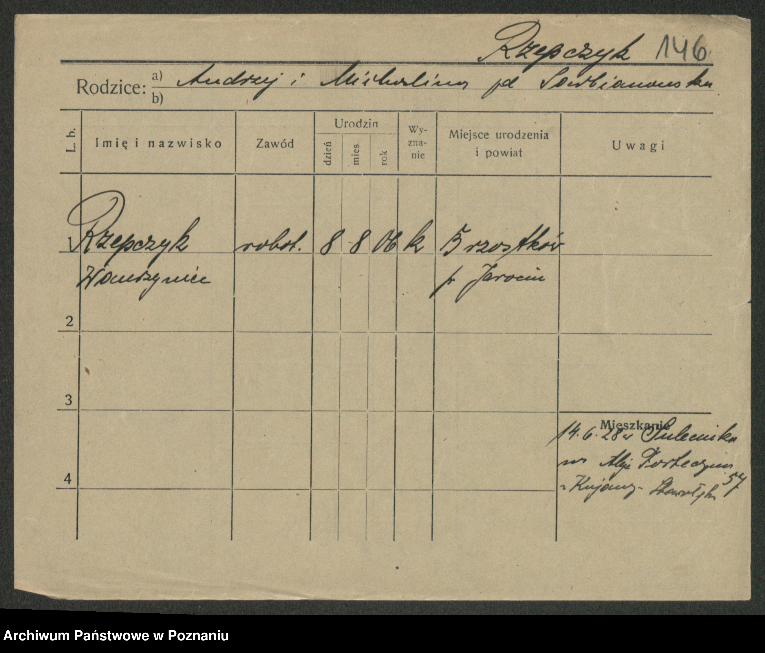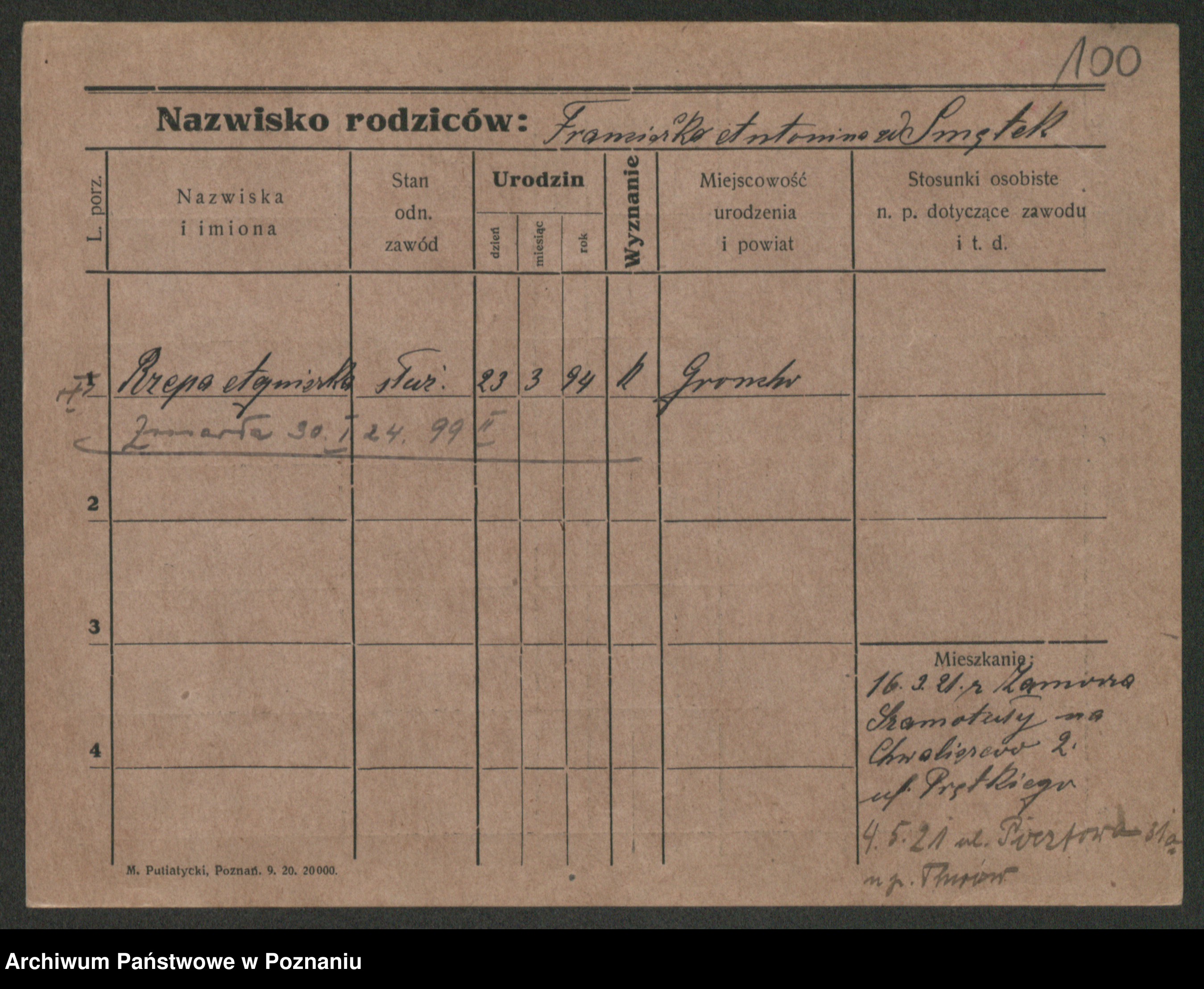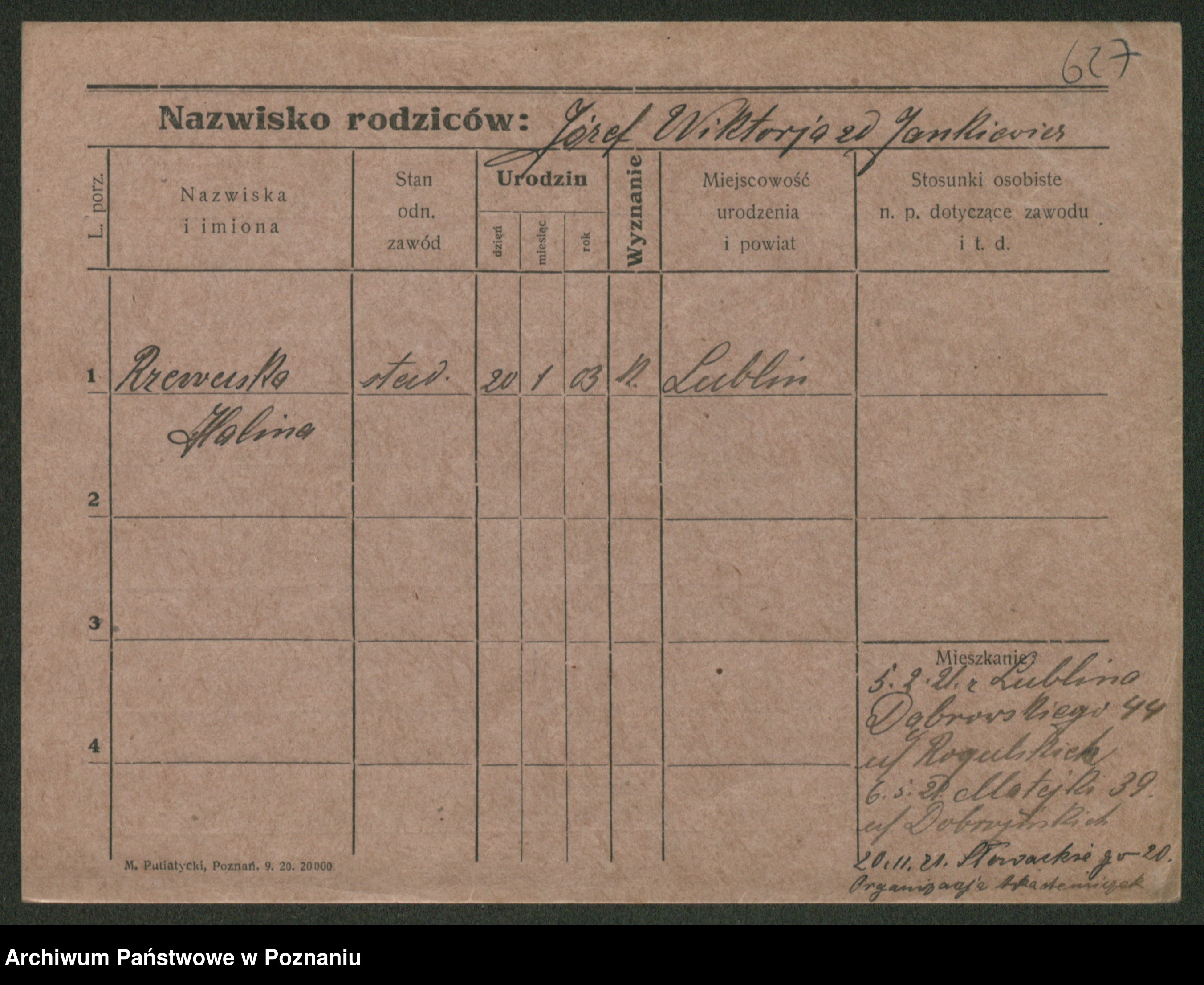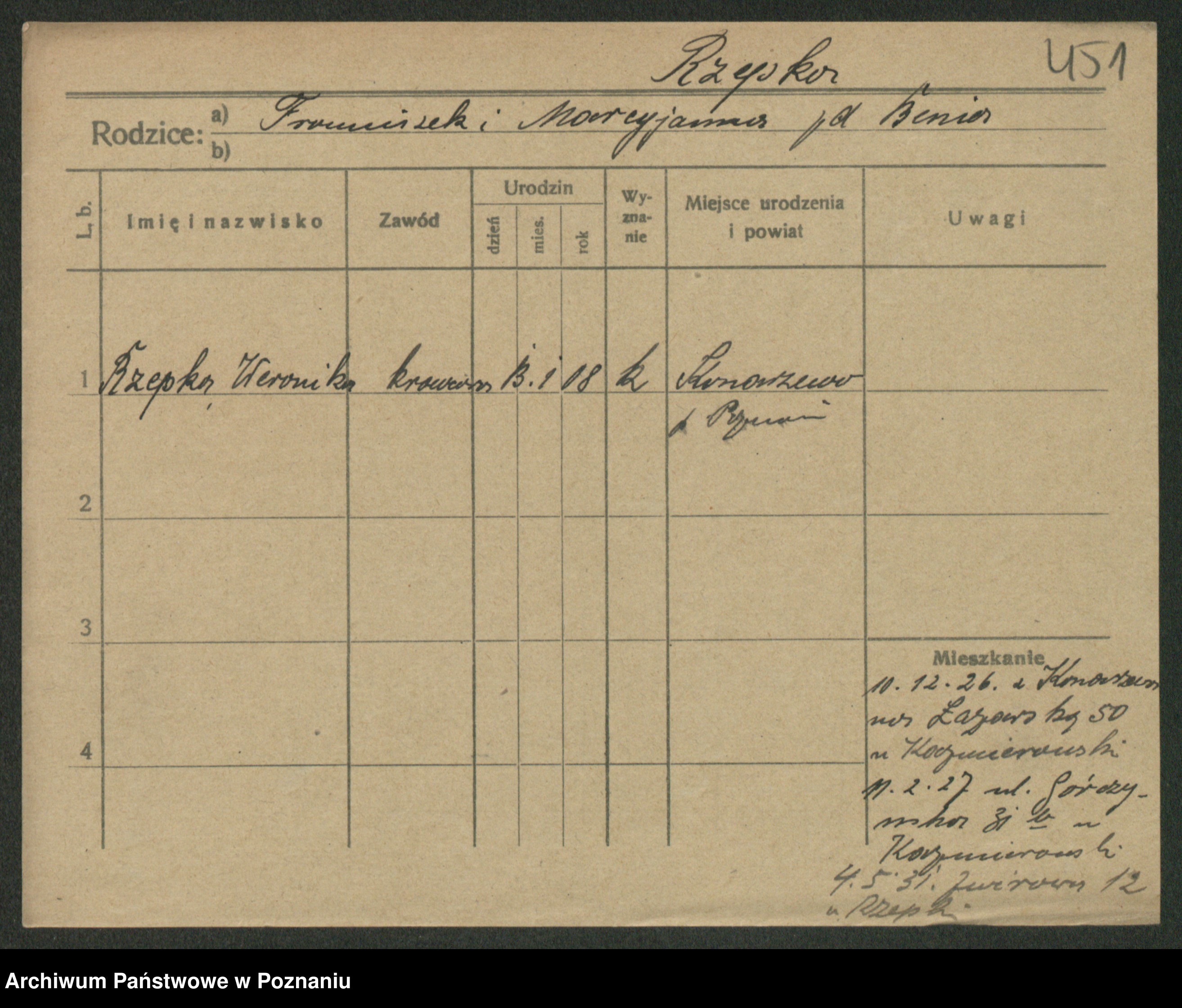 Podgląd karty osobowej dostępny jest po kliknięciu na nazwisko lub ikonkę karty. Można dokonywać powiększenia (ikony na górze) lub przechodzić między kolejnymi skanami (strzałki po bokach).