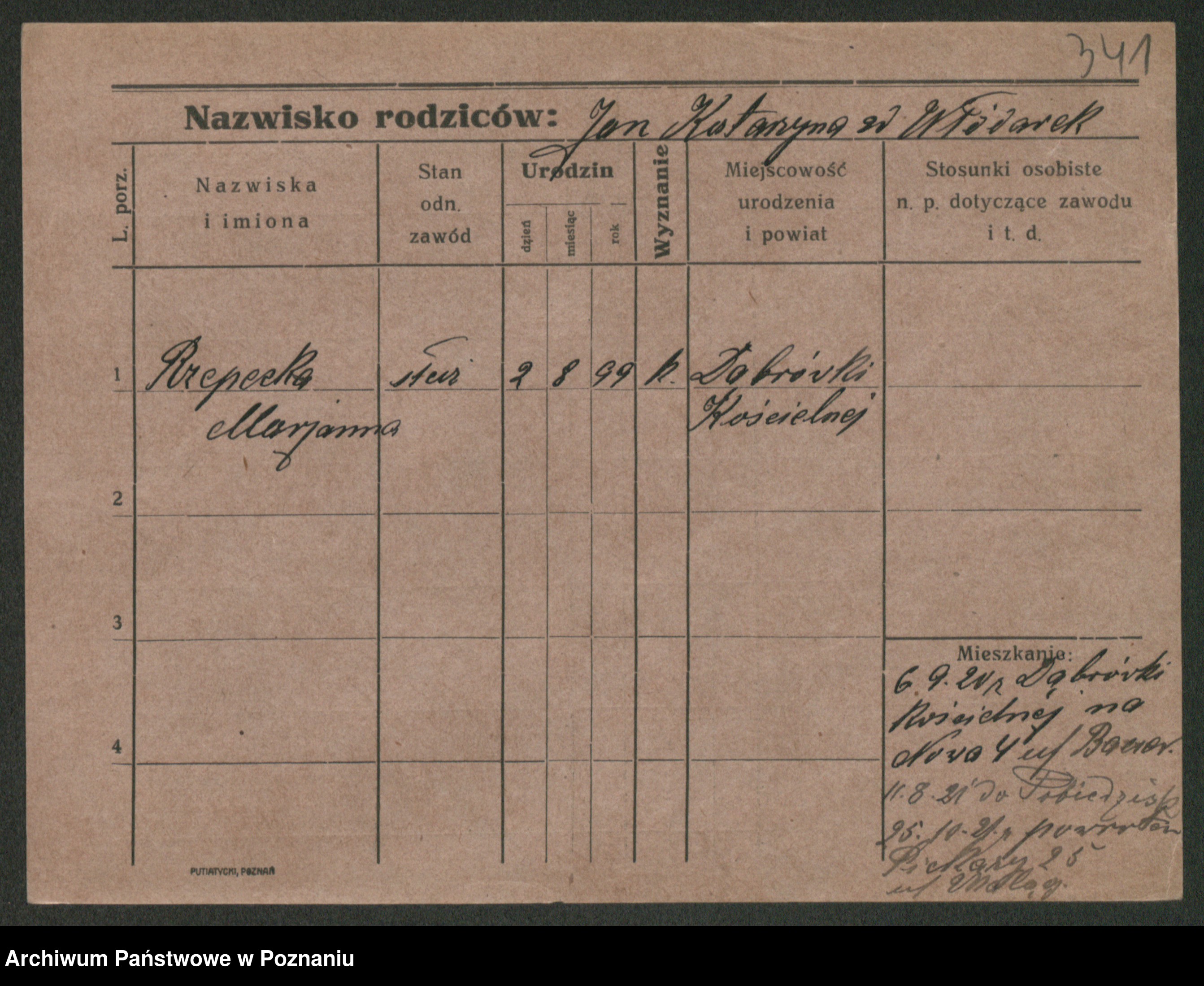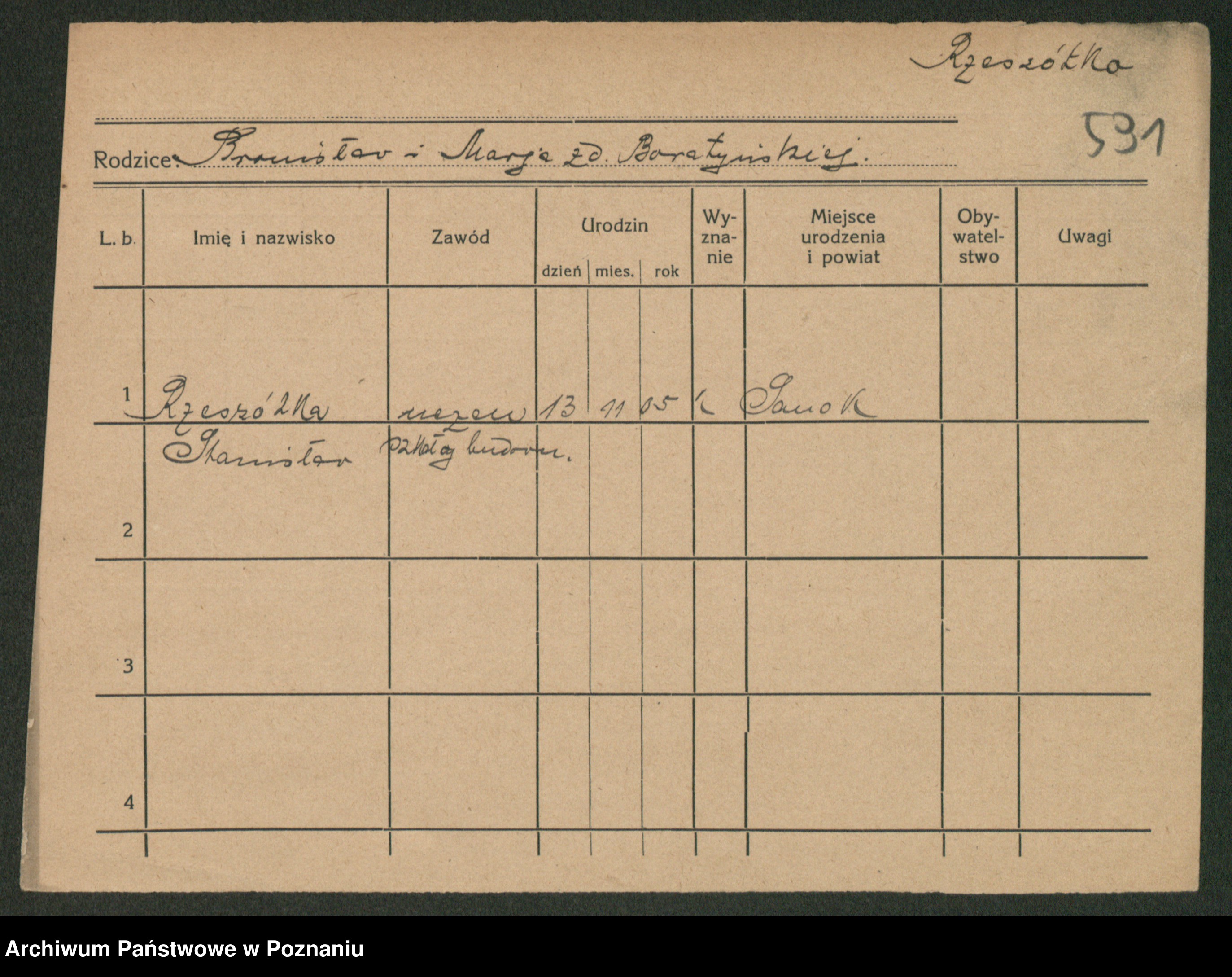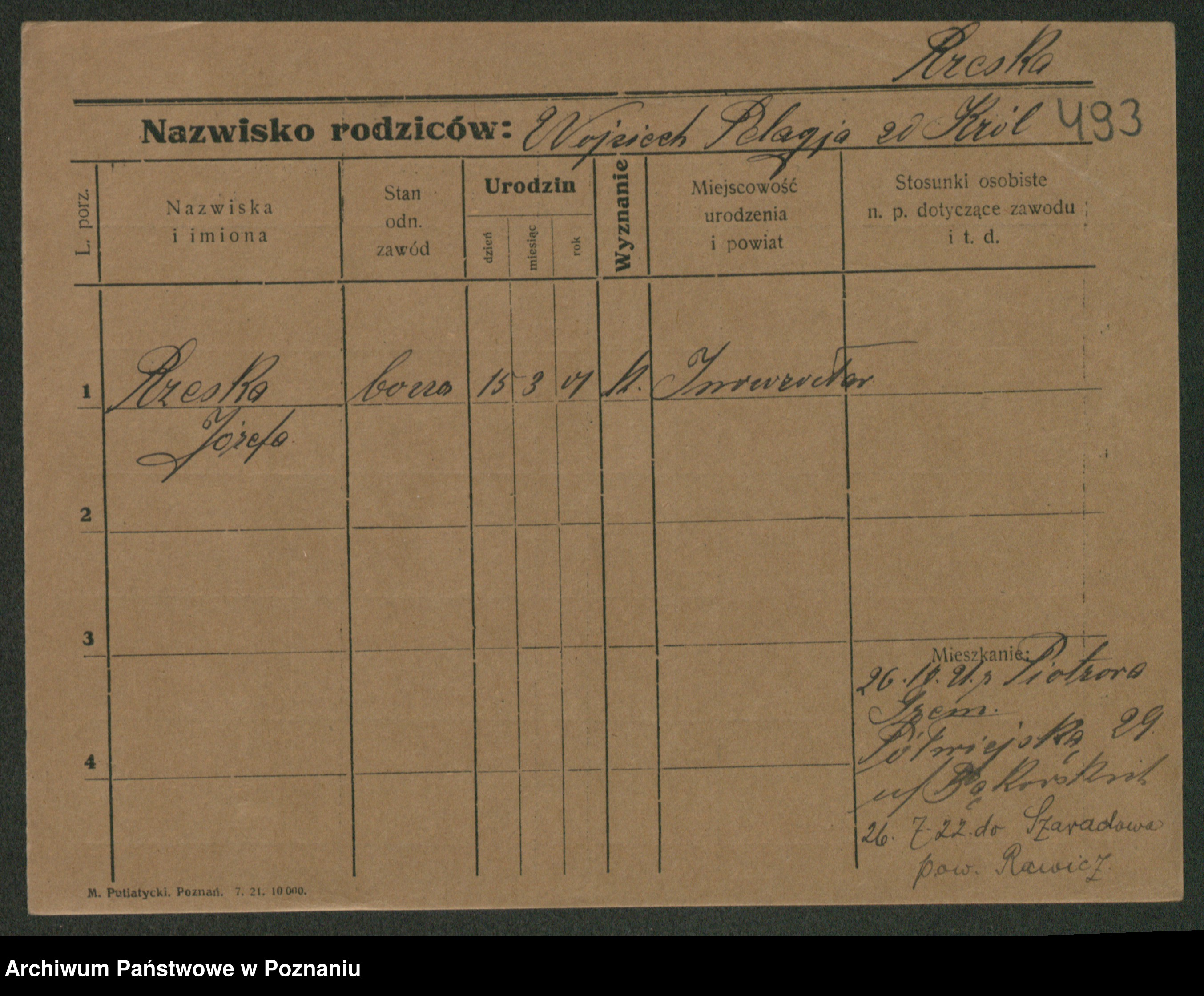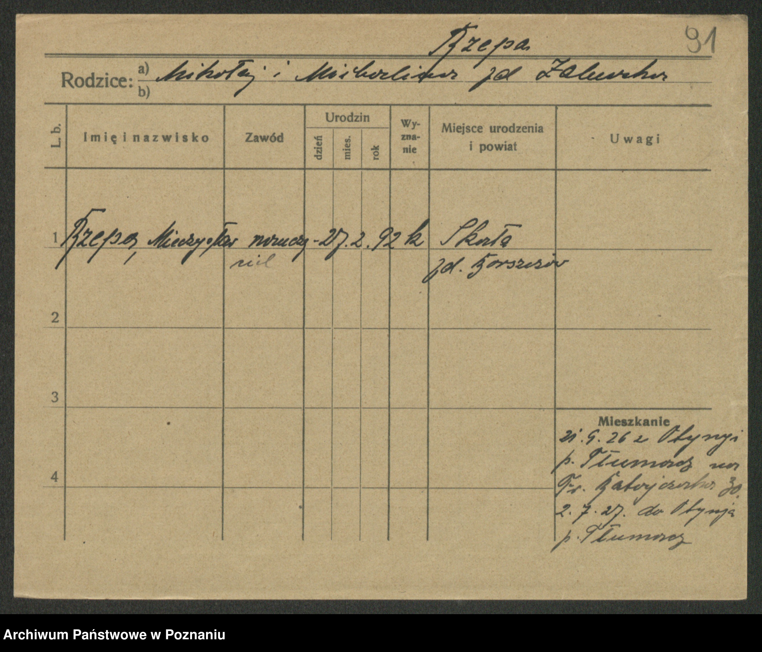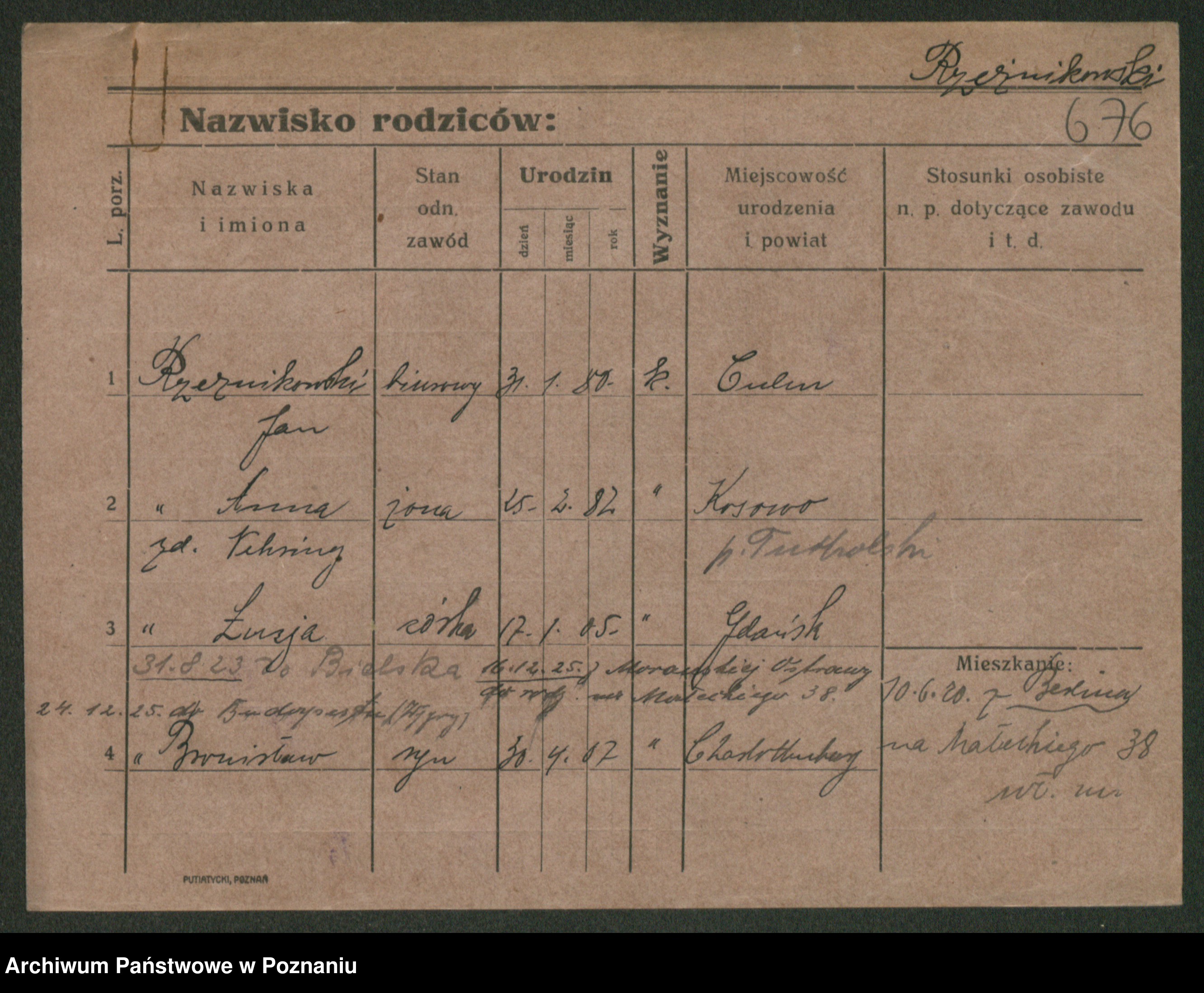 Podgląd karty osobowej dostępny jest po kliknięciu na nazwisko lub ikonkę karty. Można dokonywać powiększenia (ikony na górze) lub przechodzić między kolejnymi skanami (strzałki po bokach).