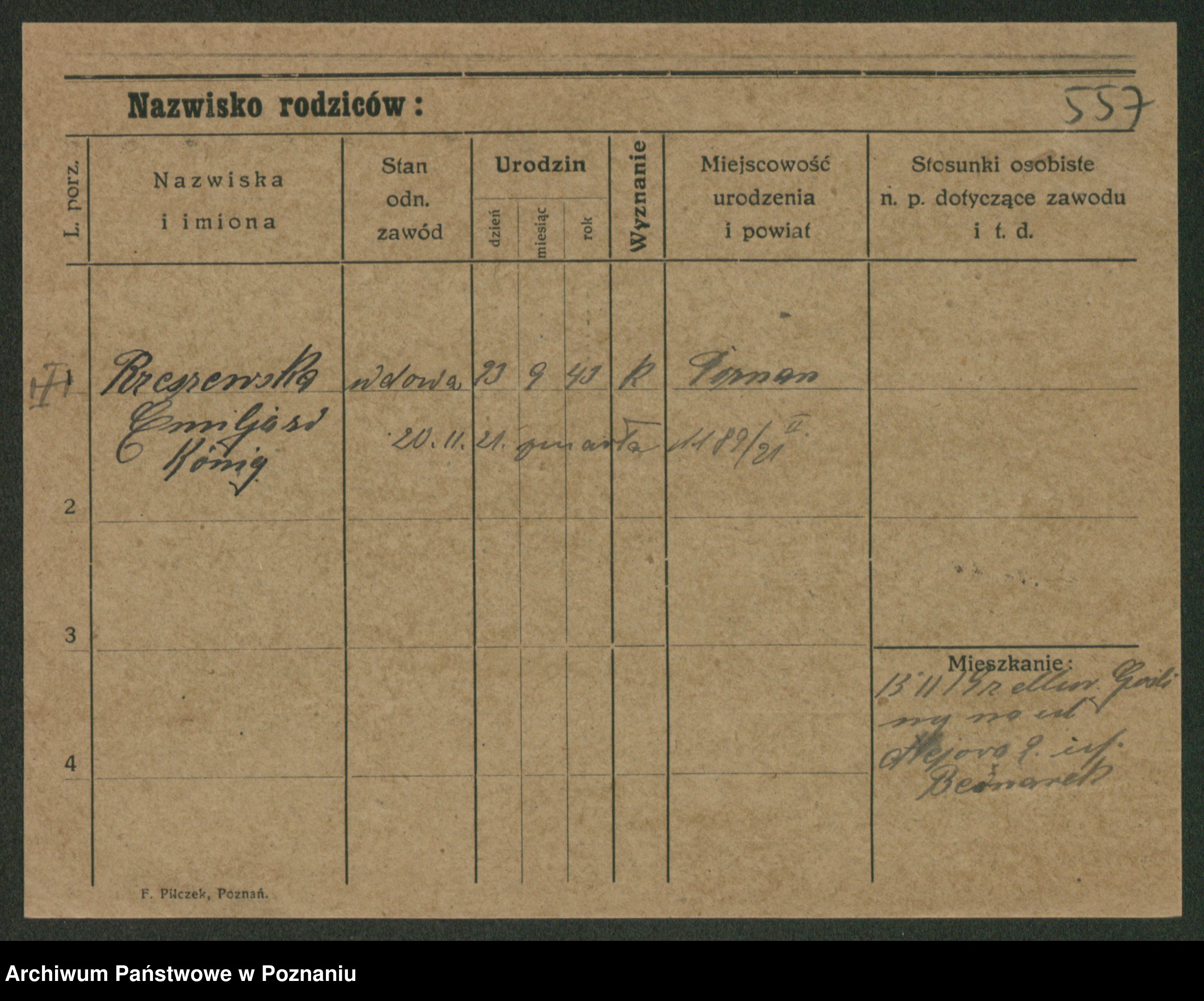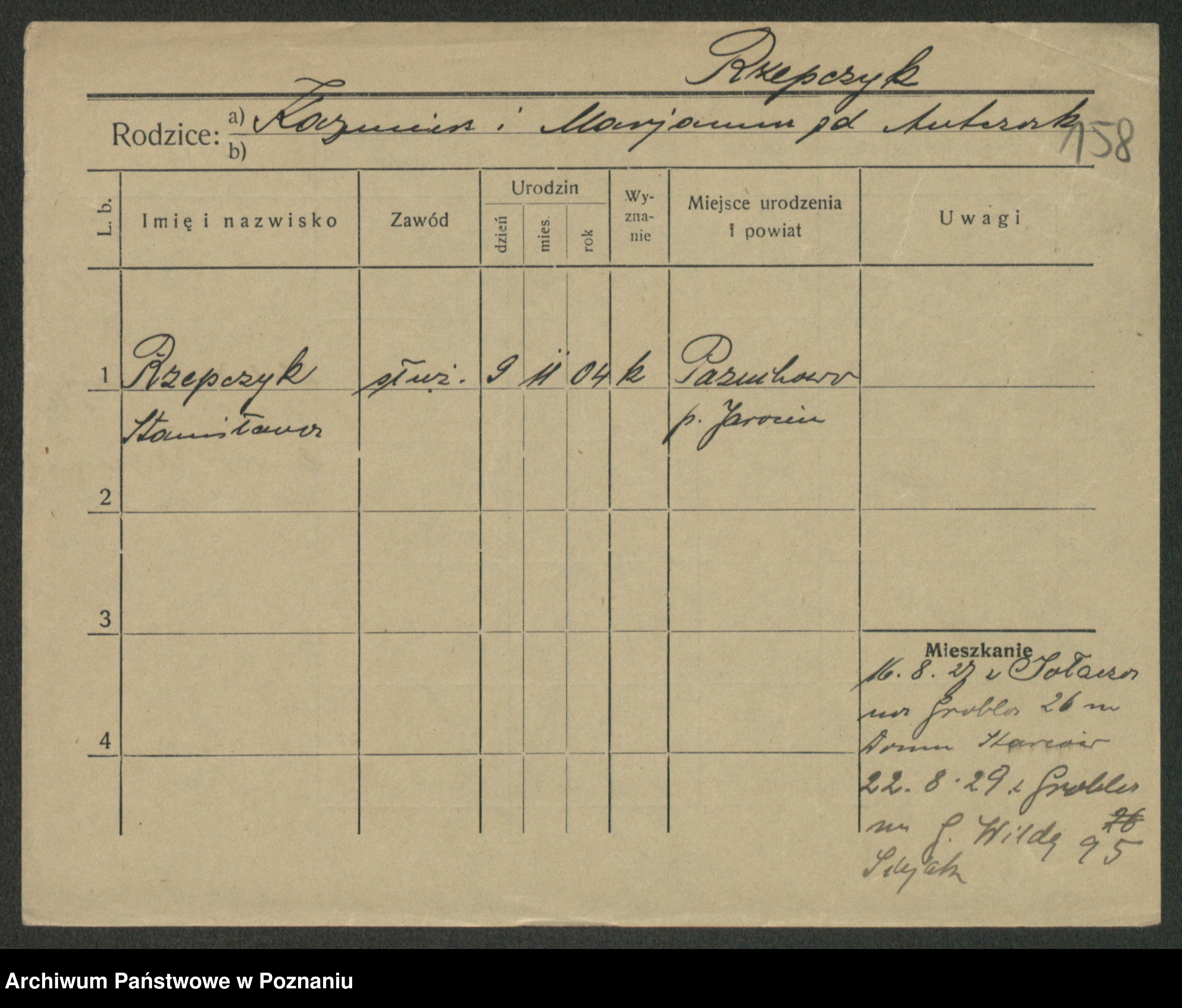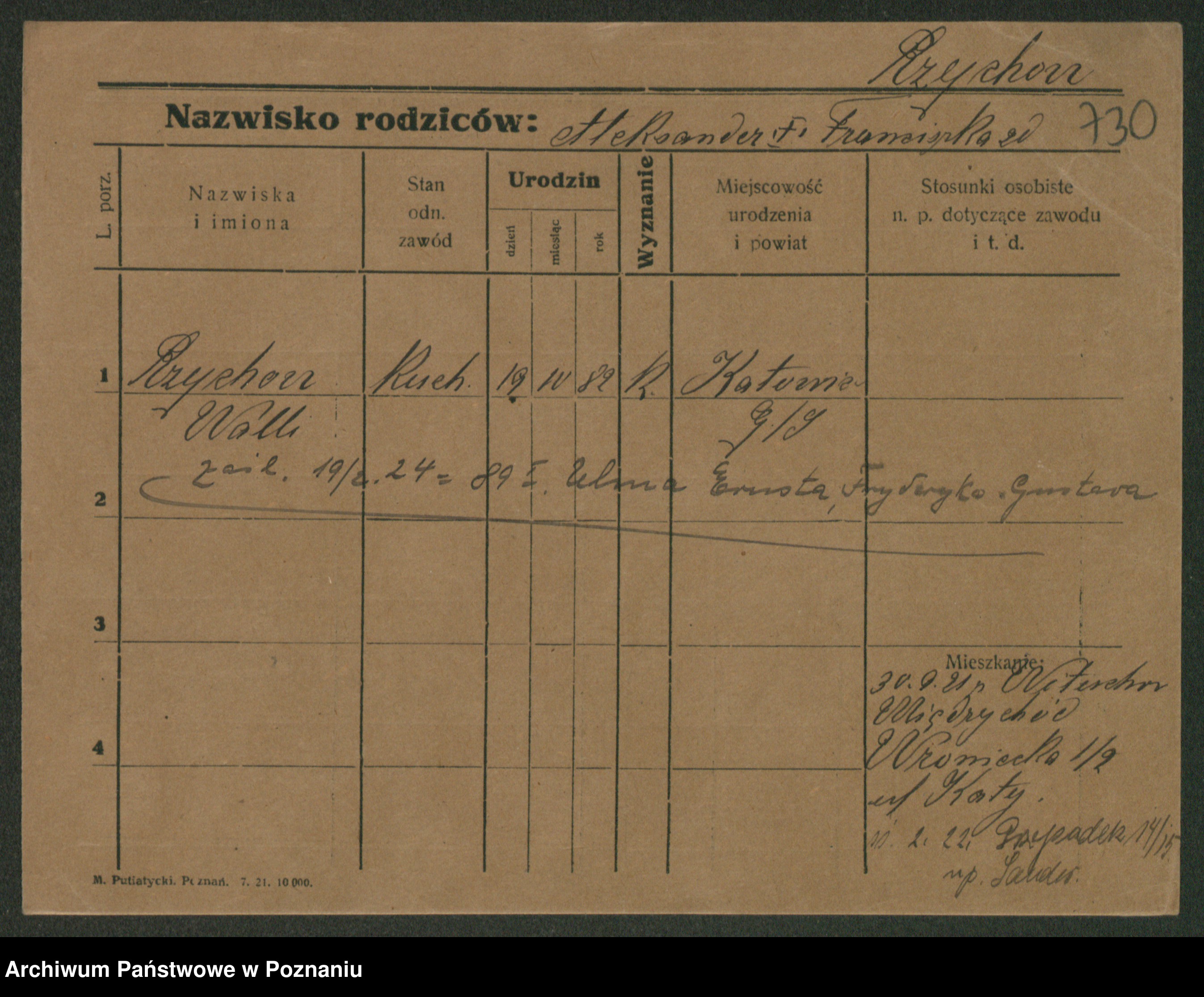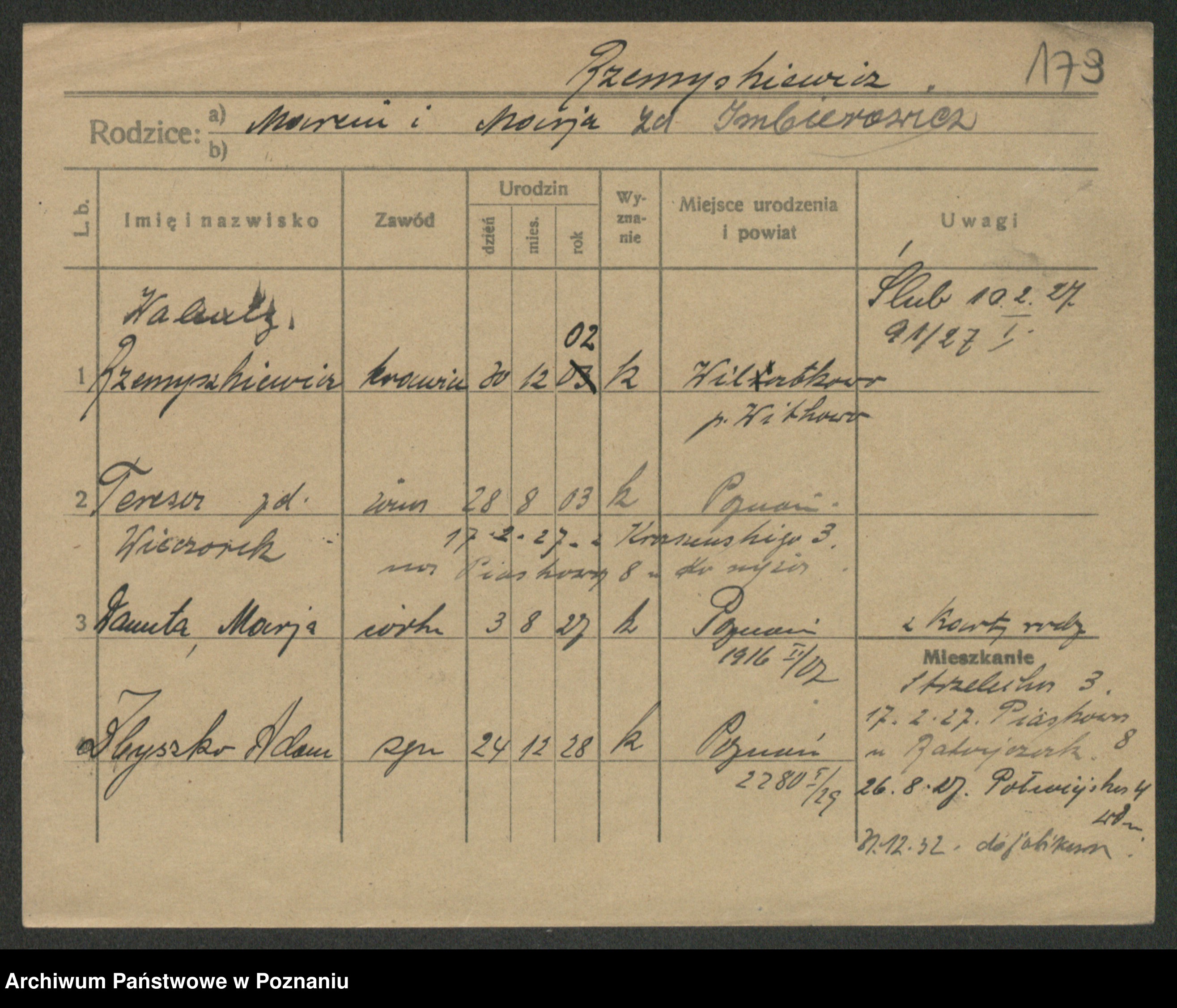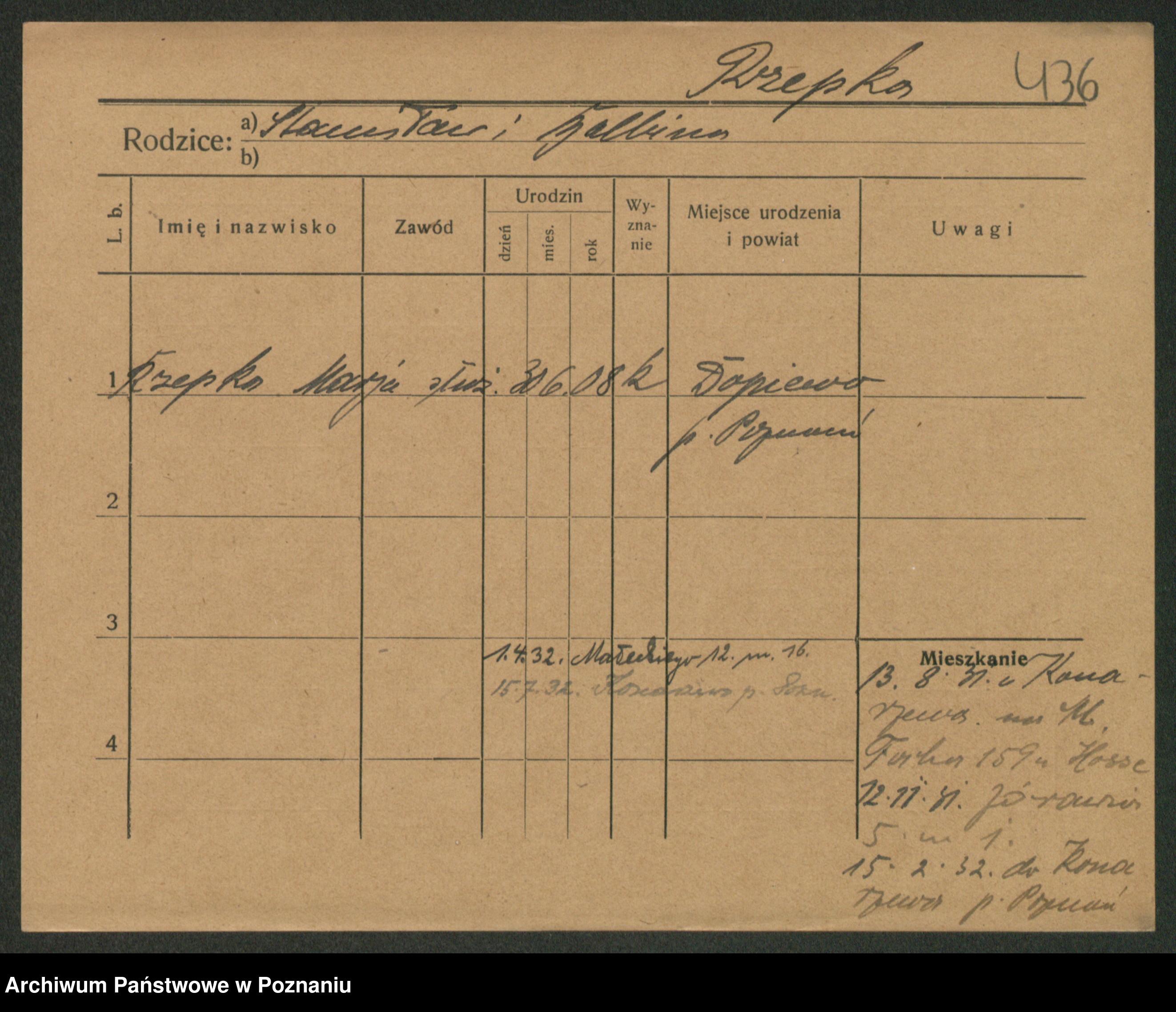 Podgląd karty osobowej dostępny jest po kliknięciu na nazwisko lub ikonkę karty. Można dokonywać powiększenia (ikony na górze) lub przechodzić między kolejnymi skanami (strzałki po bokach).