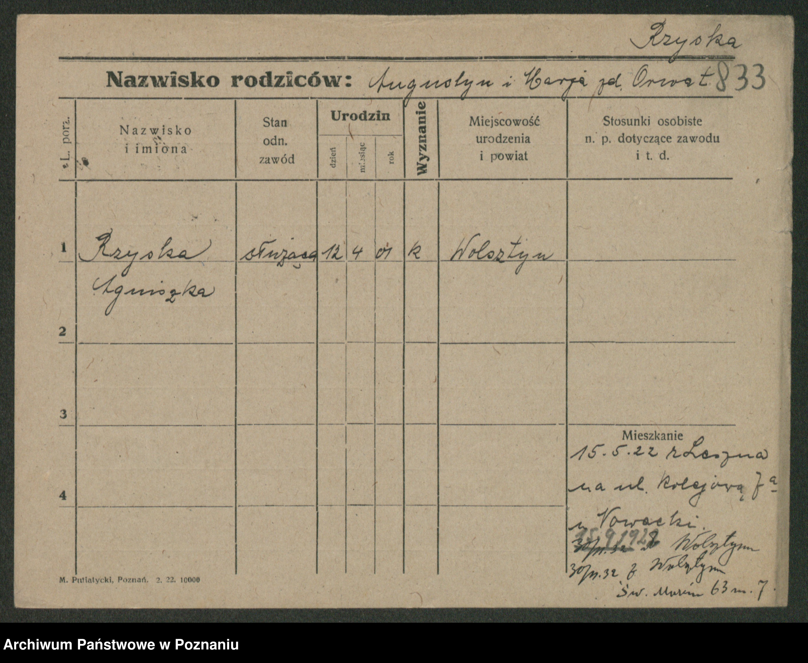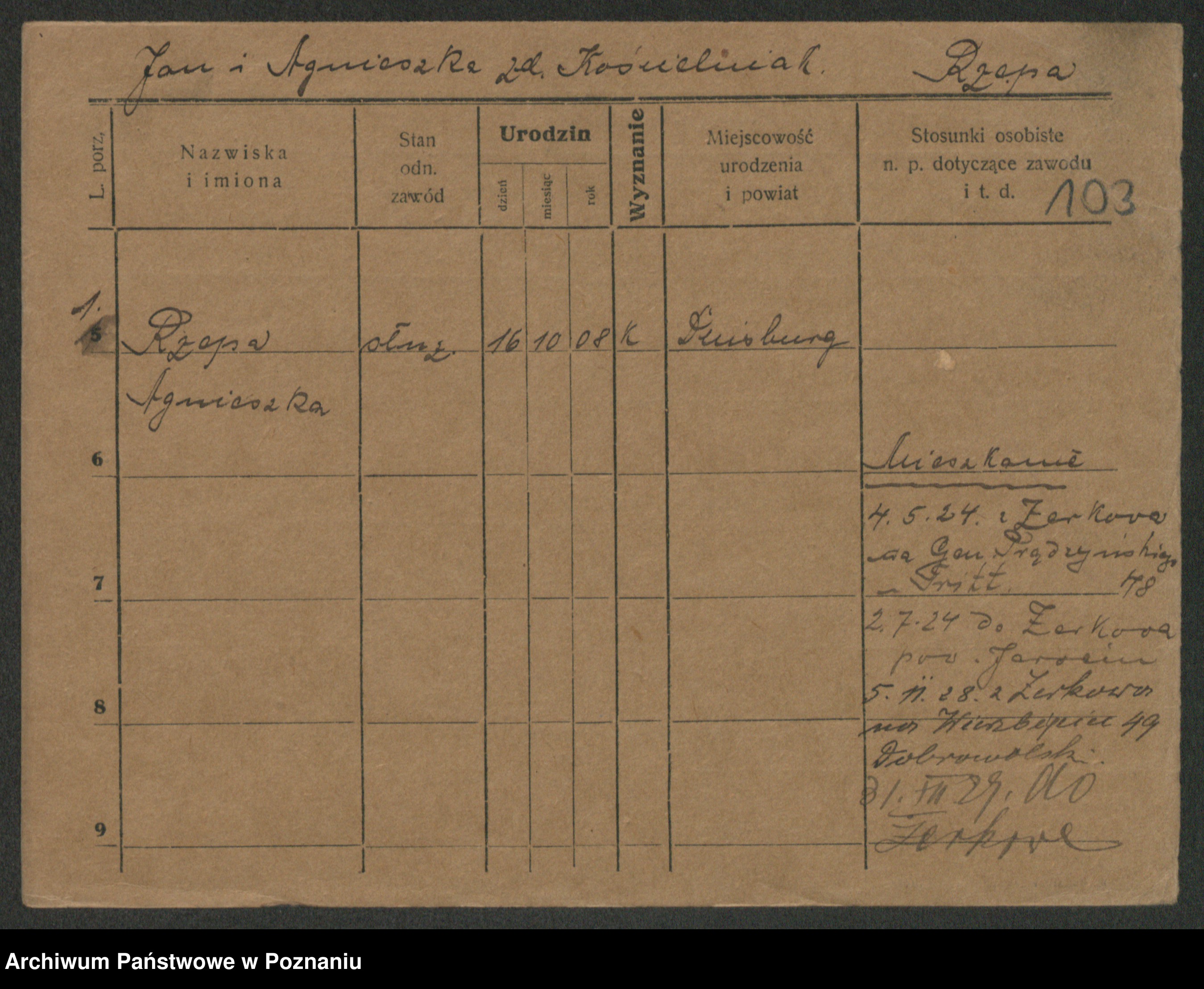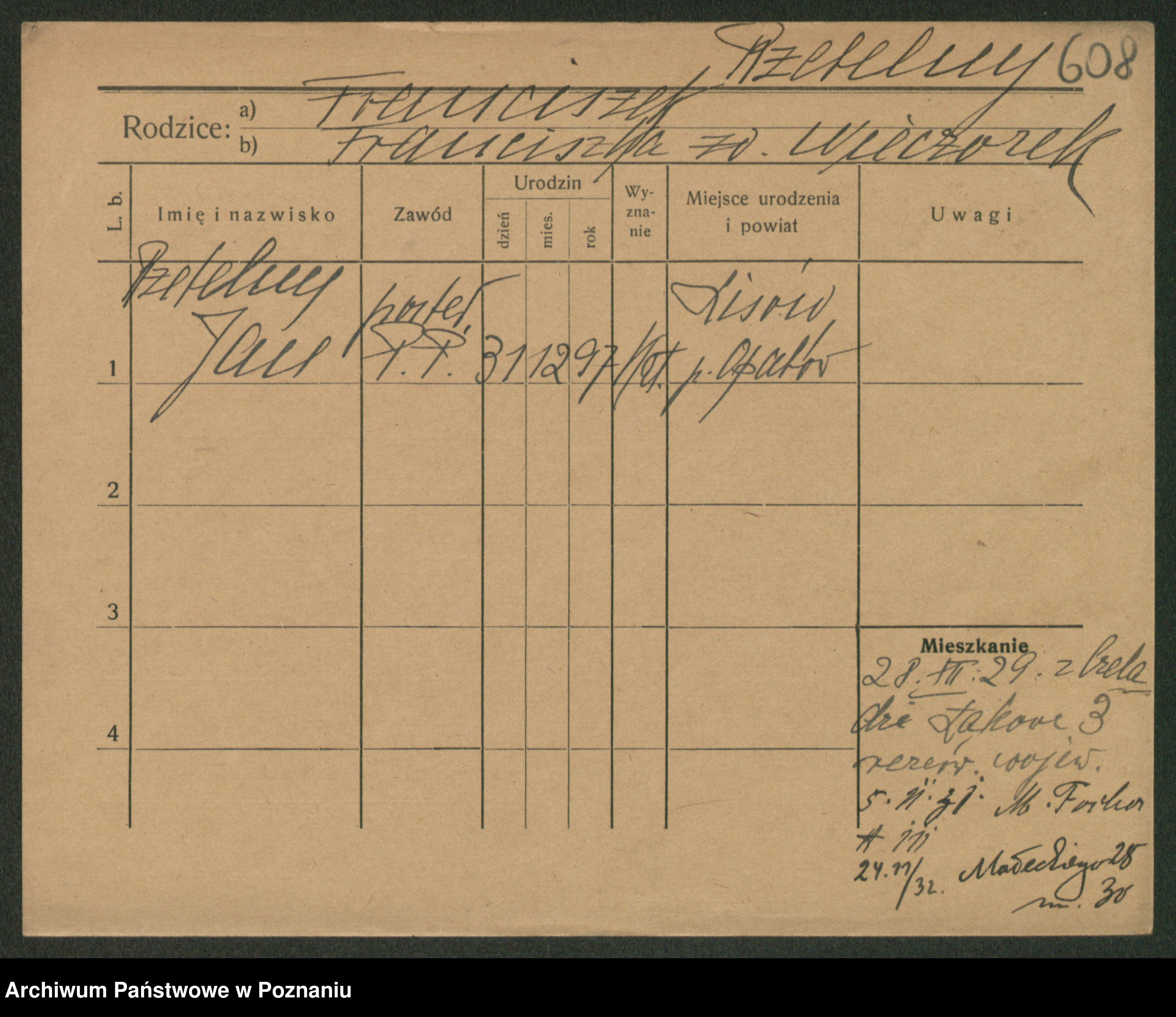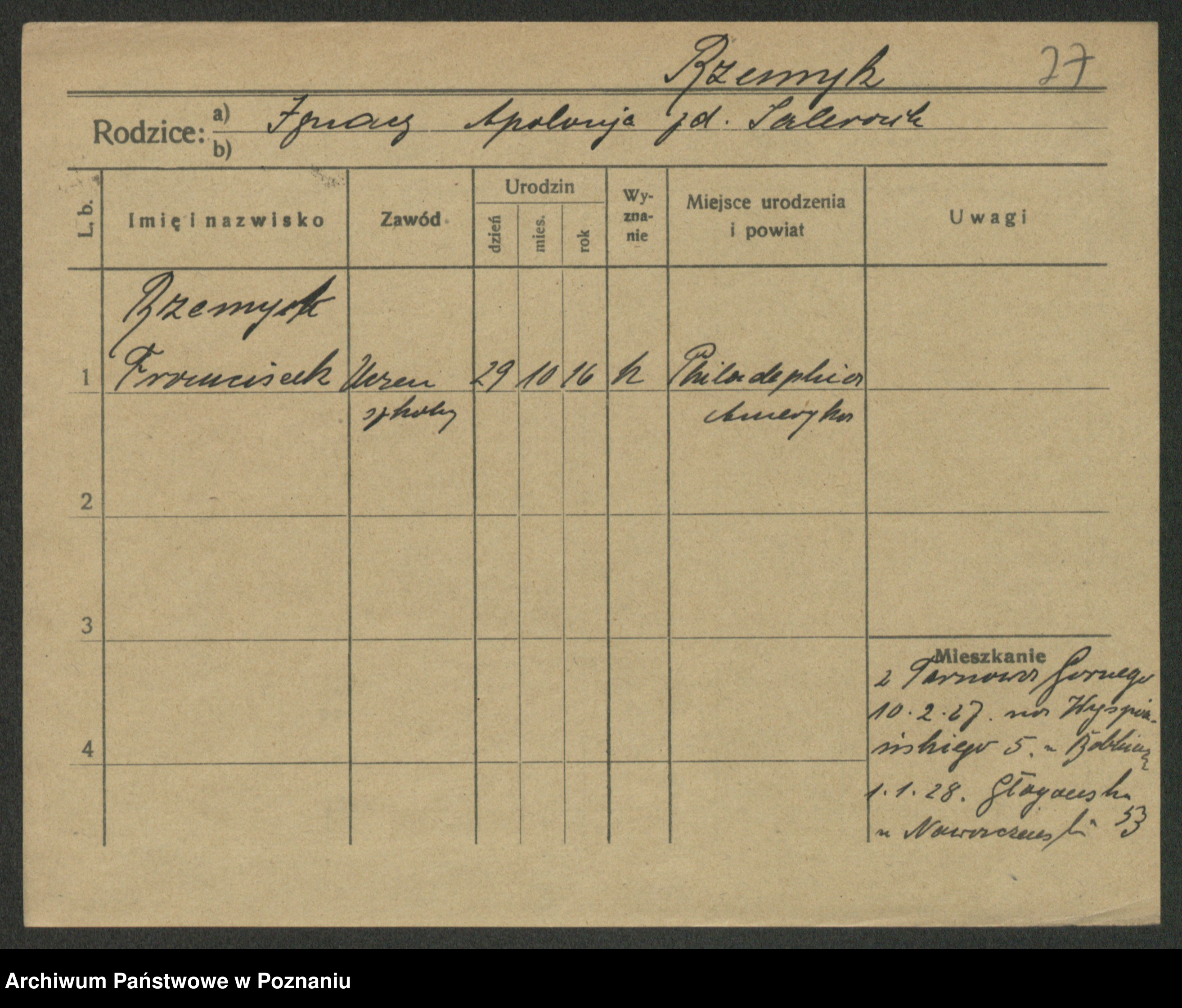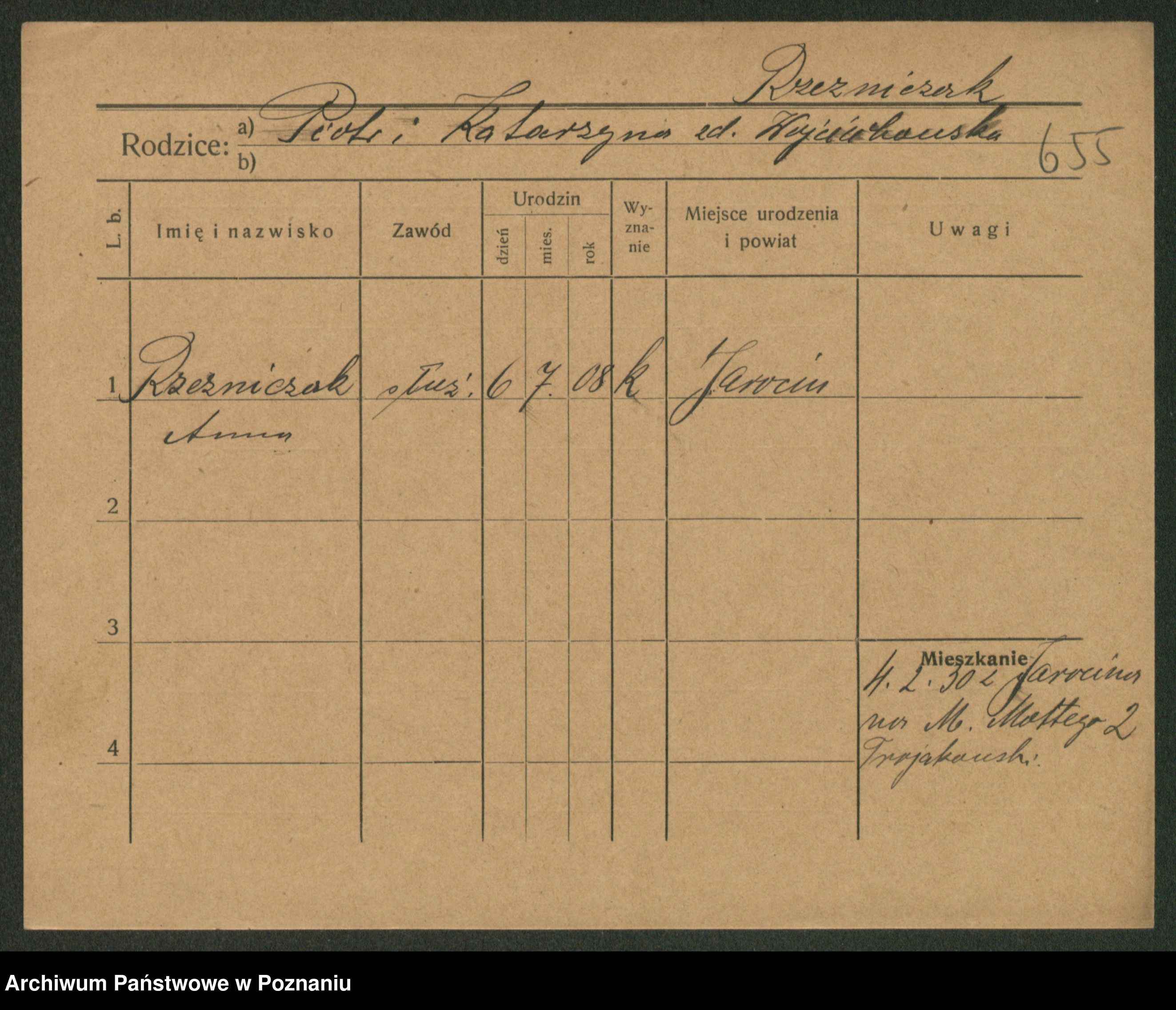 Podgląd karty osobowej dostępny jest po kliknięciu na nazwisko lub ikonkę karty. Można dokonywać powiększenia (ikony na górze) lub przechodzić między kolejnymi skanami (strzałki po bokach).