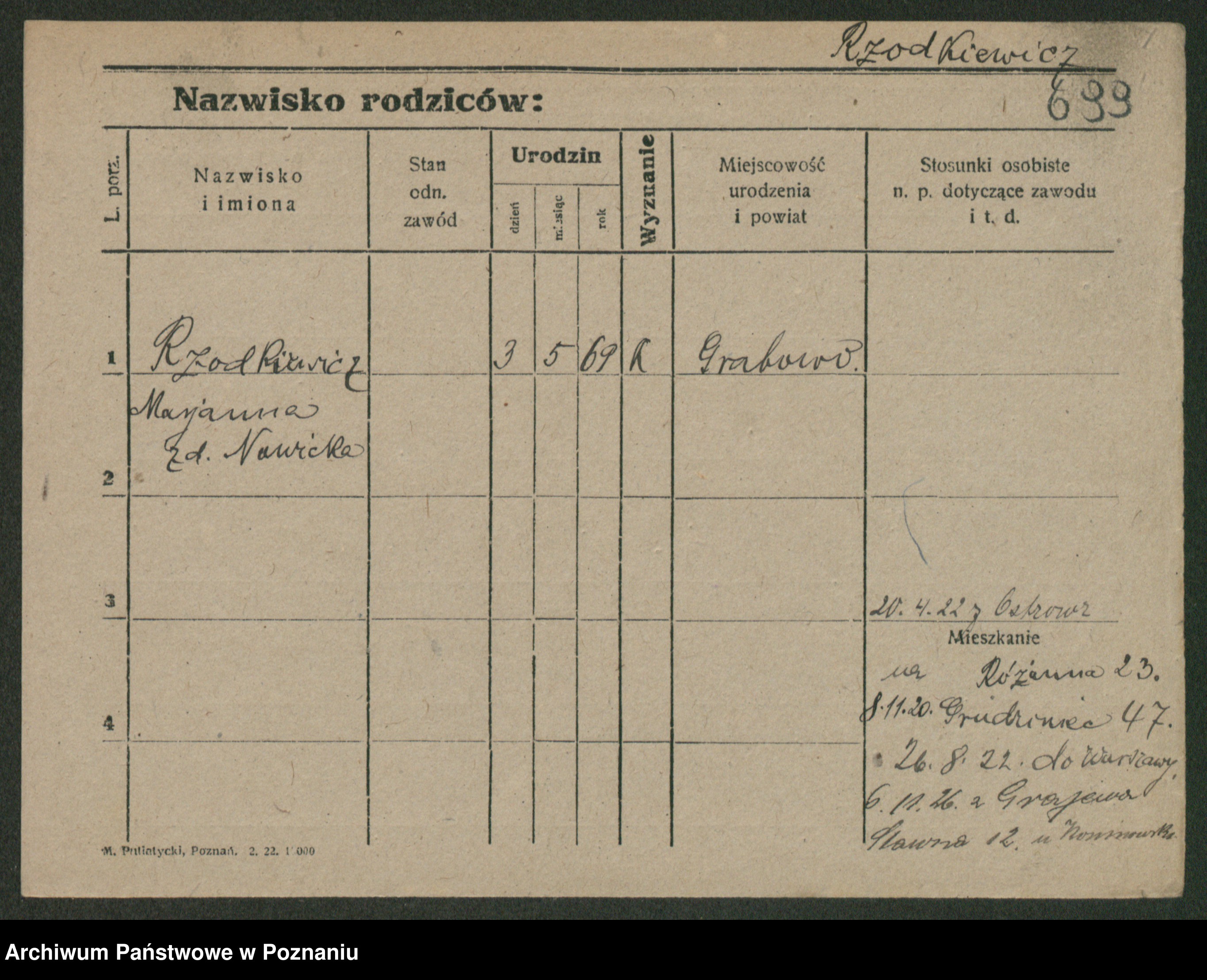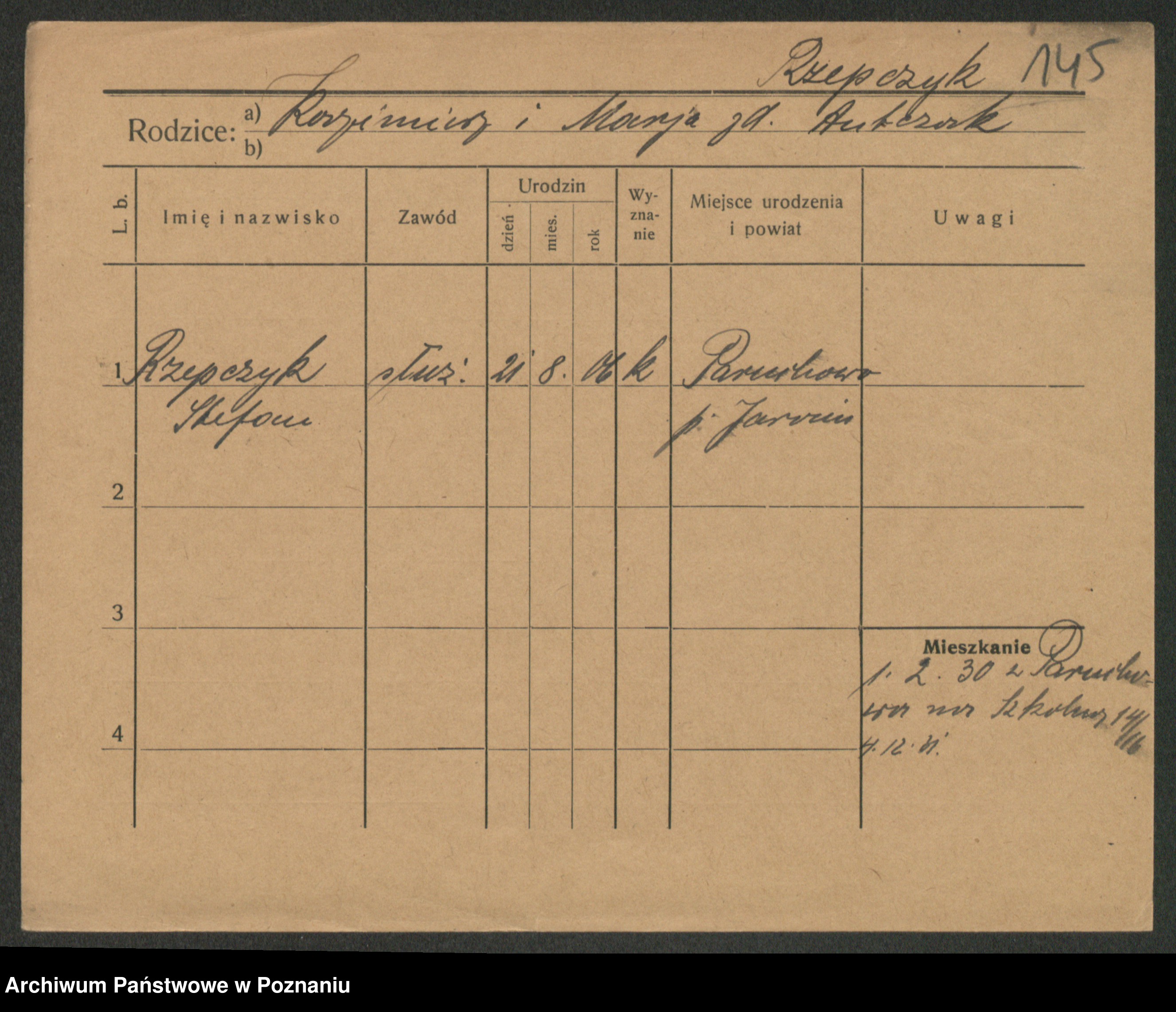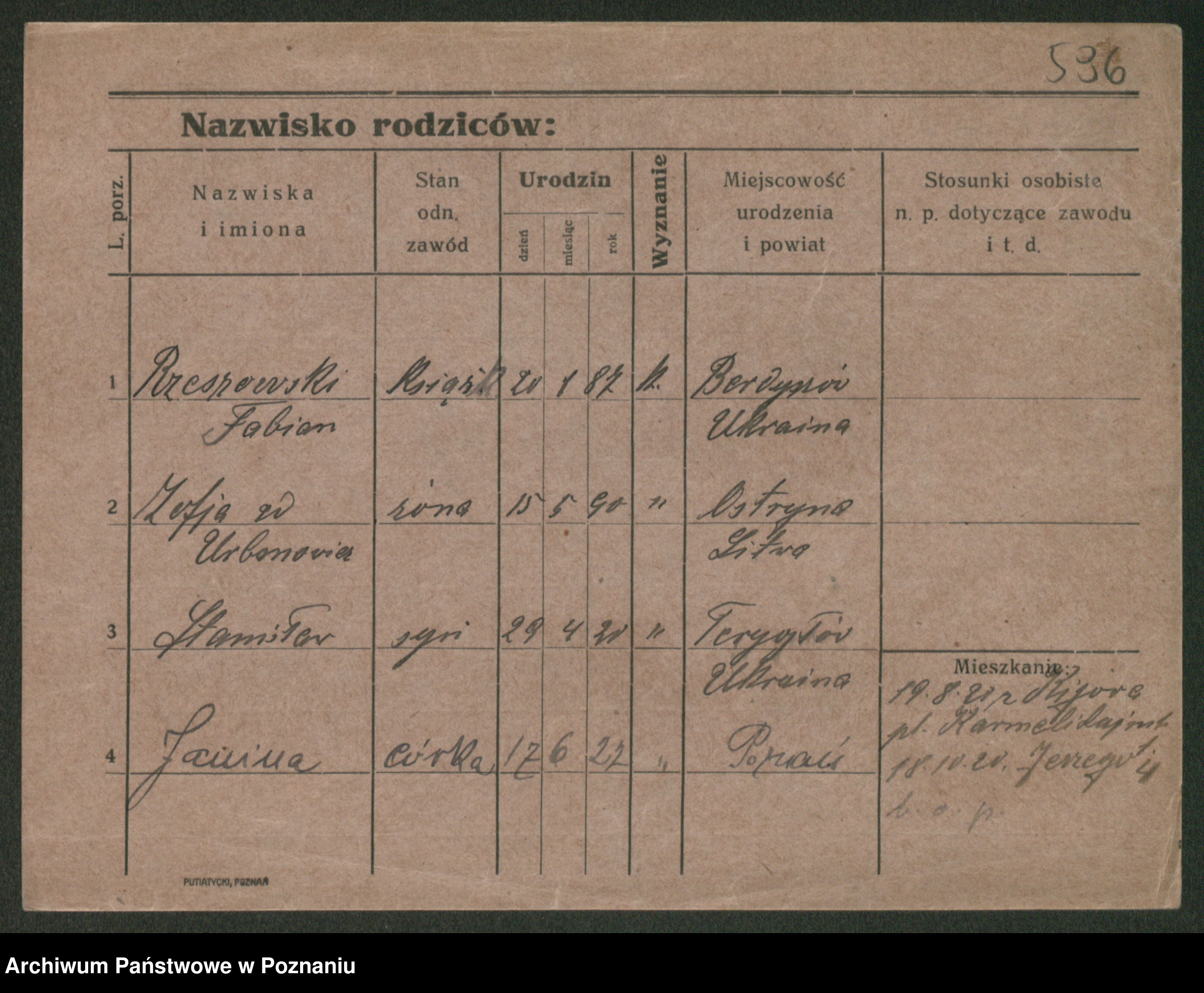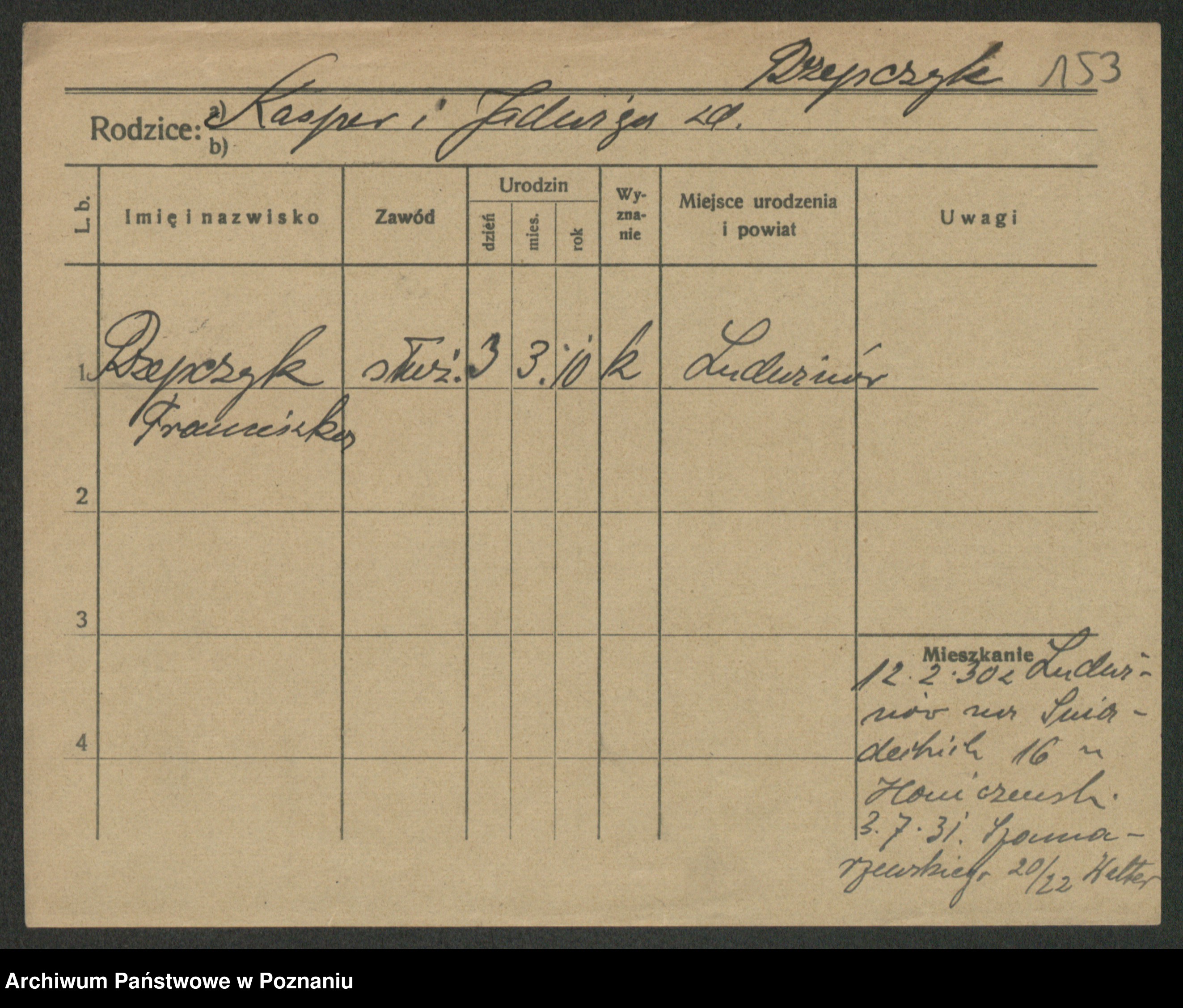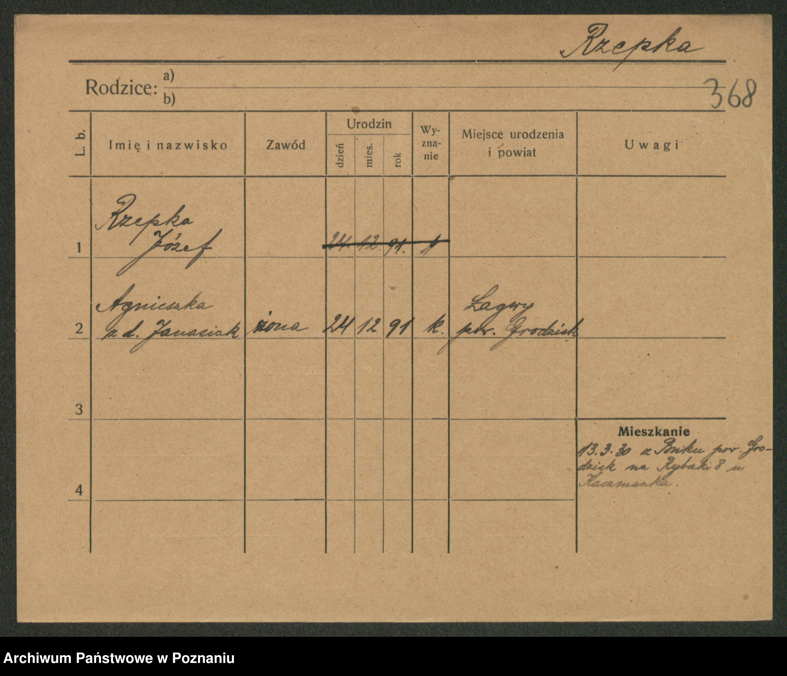 Podgląd karty osobowej dostępny jest po kliknięciu na nazwisko lub ikonkę karty. Można dokonywać powiększenia (ikony na górze) lub przechodzić między kolejnymi skanami (strzałki po bokach).