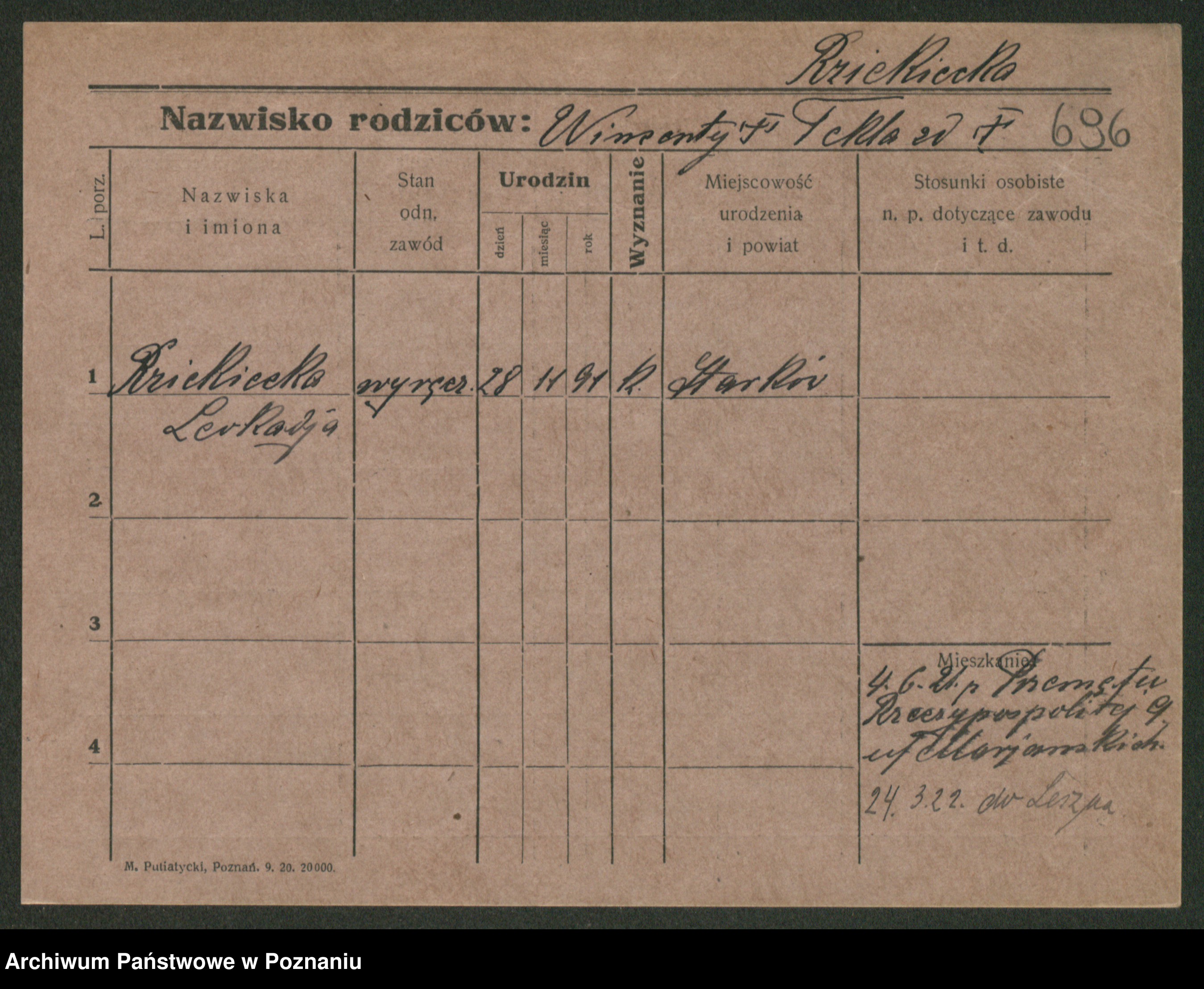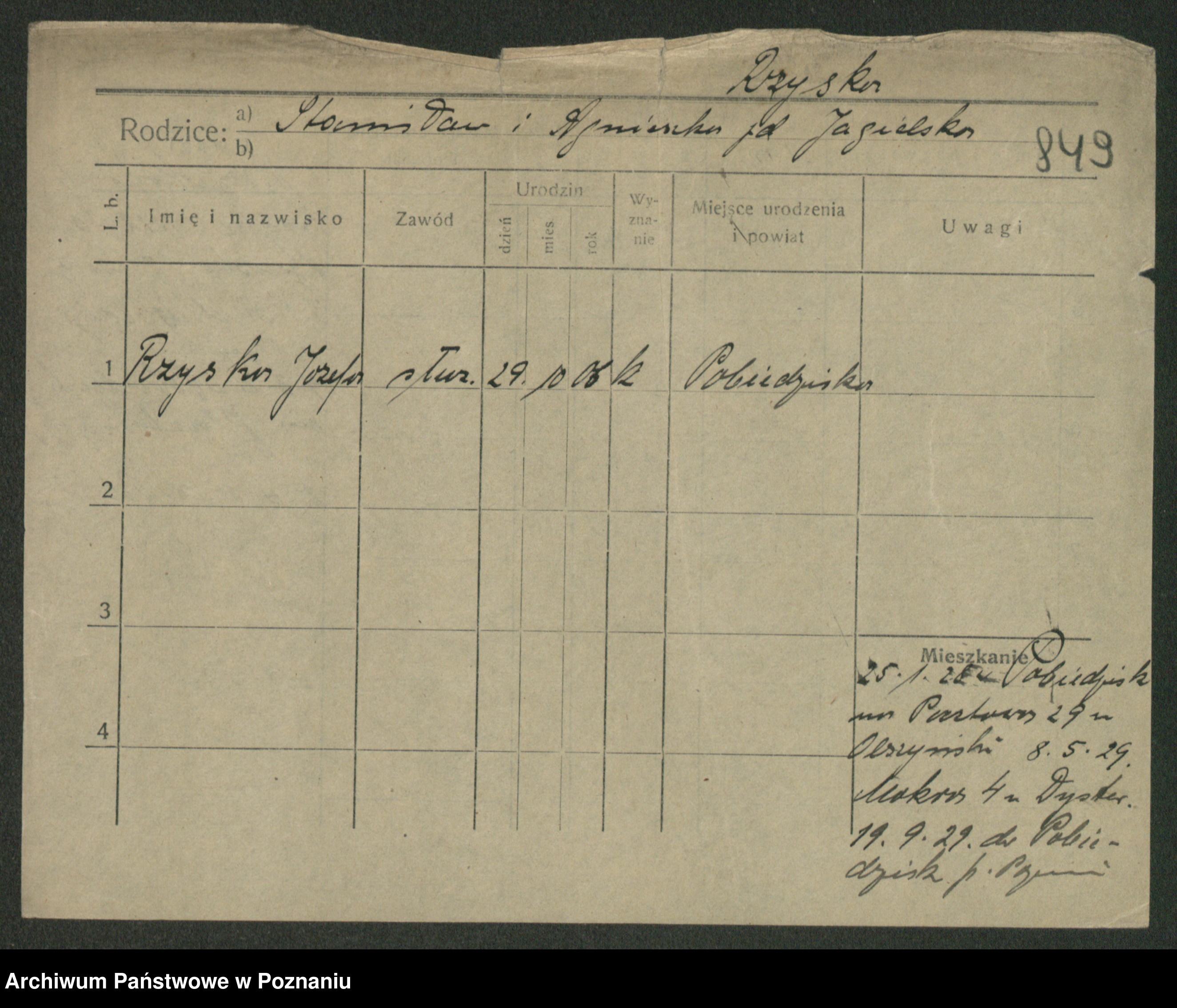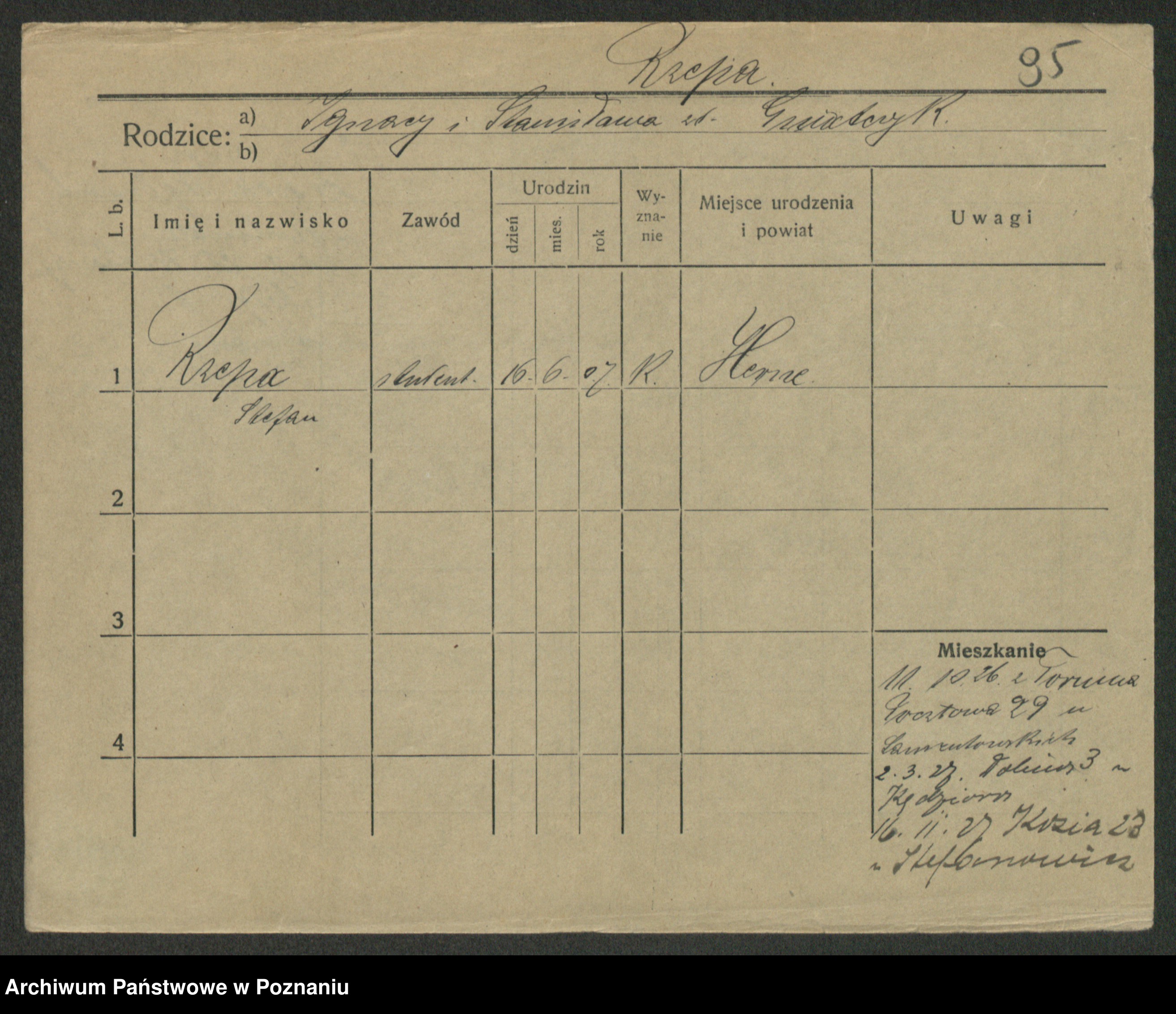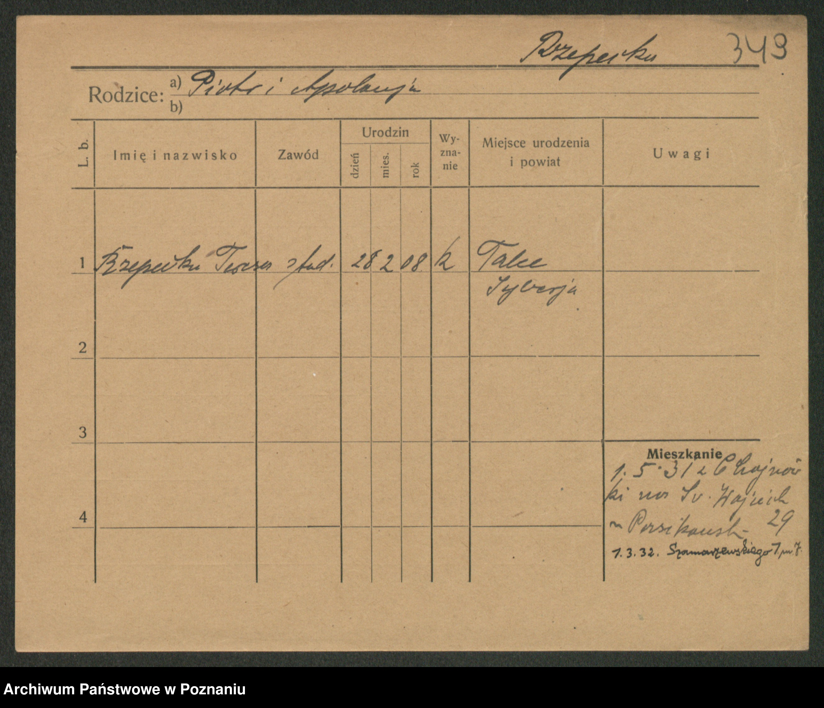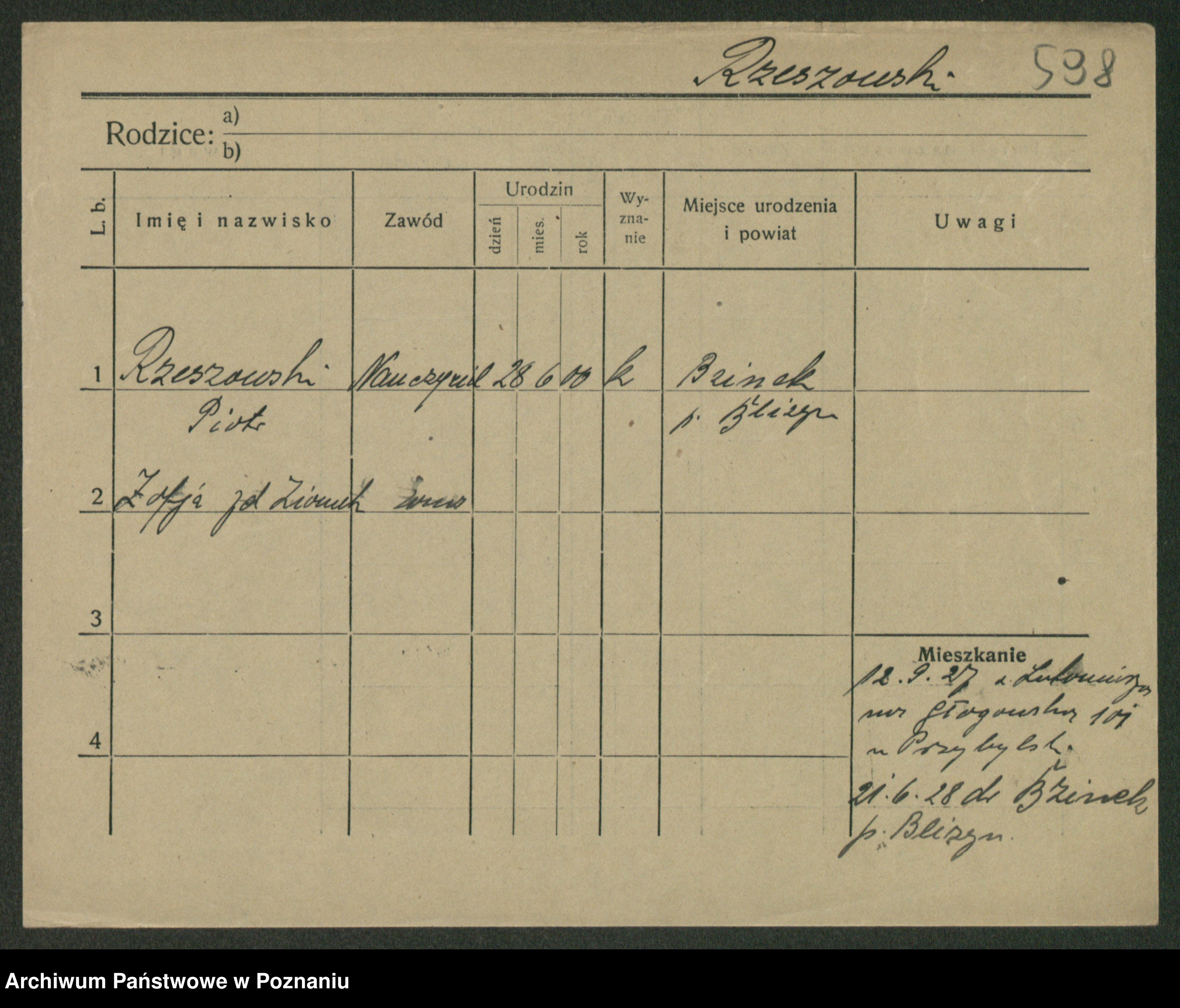 Podgląd karty osobowej dostępny jest po kliknięciu na nazwisko lub ikonkę karty. Można dokonywać powiększenia (ikony na górze) lub przechodzić między kolejnymi skanami (strzałki po bokach).