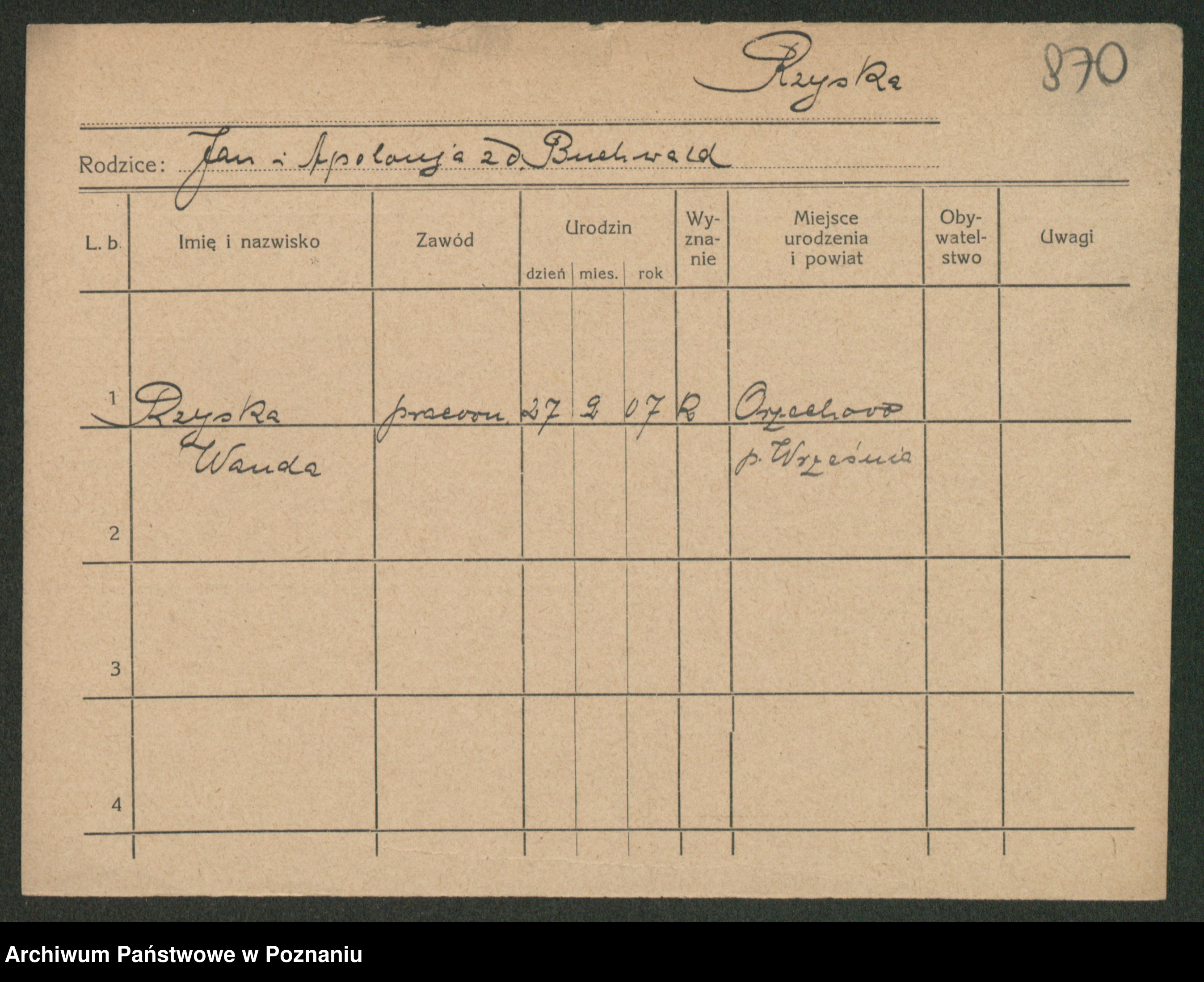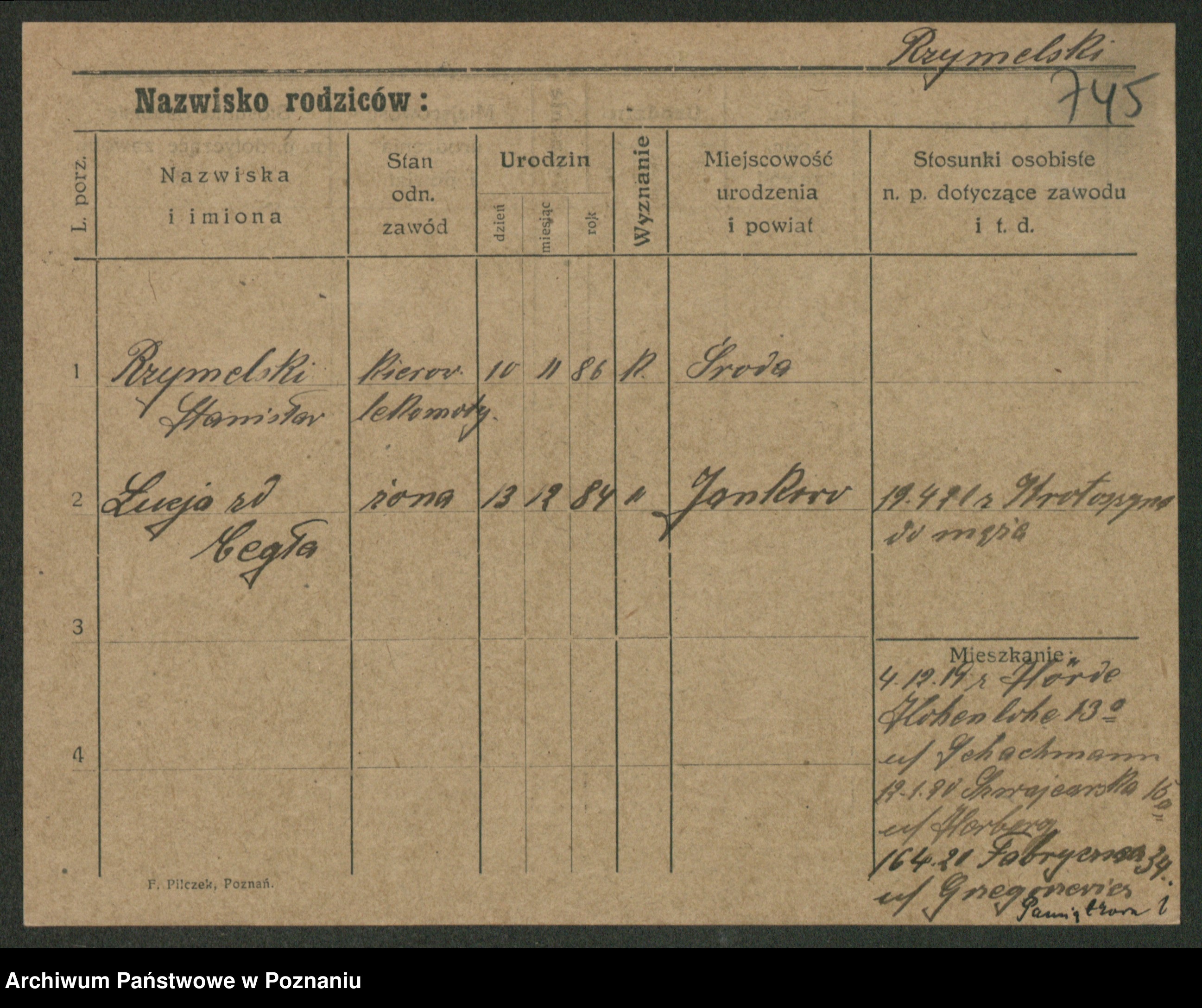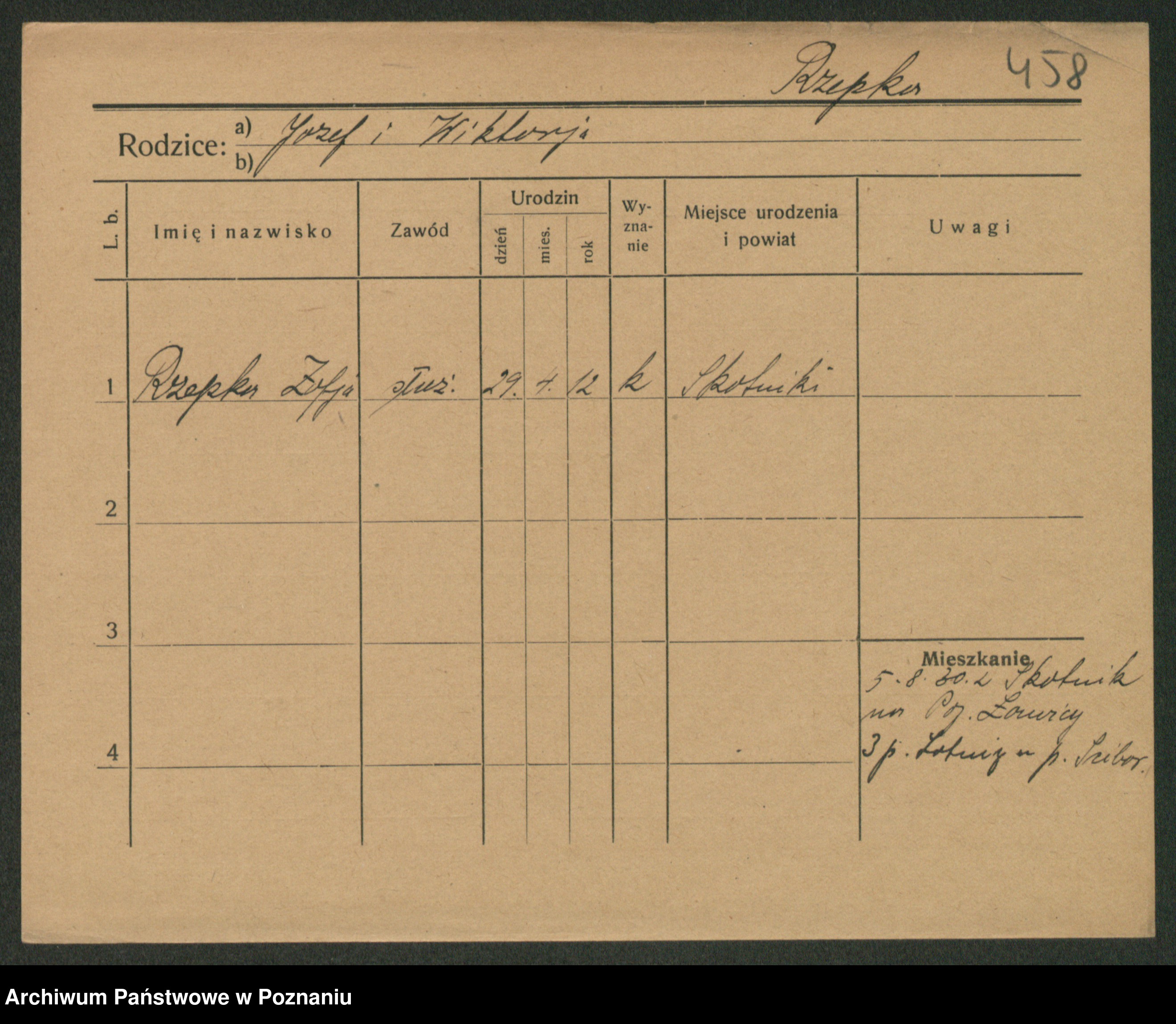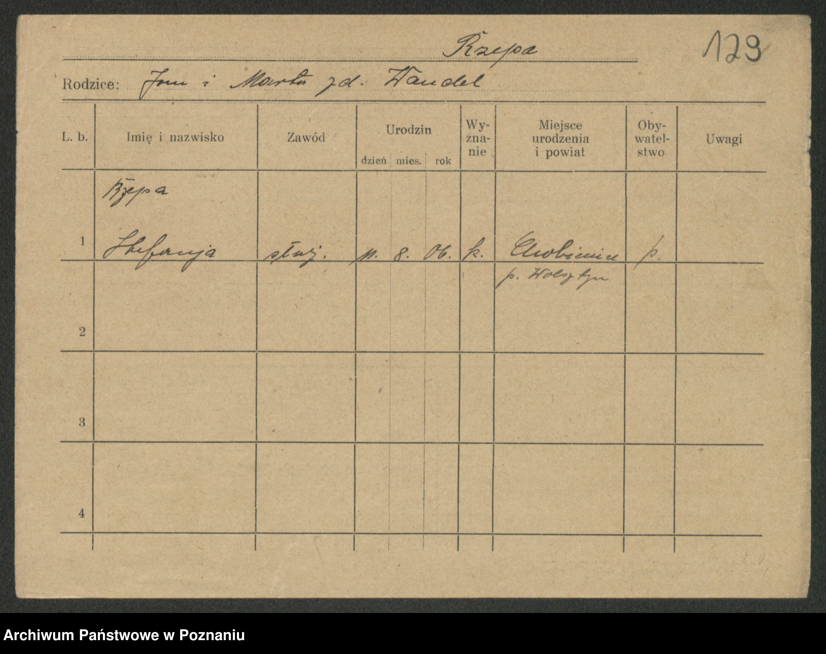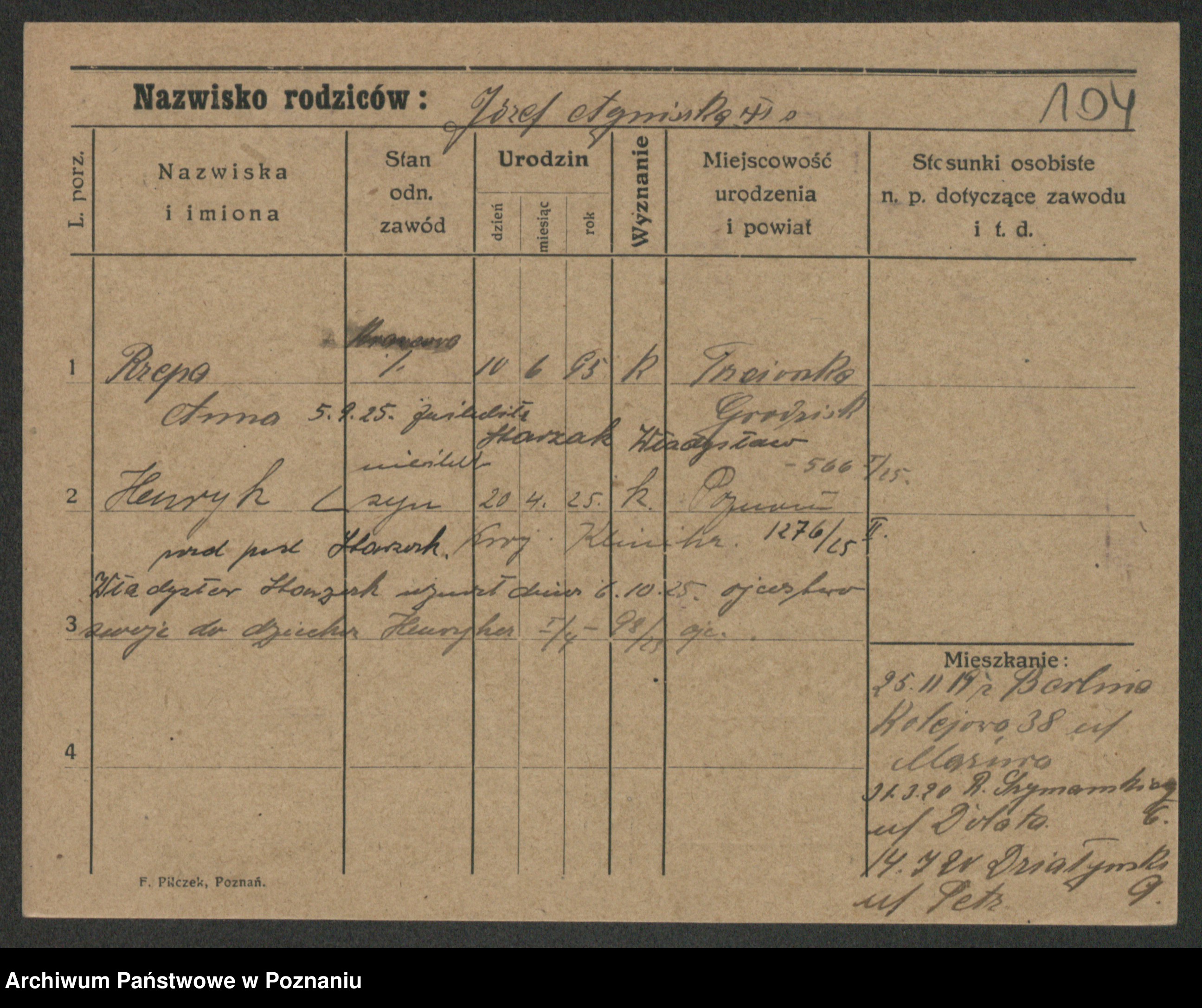 Podgląd karty osobowej dostępny jest po kliknięciu na nazwisko lub ikonkę karty. Można dokonywać powiększenia (ikony na górze) lub przechodzić między kolejnymi skanami (strzałki po bokach).