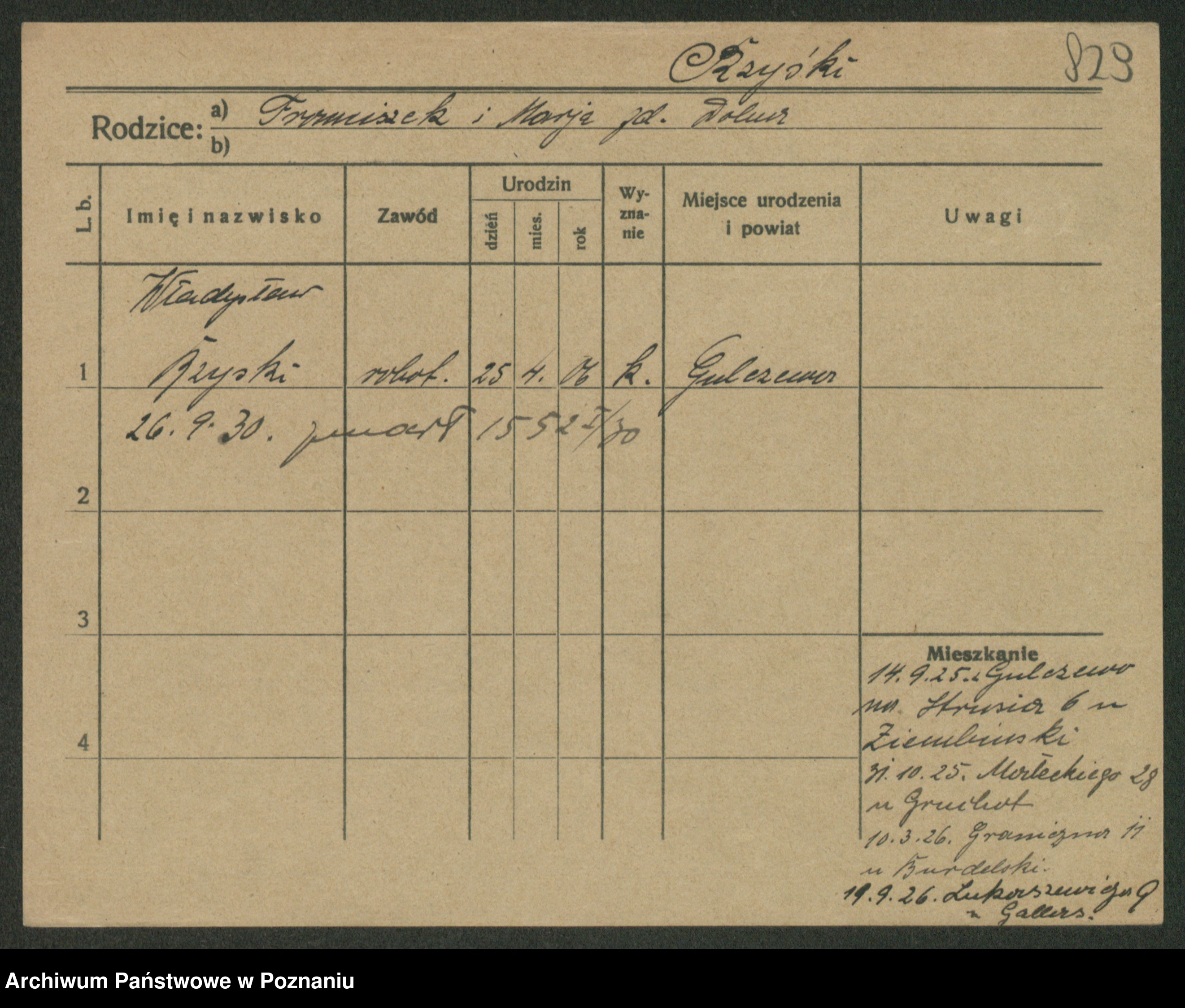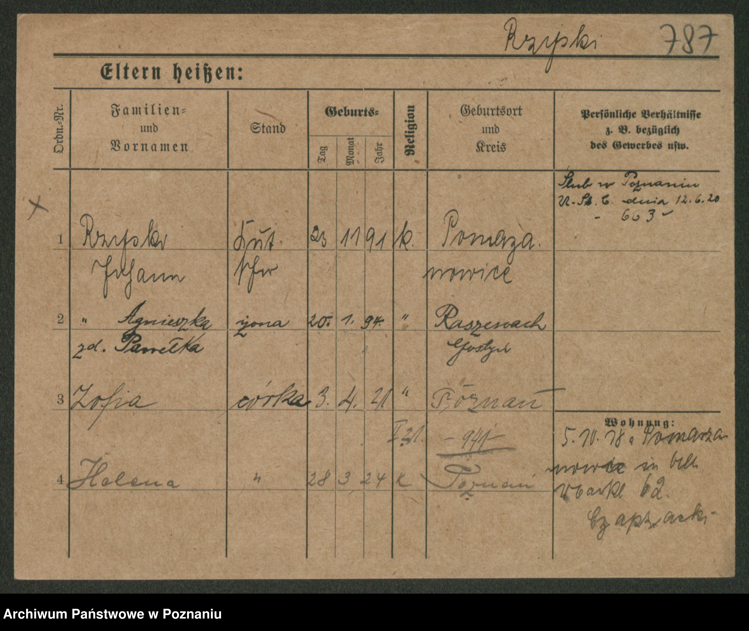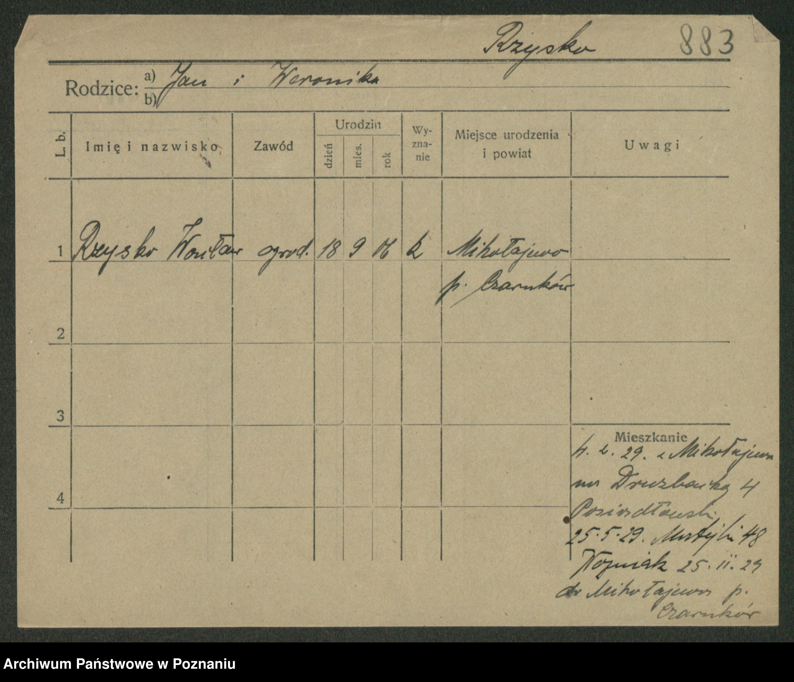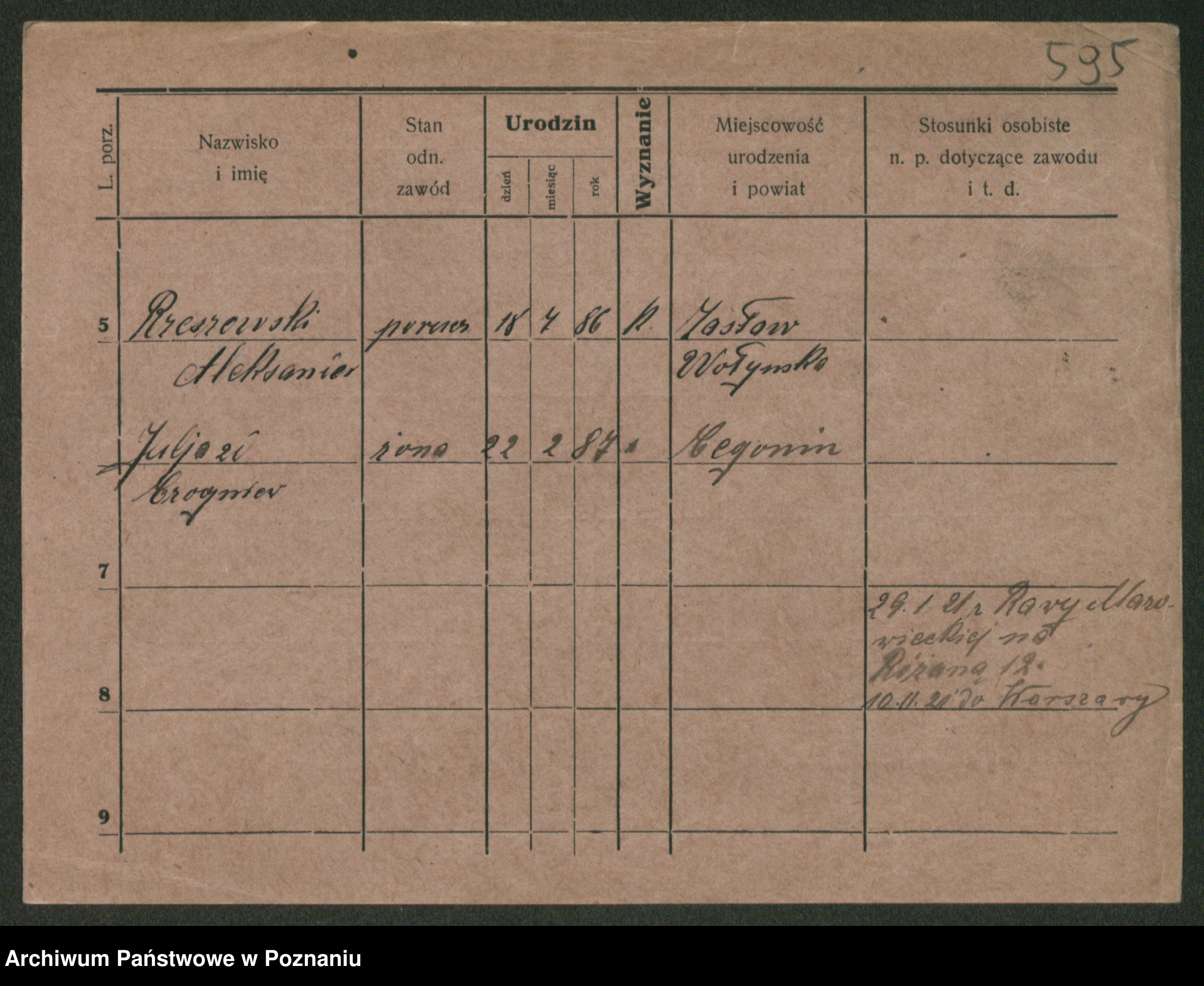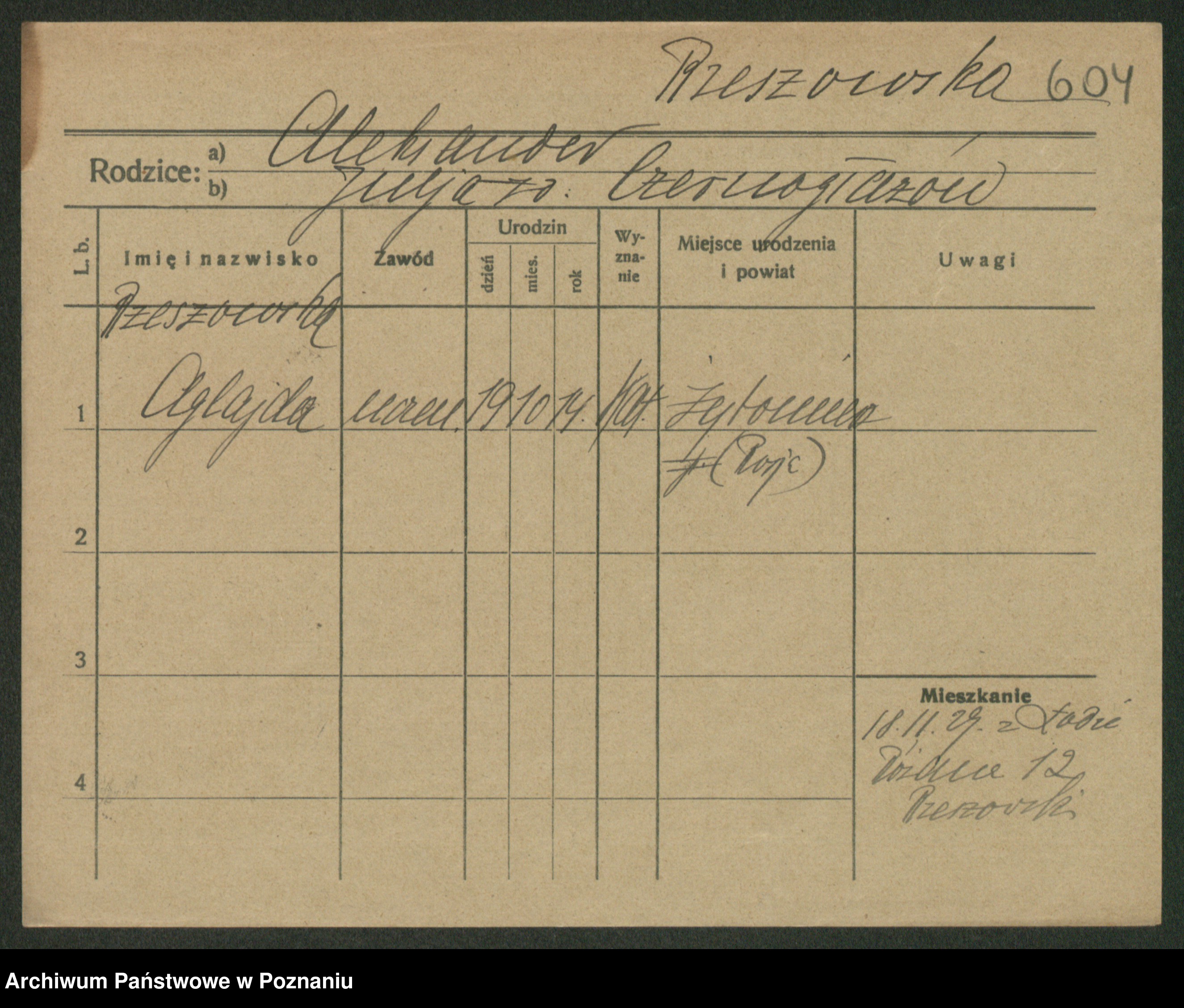 Podgląd karty osobowej dostępny jest po kliknięciu na nazwisko lub ikonkę karty. Można dokonywać powiększenia (ikony na górze) lub przechodzić między kolejnymi skanami (strzałki po bokach).