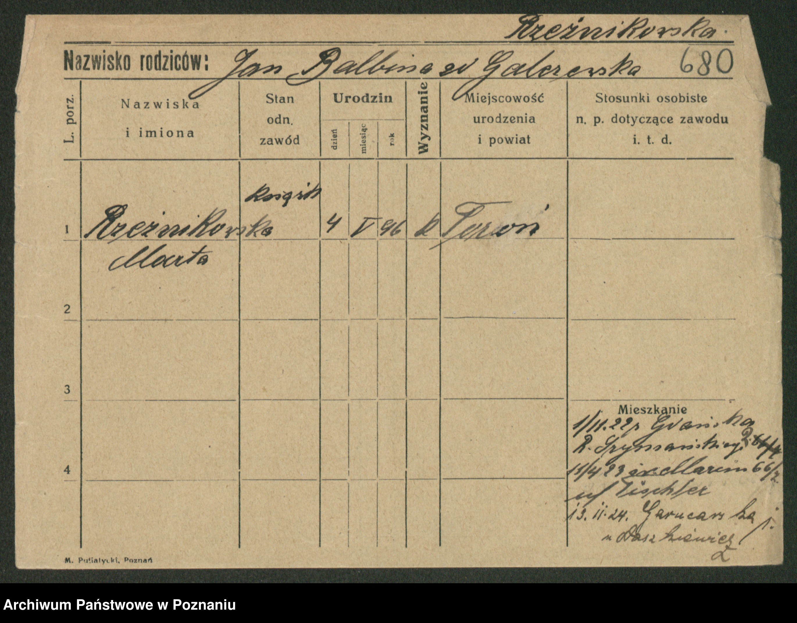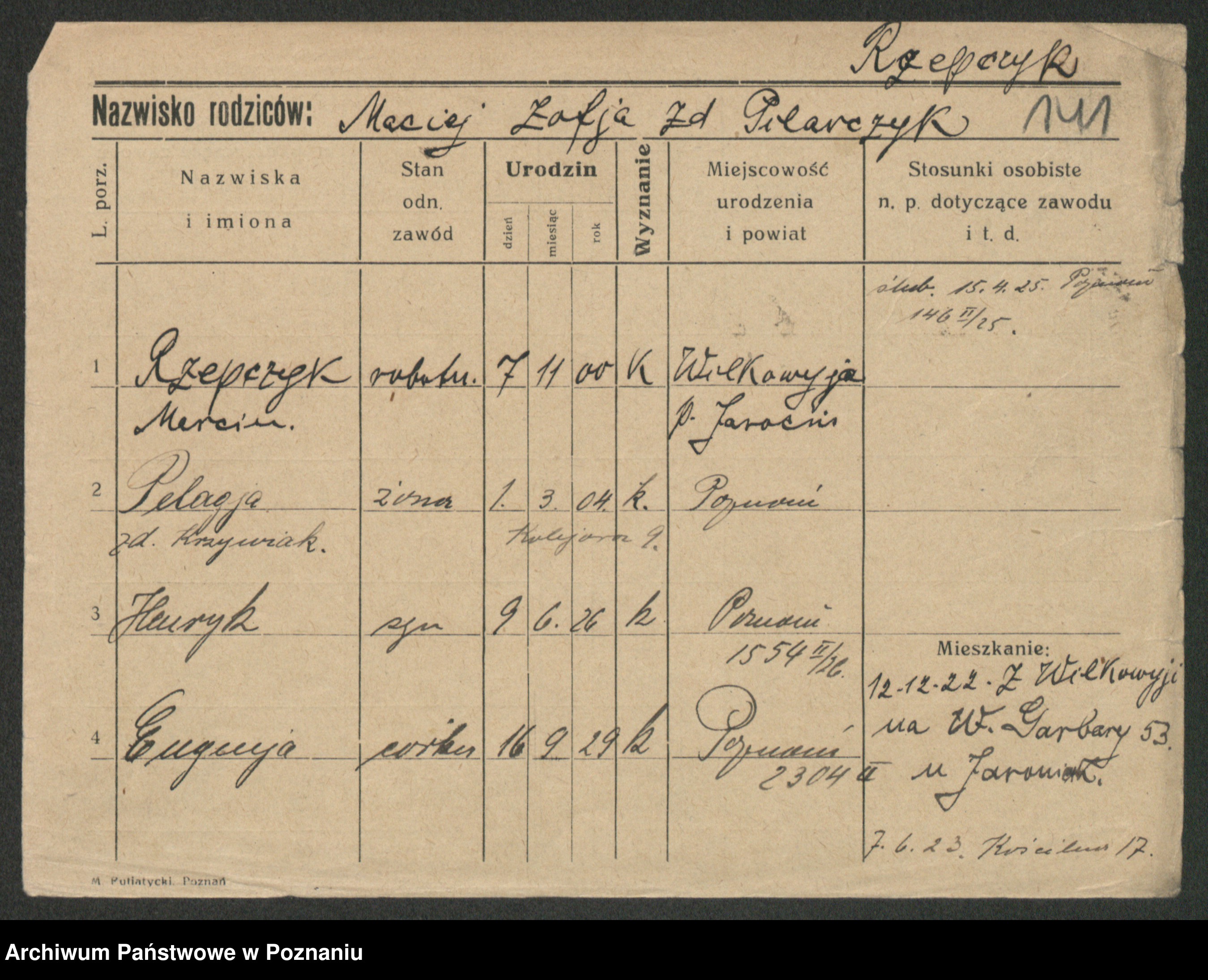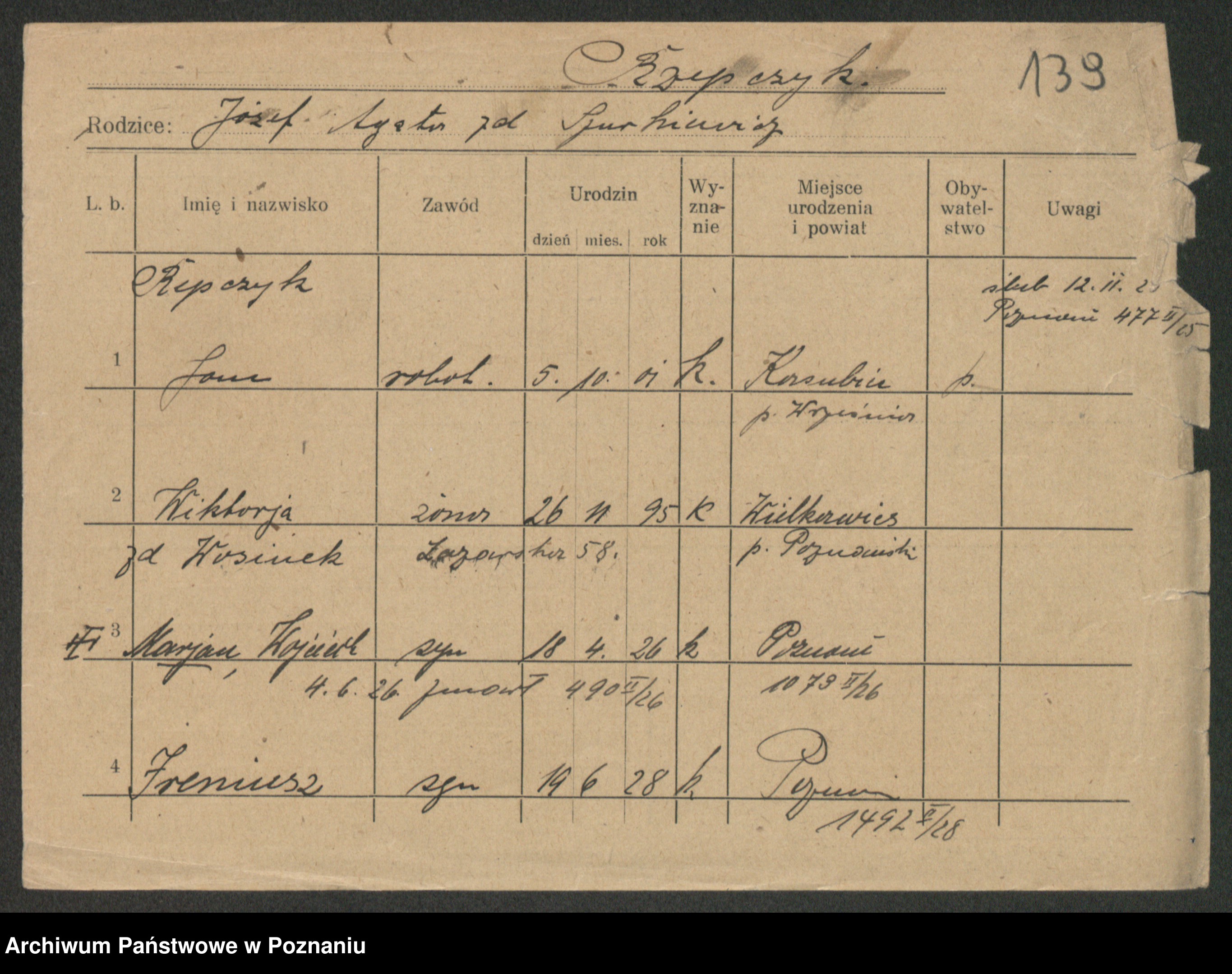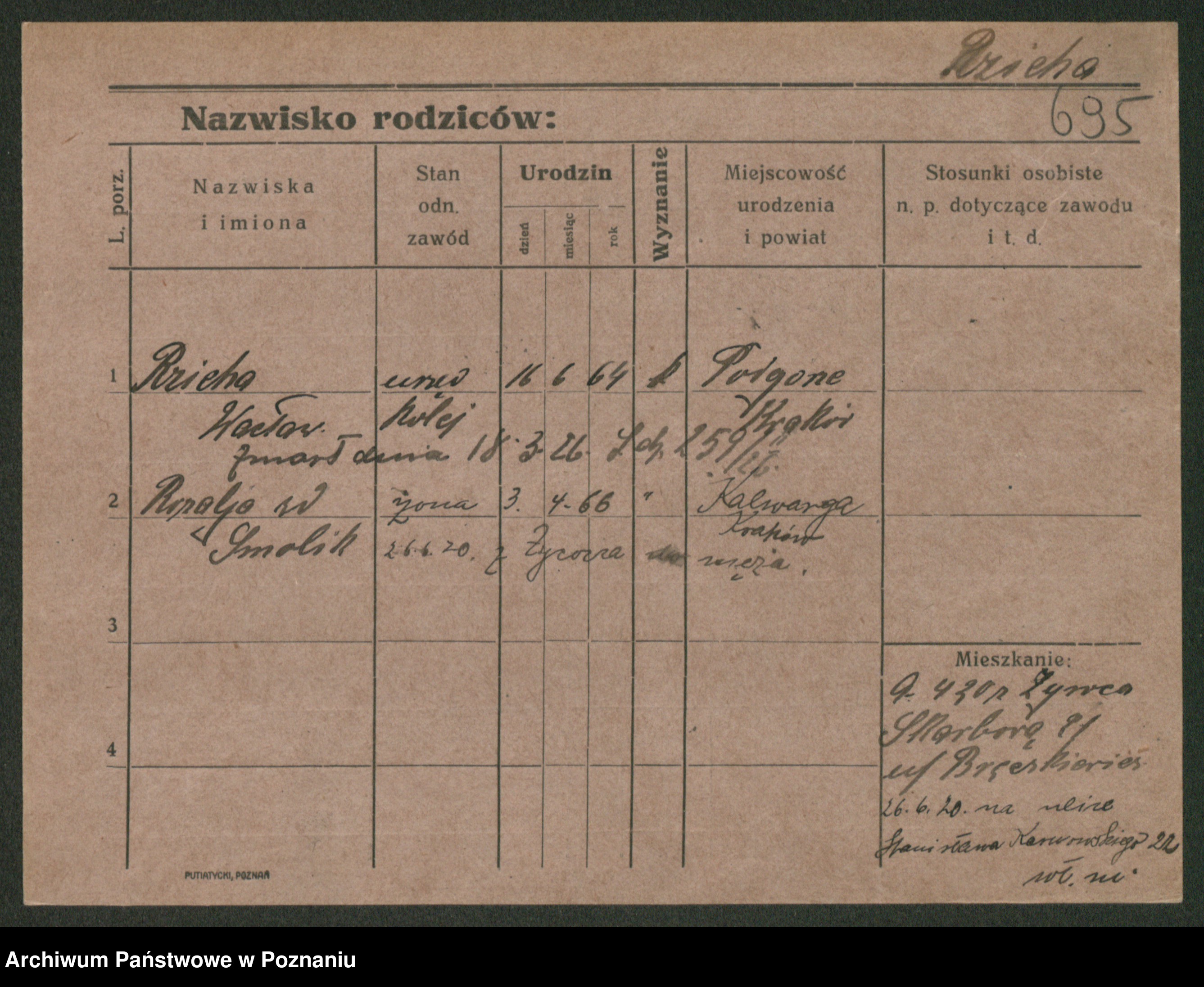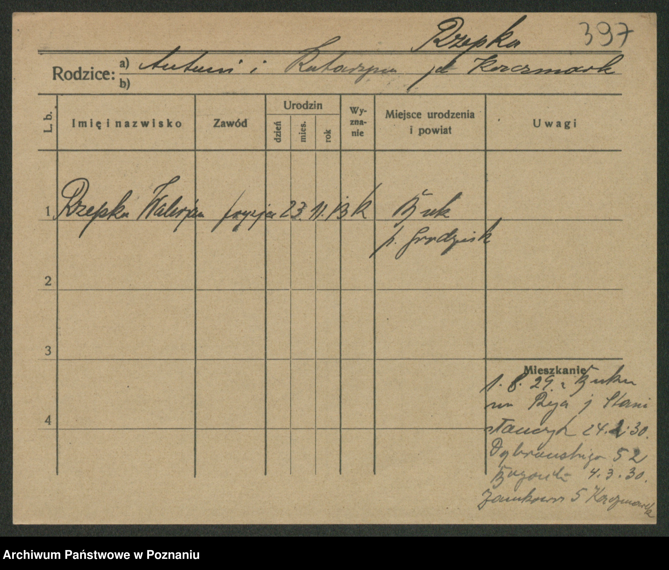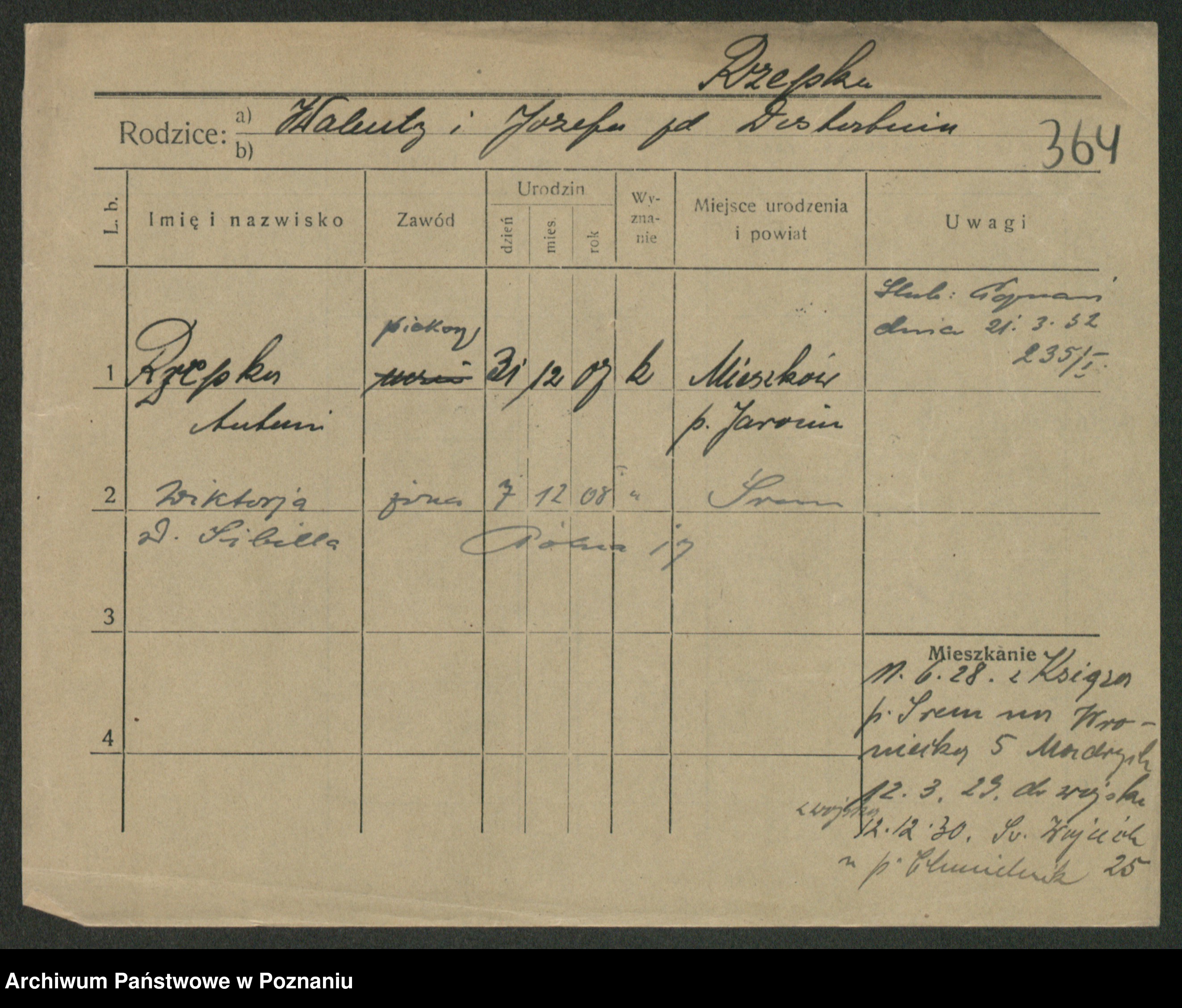 Podgląd karty osobowej dostępny jest po kliknięciu na nazwisko lub ikonkę karty. Można dokonywać powiększenia (ikony na górze) lub przechodzić między kolejnymi skanami (strzałki po bokach).
