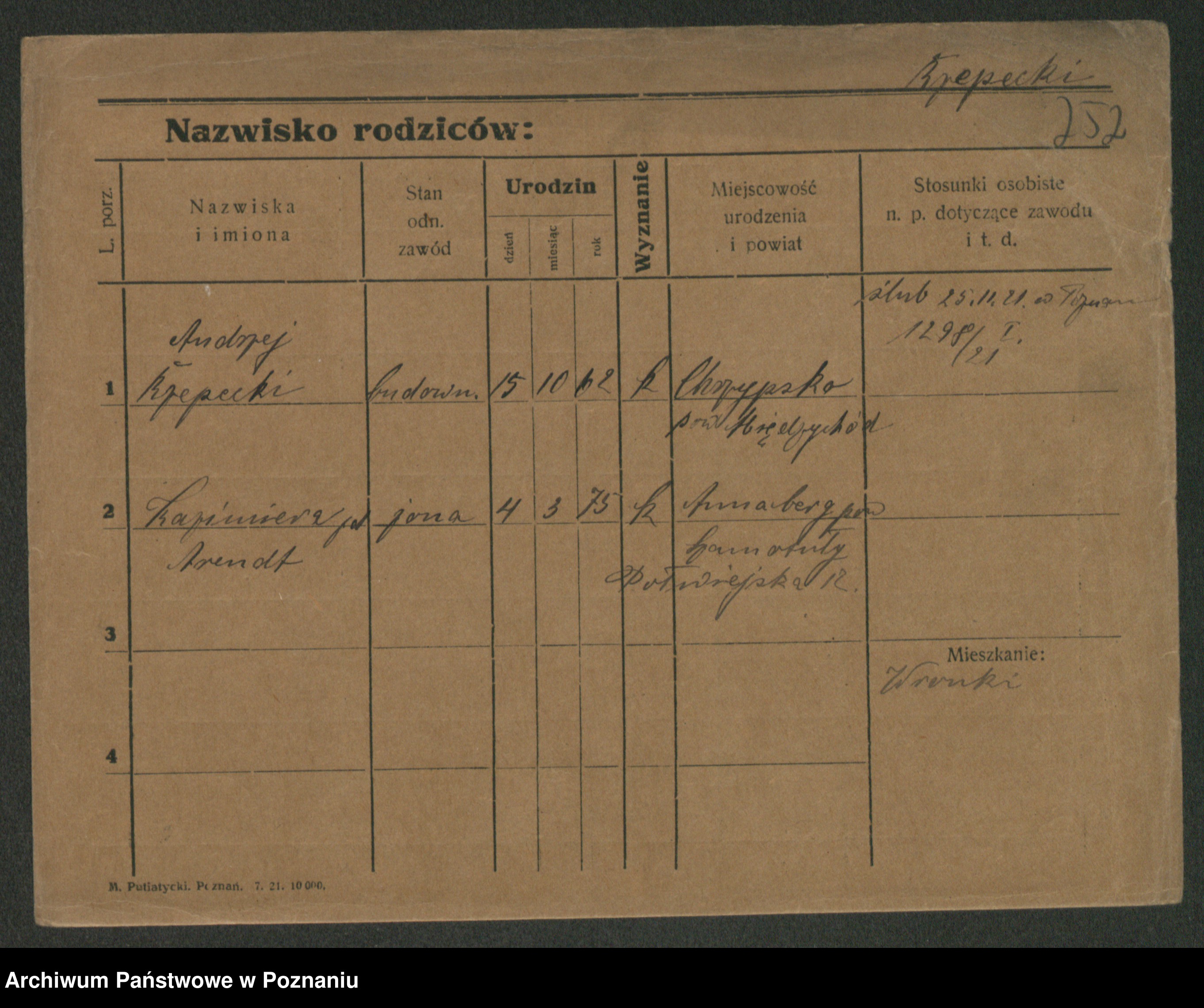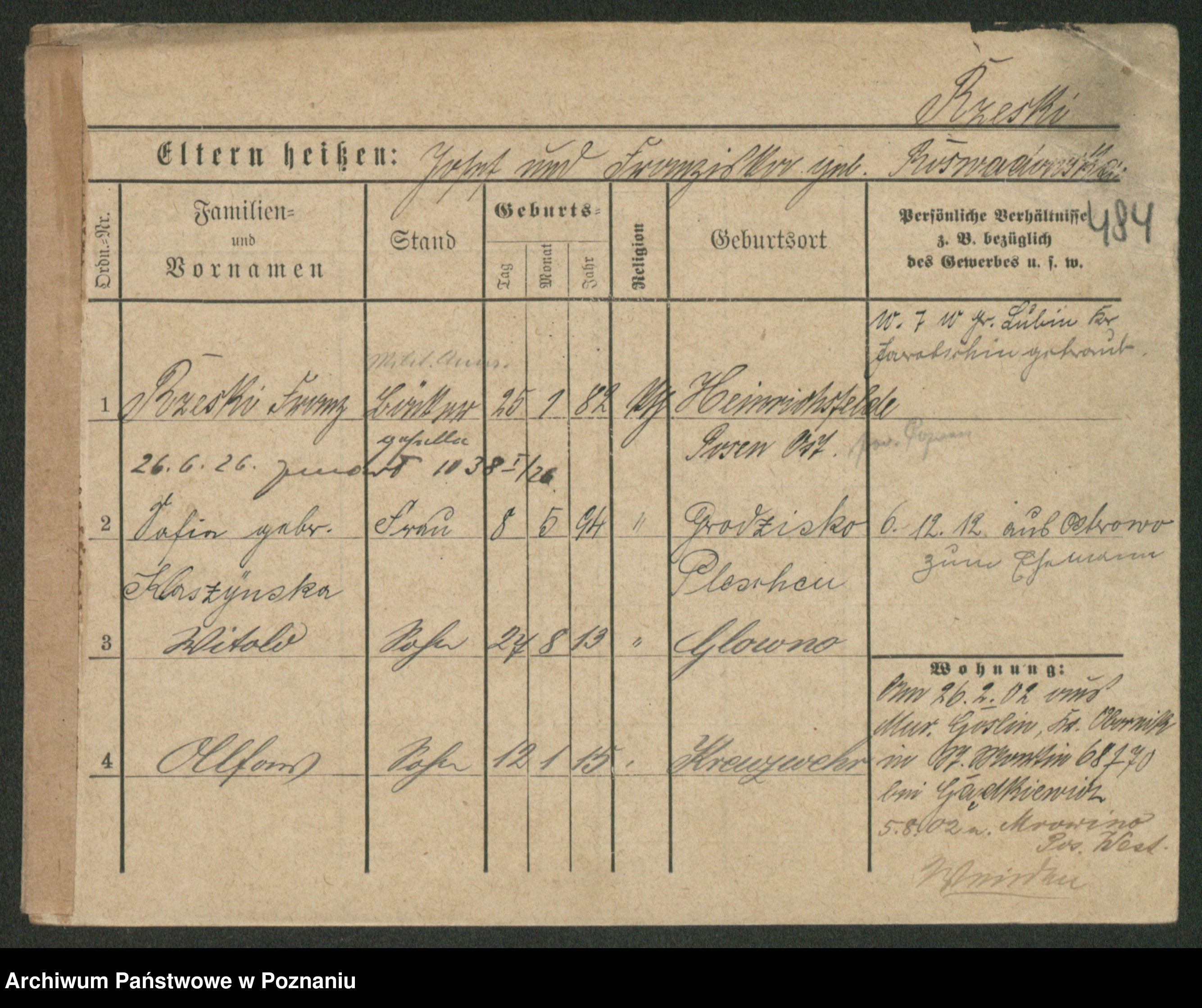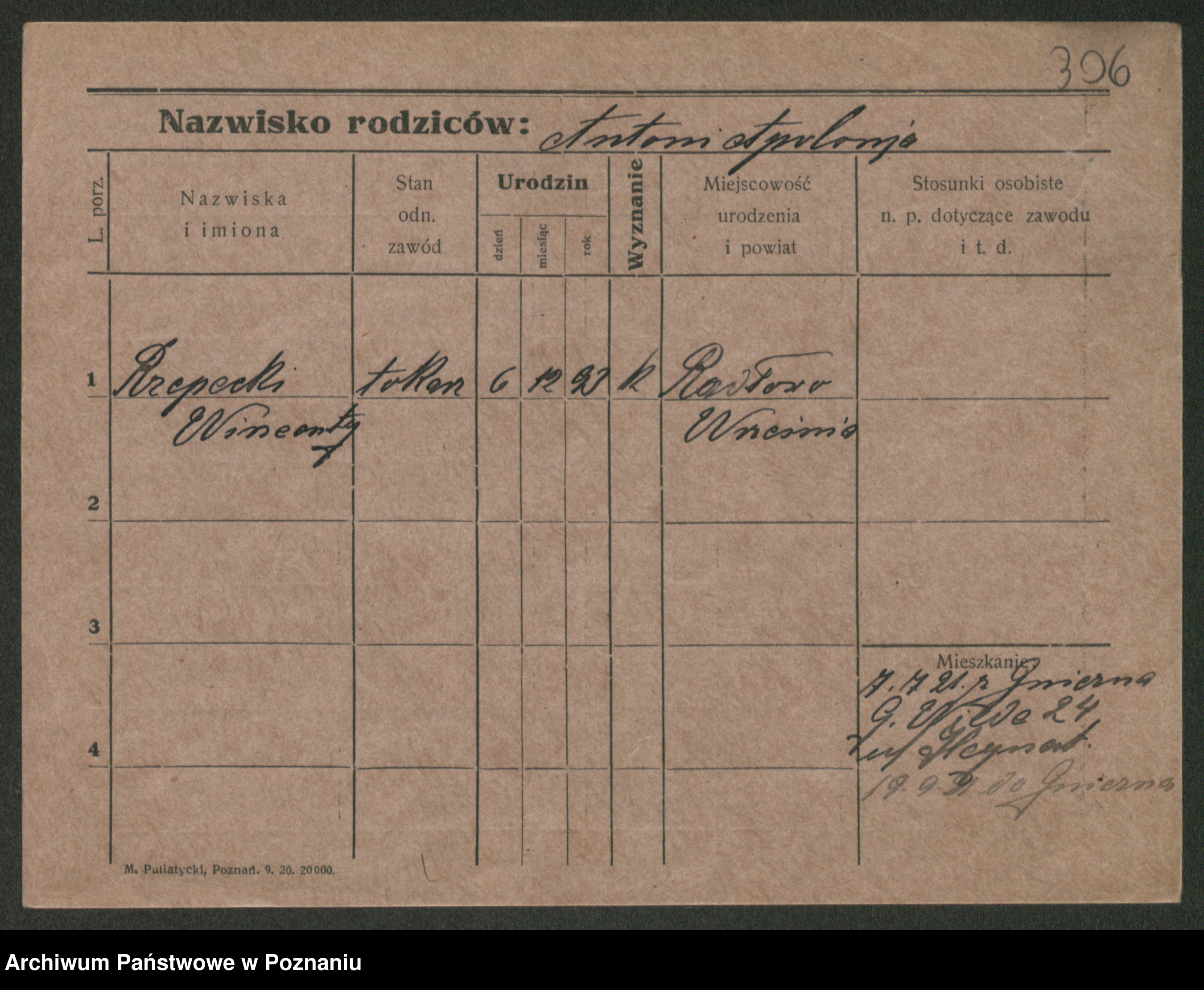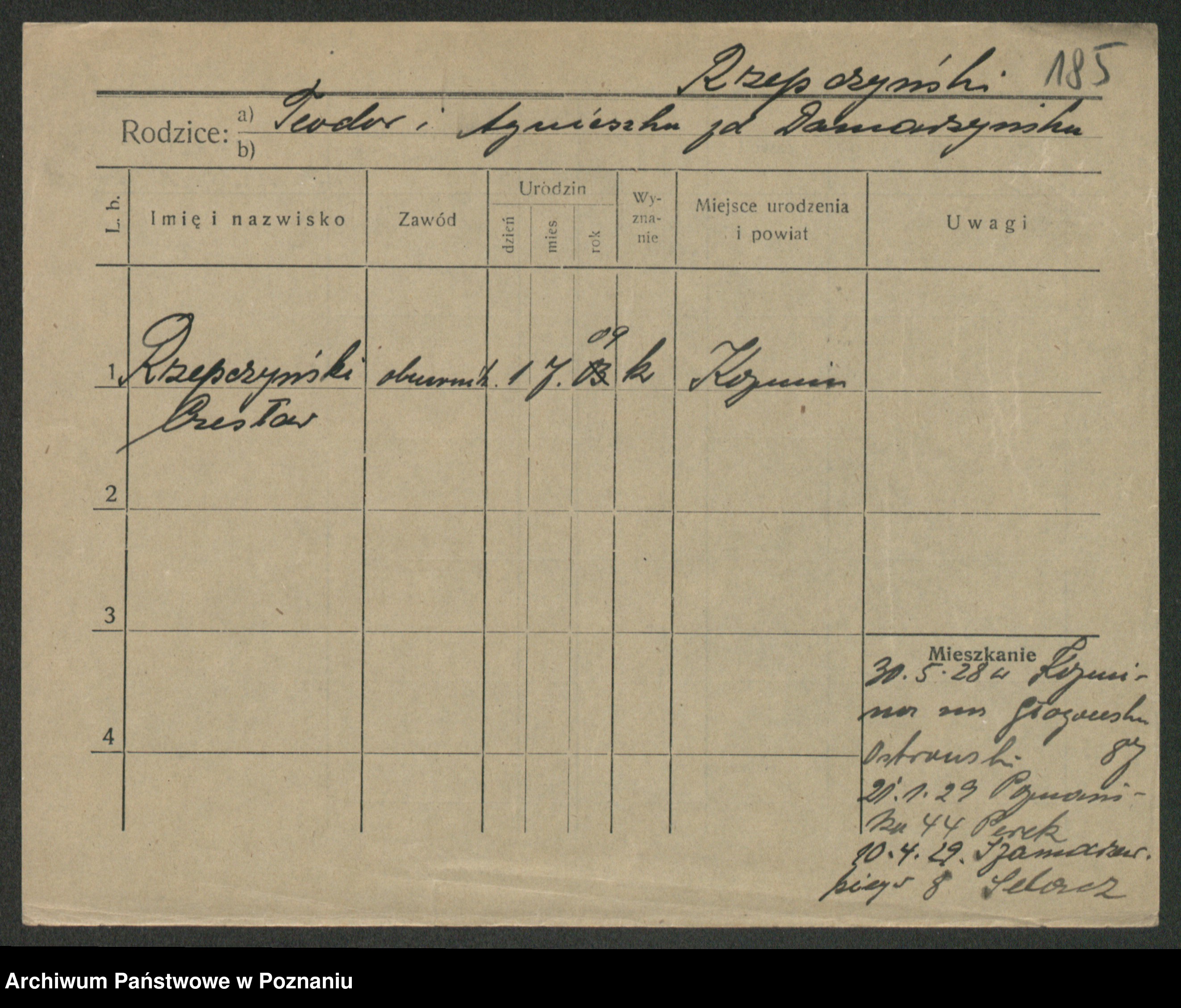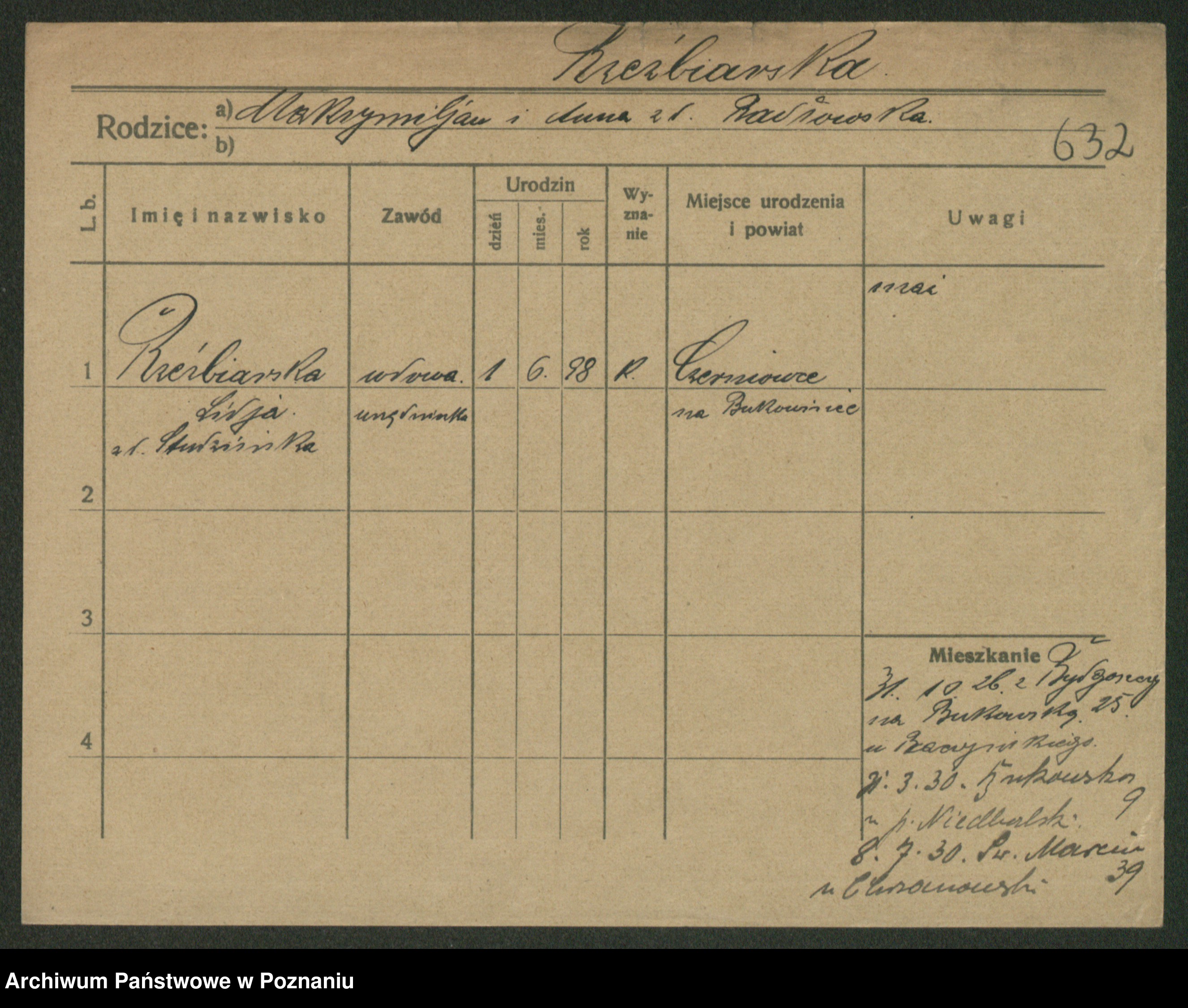 Podgląd karty osobowej dostępny jest po kliknięciu na nazwisko lub ikonkę karty. Można dokonywać powiększenia (ikony na górze) lub przechodzić między kolejnymi skanami (strzałki po bokach).