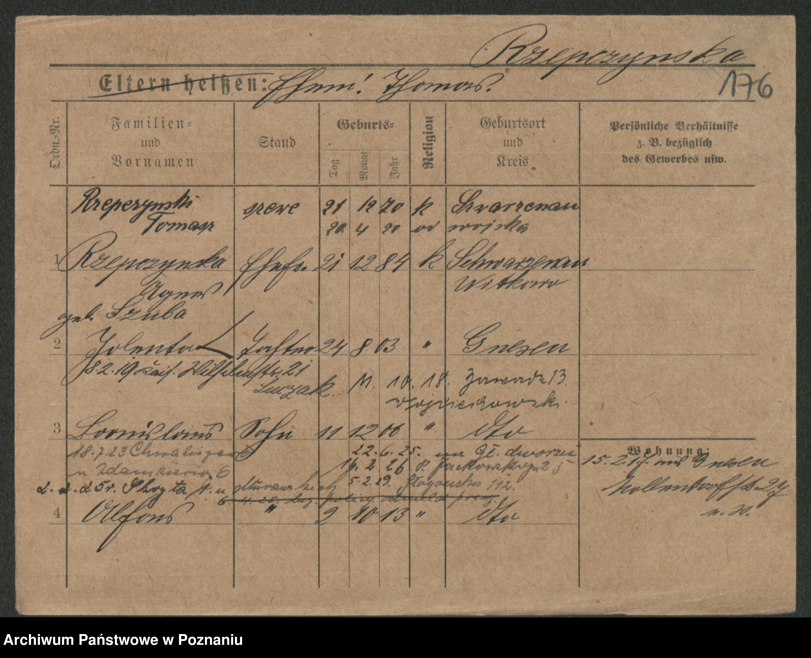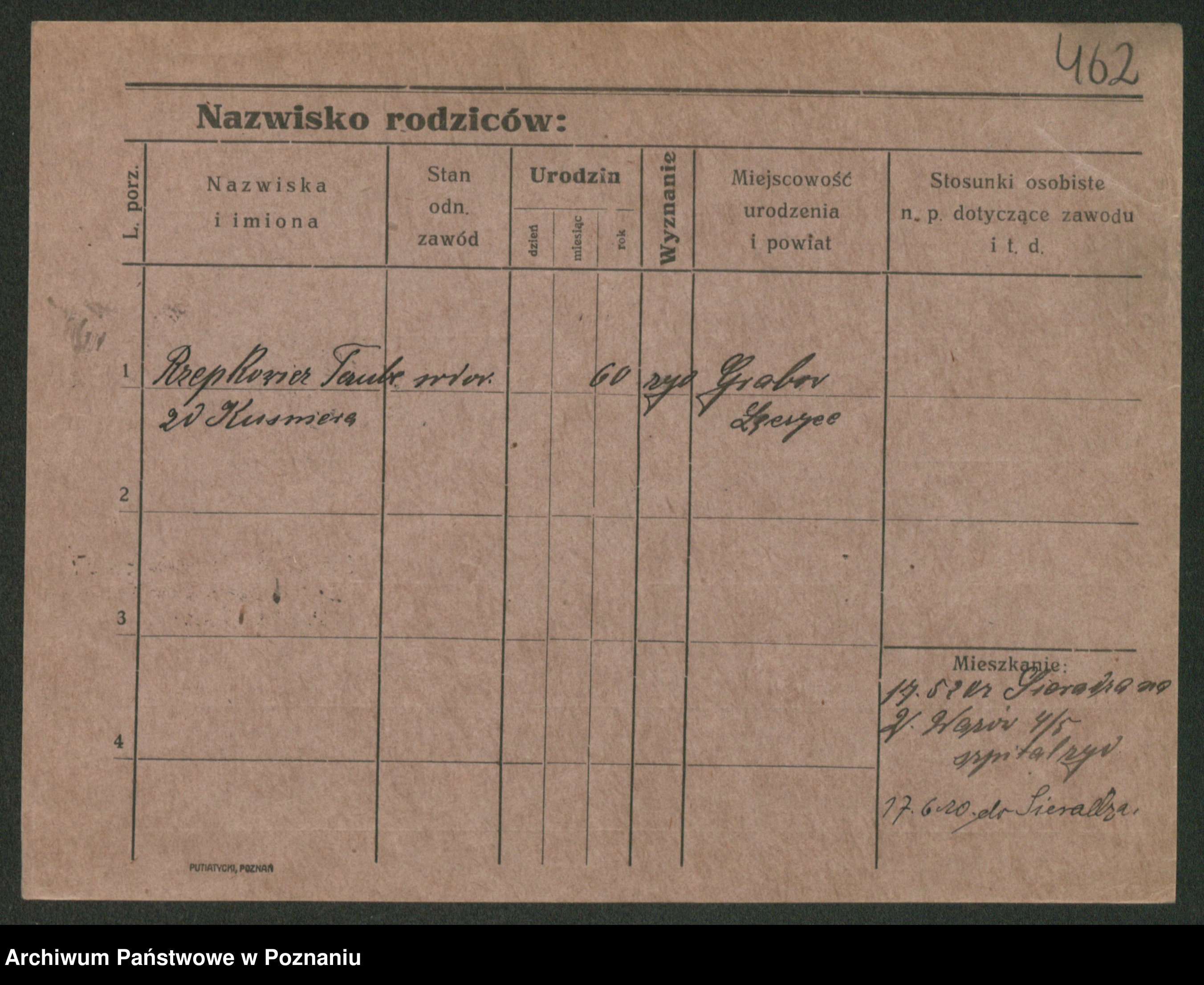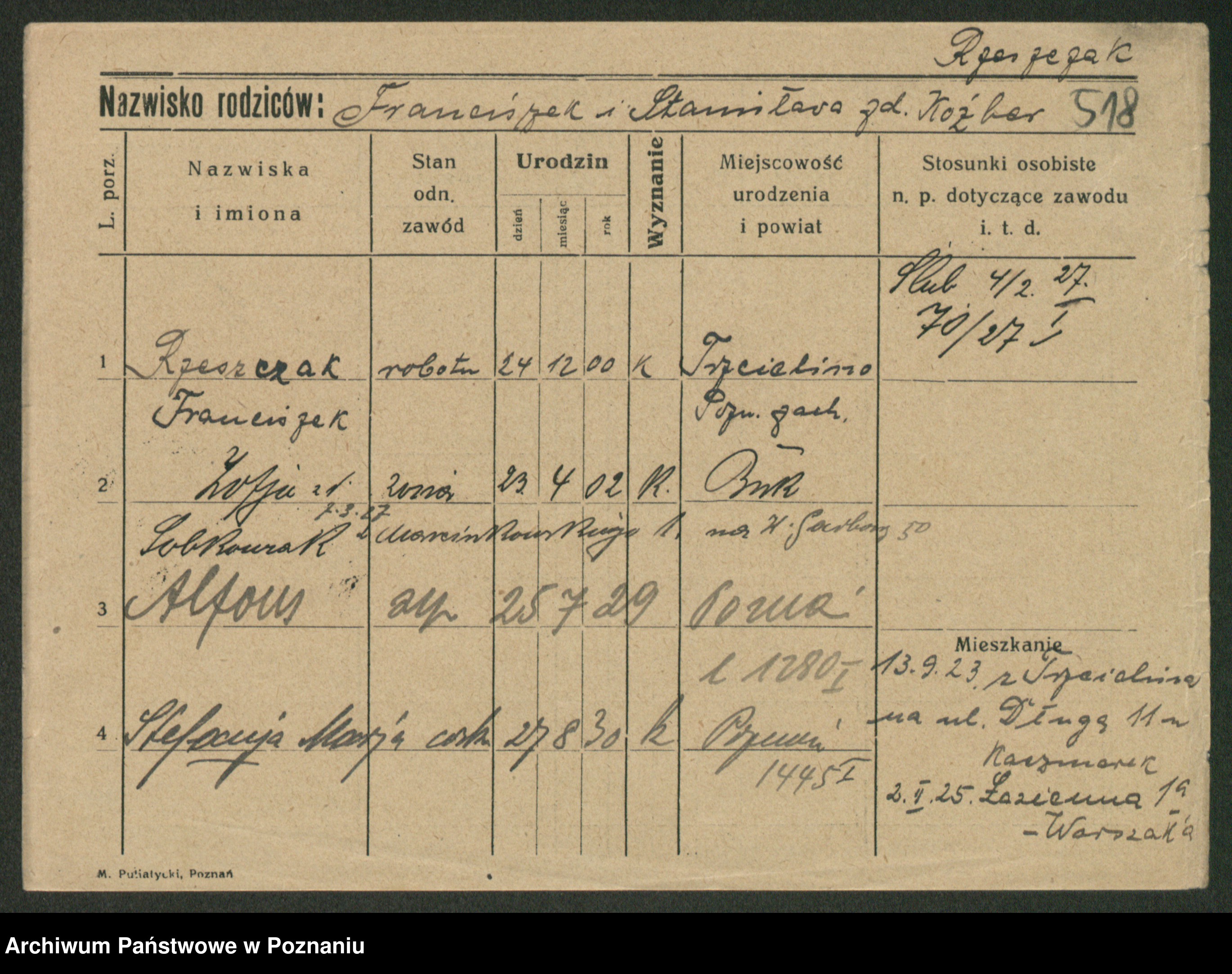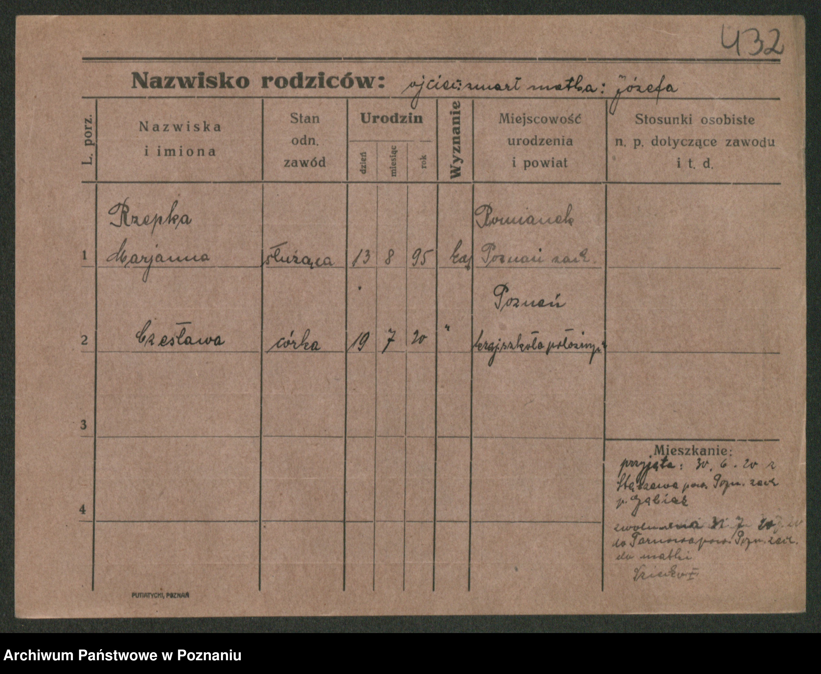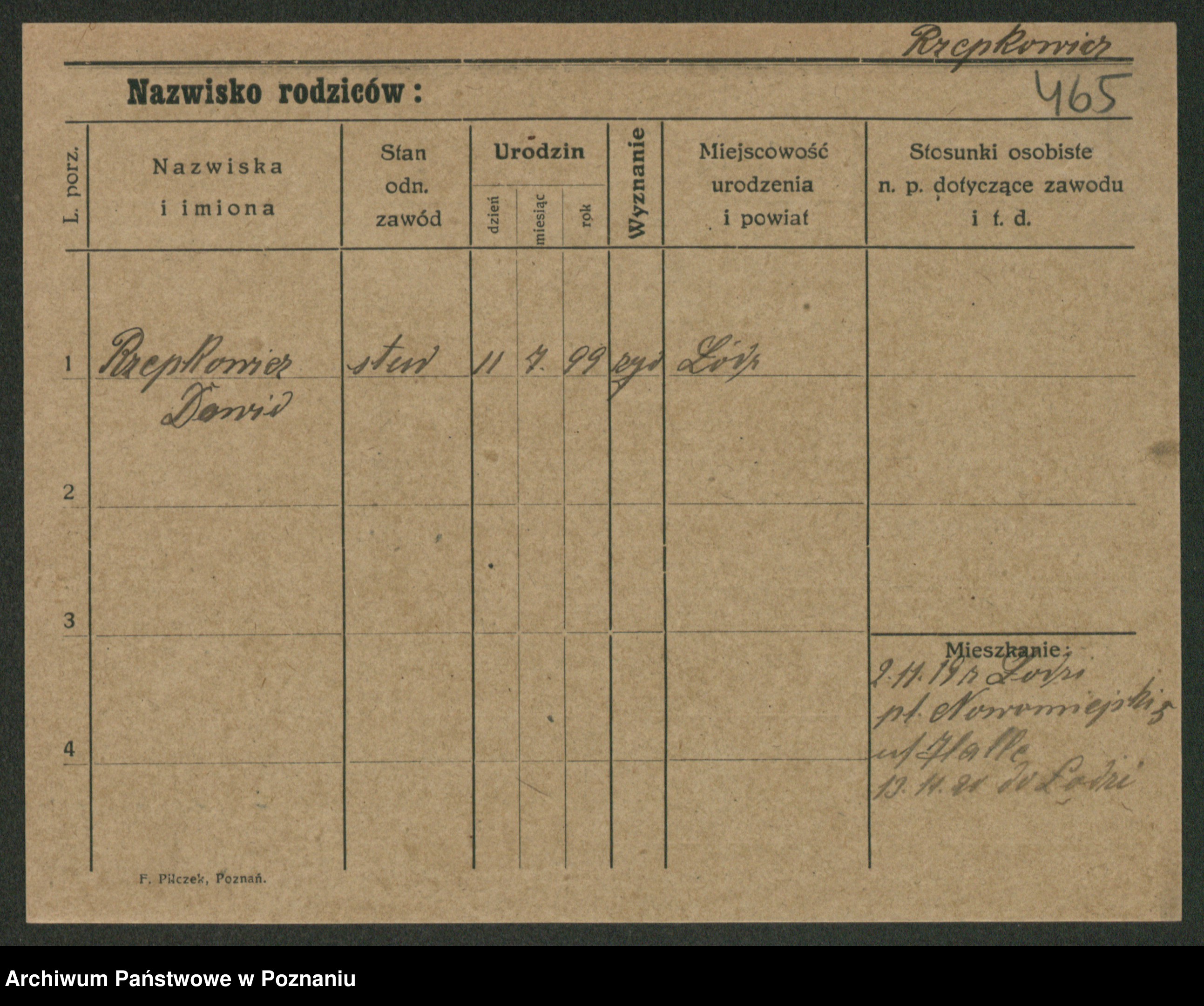 Podgląd karty osobowej dostępny jest po kliknięciu na nazwisko lub ikonkę karty. Można dokonywać powiększenia (ikony na górze) lub przechodzić między kolejnymi skanami (strzałki po bokach).