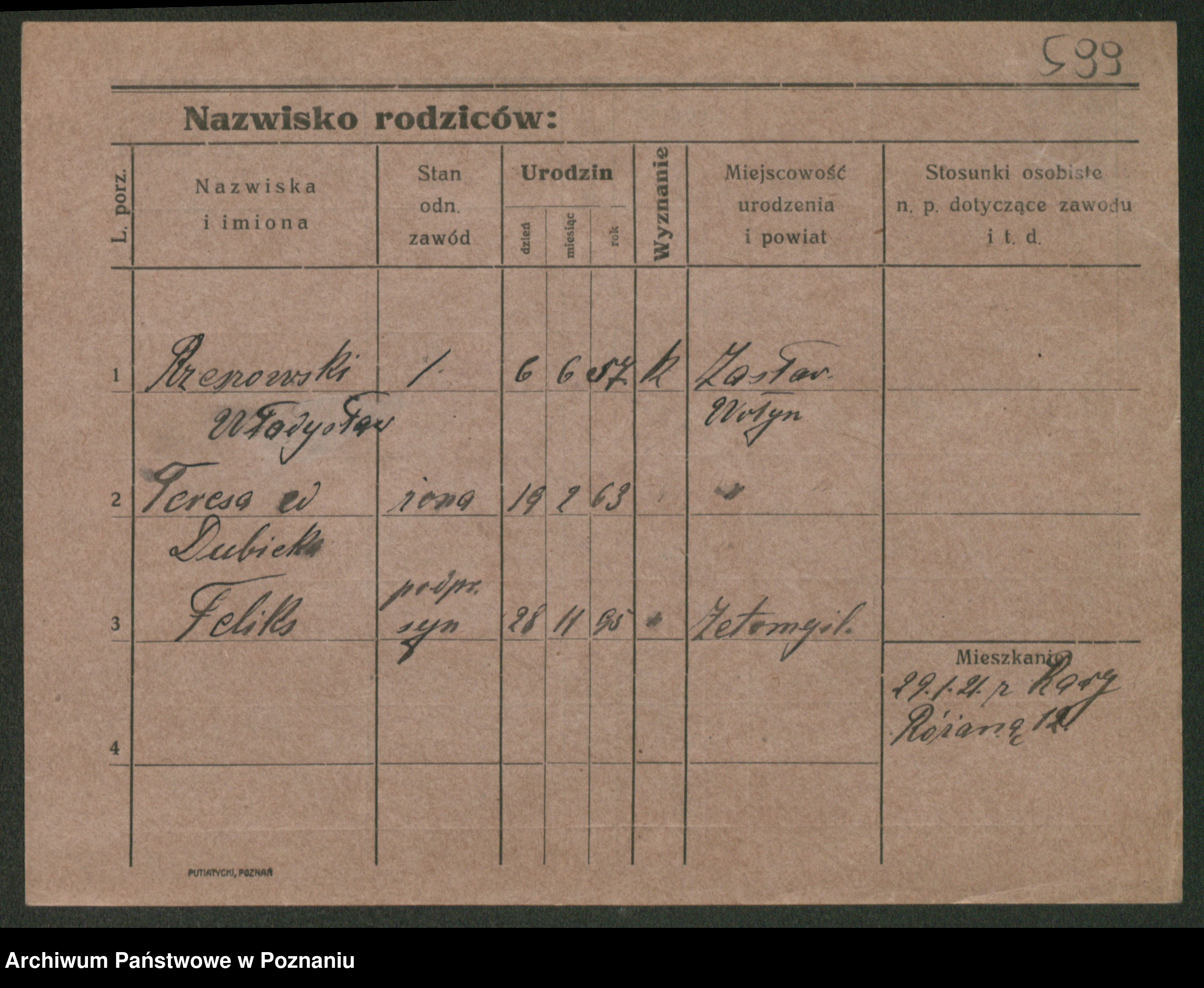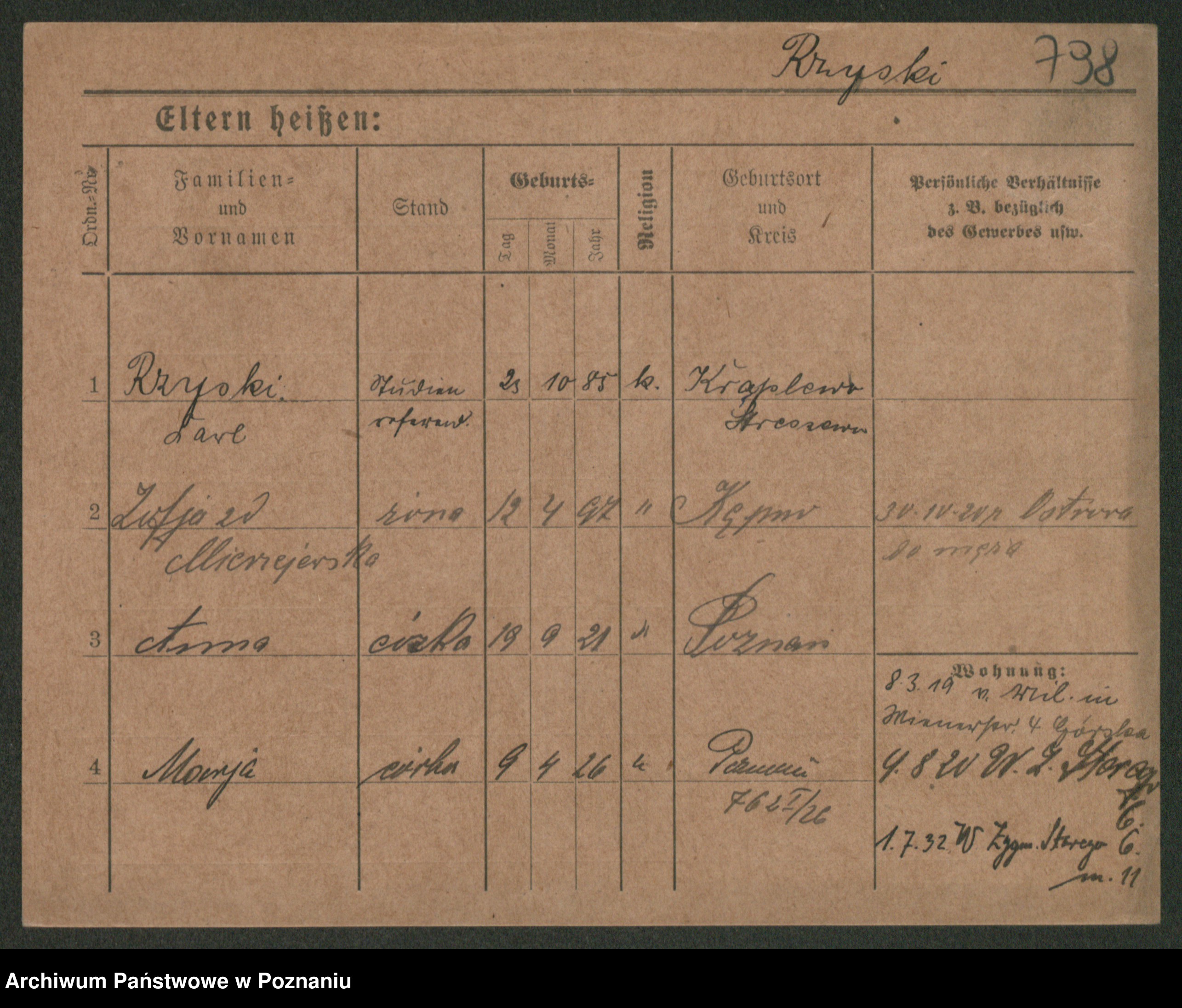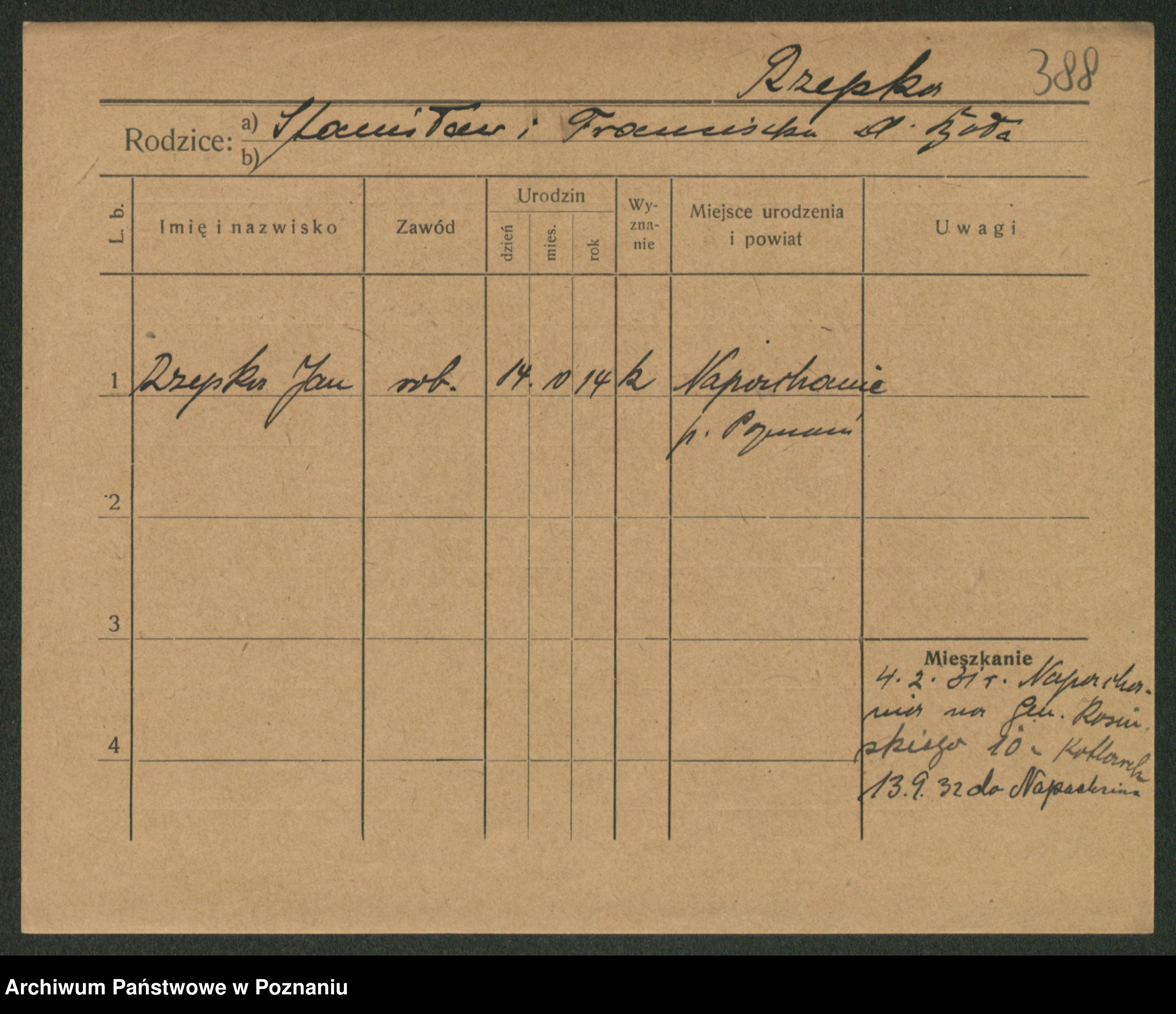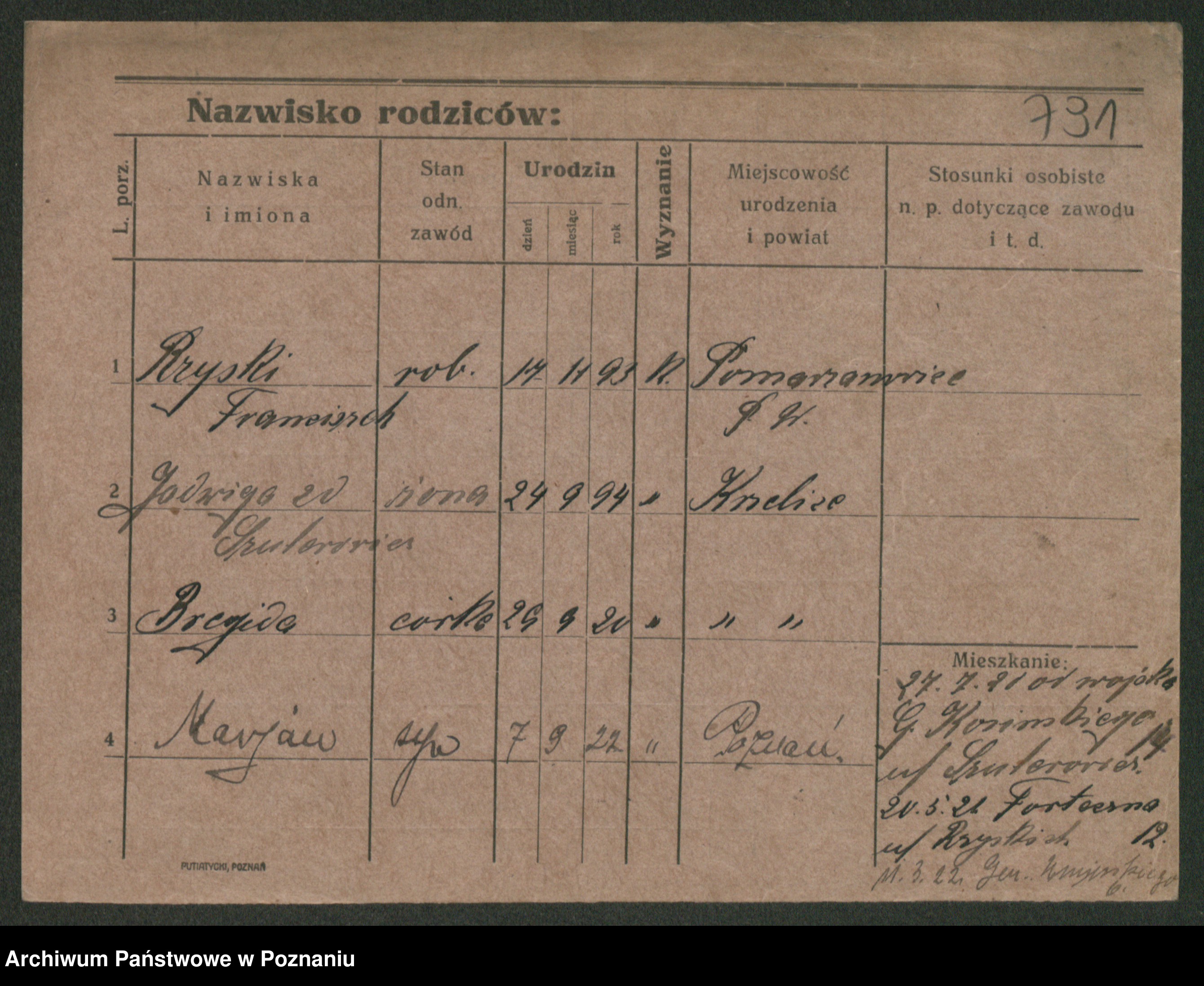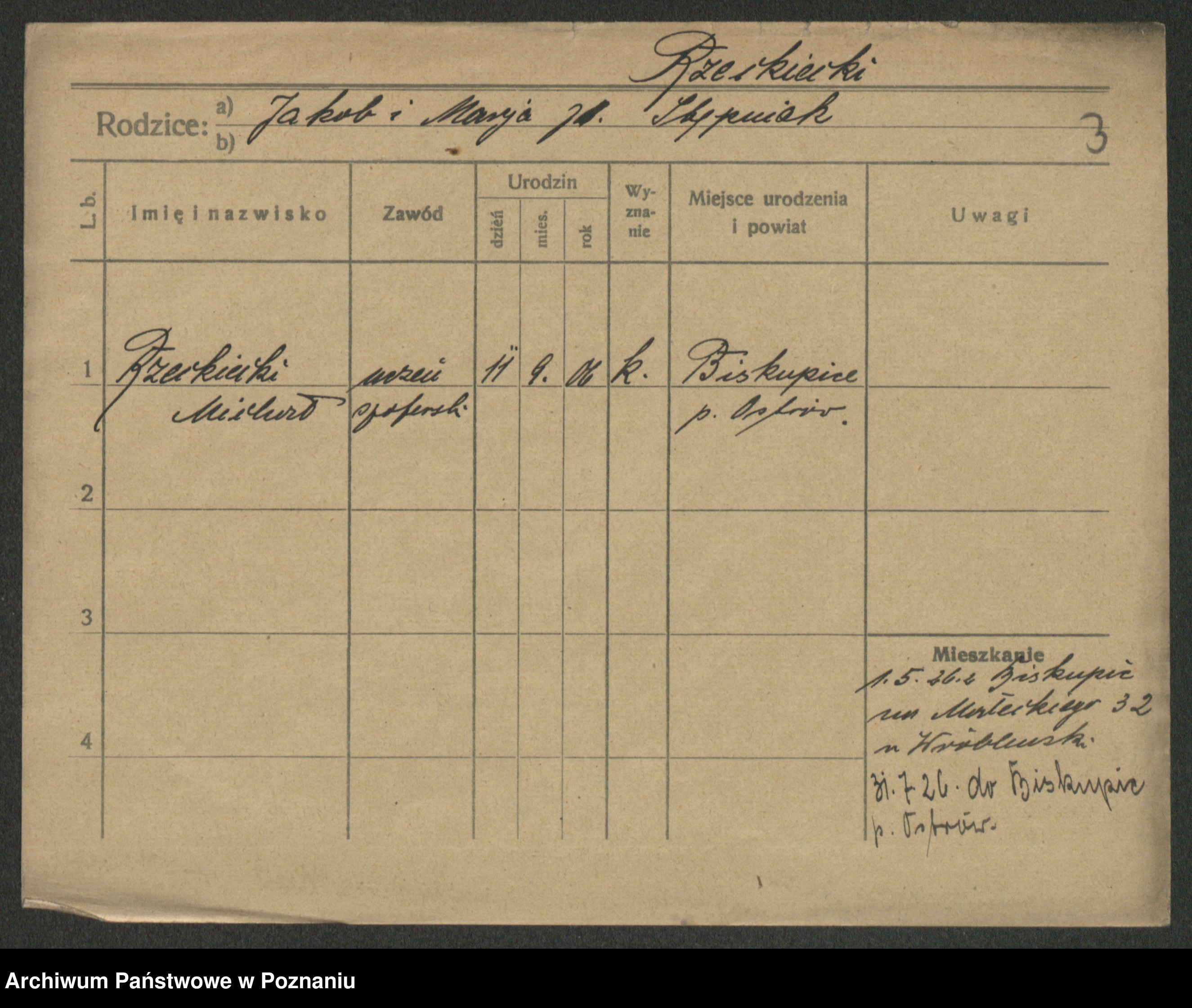 Podgląd karty osobowej dostępny jest po kliknięciu na nazwisko lub ikonkę karty. Można dokonywać powiększenia (ikony na górze) lub przechodzić między kolejnymi skanami (strzałki po bokach).