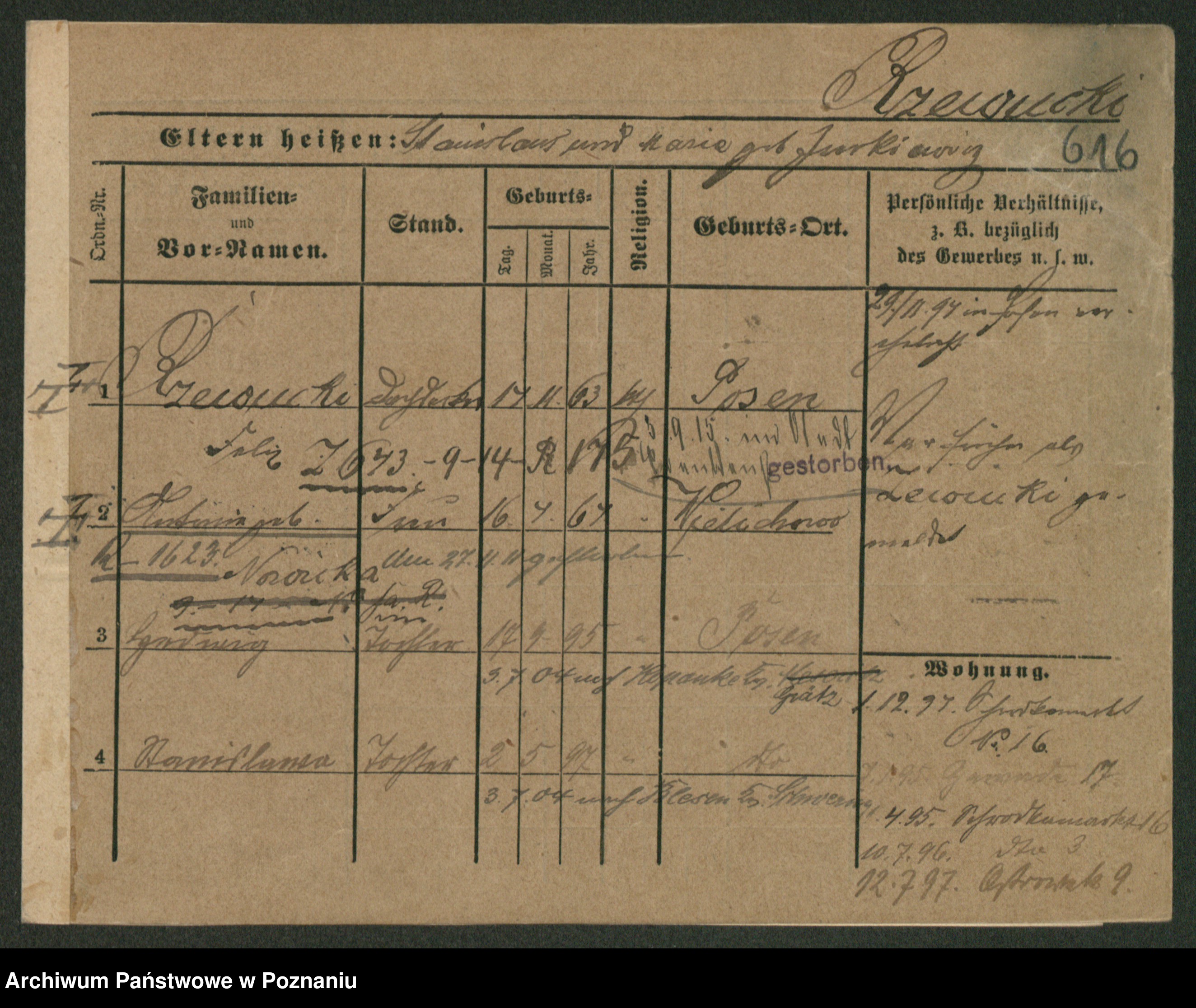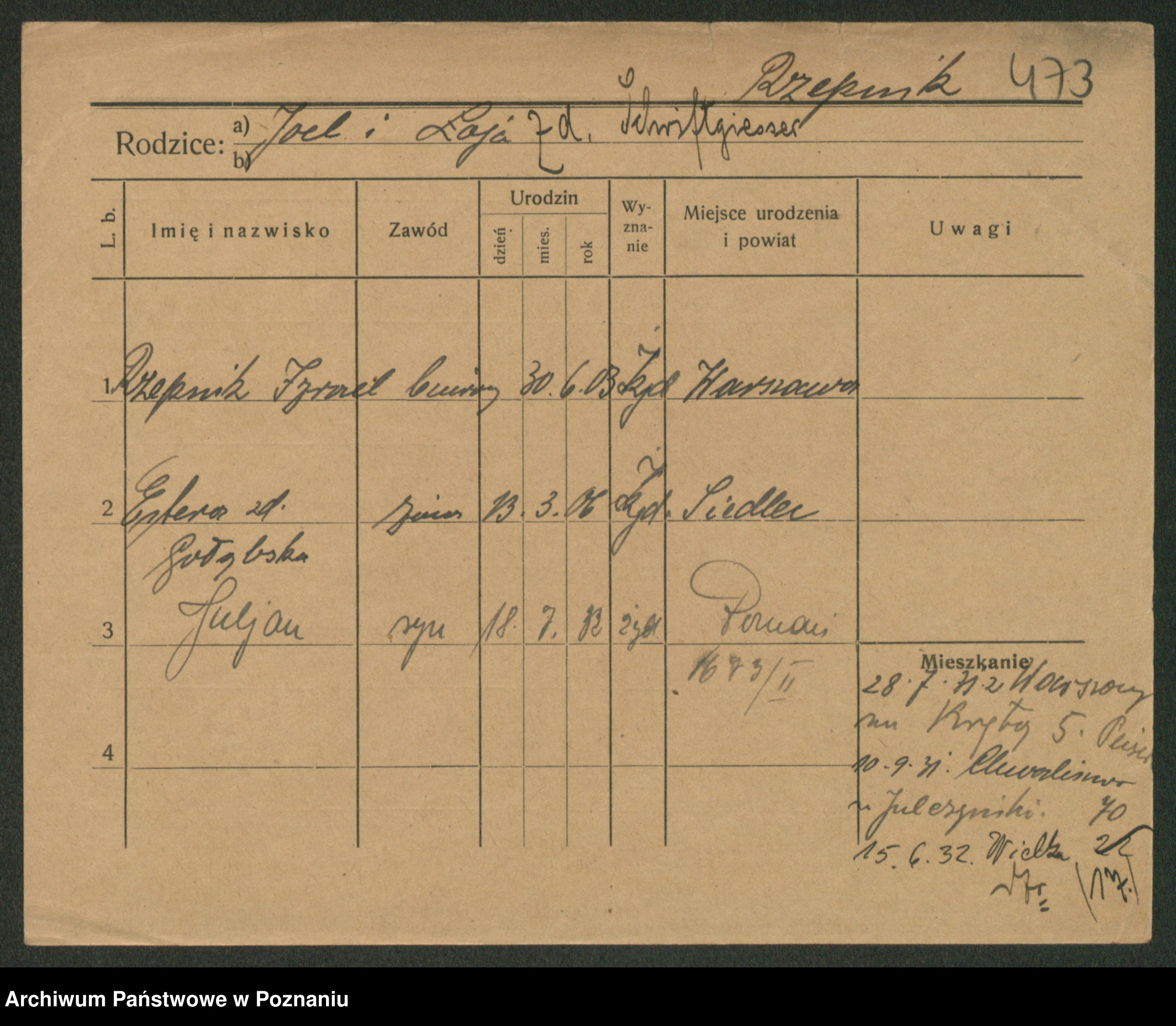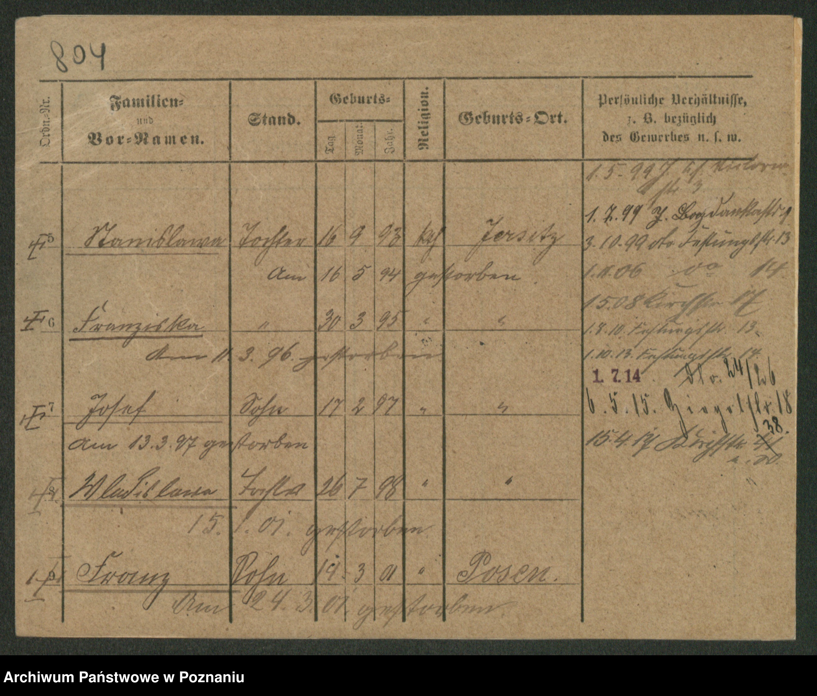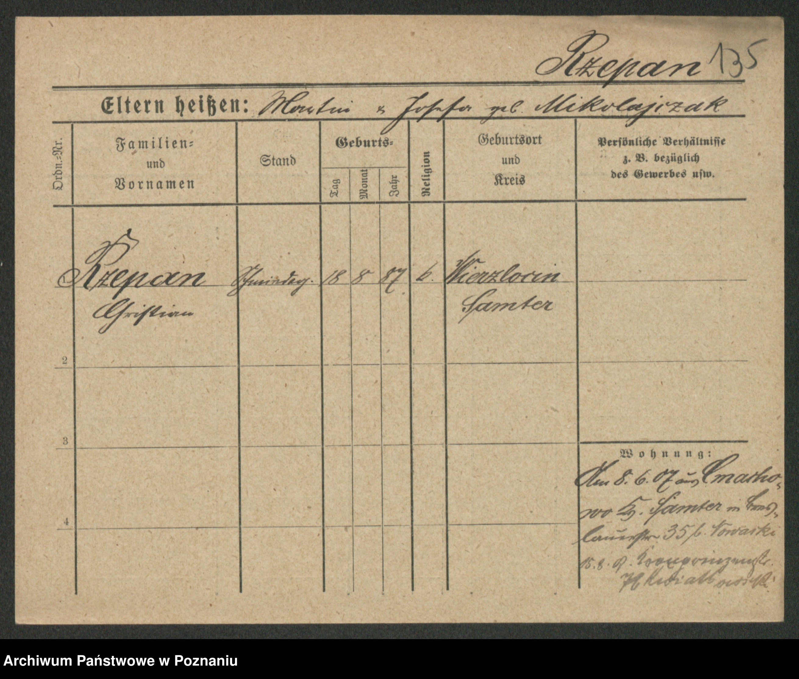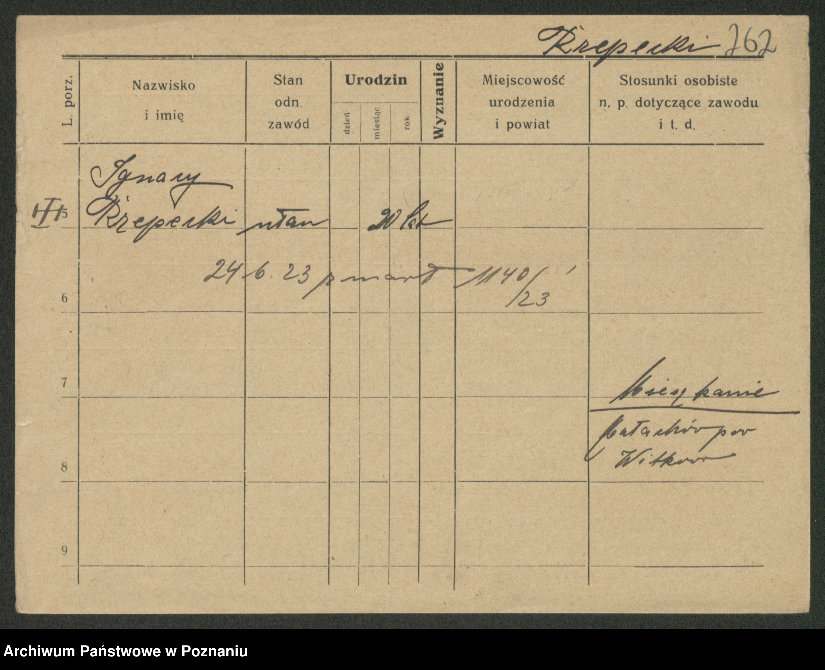 Podgląd karty osobowej dostępny jest po kliknięciu na nazwisko lub ikonkę karty. Można dokonywać powiększenia (ikony na górze) lub przechodzić między kolejnymi skanami (strzałki po bokach).