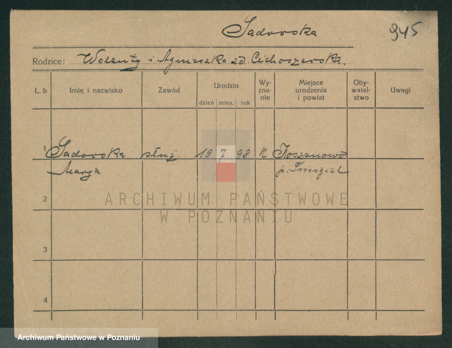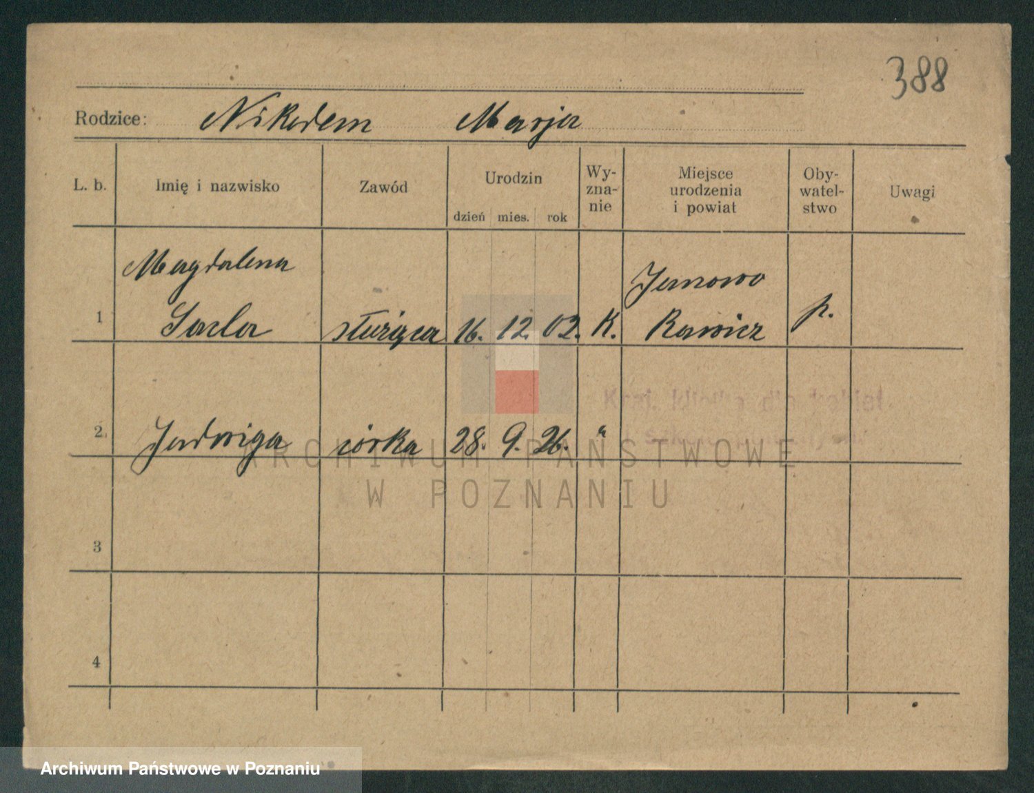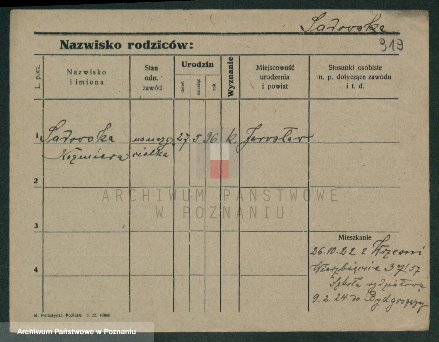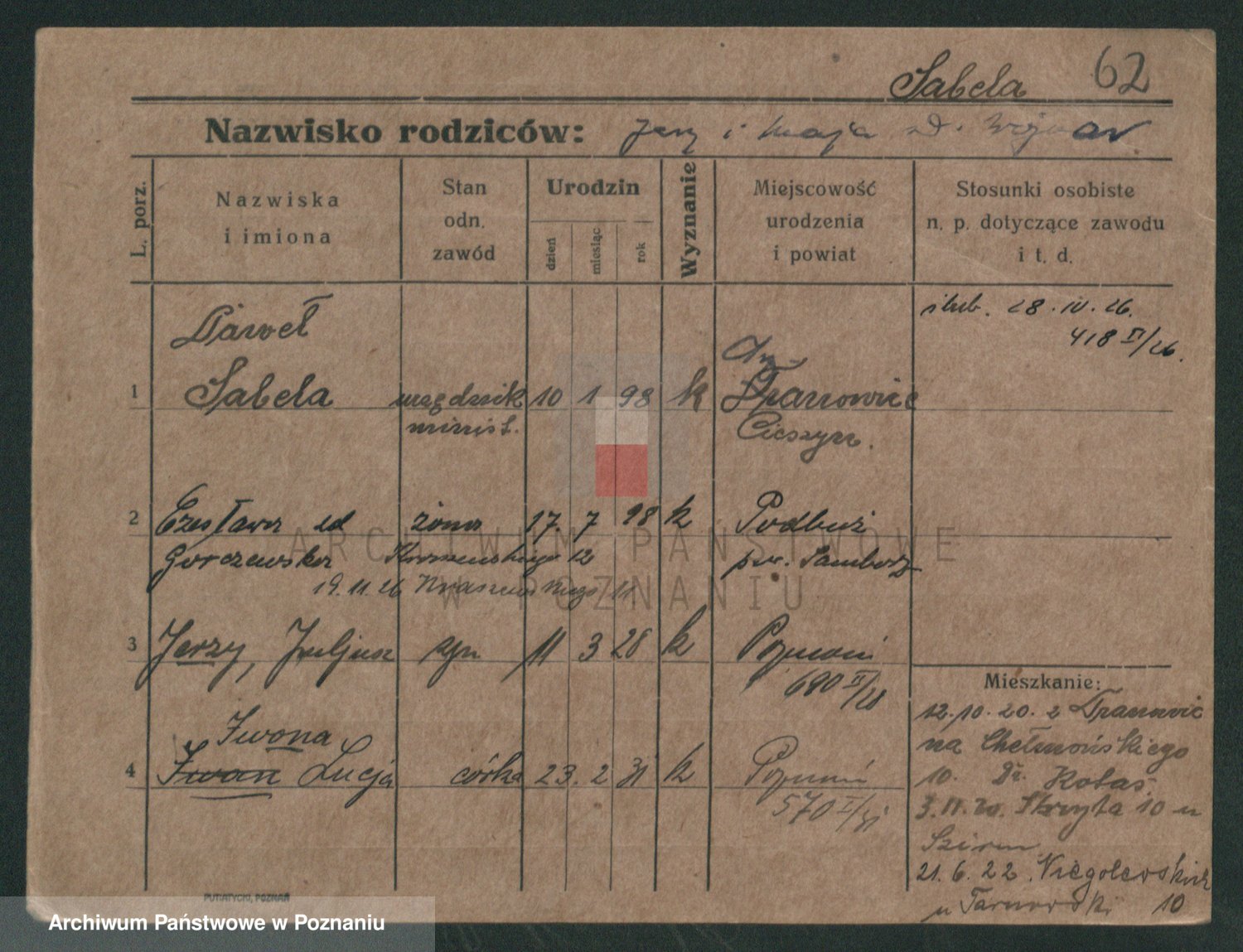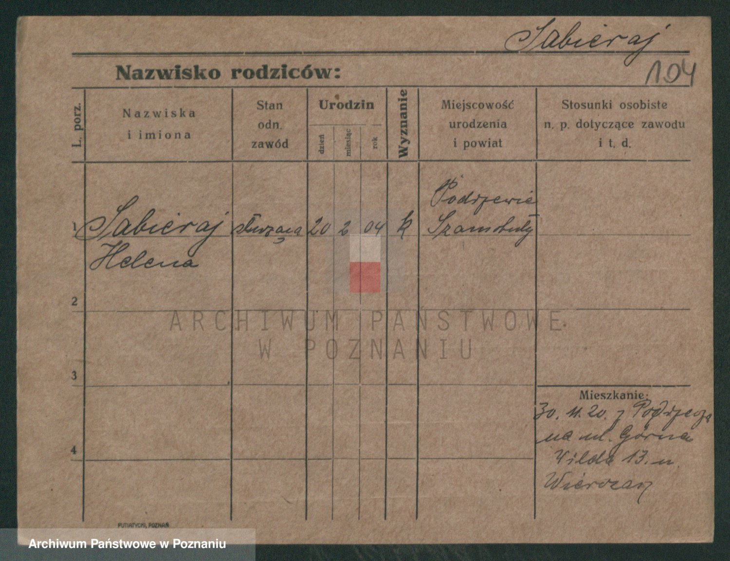 Podgląd karty osobowej dostępny jest po kliknięciu na nazwisko lub ikonkę karty. Można dokonywać powiększenia (ikony na górze) lub przechodzić między kolejnymi skanami (strzałki po bokach).