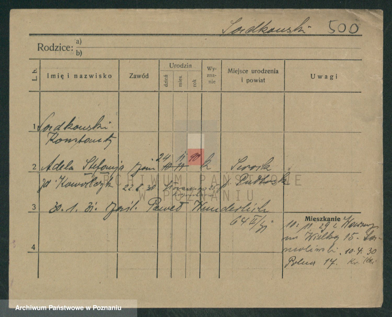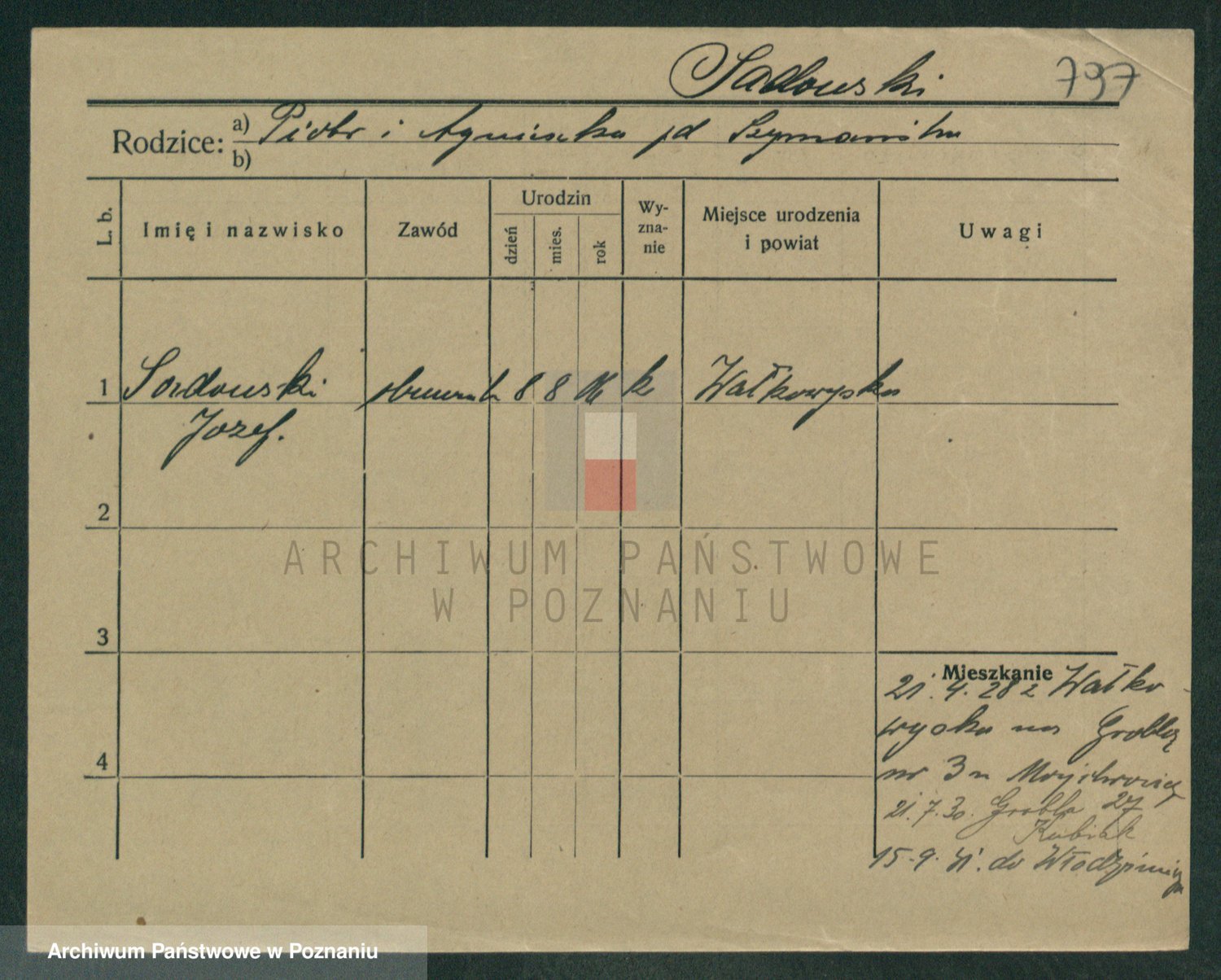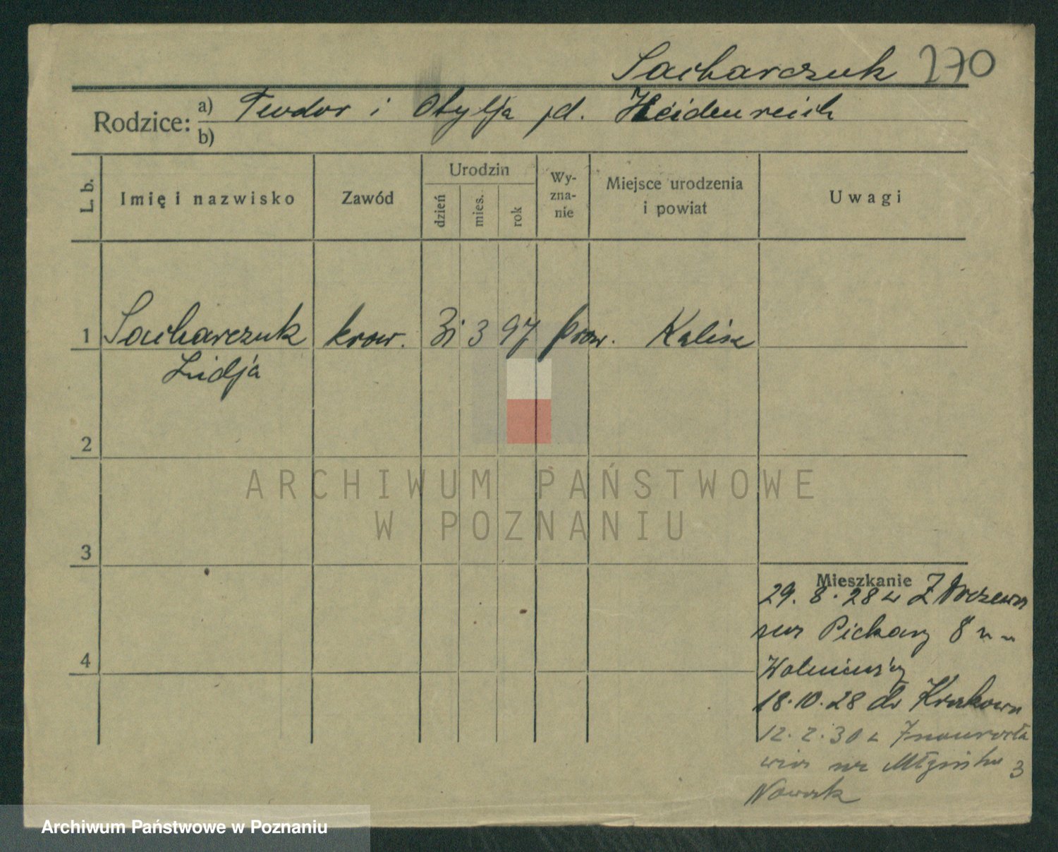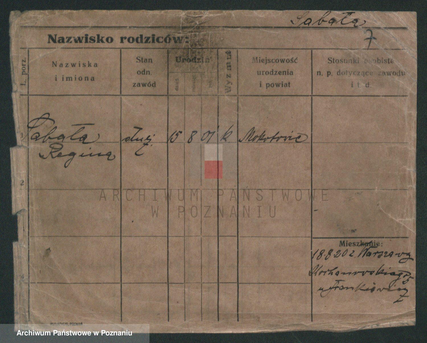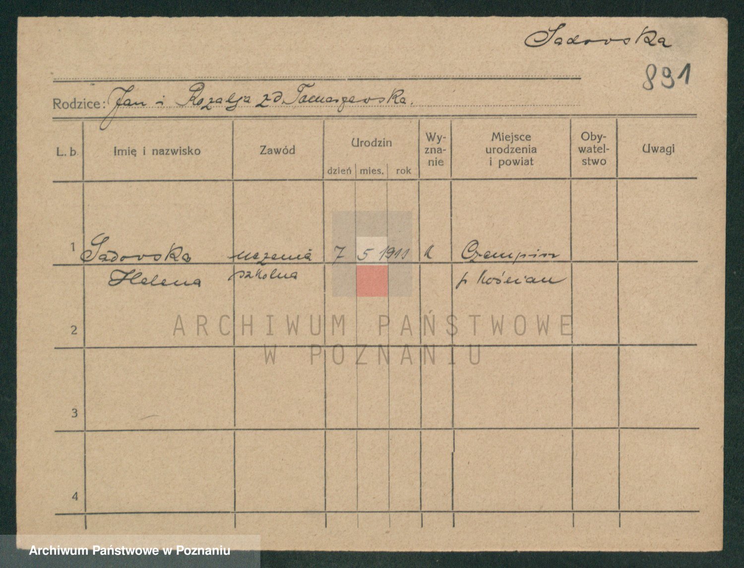 Podgląd karty osobowej dostępny jest po kliknięciu na nazwisko lub ikonkę karty. Można dokonywać powiększenia (ikony na górze) lub przechodzić między kolejnymi skanami (strzałki po bokach).