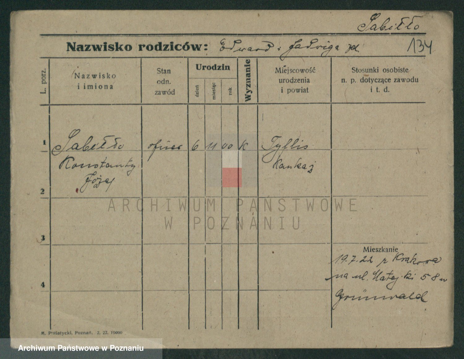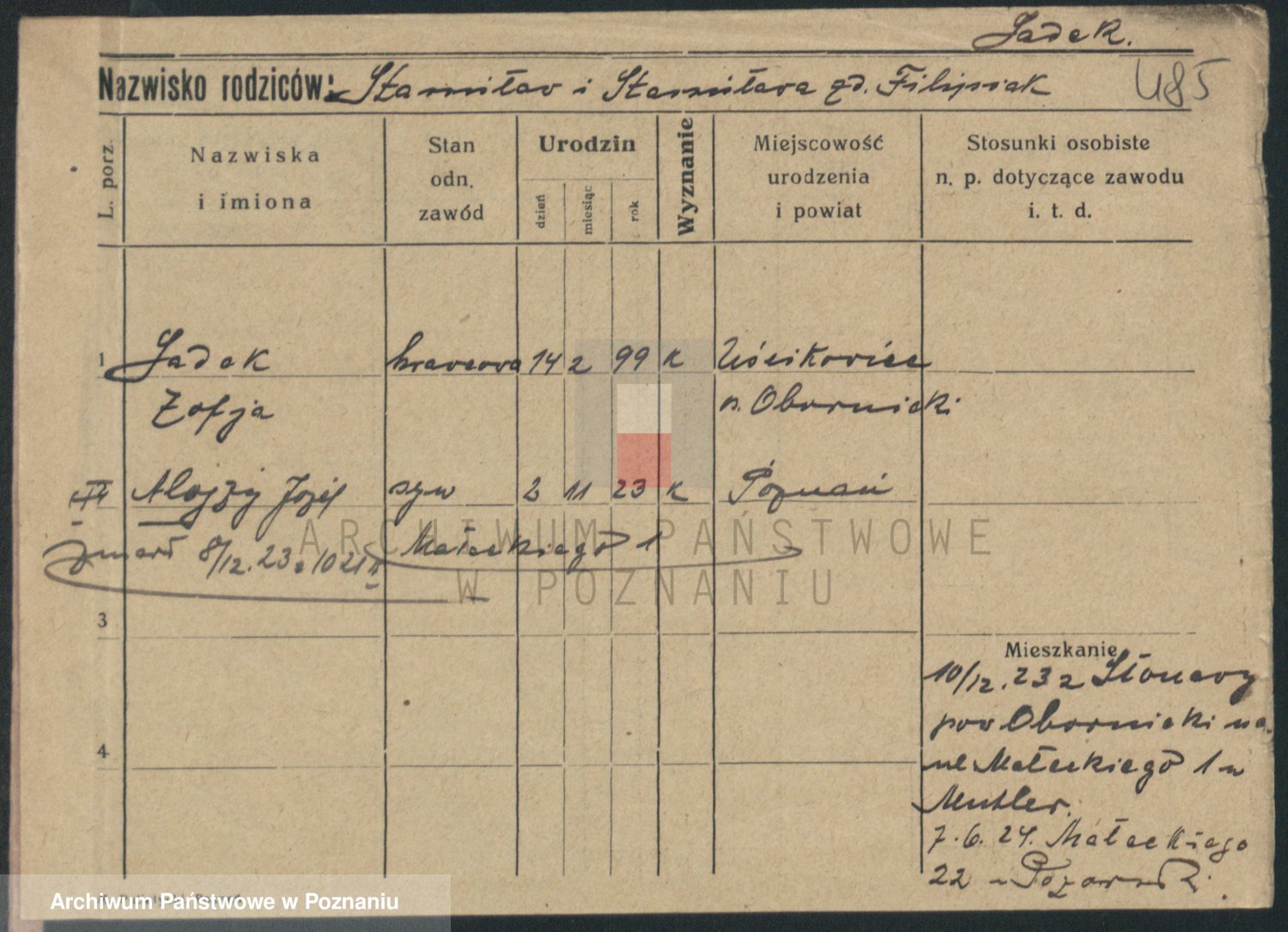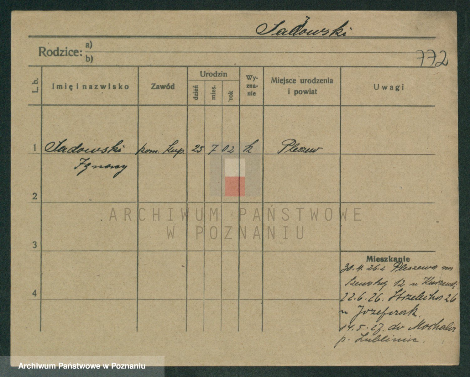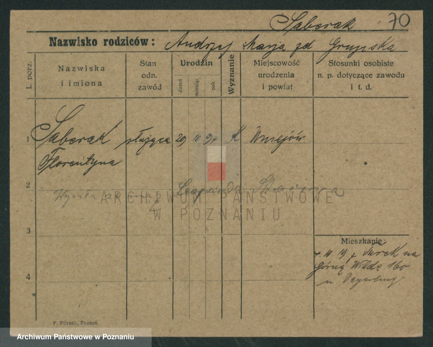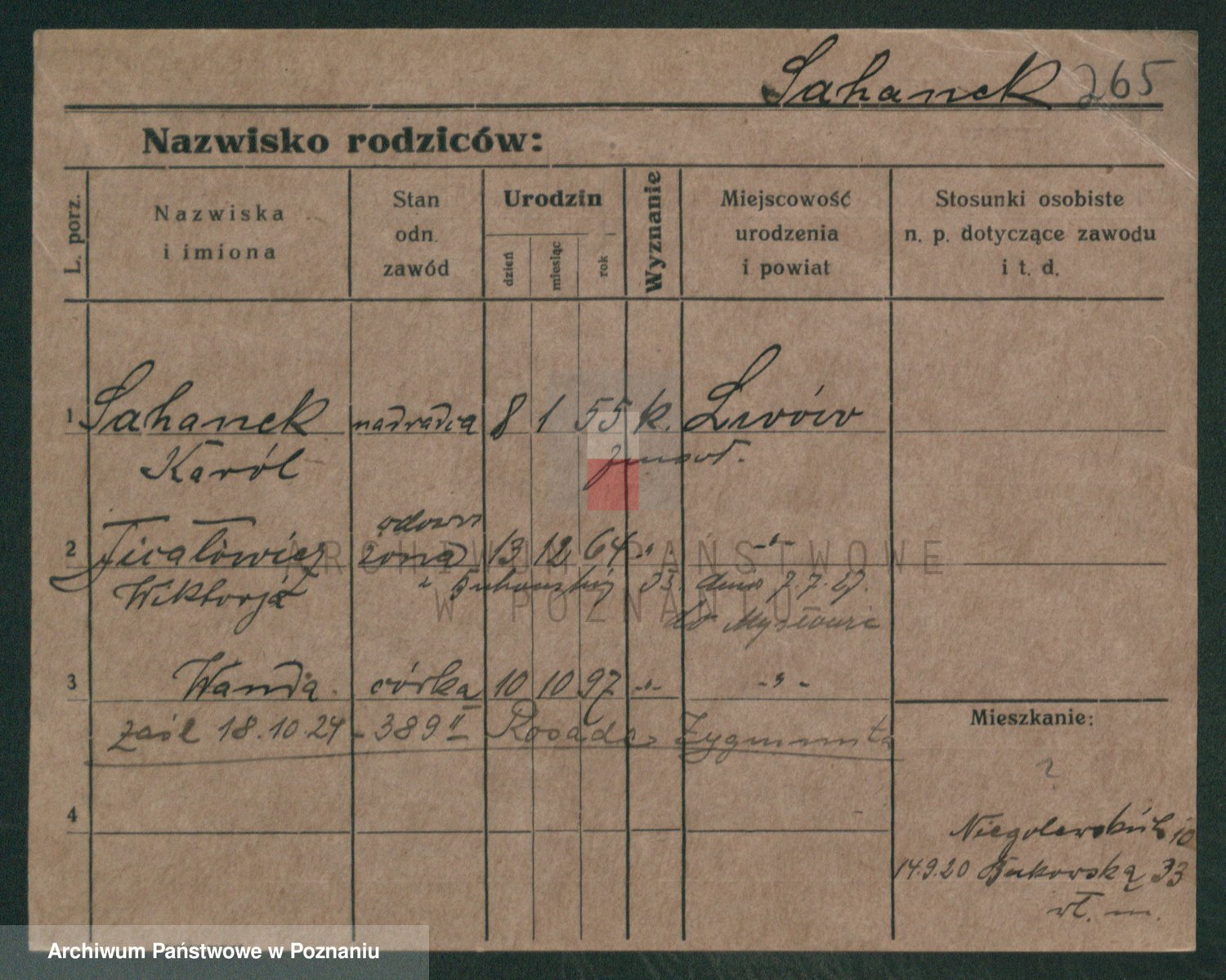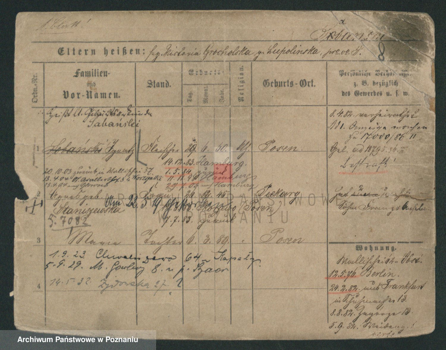 Podgląd karty osobowej dostępny jest po kliknięciu na nazwisko lub ikonkę karty. Można dokonywać powiększenia (ikony na górze) lub przechodzić między kolejnymi skanami (strzałki po bokach).