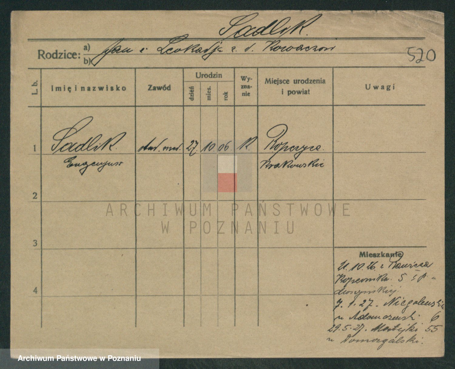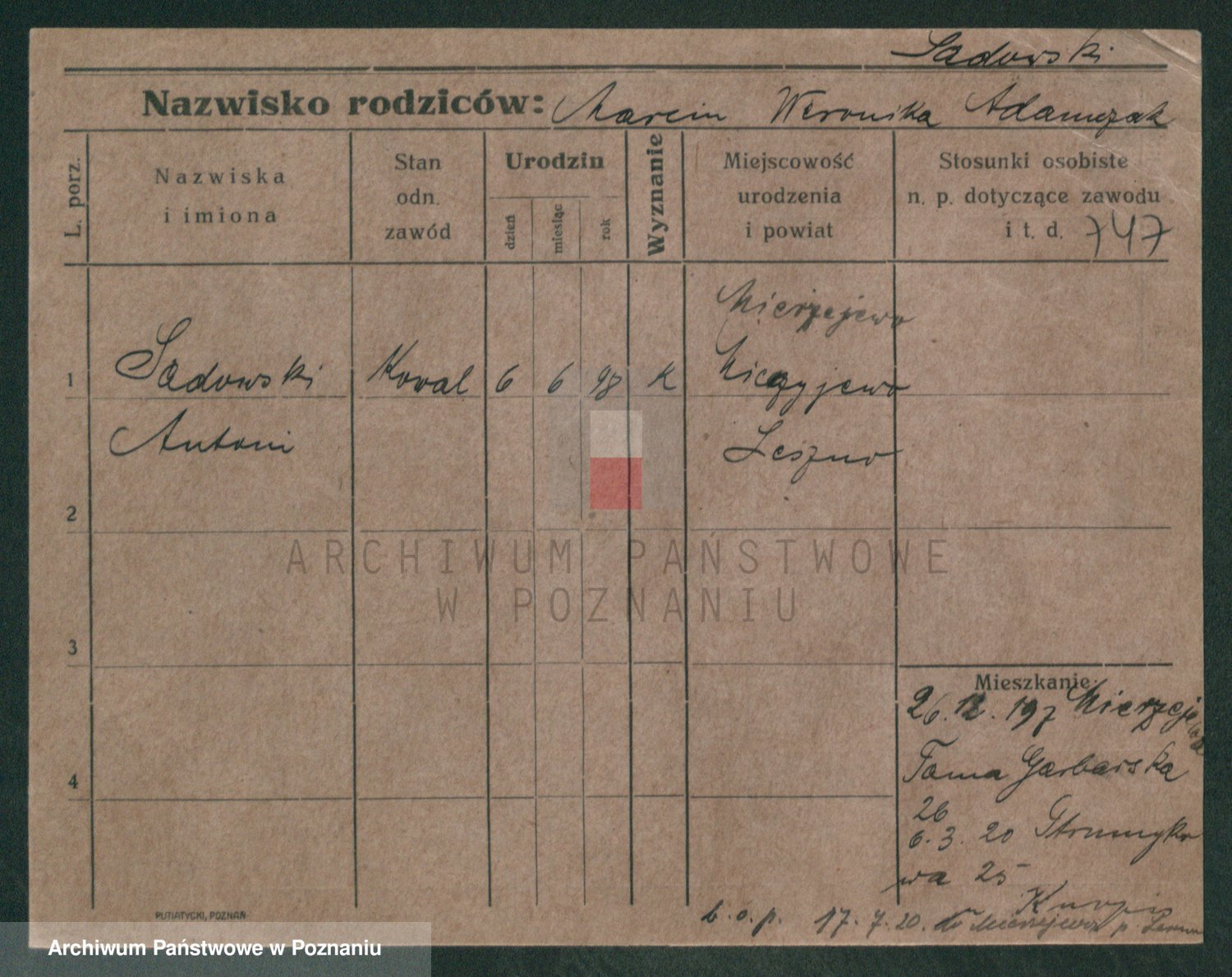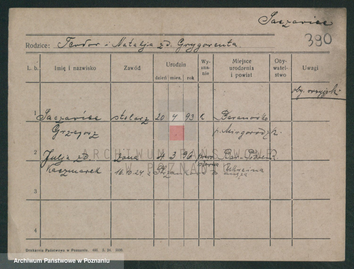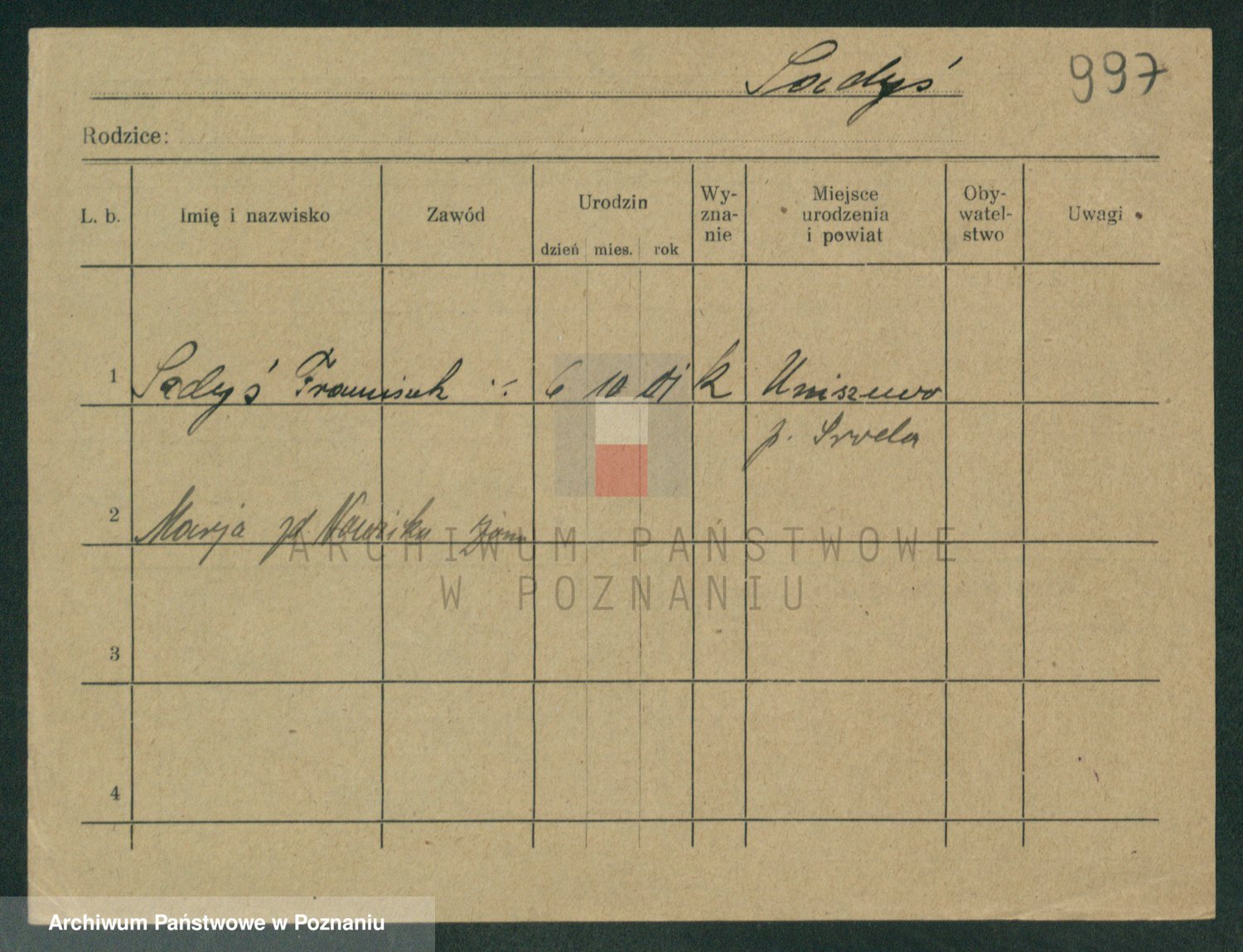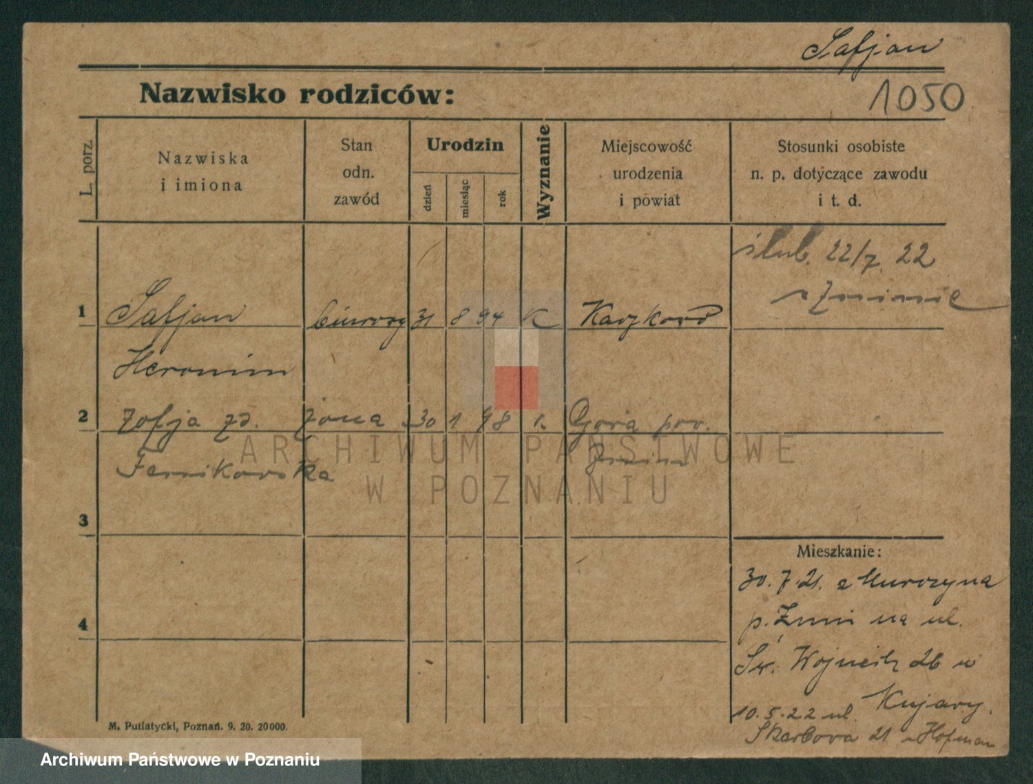 Podgląd karty osobowej dostępny jest po kliknięciu na nazwisko lub ikonkę karty. Można dokonywać powiększenia (ikony na górze) lub przechodzić między kolejnymi skanami (strzałki po bokach).