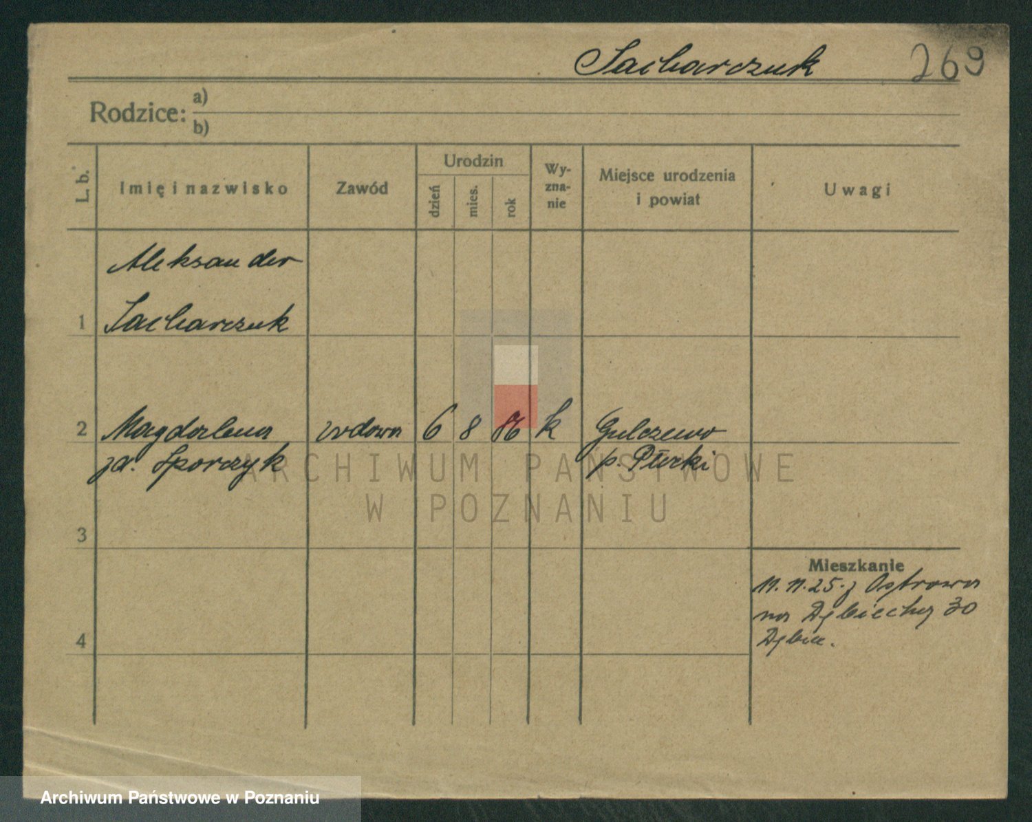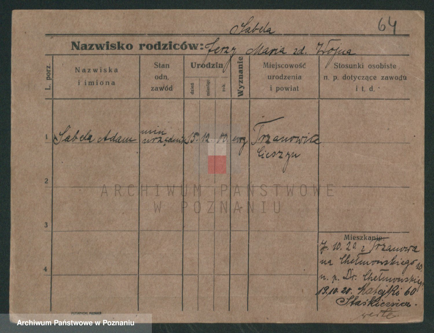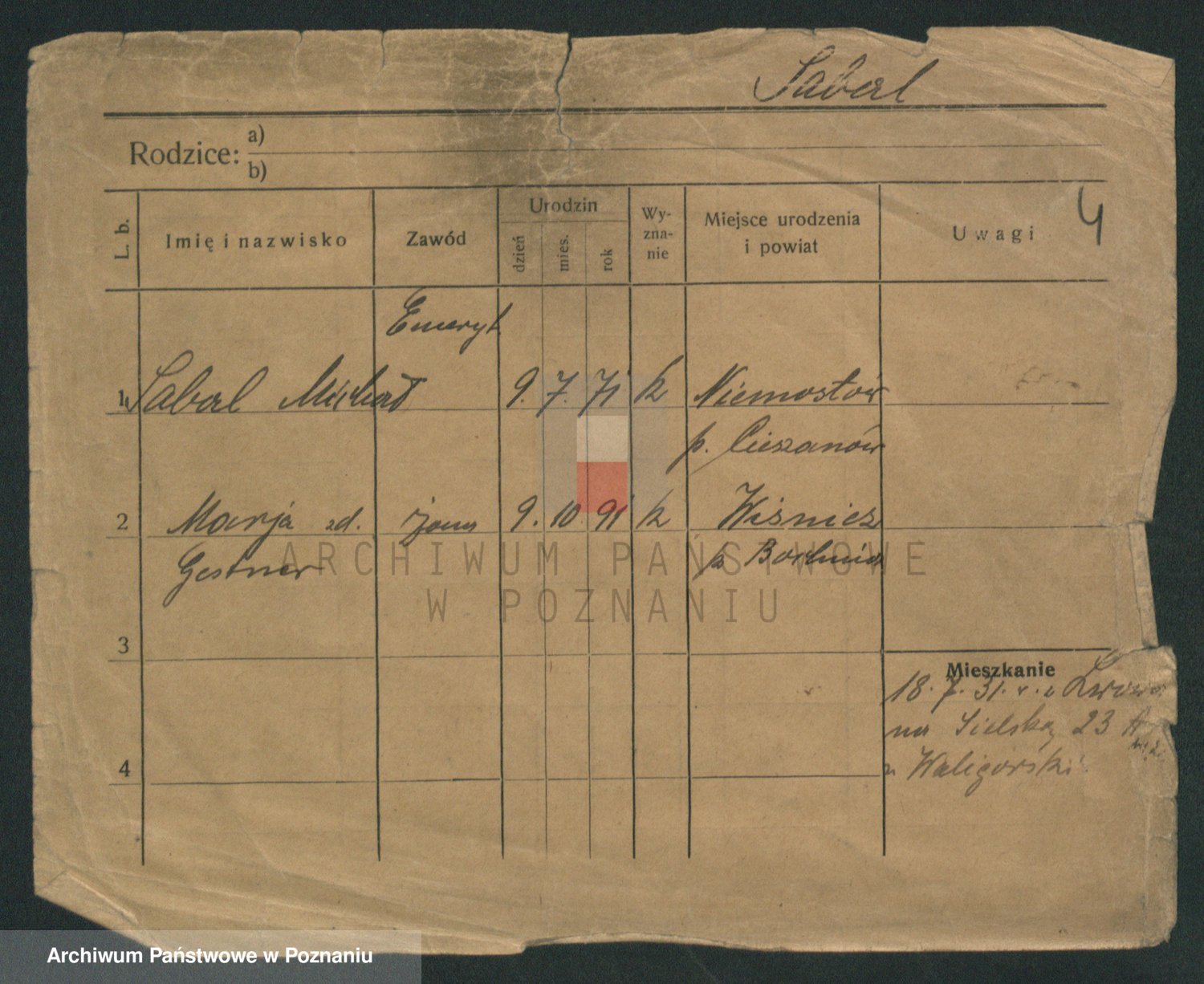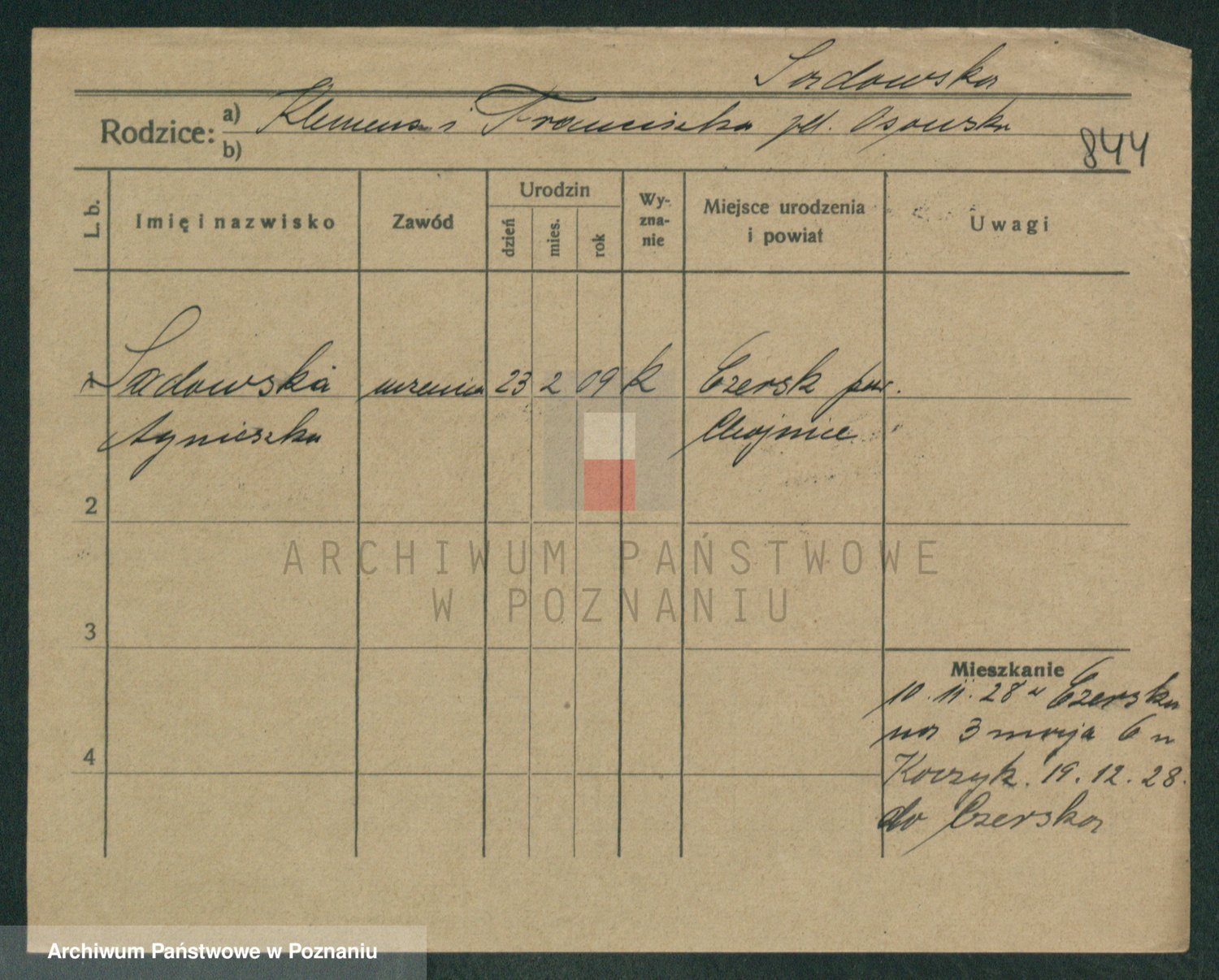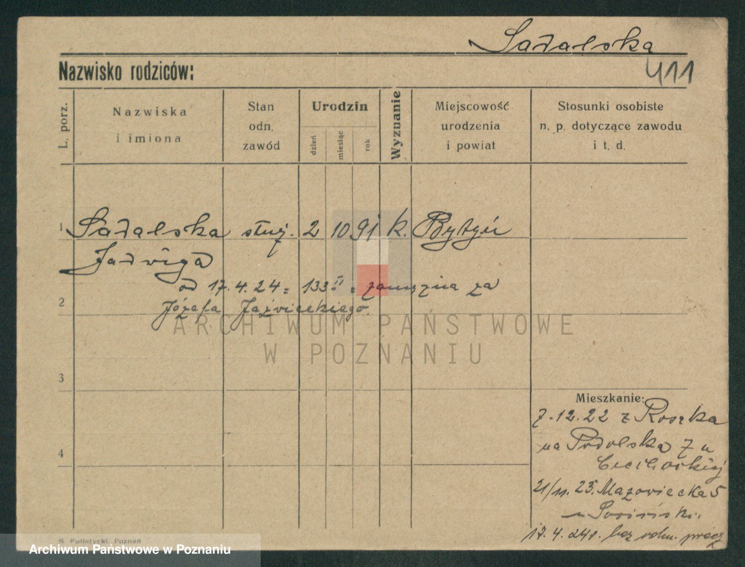 Podgląd karty osobowej dostępny jest po kliknięciu na nazwisko lub ikonkę karty. Można dokonywać powiększenia (ikony na górze) lub przechodzić między kolejnymi skanami (strzałki po bokach).