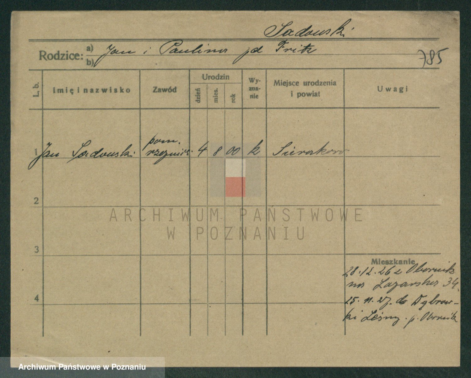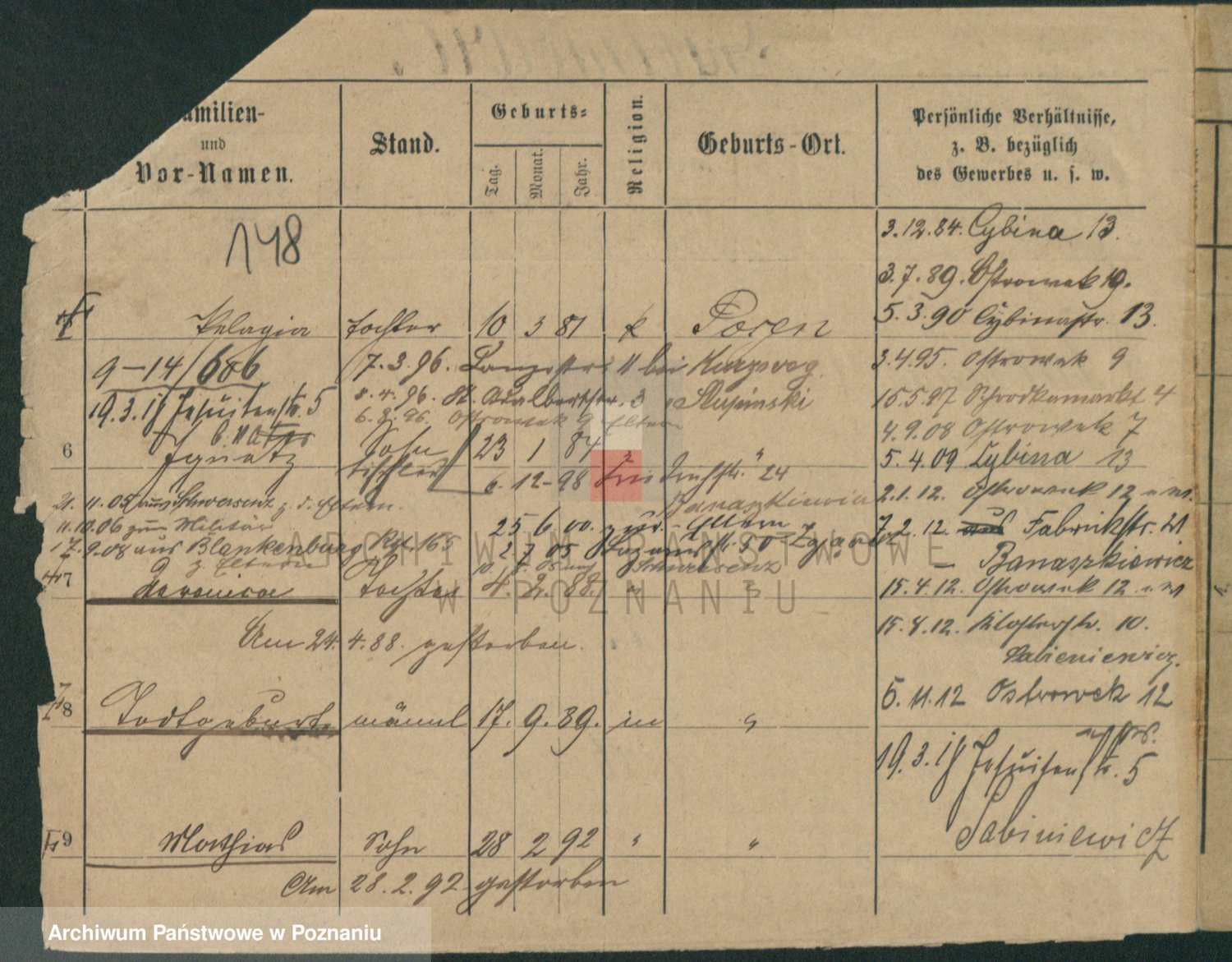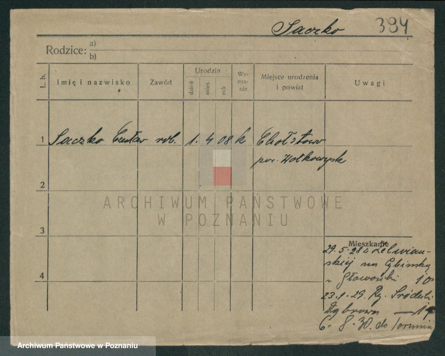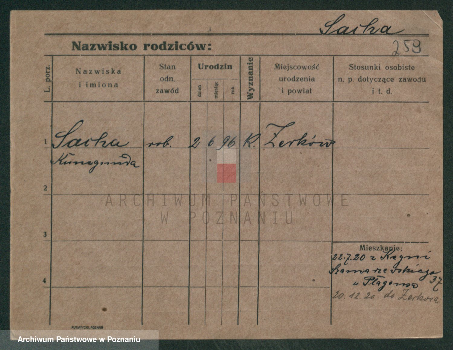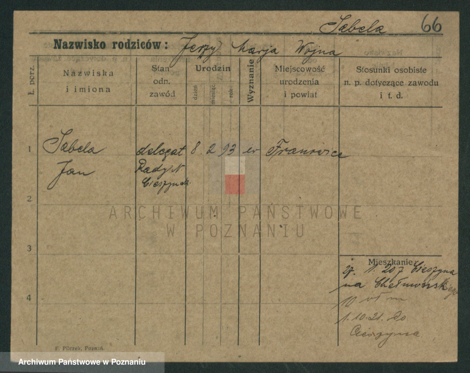 Podgląd karty osobowej dostępny jest po kliknięciu na nazwisko lub ikonkę karty. Można dokonywać powiększenia (ikony na górze) lub przechodzić między kolejnymi skanami (strzałki po bokach).