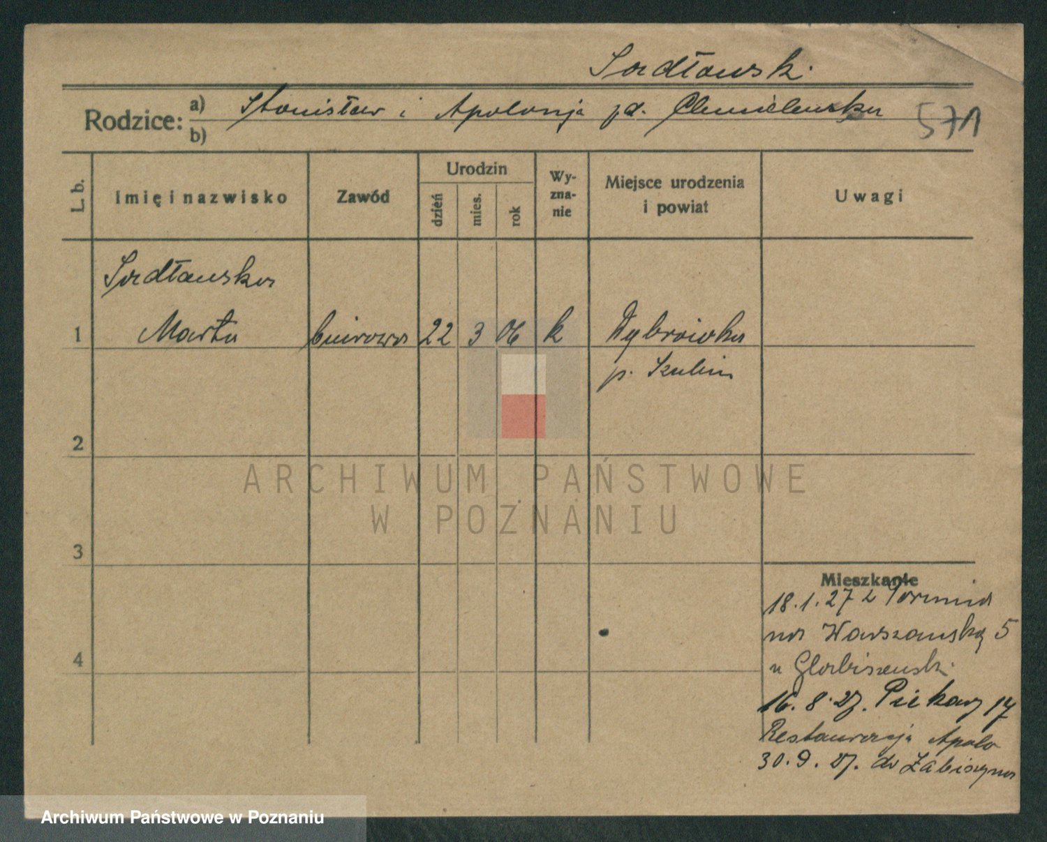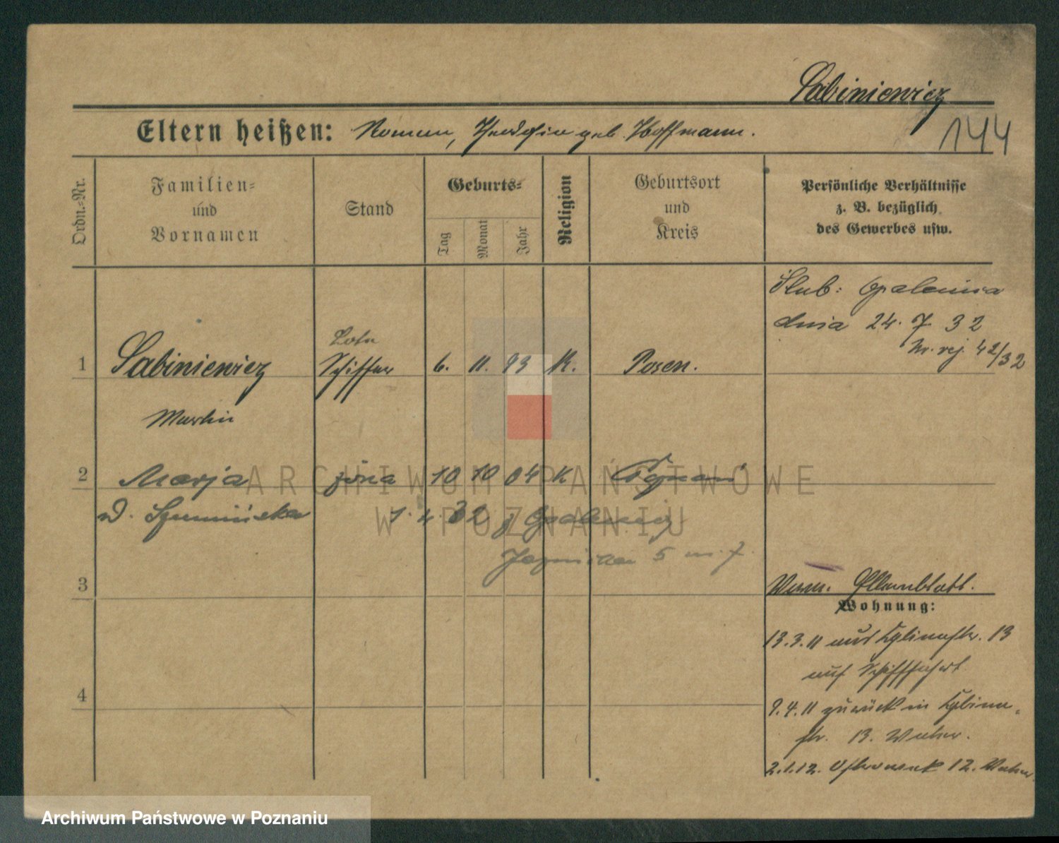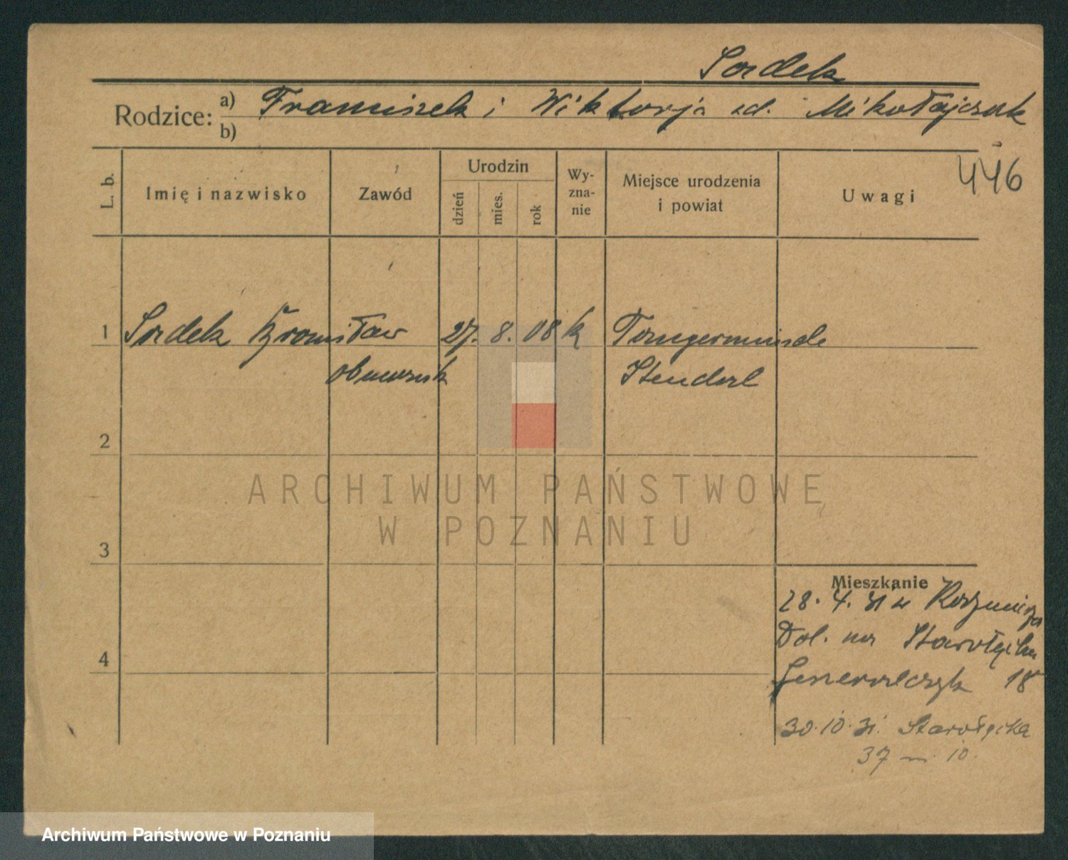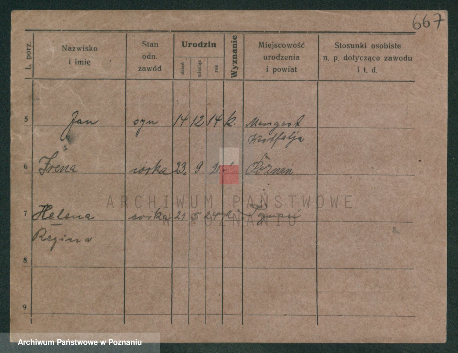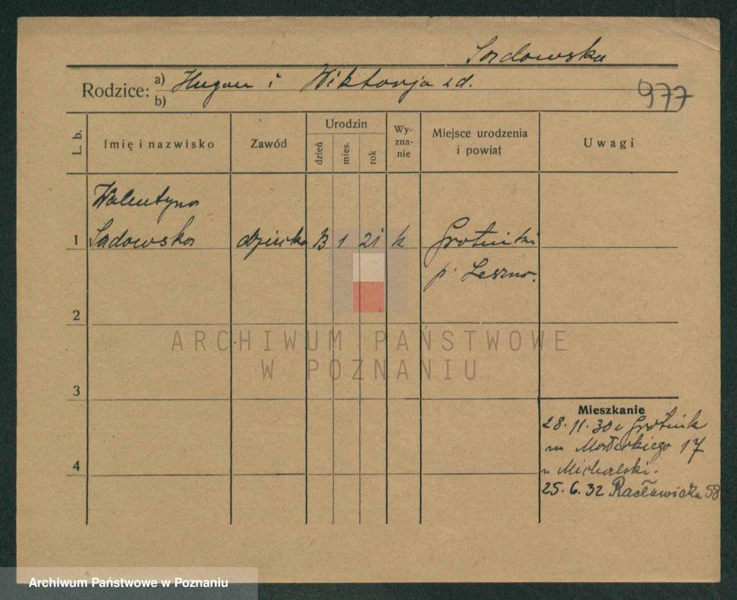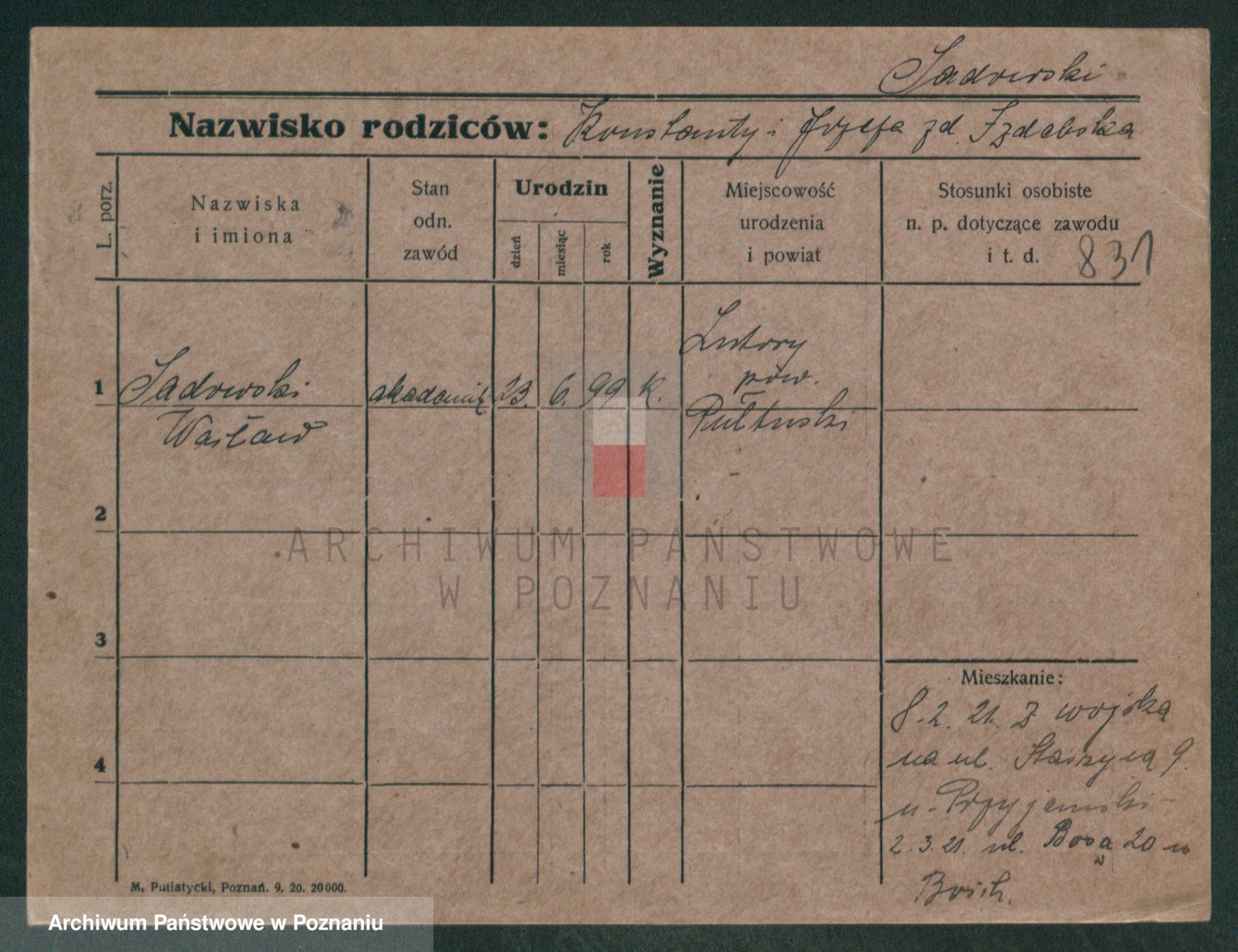 Podgląd karty osobowej dostępny jest po kliknięciu na nazwisko lub ikonkę karty. Można dokonywać powiększenia (ikony na górze) lub przechodzić między kolejnymi skanami (strzałki po bokach).