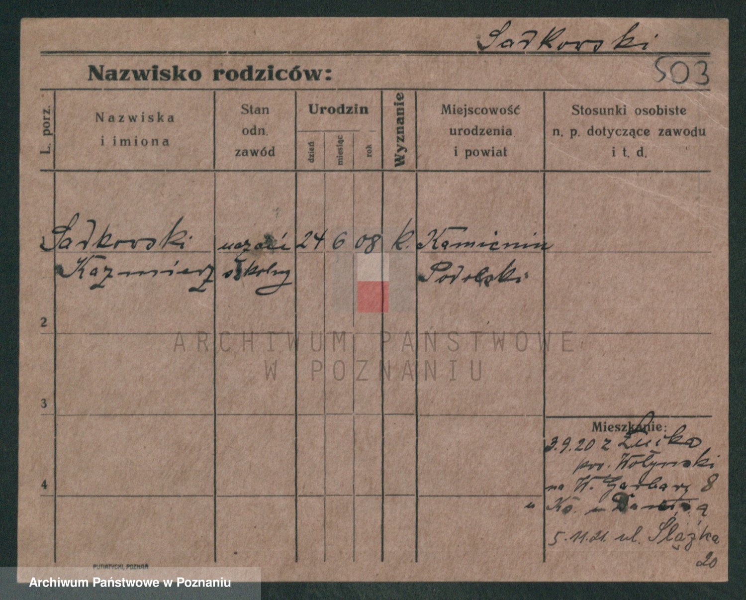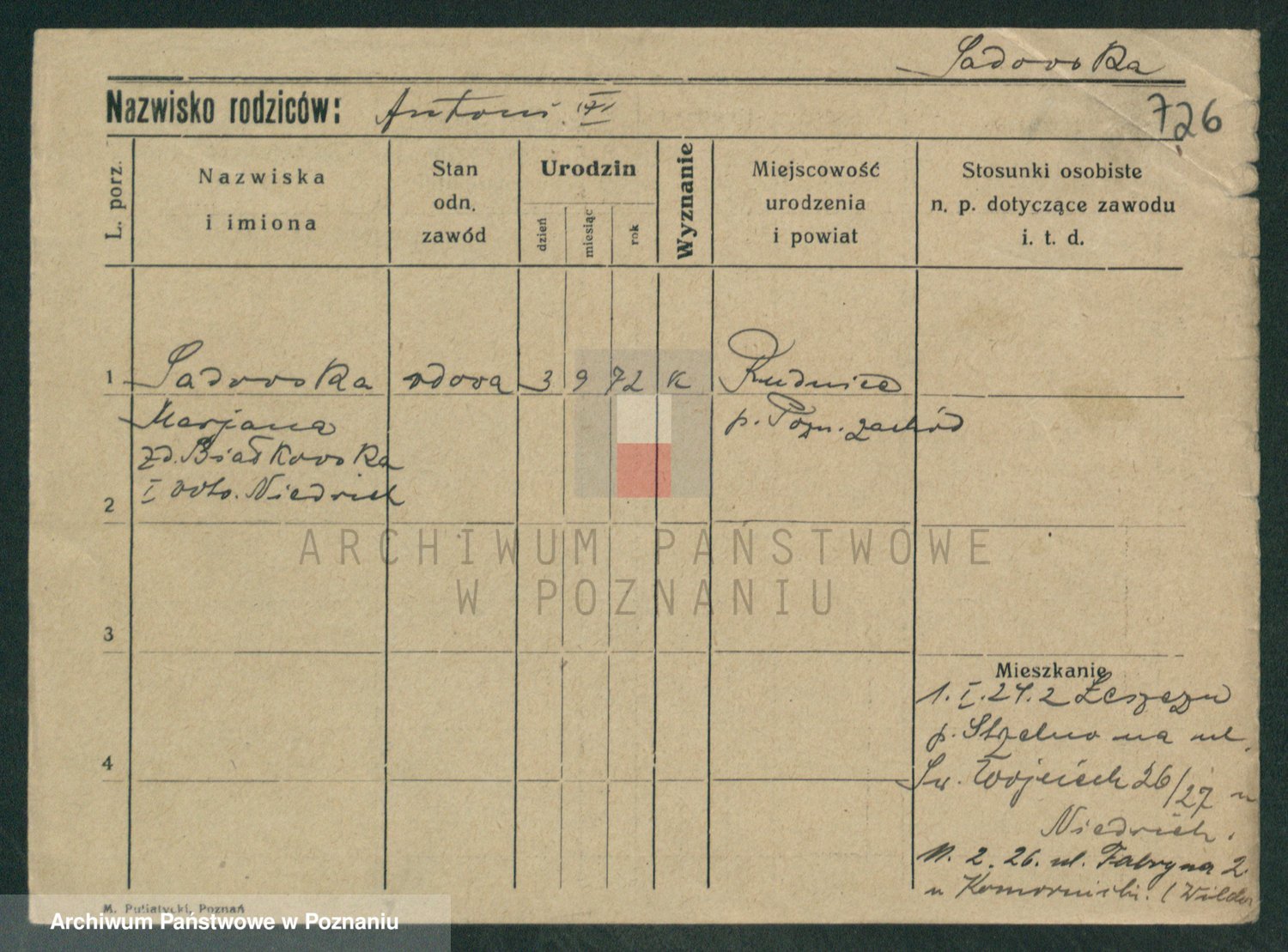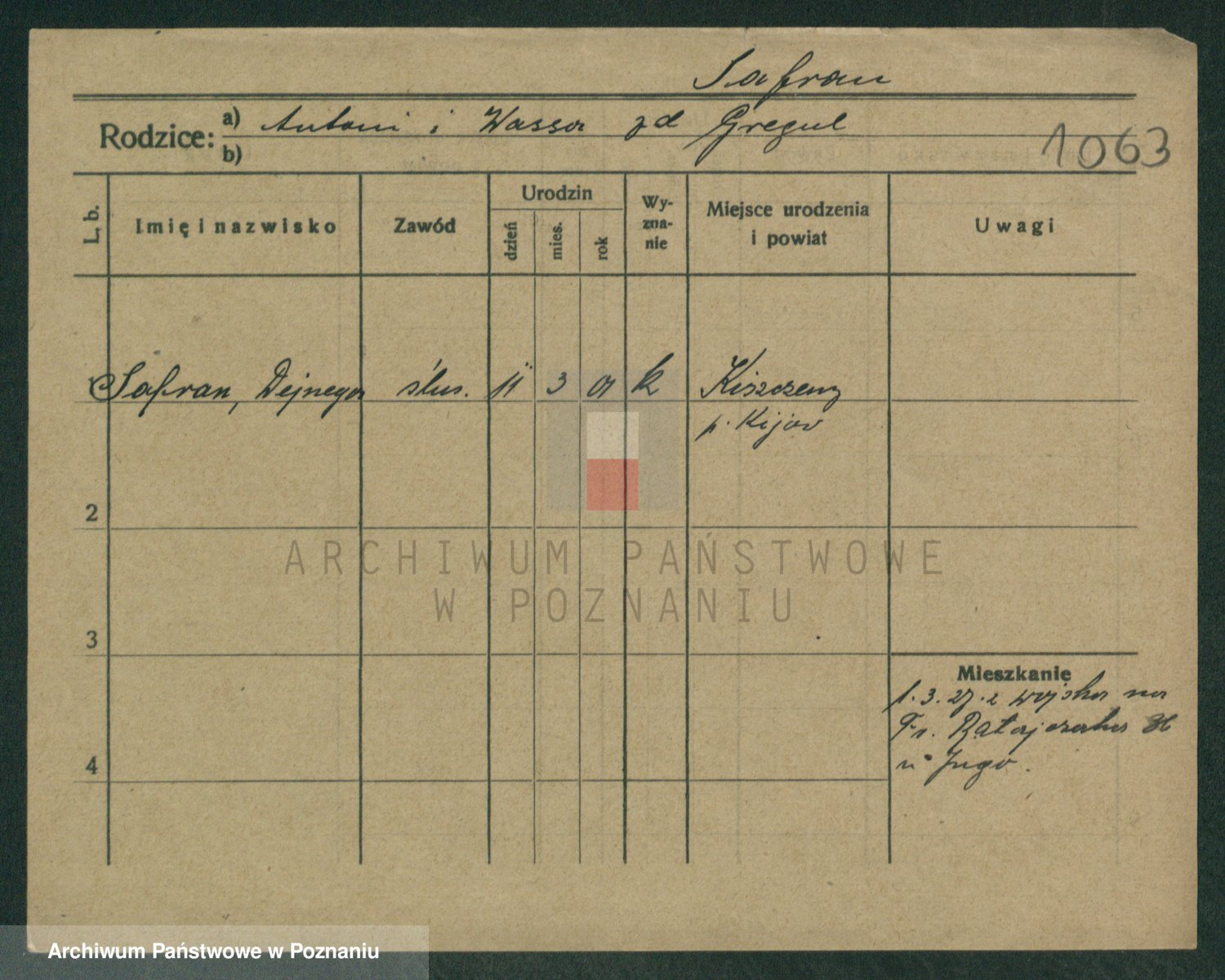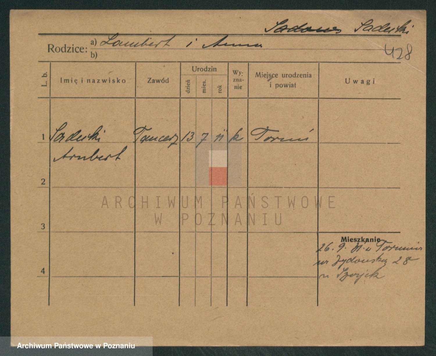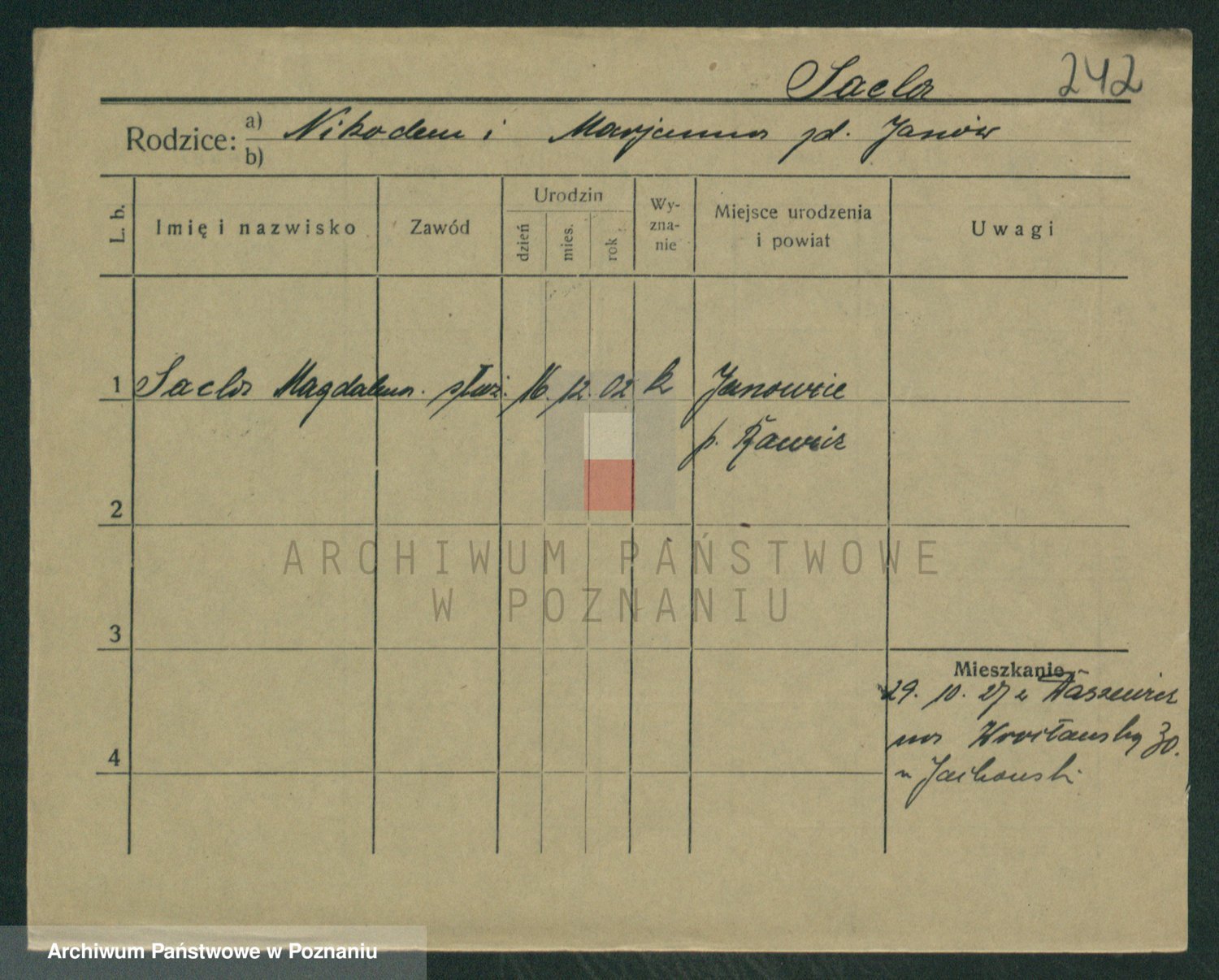 Podgląd karty osobowej dostępny jest po kliknięciu na nazwisko lub ikonkę karty. Można dokonywać powiększenia (ikony na górze) lub przechodzić między kolejnymi skanami (strzałki po bokach).