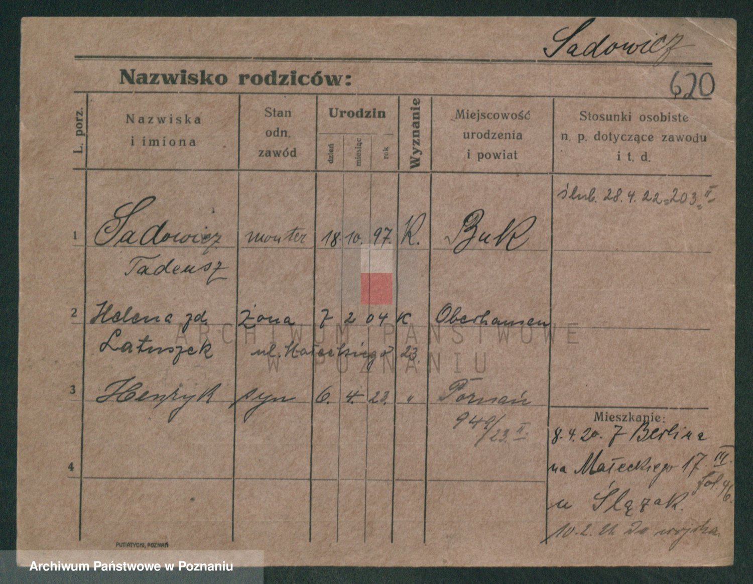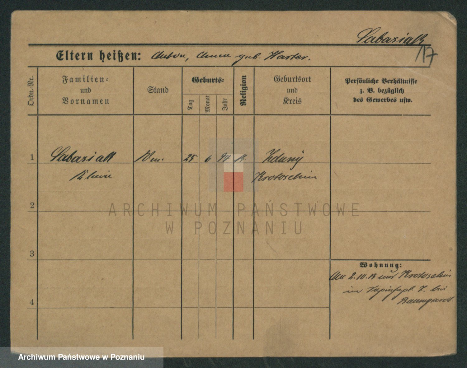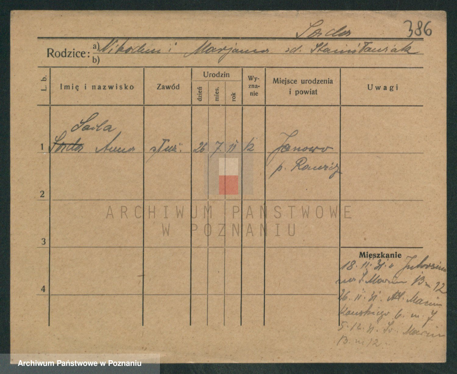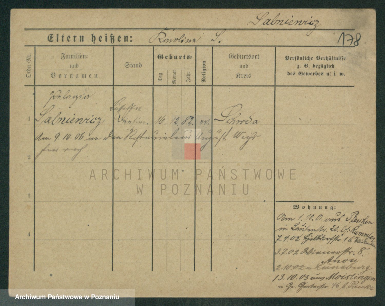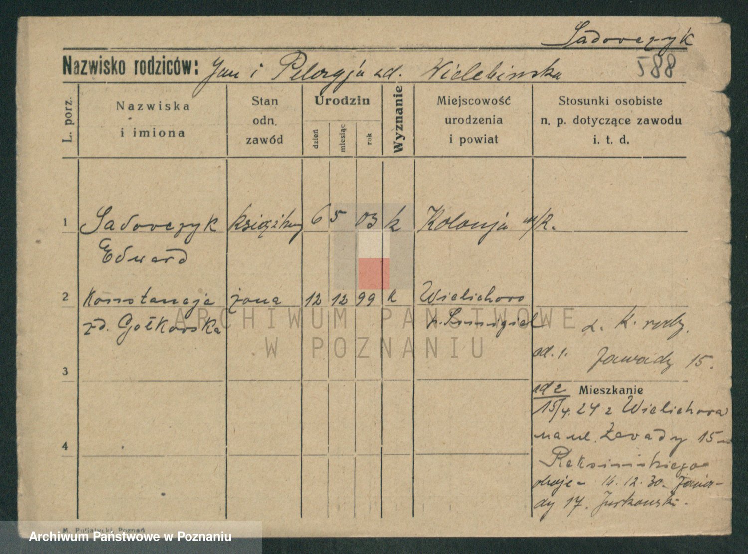 Podgląd karty osobowej dostępny jest po kliknięciu na nazwisko lub ikonkę karty. Można dokonywać powiększenia (ikony na górze) lub przechodzić między kolejnymi skanami (strzałki po bokach).