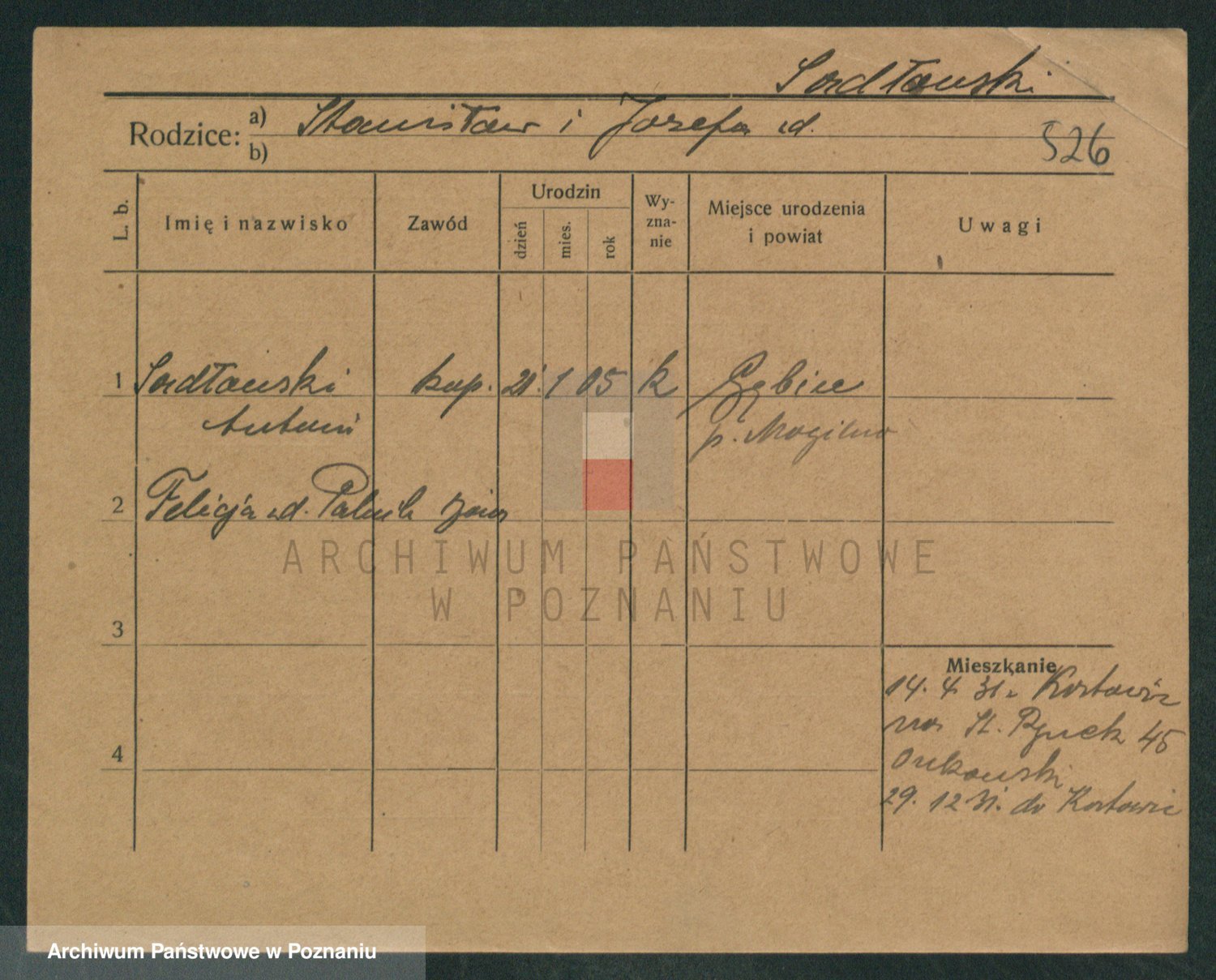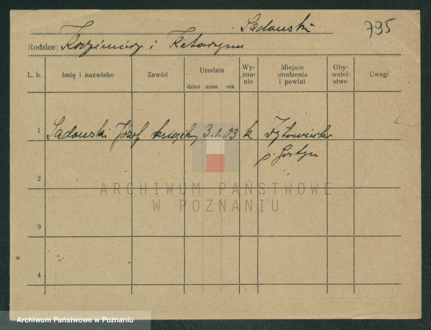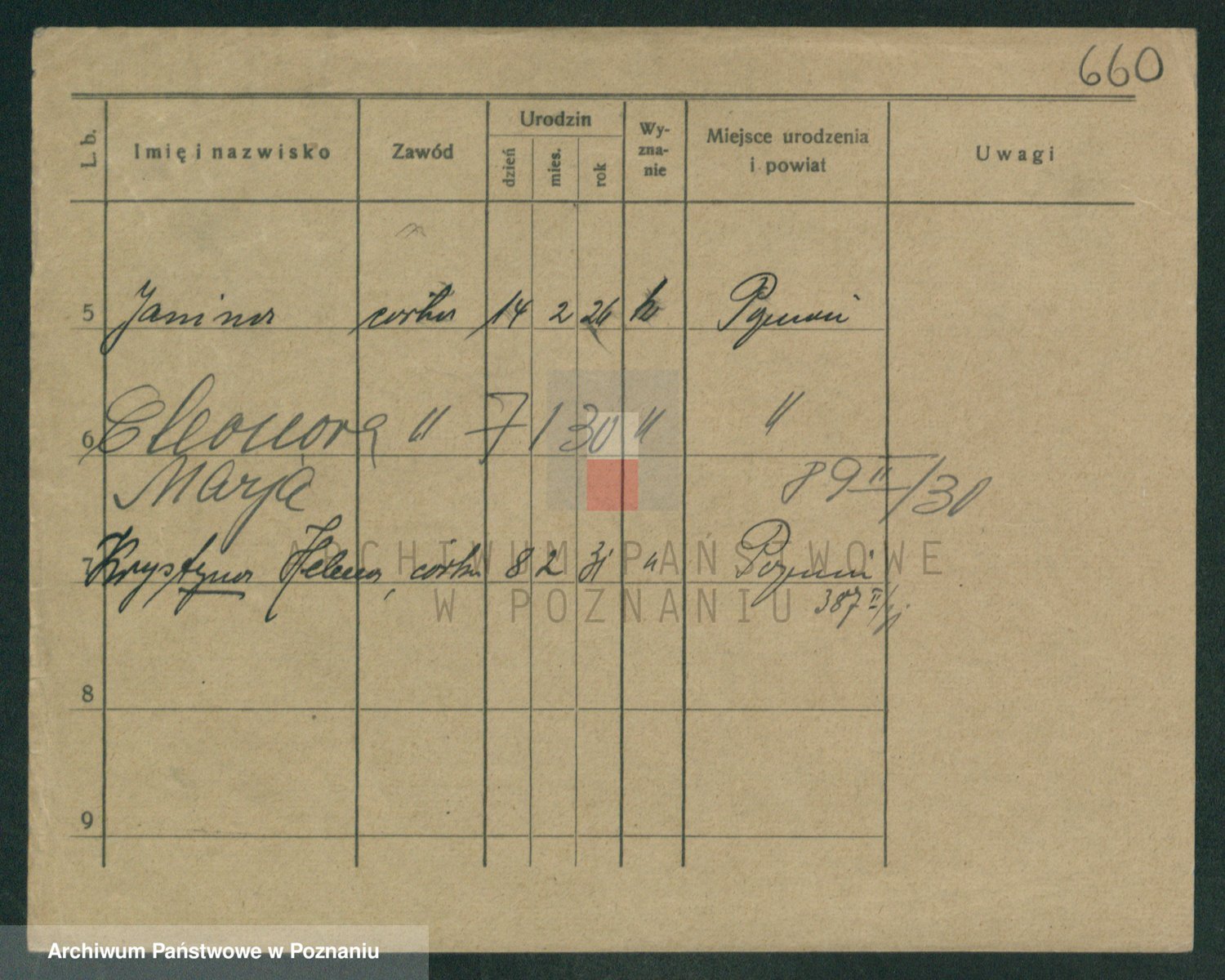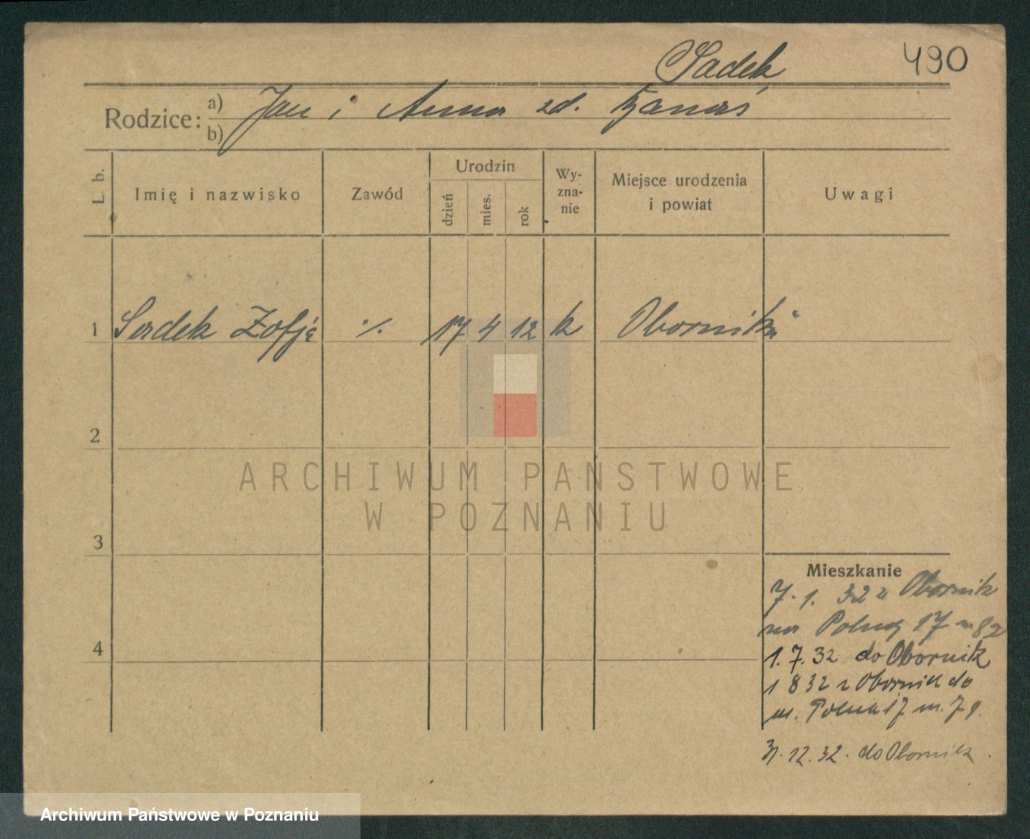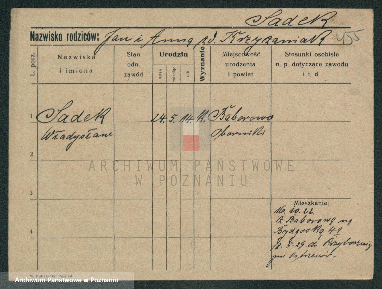 Podgląd karty osobowej dostępny jest po kliknięciu na nazwisko lub ikonkę karty. Można dokonywać powiększenia (ikony na górze) lub przechodzić między kolejnymi skanami (strzałki po bokach).