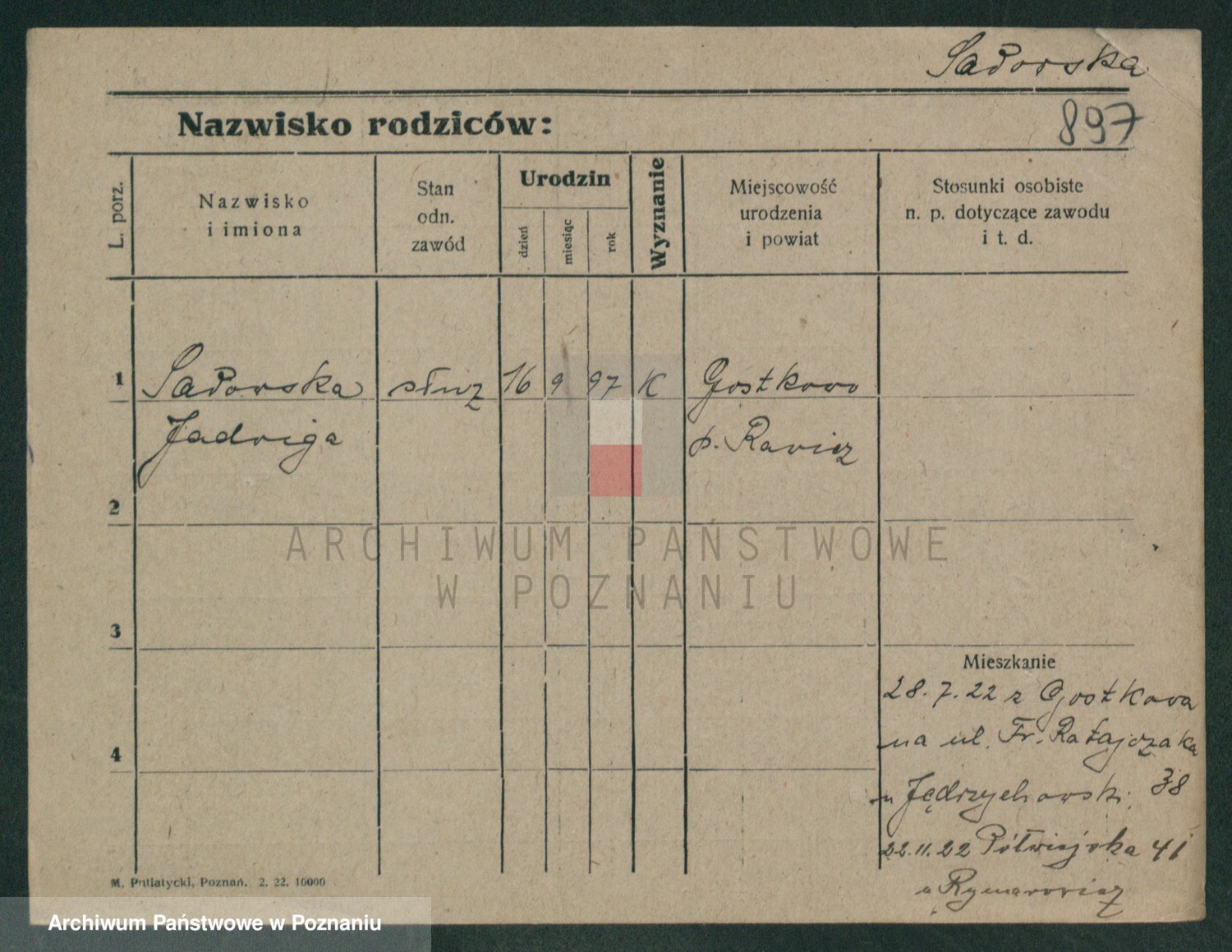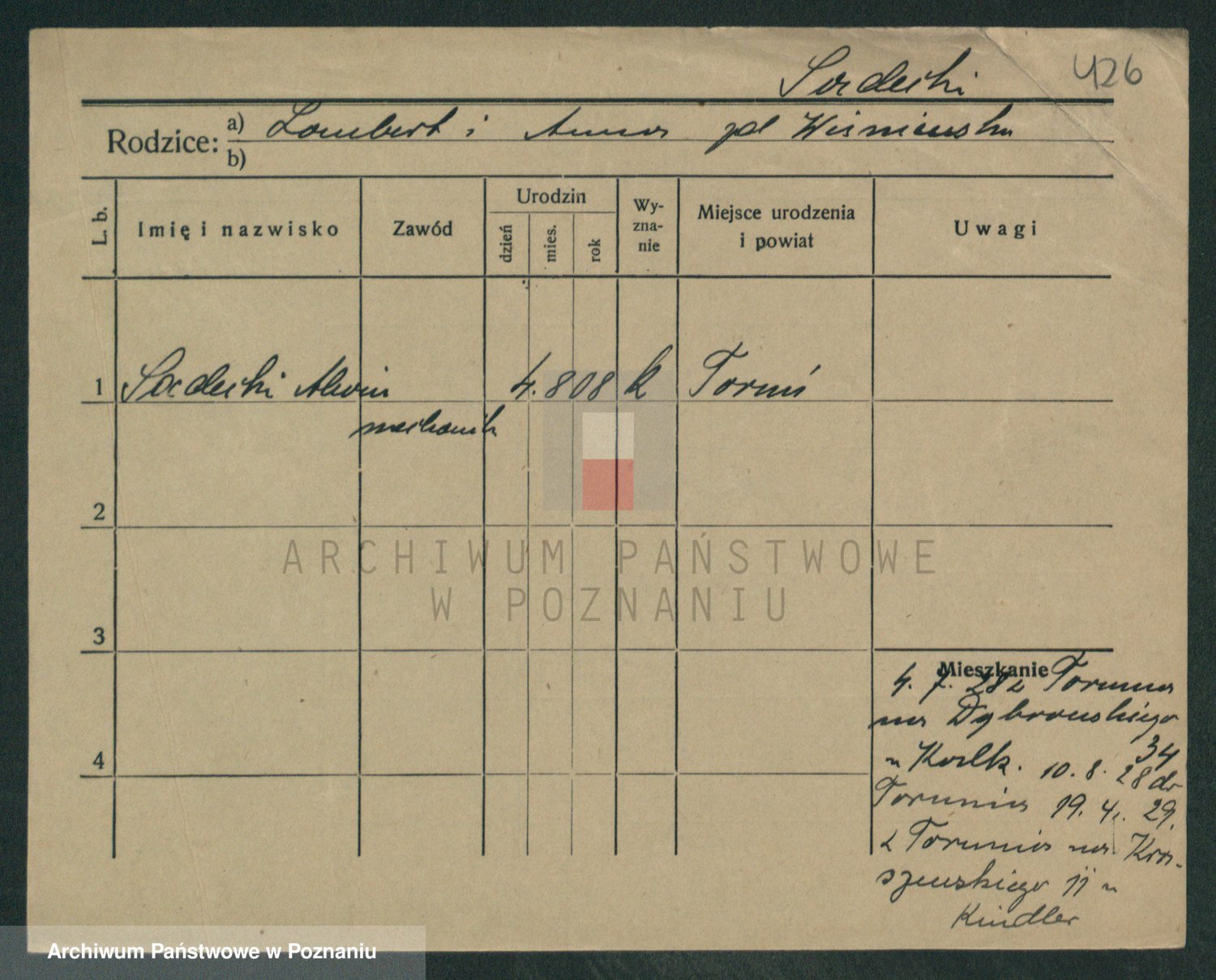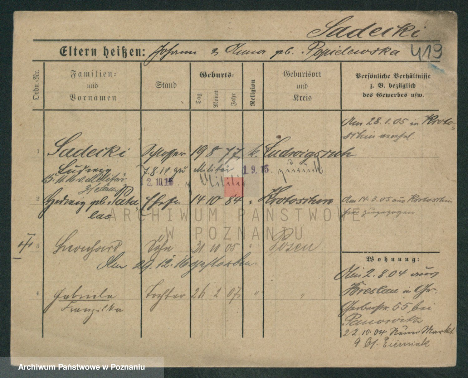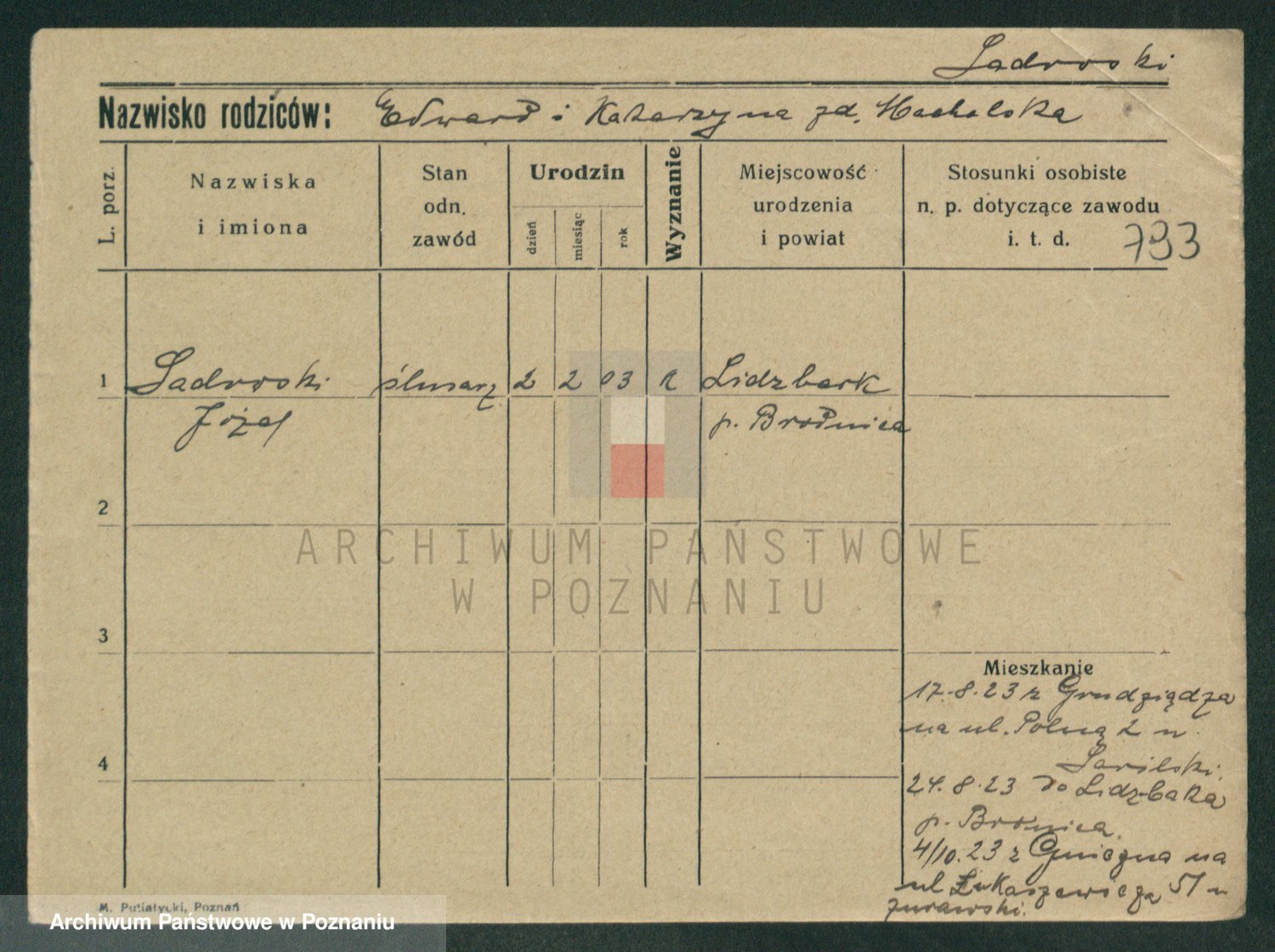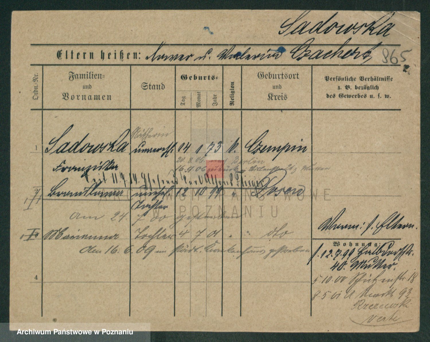Podgląd karty osobowej dostępny jest po kliknięciu na nazwisko lub ikonkę karty. Można dokonywać powiększenia (ikony na górze) lub przechodzić między kolejnymi skanami (strzałki po bokach).