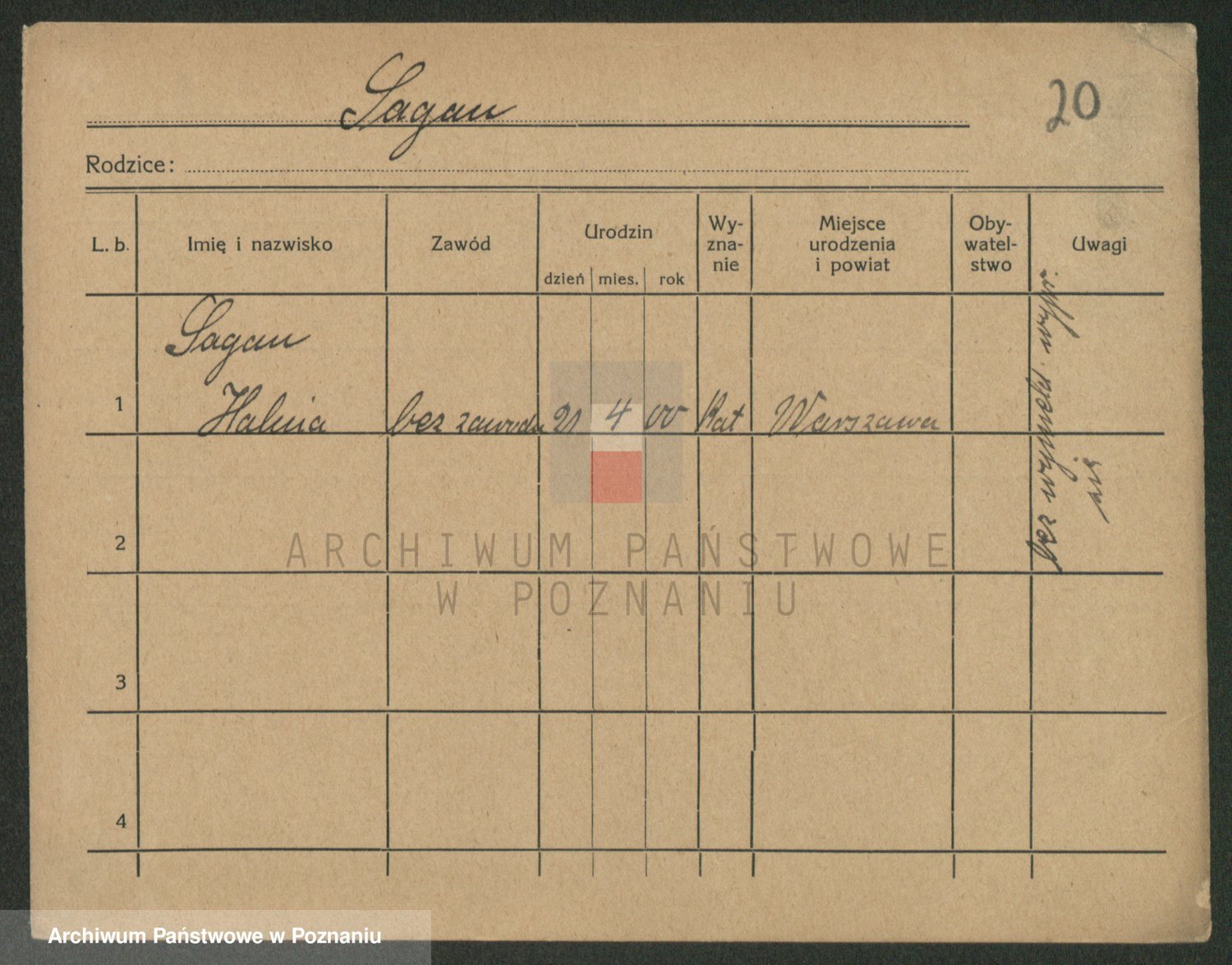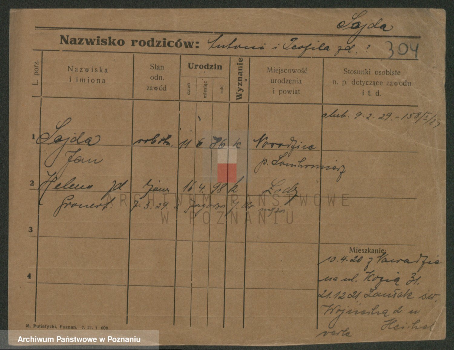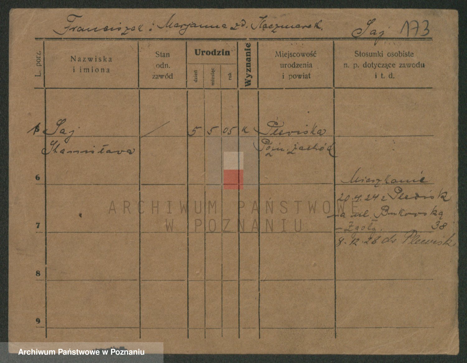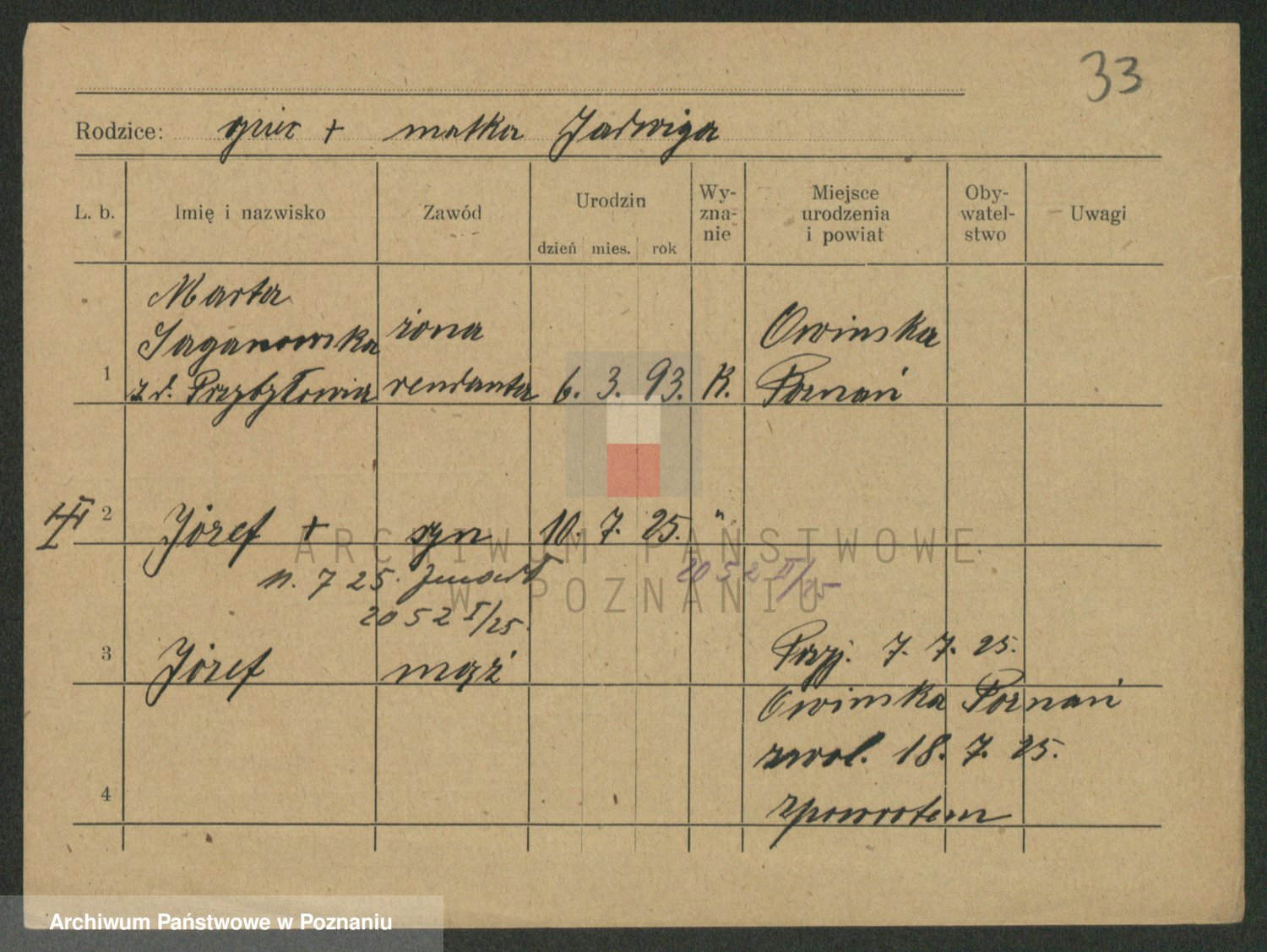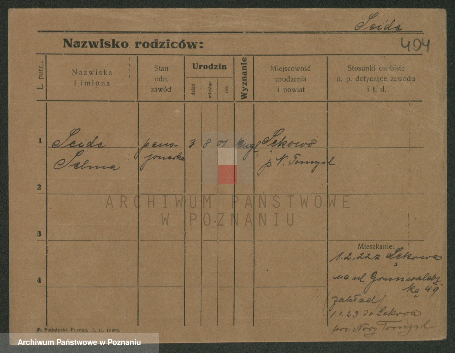 Podgląd karty osobowej dostępny jest po kliknięciu na nazwisko lub ikonkę karty. Można dokonywać powiększenia (ikony na górze) lub przechodzić między kolejnymi skanami (strzałki po bokach).