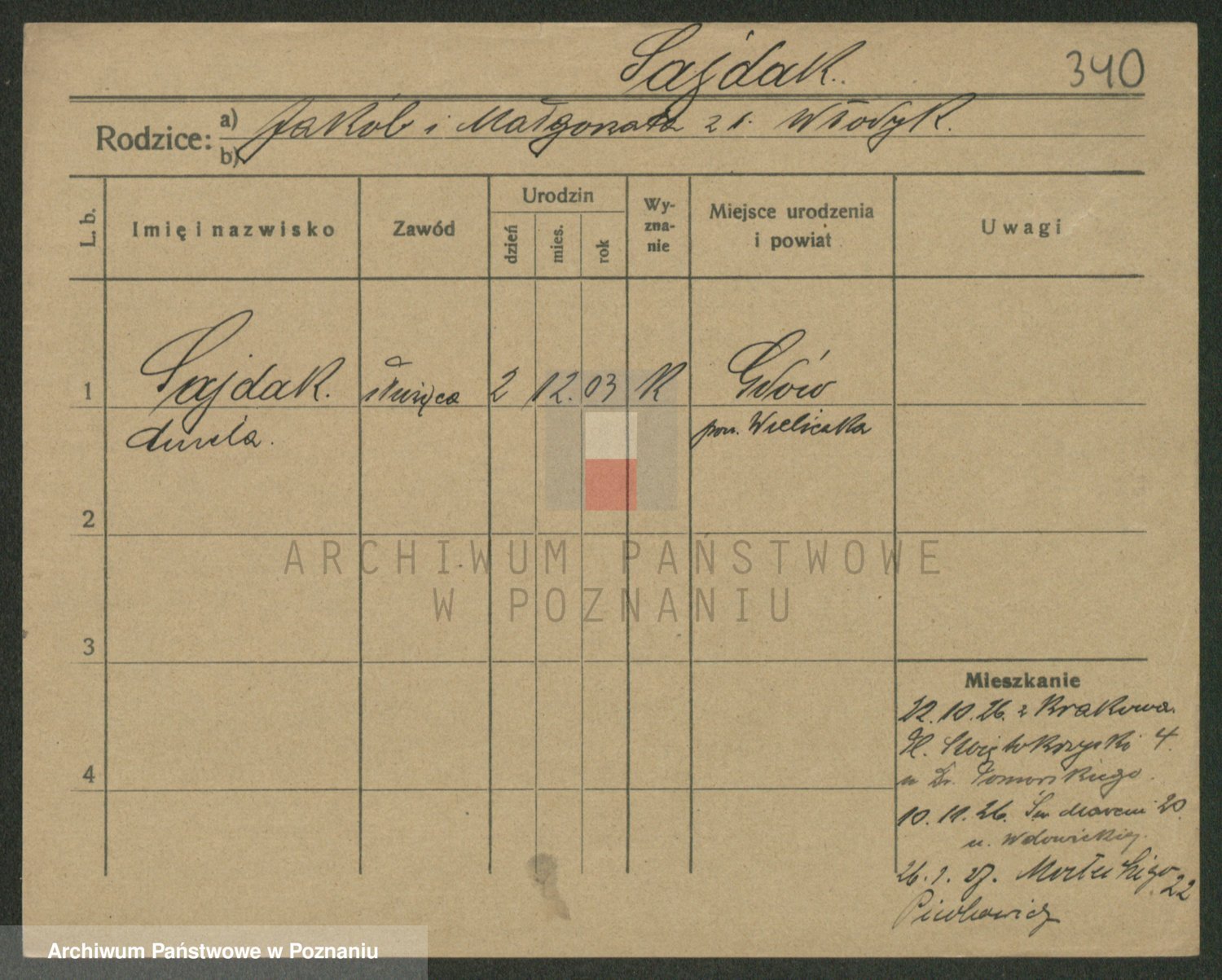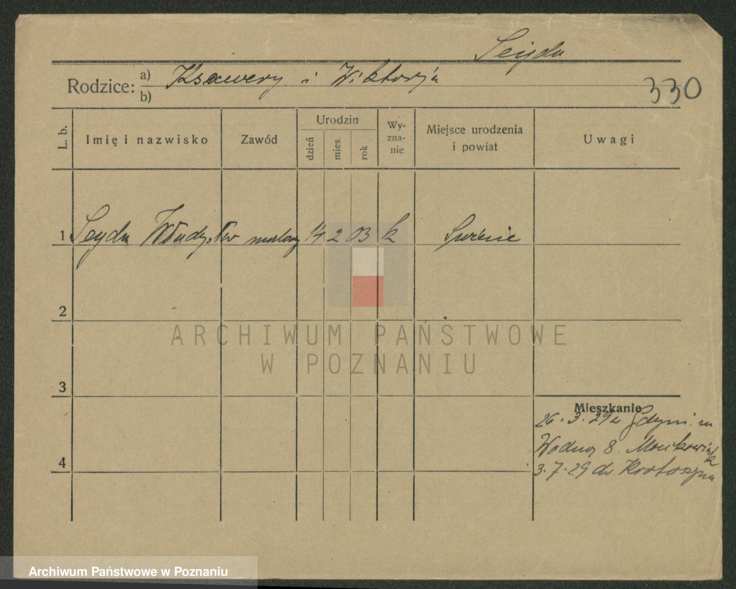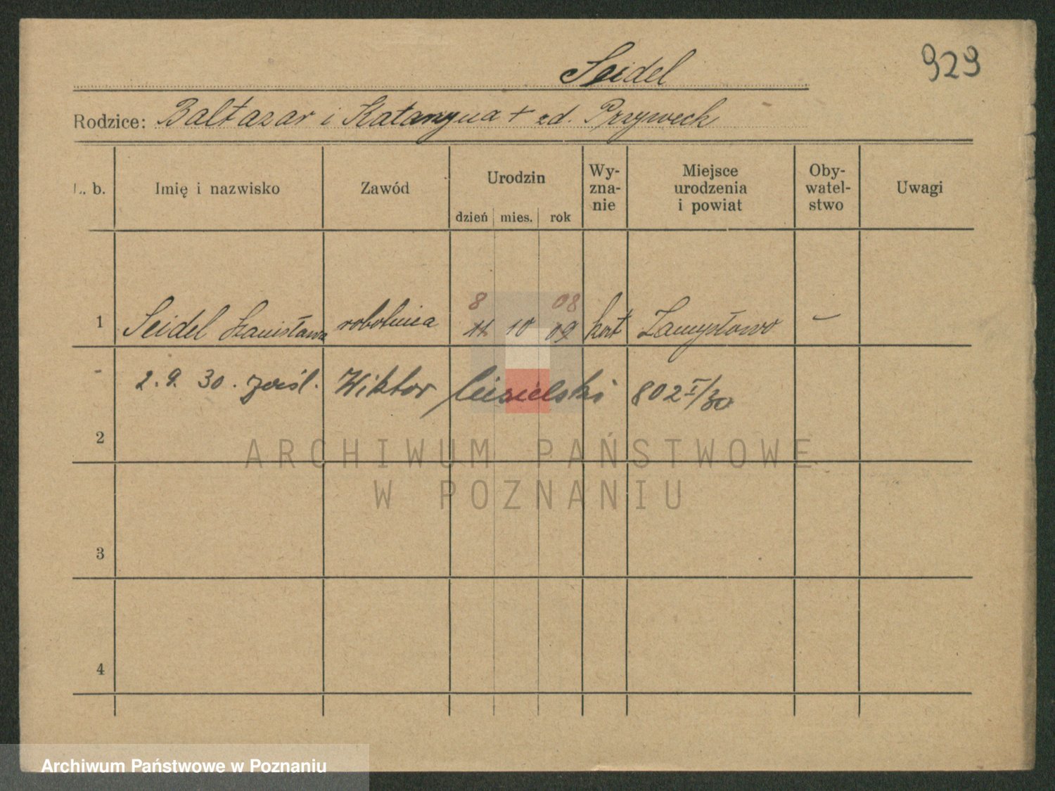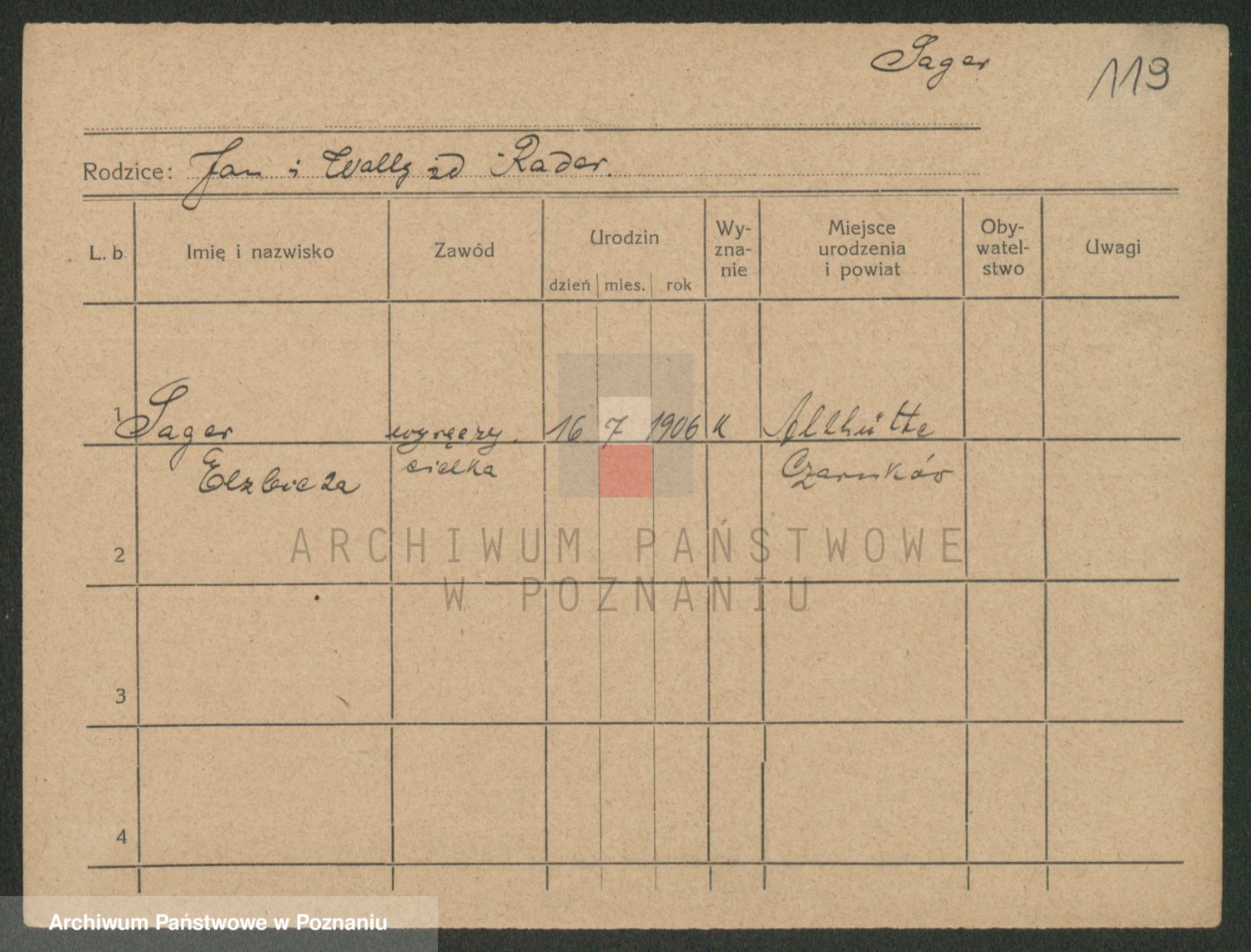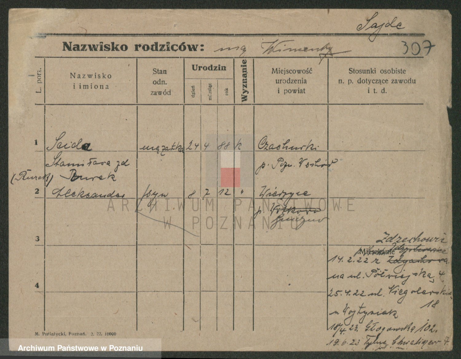 Podgląd karty osobowej dostępny jest po kliknięciu na nazwisko lub ikonkę karty. Można dokonywać powiększenia (ikony na górze) lub przechodzić między kolejnymi skanami (strzałki po bokach).