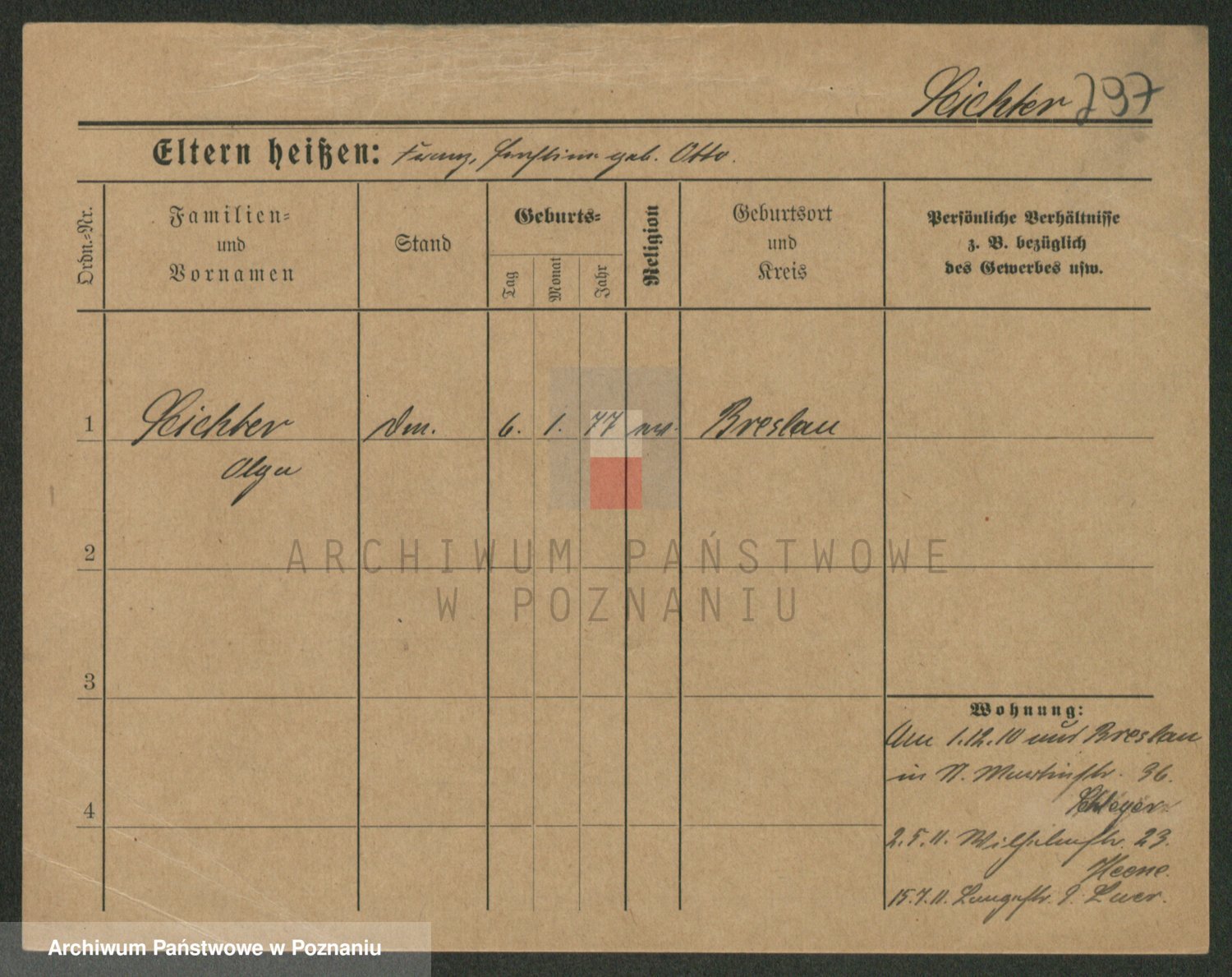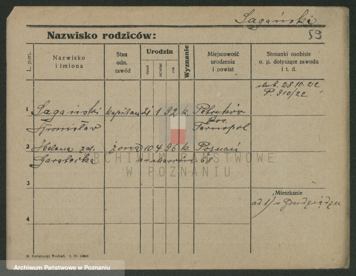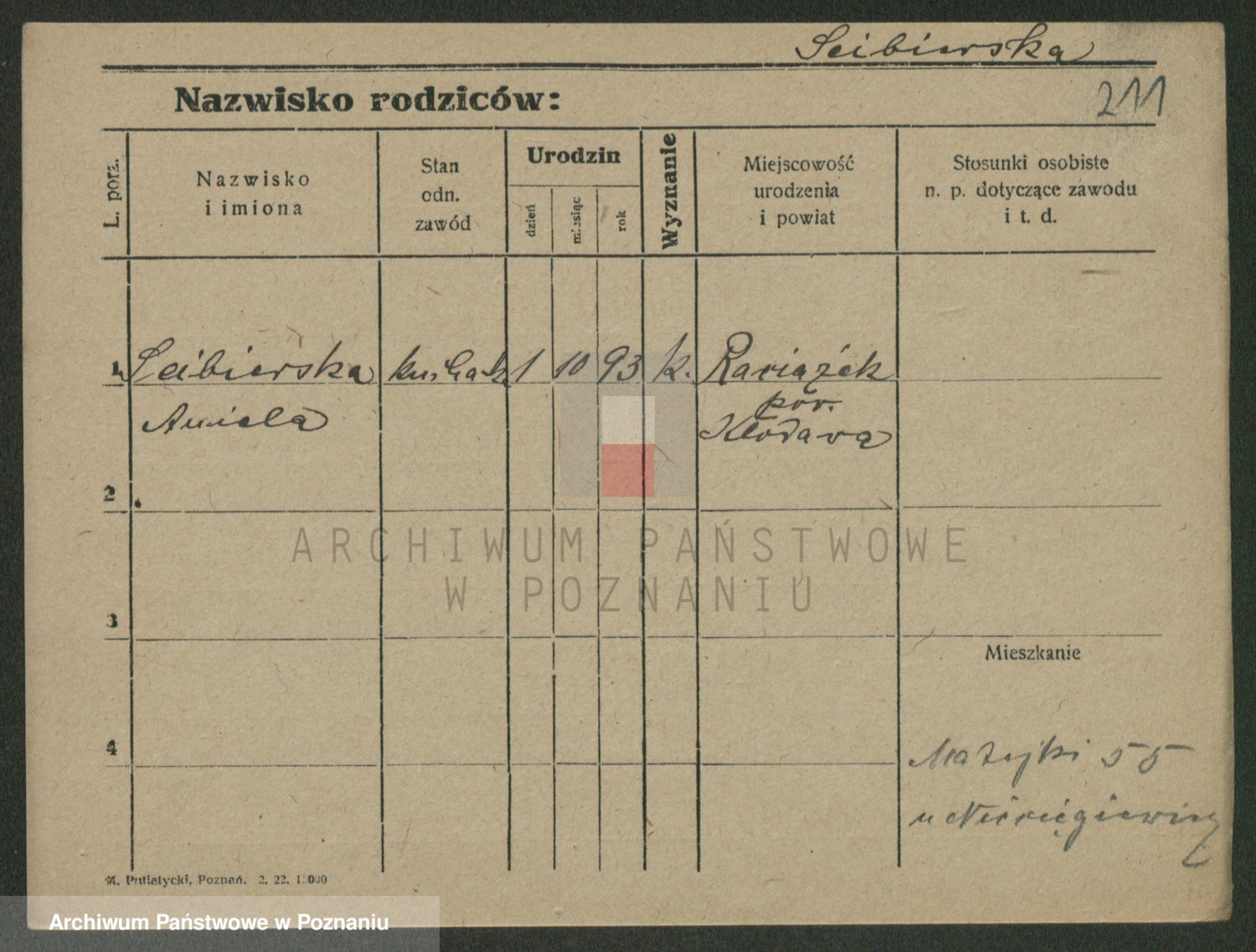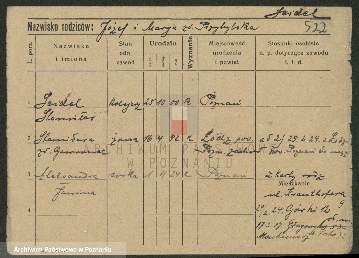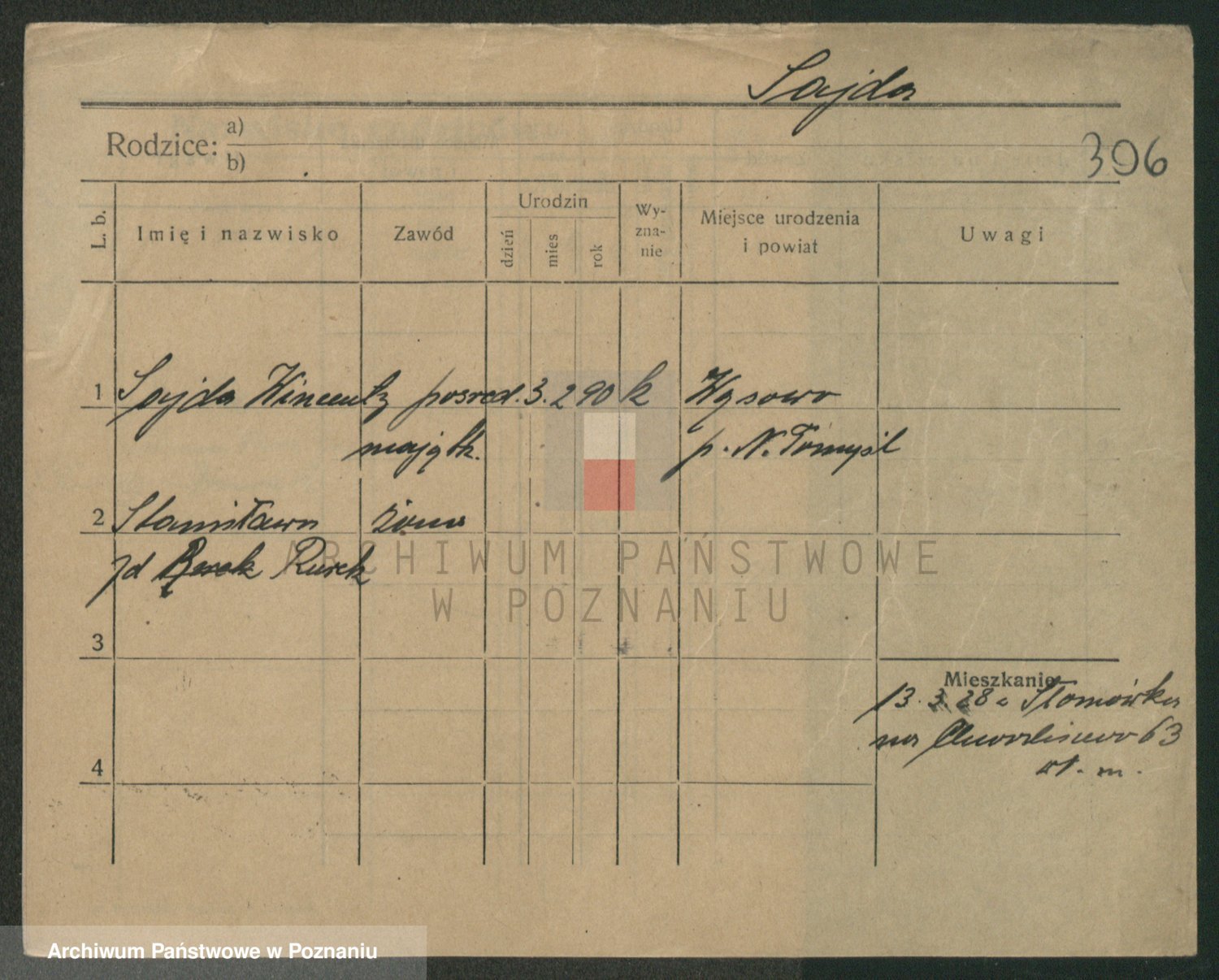 Podgląd karty osobowej dostępny jest po kliknięciu na nazwisko lub ikonkę karty. Można dokonywać powiększenia (ikony na górze) lub przechodzić między kolejnymi skanami (strzałki po bokach).