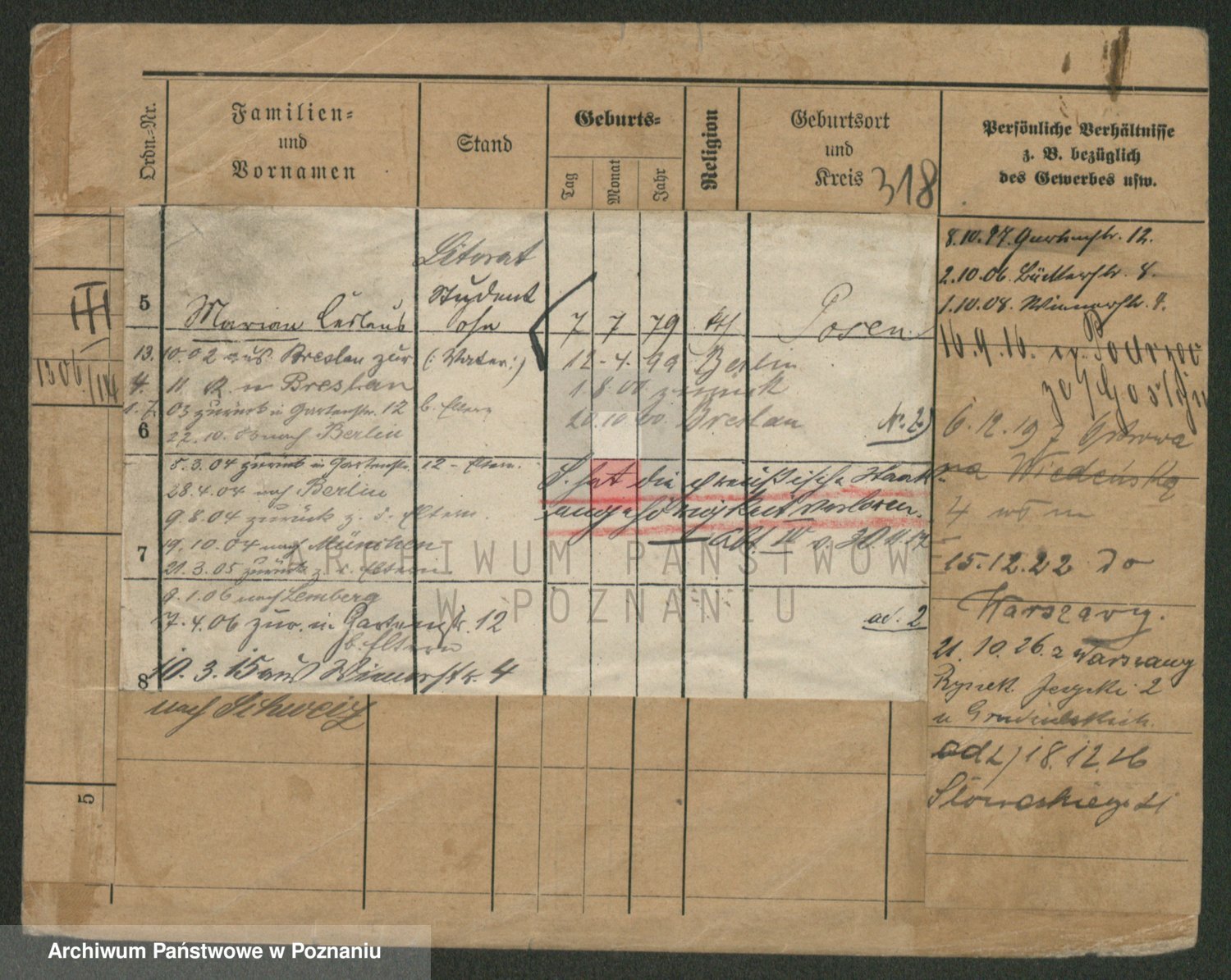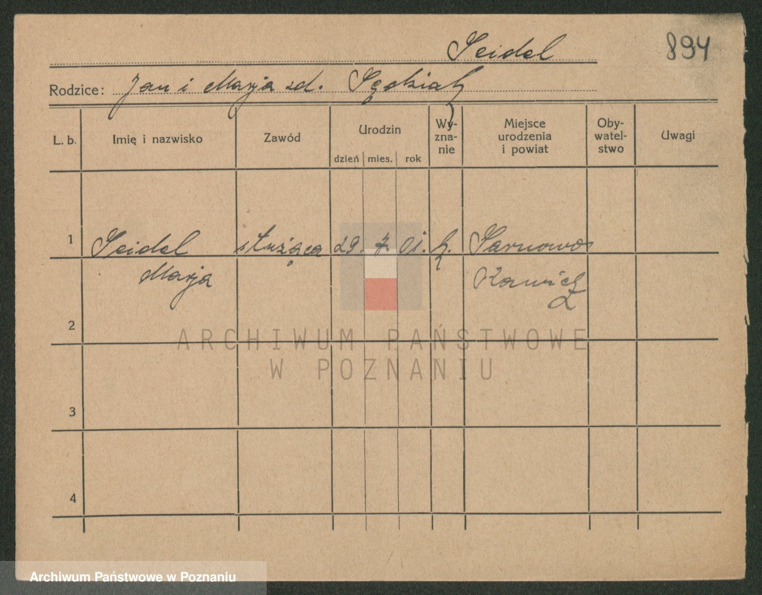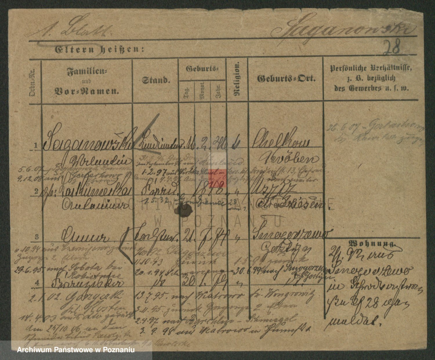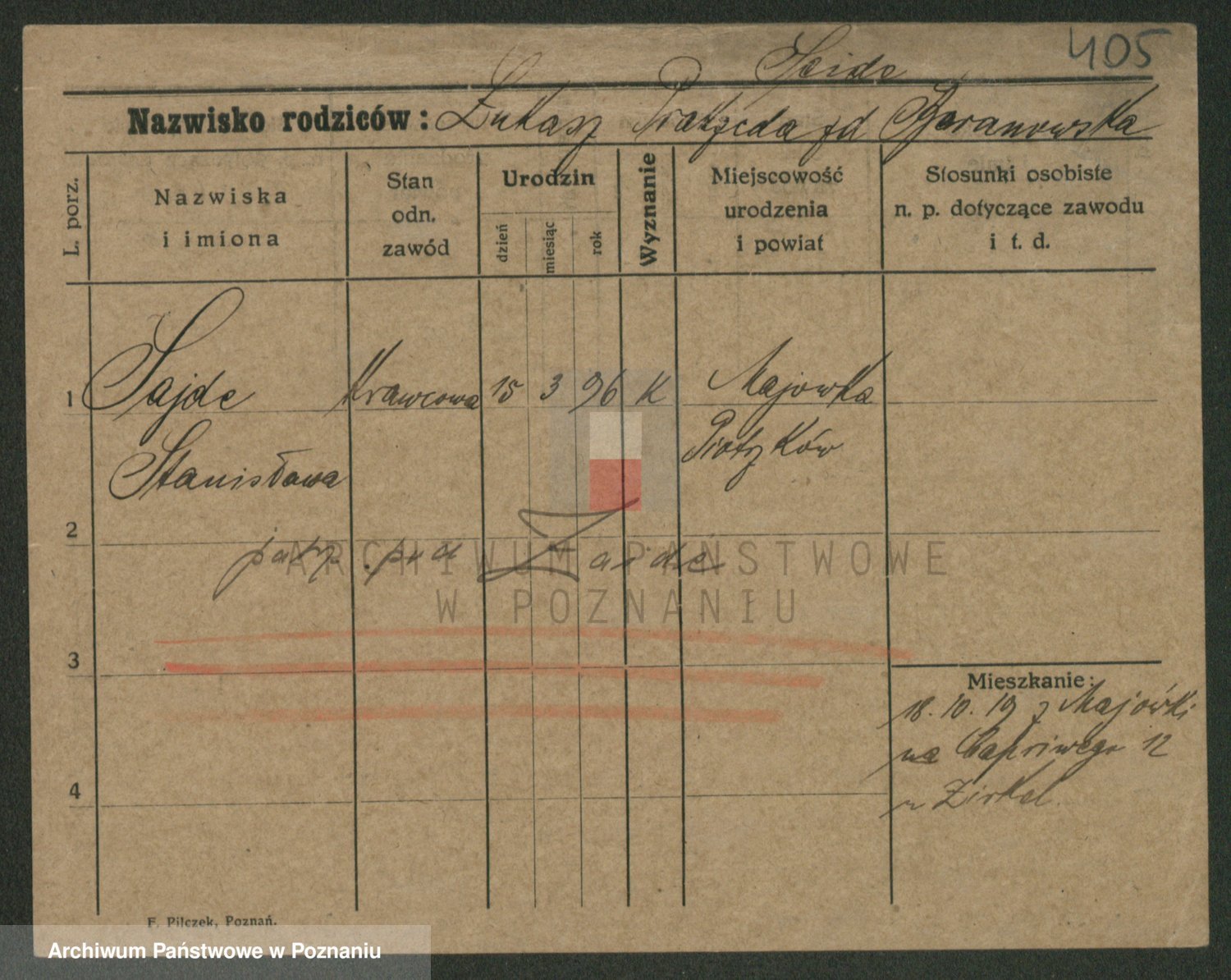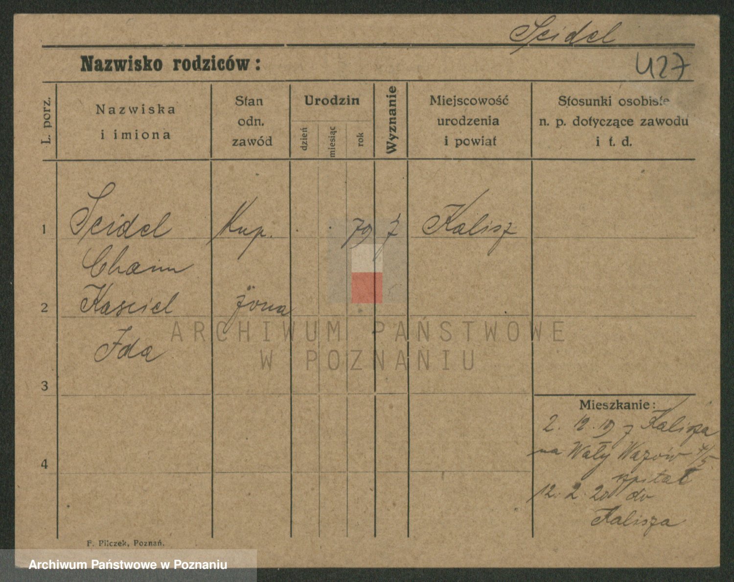 Podgląd karty osobowej dostępny jest po kliknięciu na nazwisko lub ikonkę karty. Można dokonywać powiększenia (ikony na górze) lub przechodzić między kolejnymi skanami (strzałki po bokach).