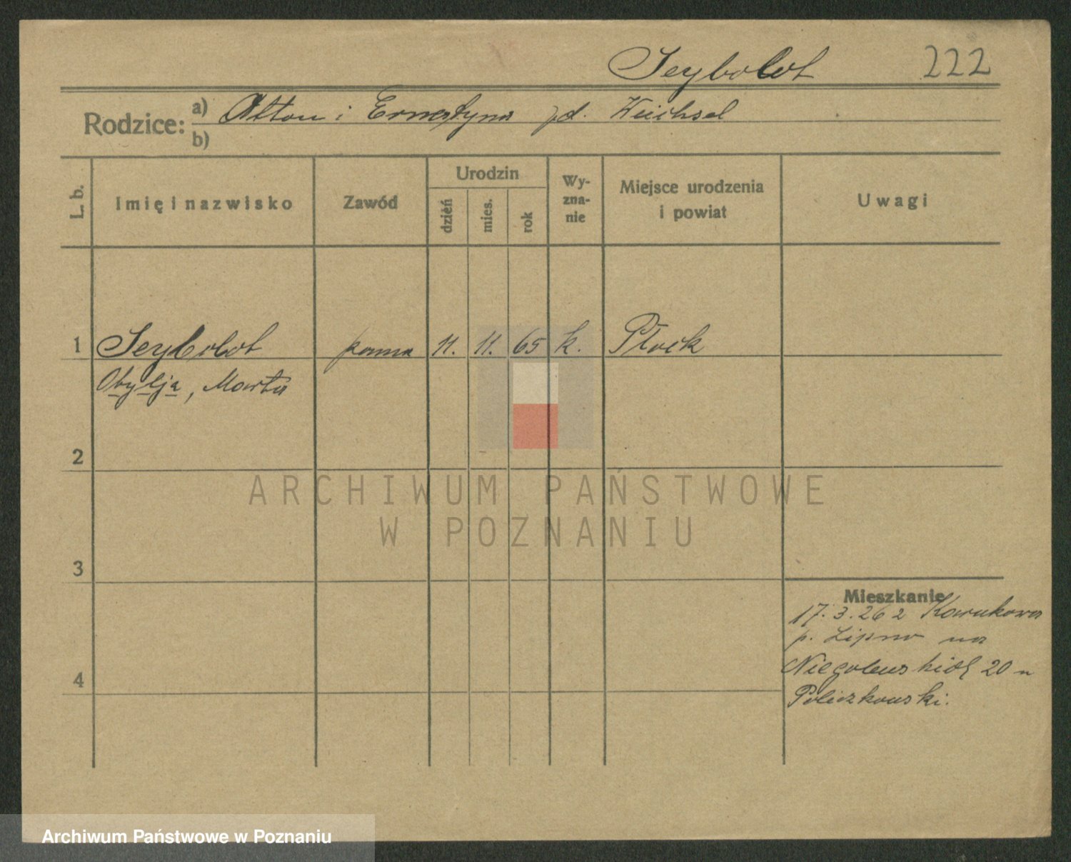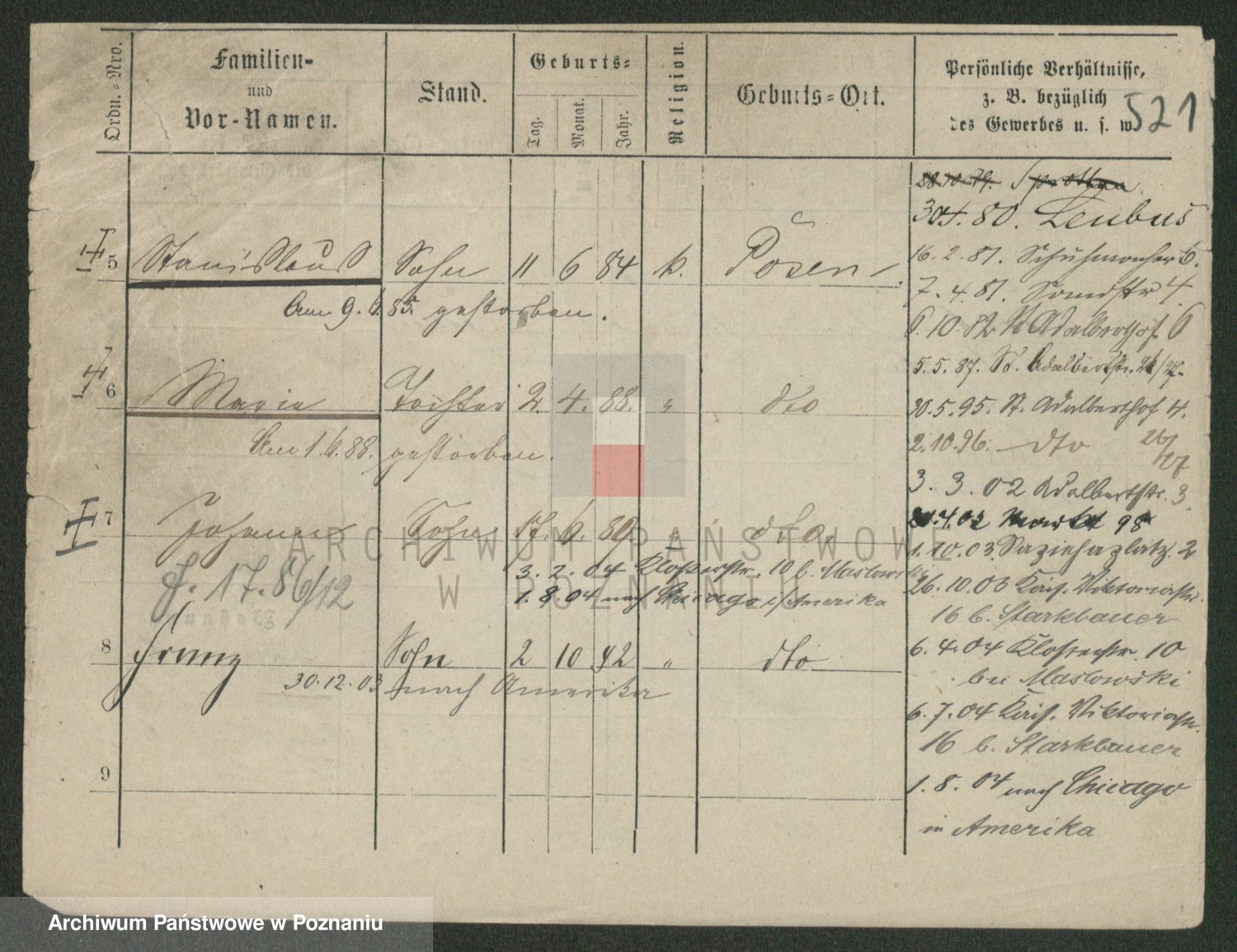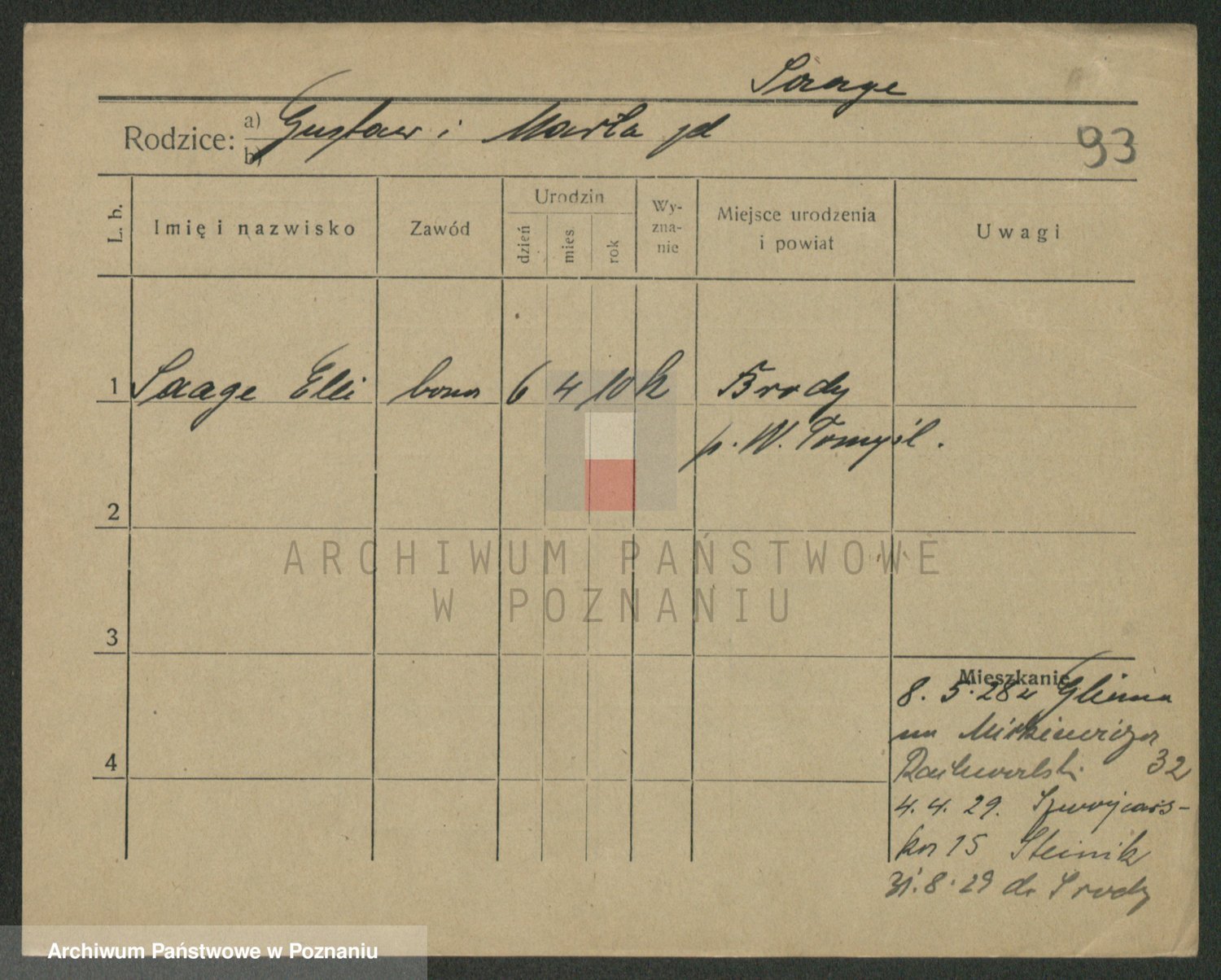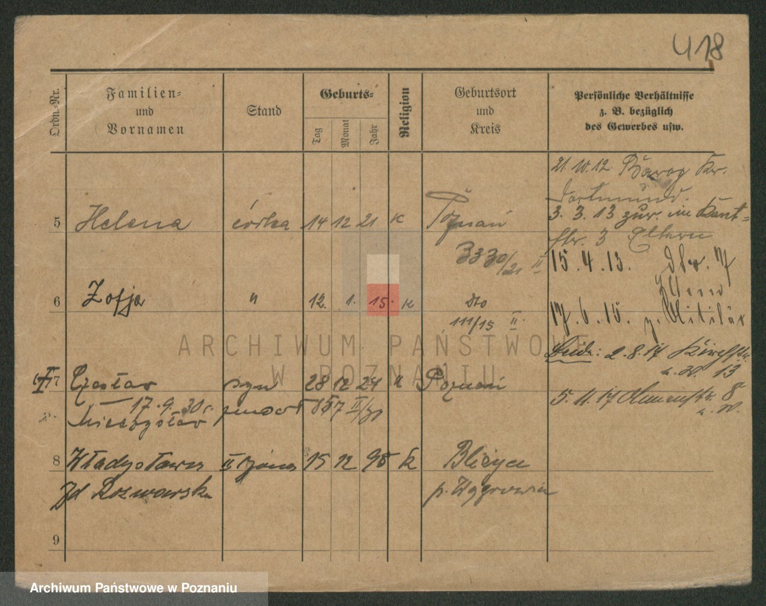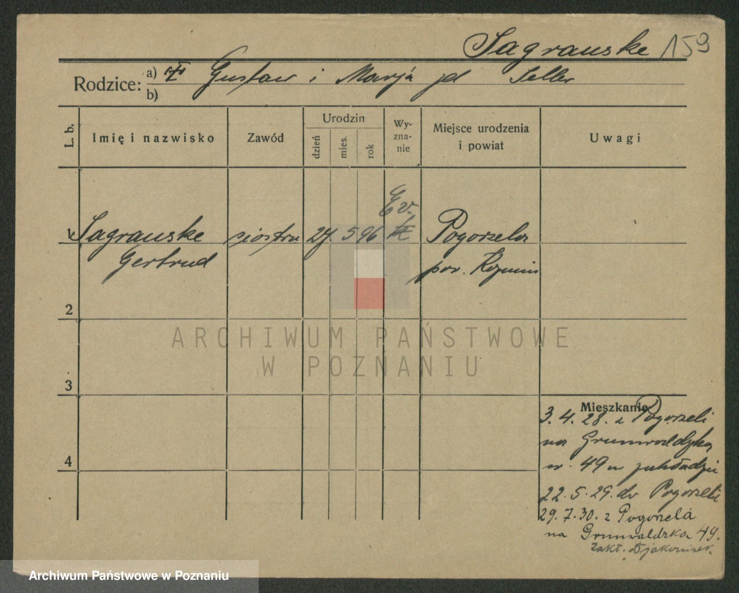 Podgląd karty osobowej dostępny jest po kliknięciu na nazwisko lub ikonkę karty. Można dokonywać powiększenia (ikony na górze) lub przechodzić między kolejnymi skanami (strzałki po bokach).