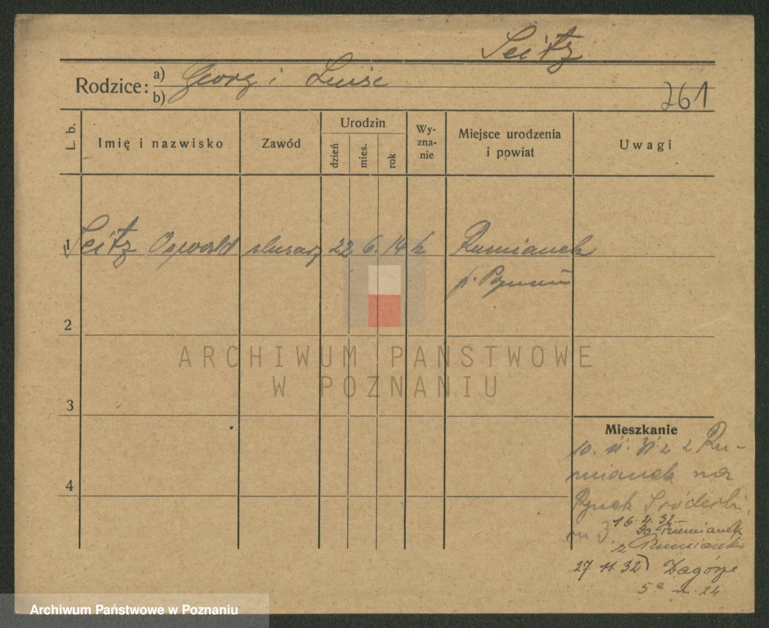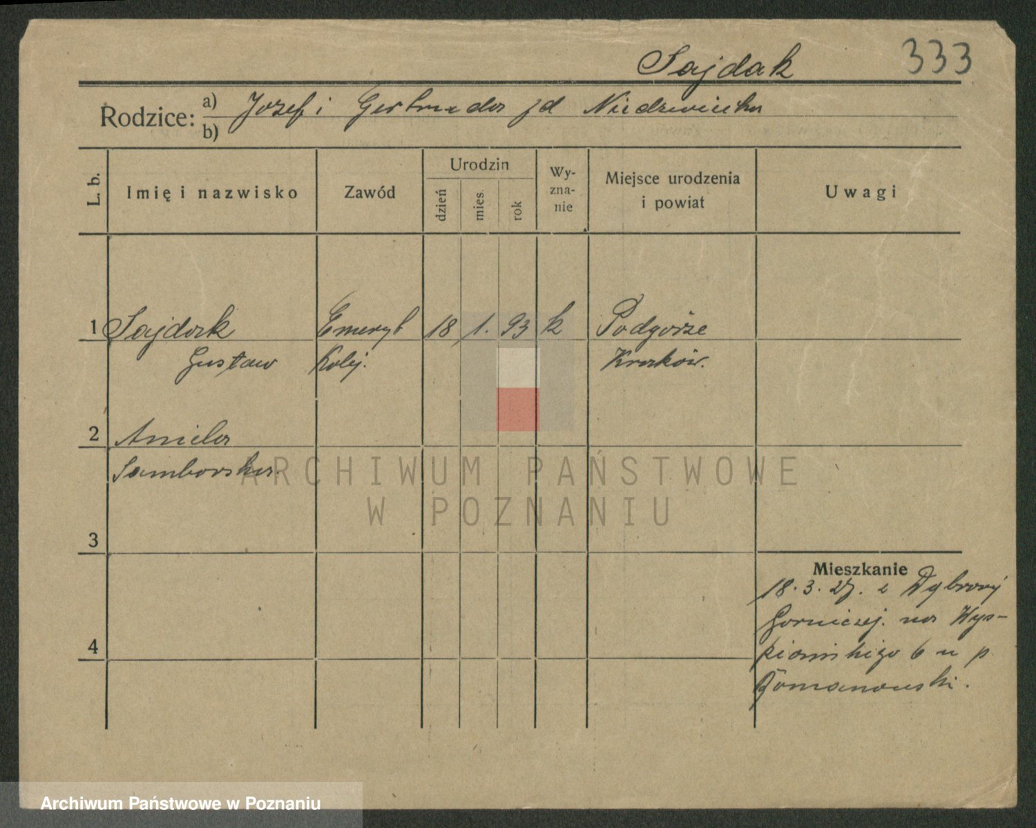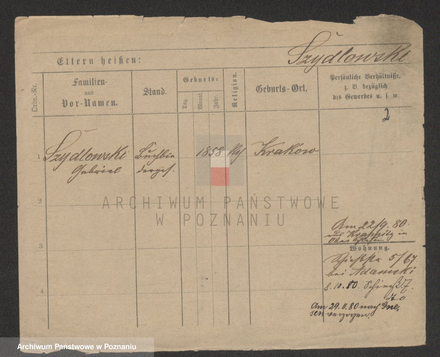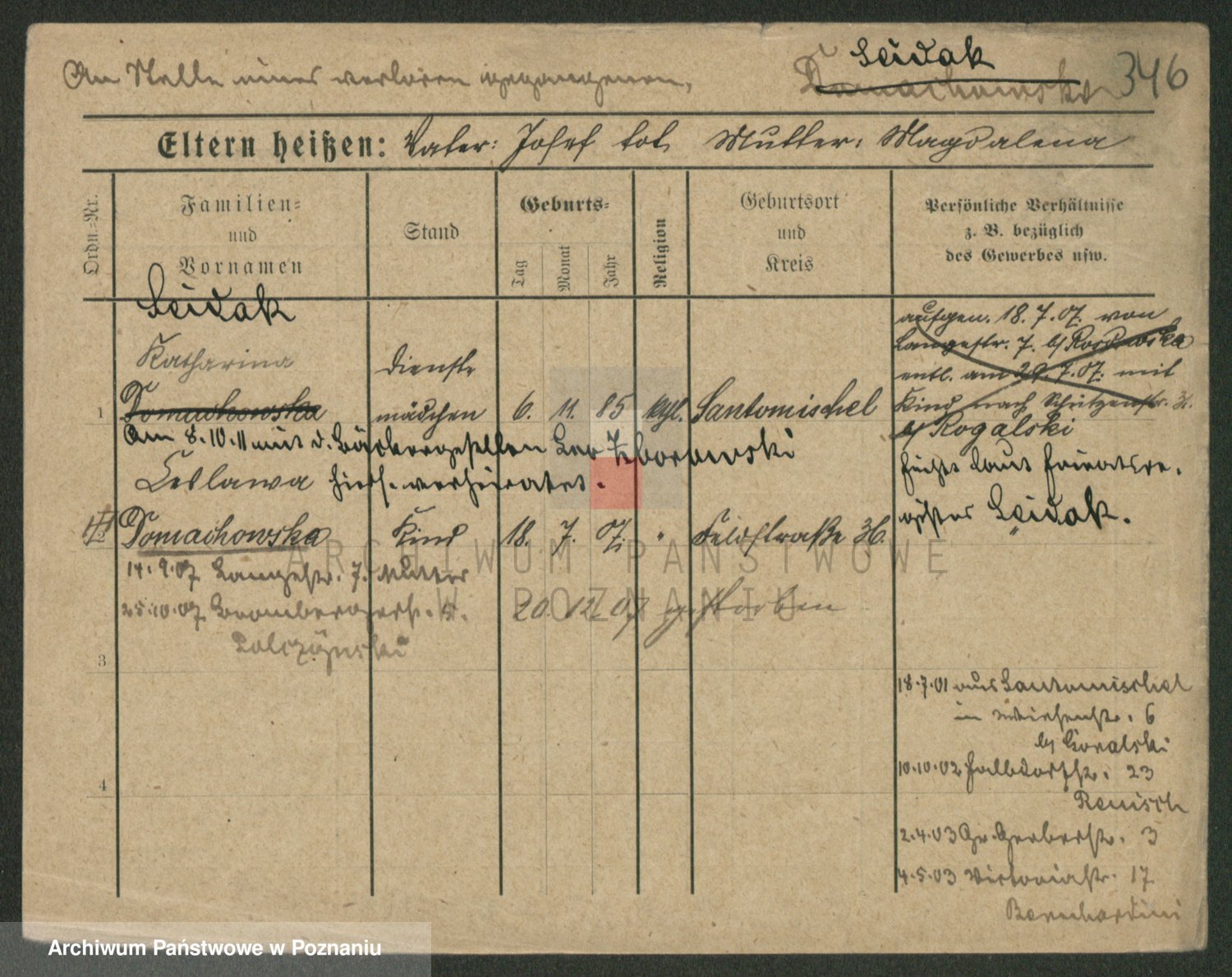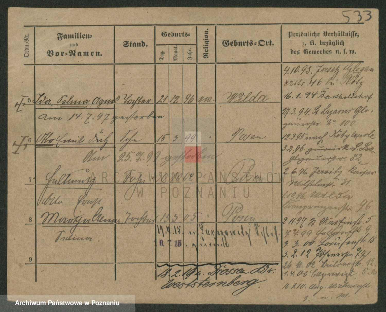 Podgląd karty osobowej dostępny jest po kliknięciu na nazwisko lub ikonkę karty. Można dokonywać powiększenia (ikony na górze) lub przechodzić między kolejnymi skanami (strzałki po bokach).