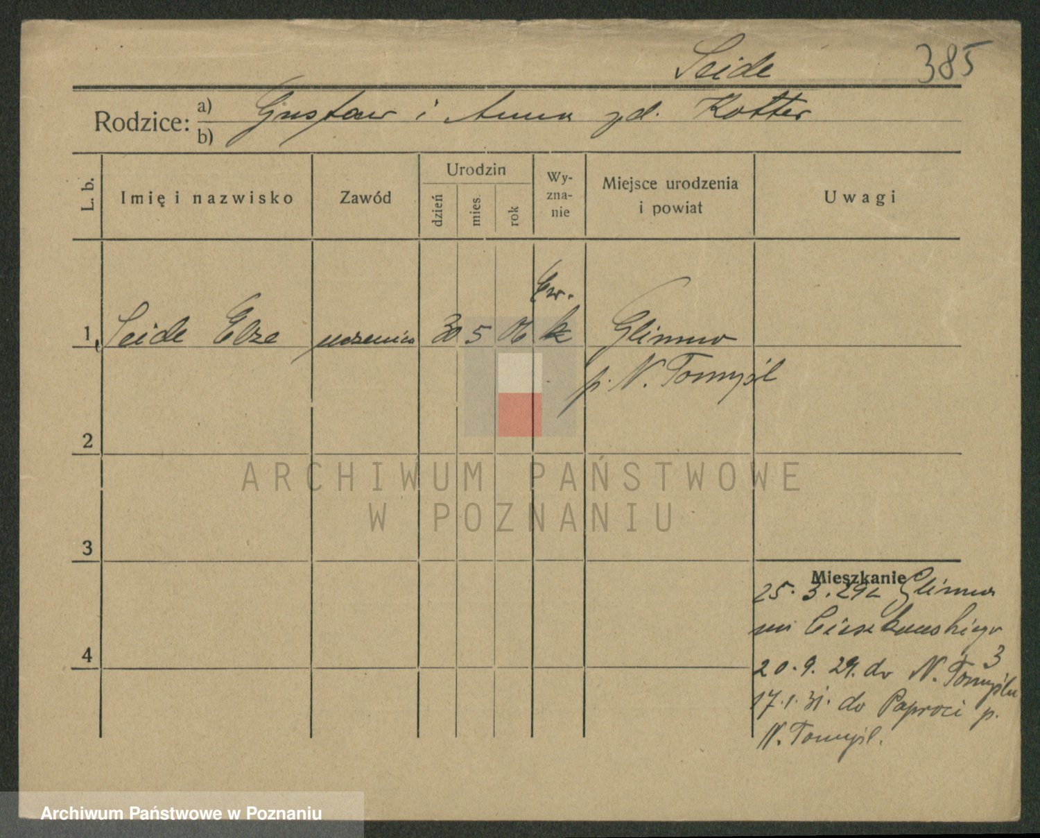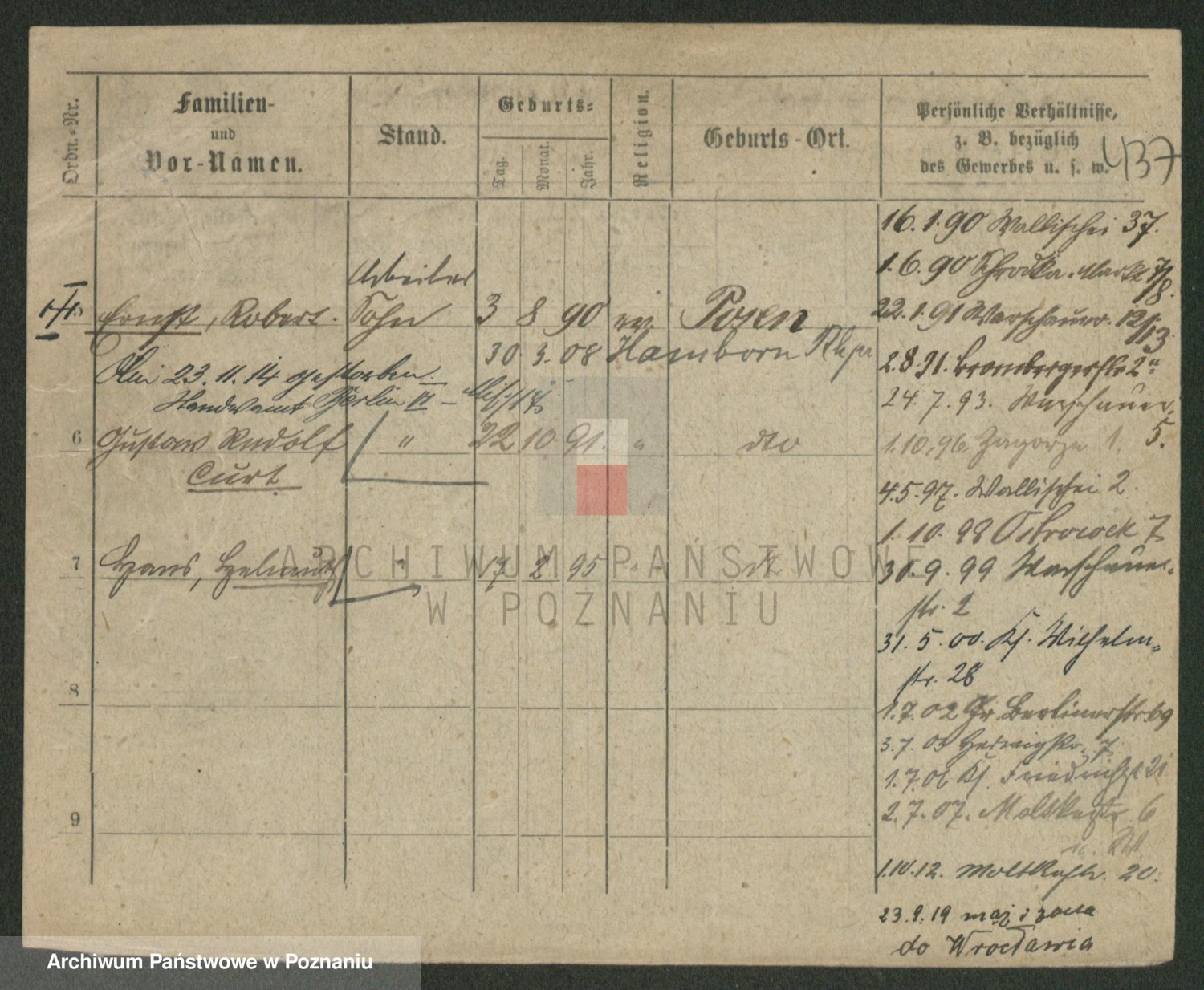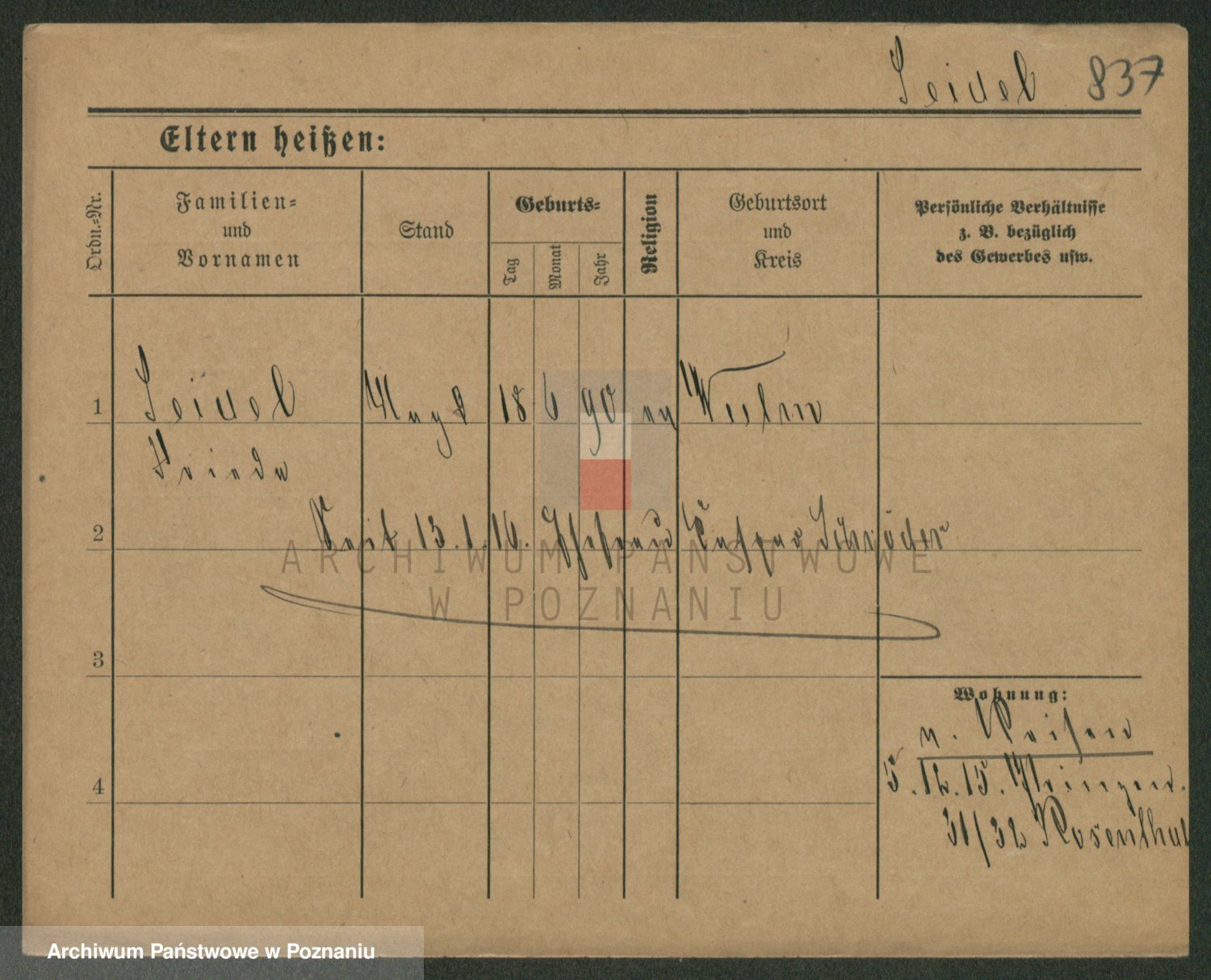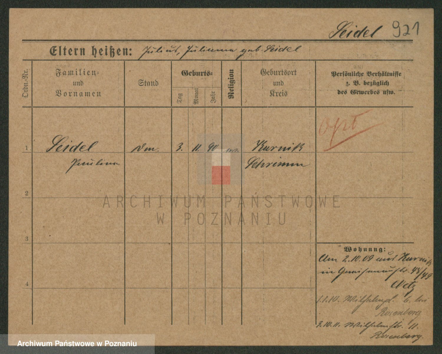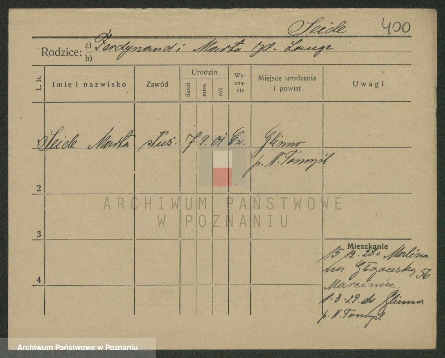 Podgląd karty osobowej dostępny jest po kliknięciu na nazwisko lub ikonkę karty. Można dokonywać powiększenia (ikony na górze) lub przechodzić między kolejnymi skanami (strzałki po bokach).