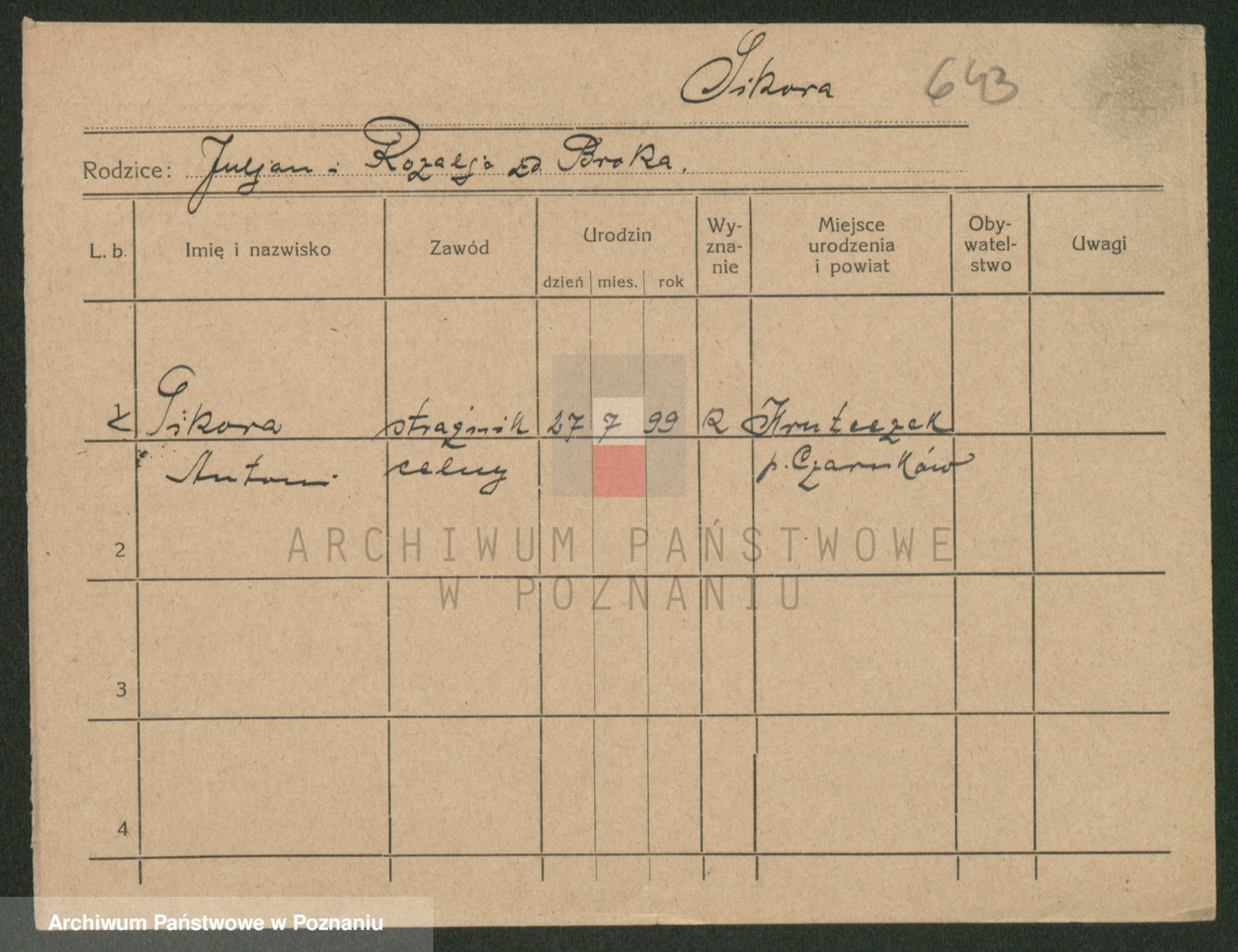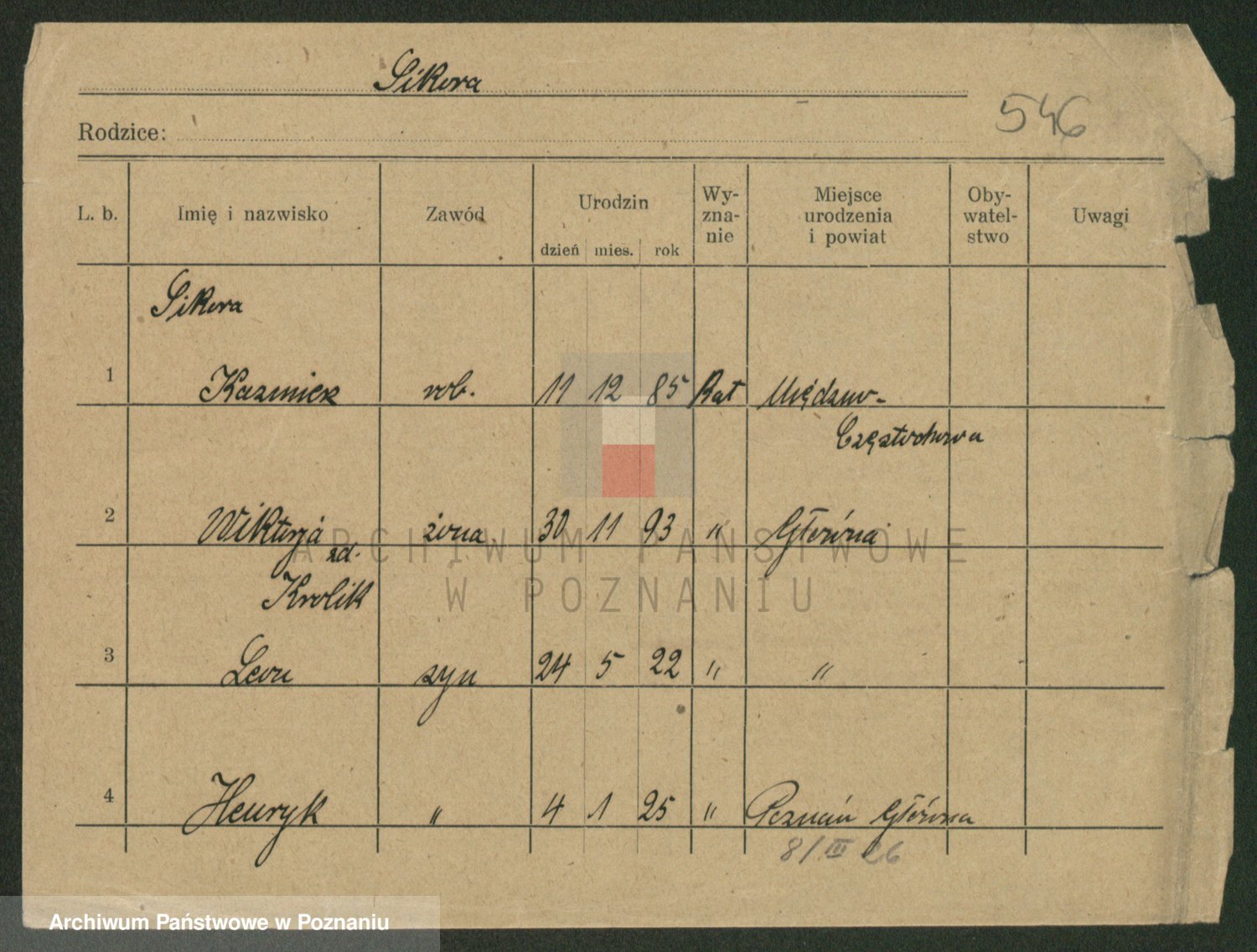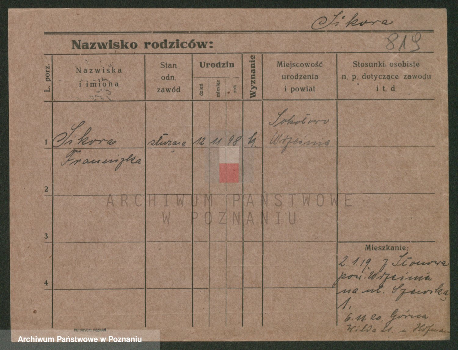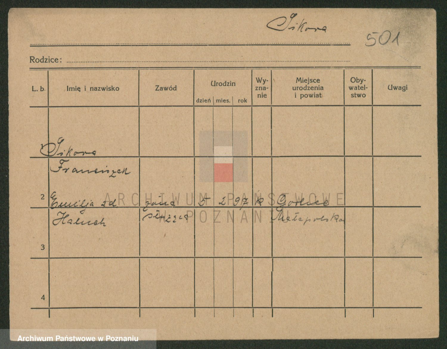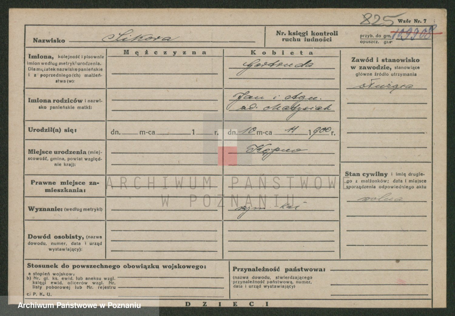 Podgląd karty osobowej dostępny jest po kliknięciu na nazwisko lub ikonkę karty. Można dokonywać powiększenia (ikony na górze) lub przechodzić między kolejnymi skanami (strzałki po bokach).