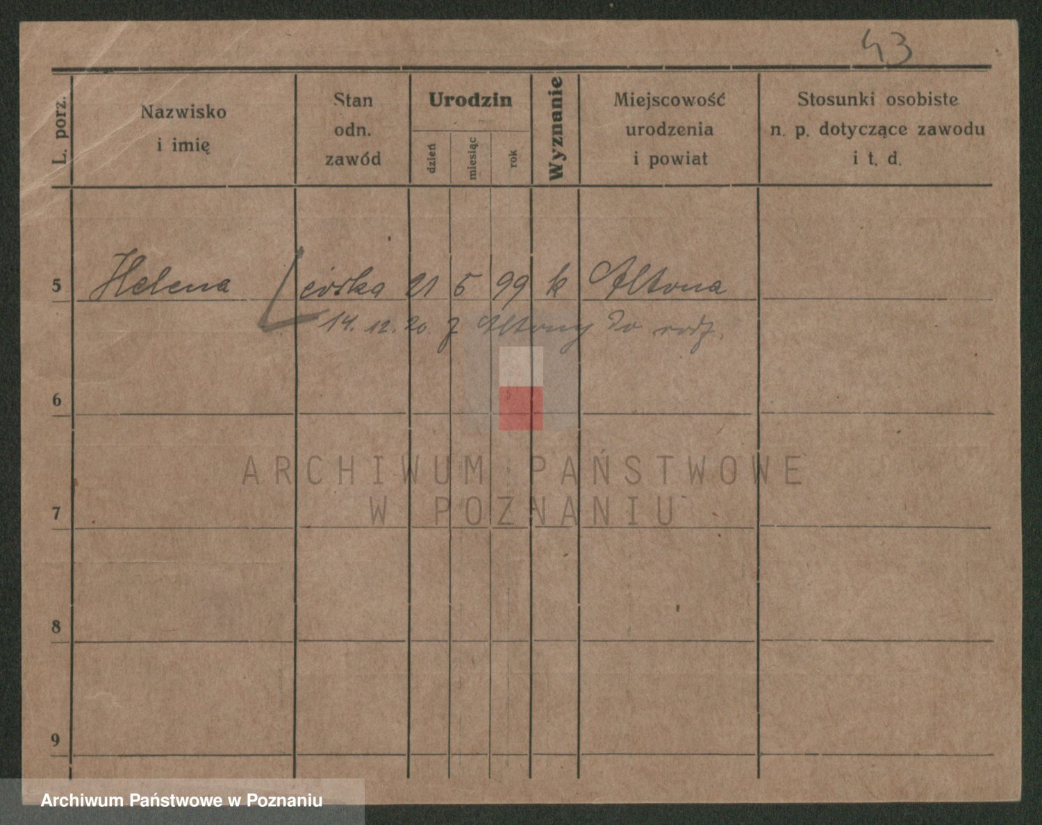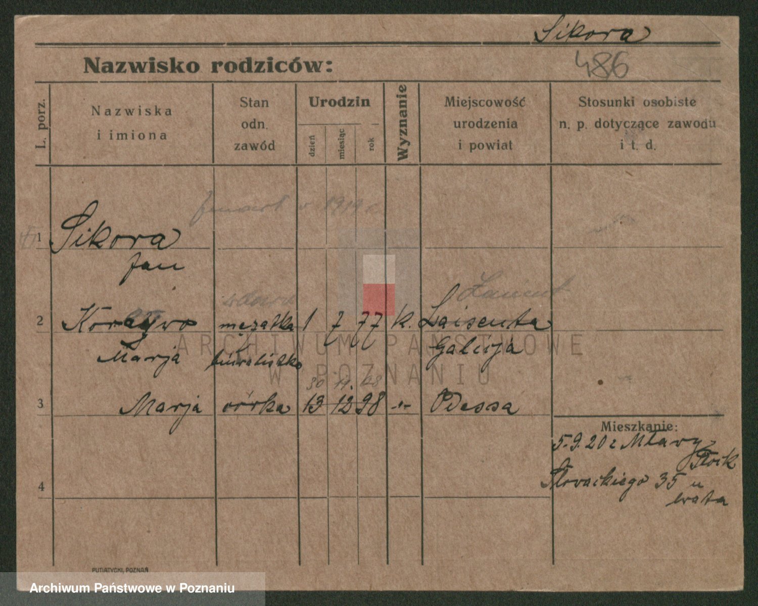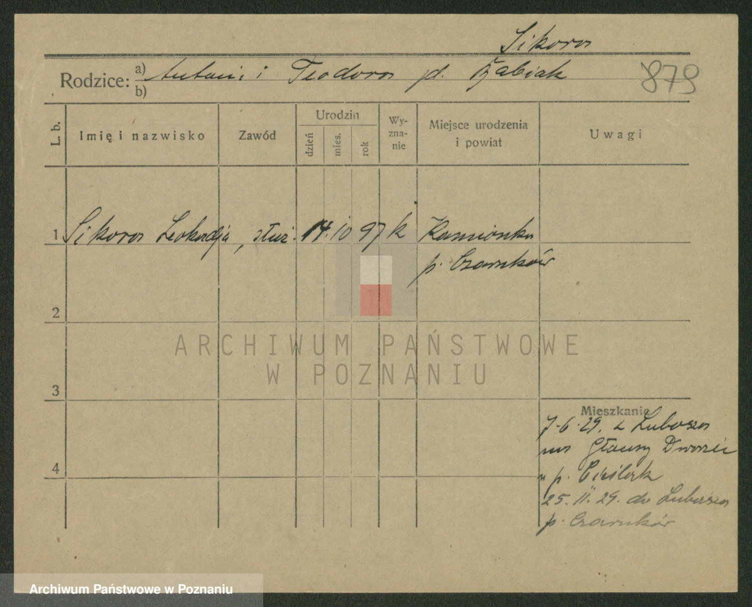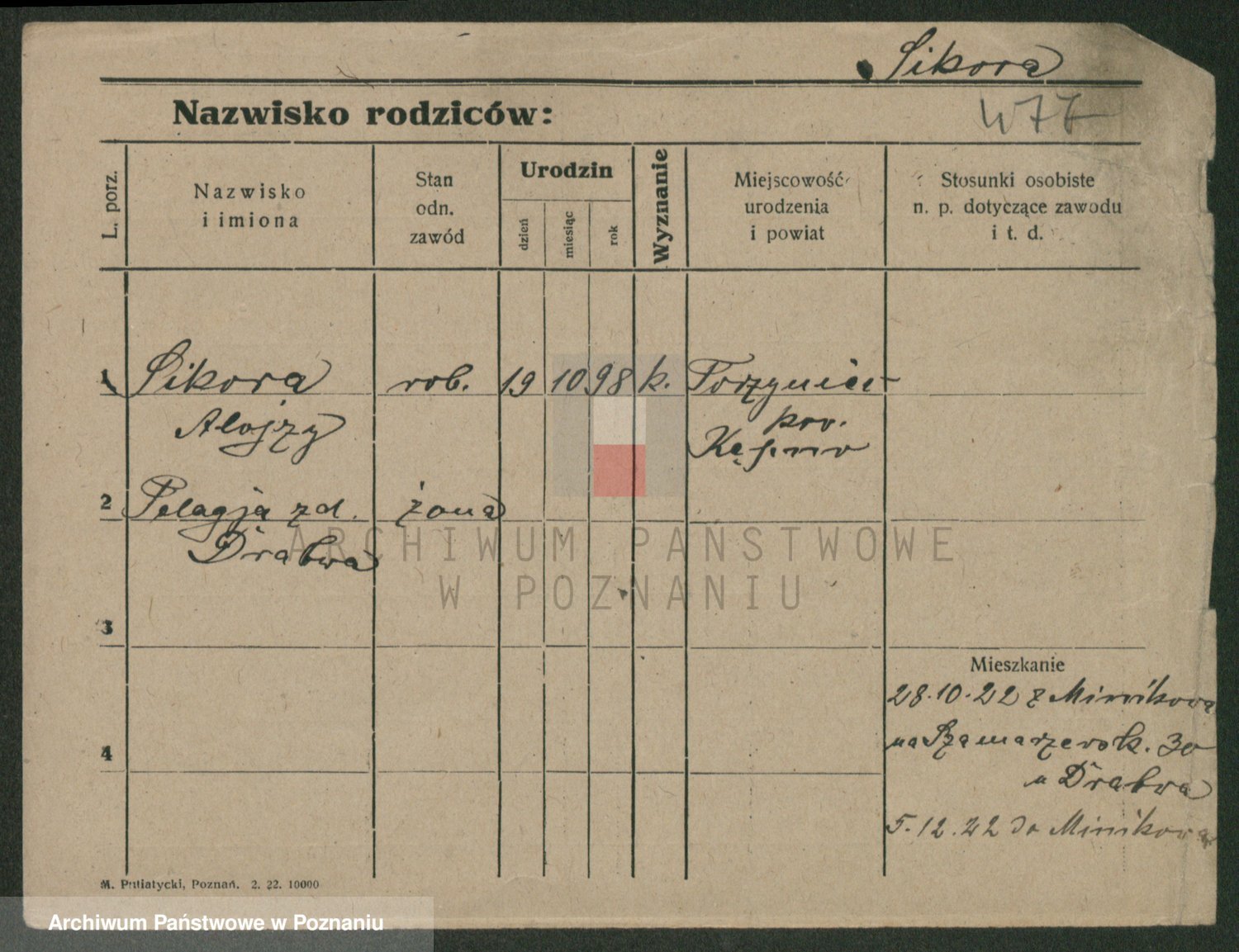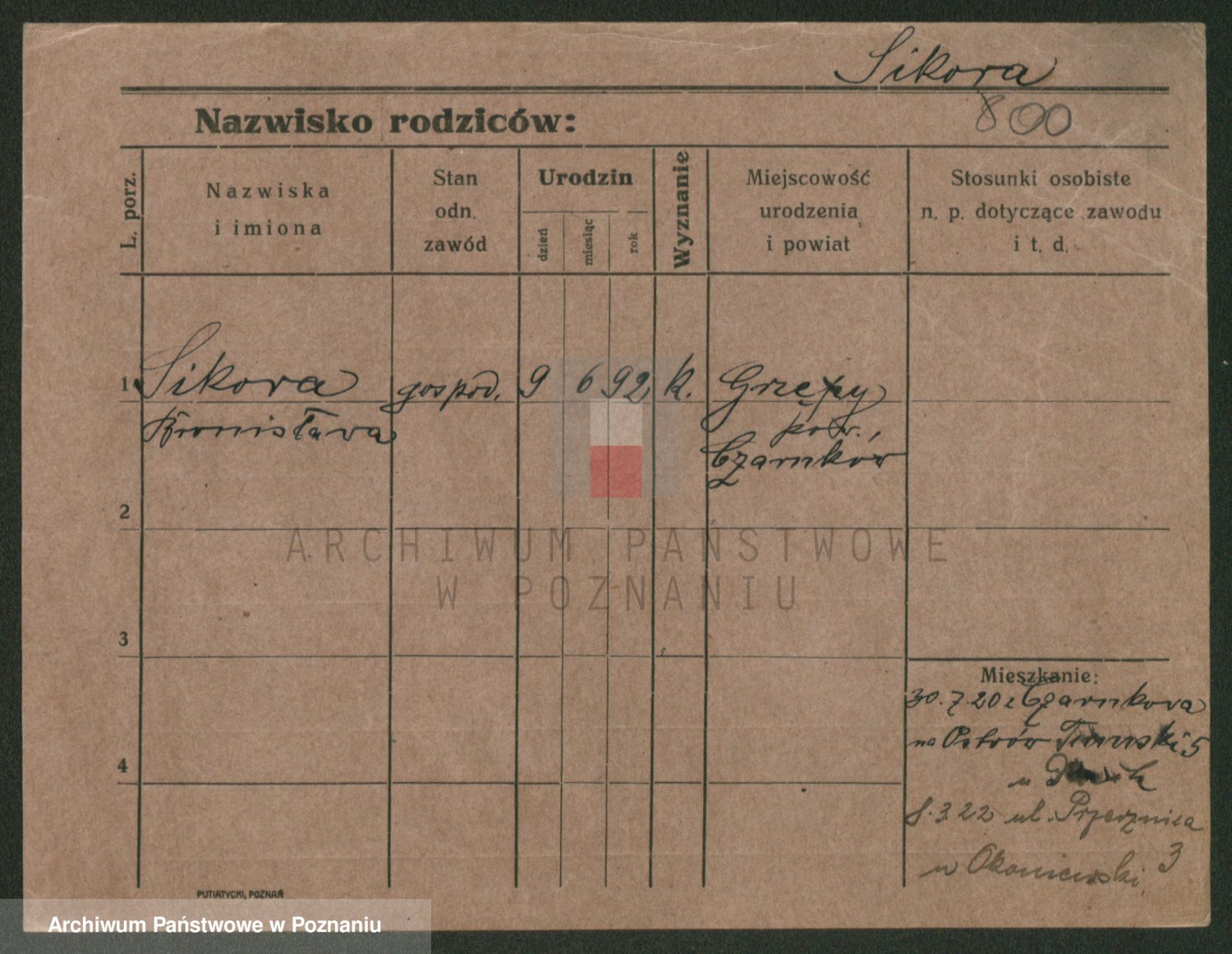 Podgląd karty osobowej dostępny jest po kliknięciu na nazwisko lub ikonkę karty. Można dokonywać powiększenia (ikony na górze) lub przechodzić między kolejnymi skanami (strzałki po bokach).
