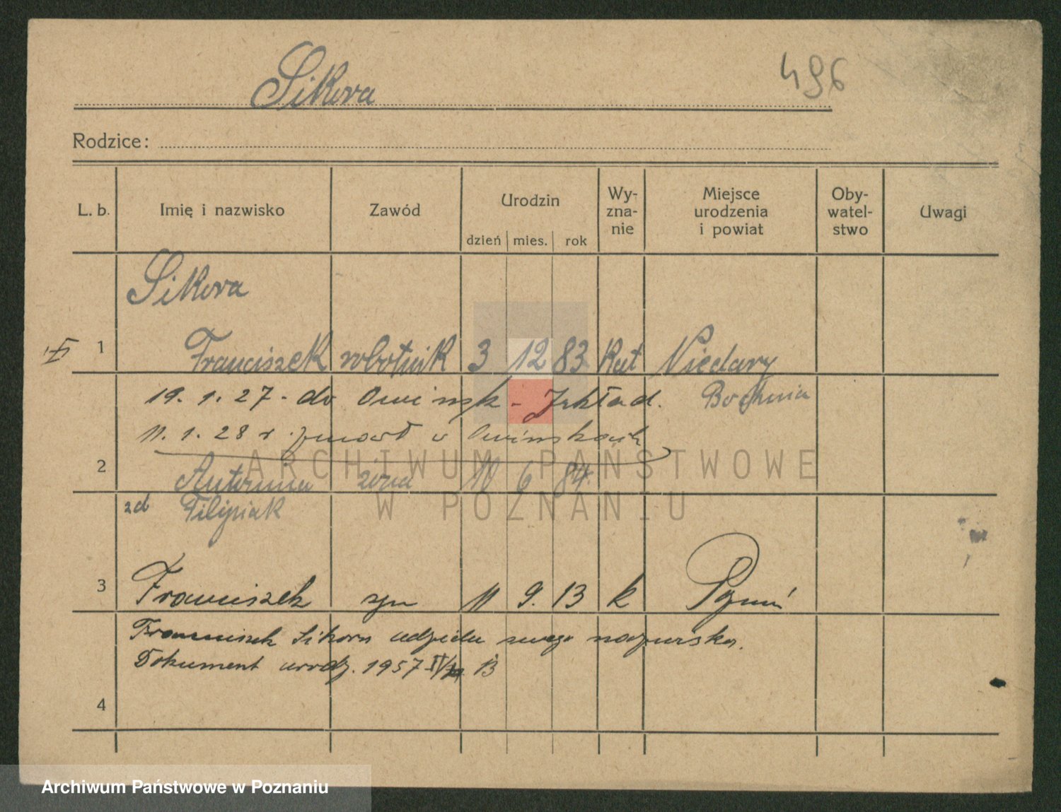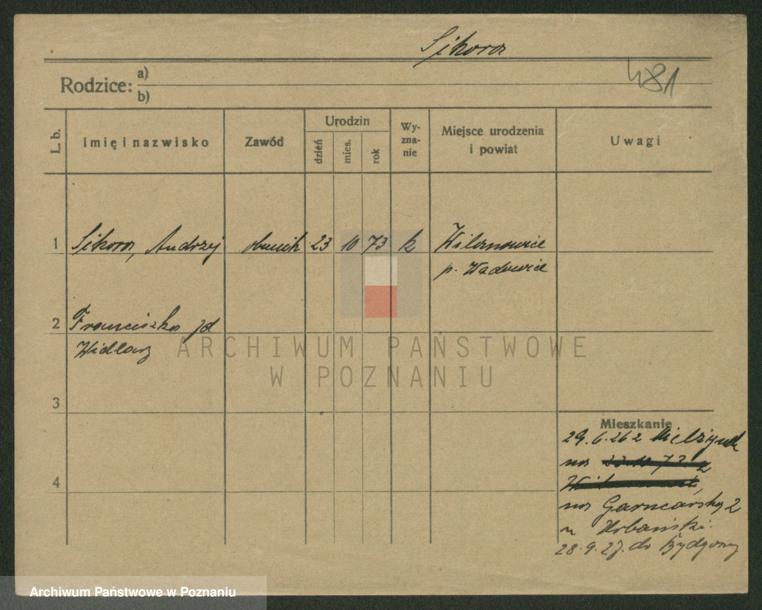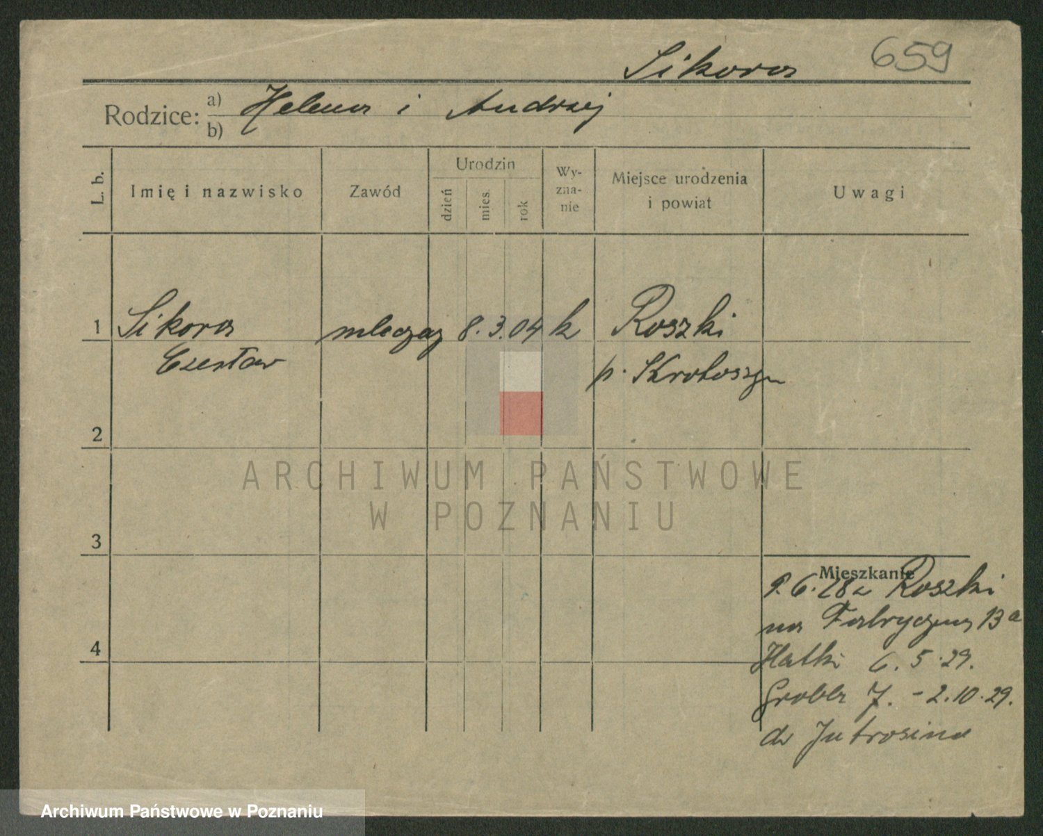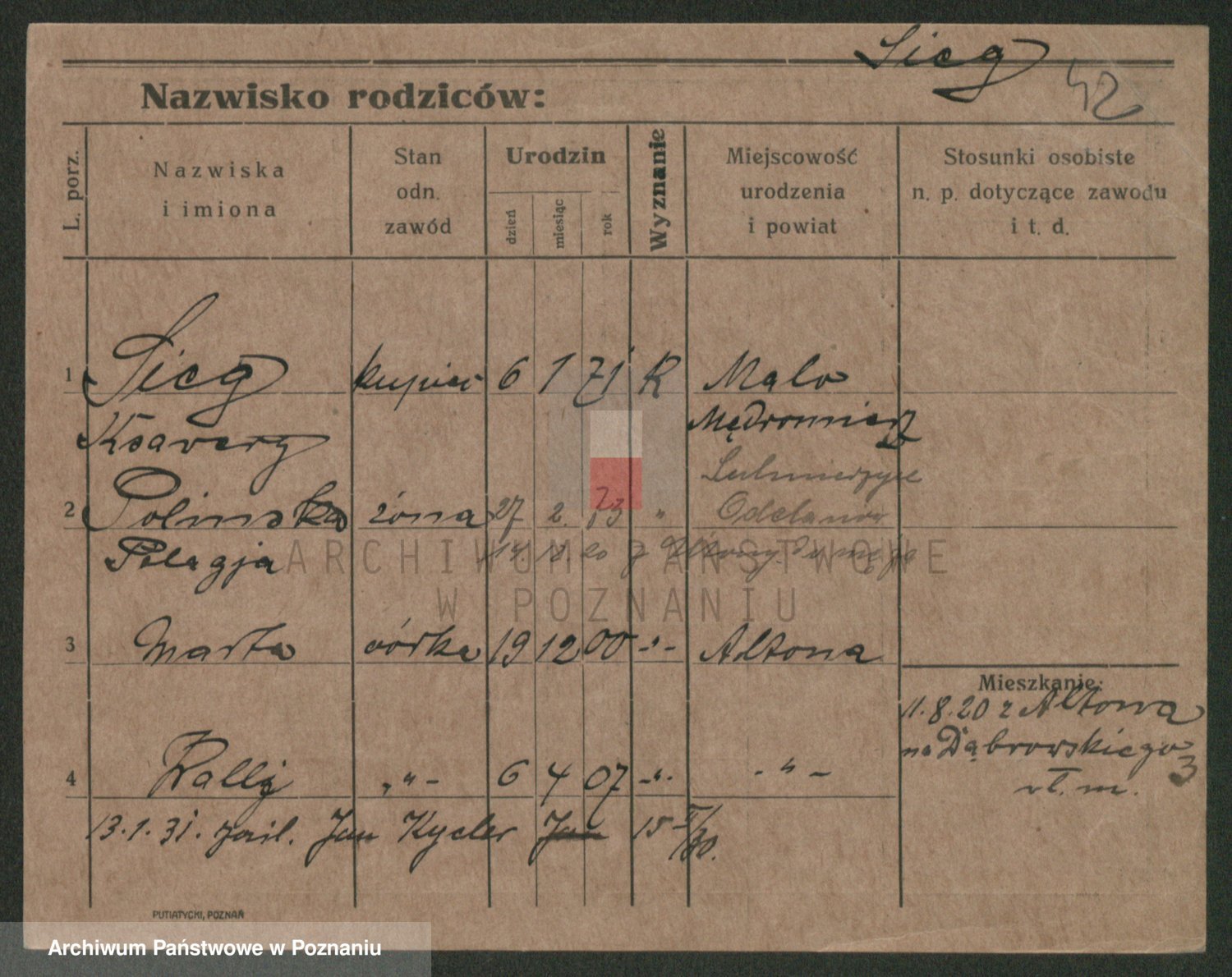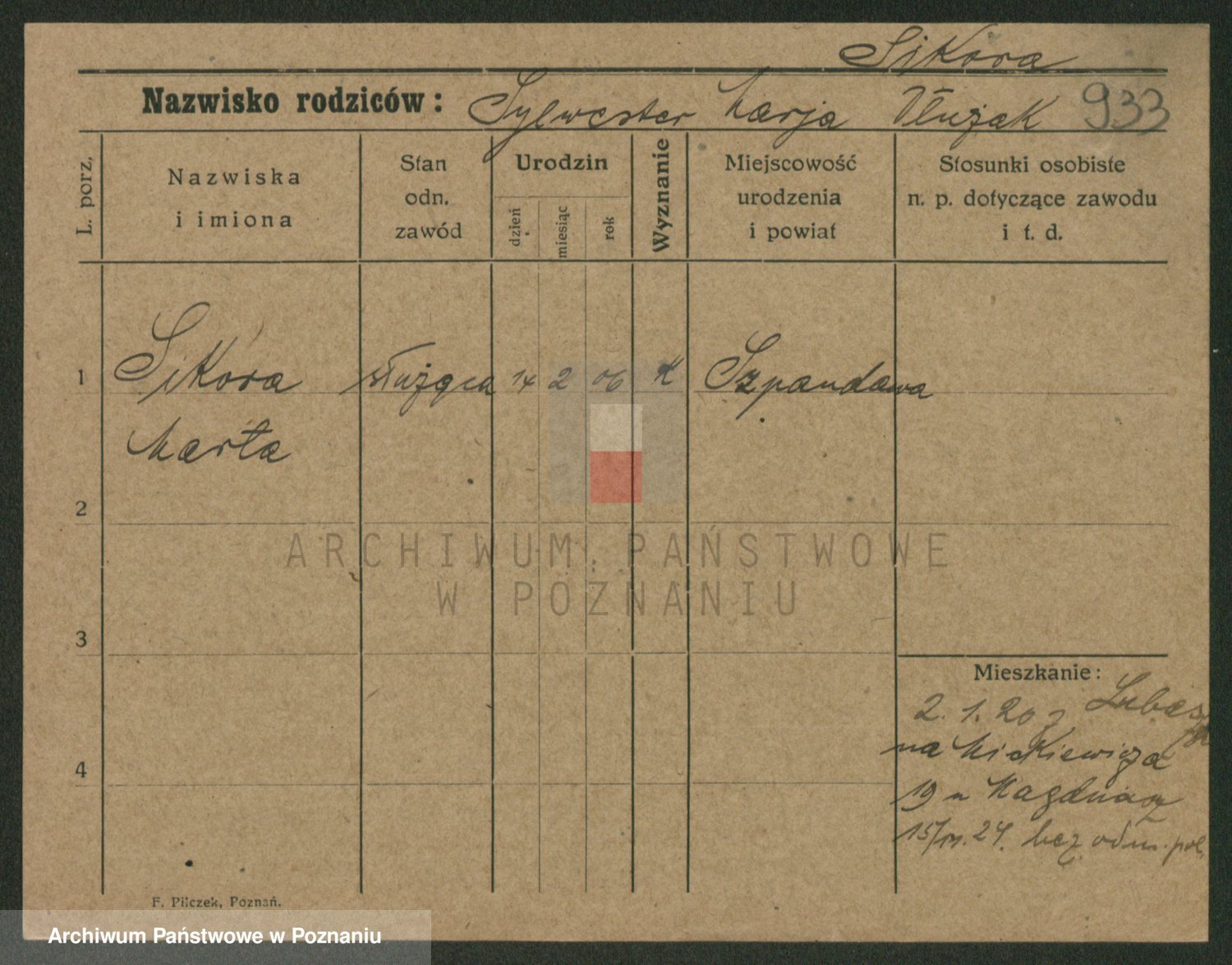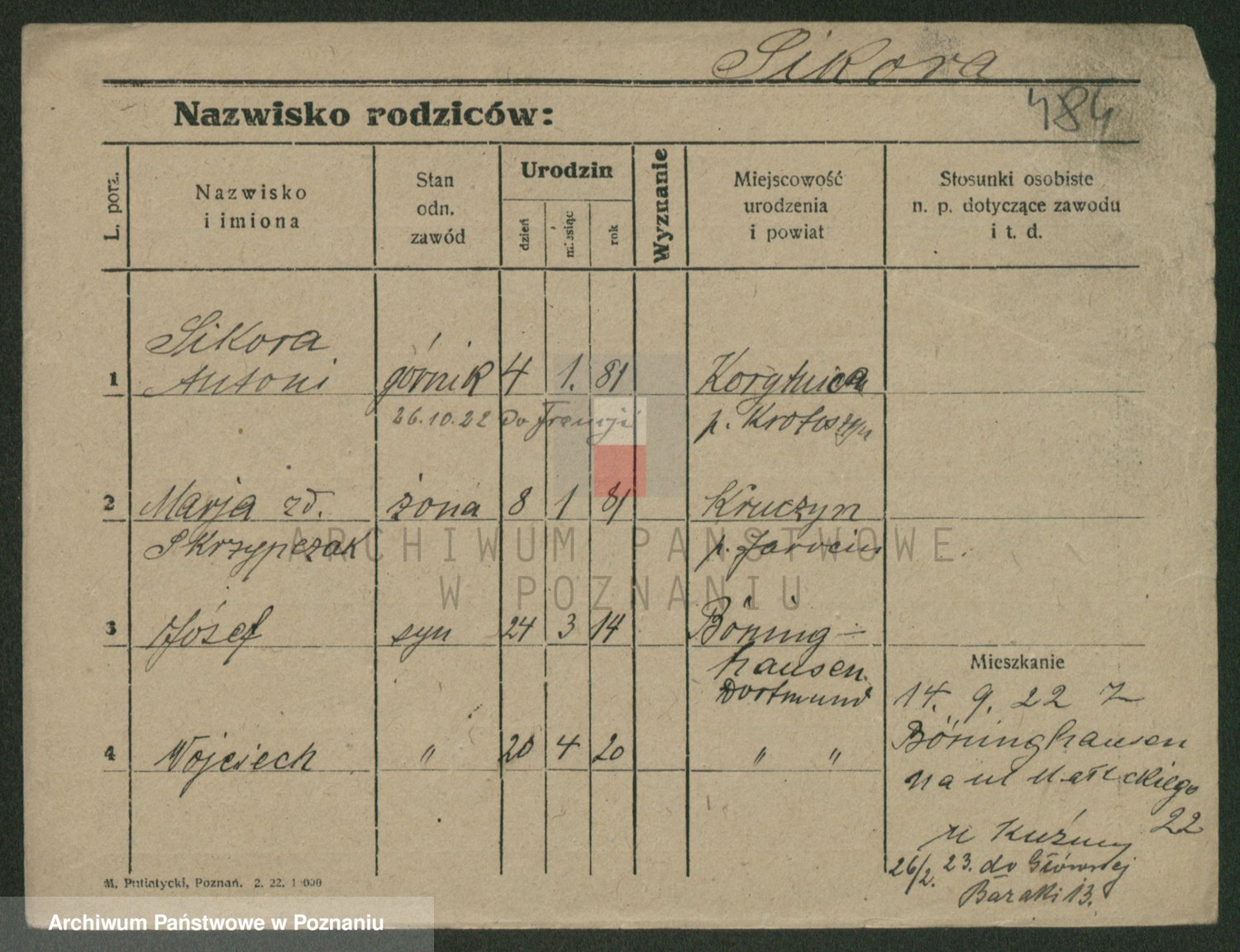 Podgląd karty osobowej dostępny jest po kliknięciu na nazwisko lub ikonkę karty. Można dokonywać powiększenia (ikony na górze) lub przechodzić między kolejnymi skanami (strzałki po bokach).