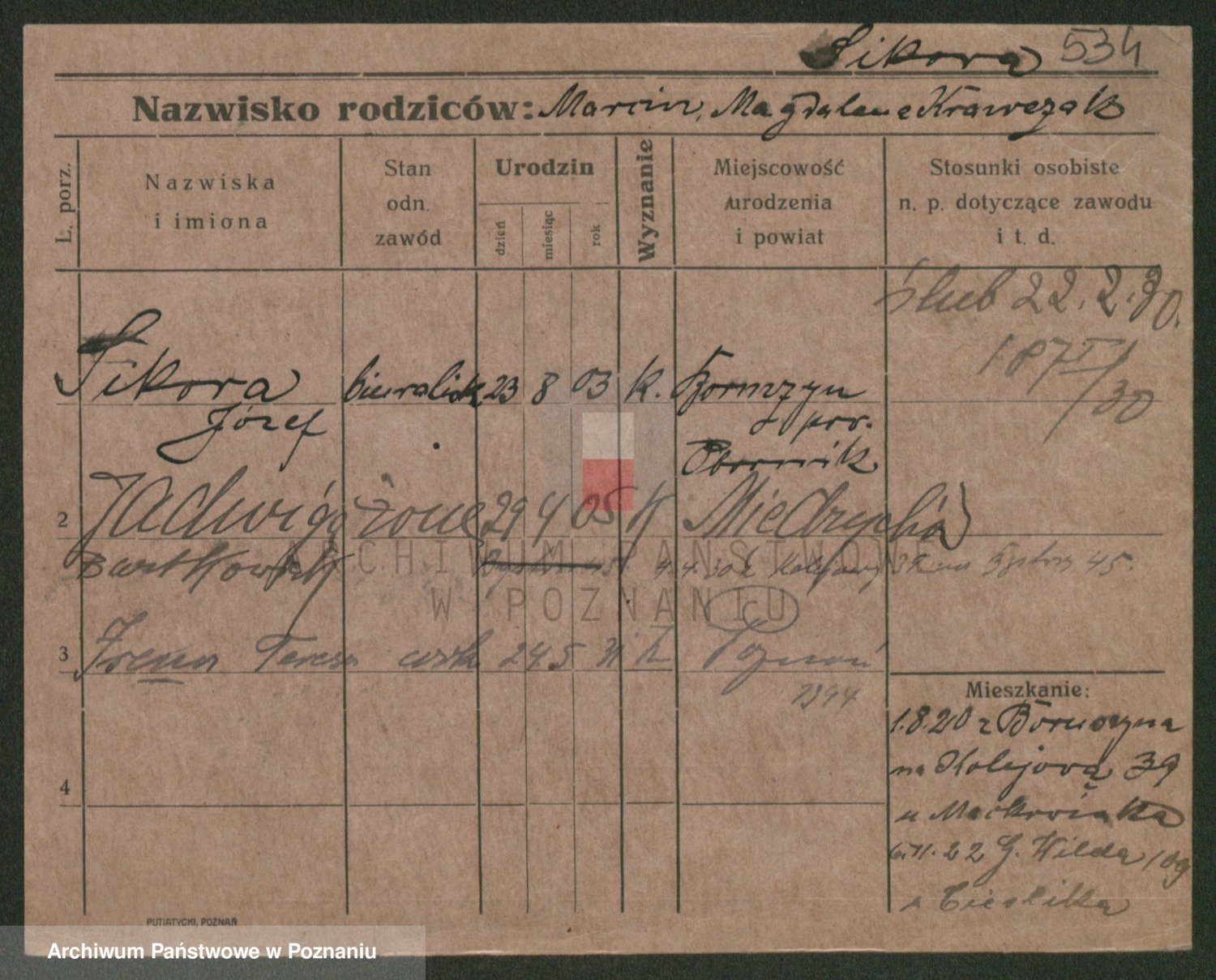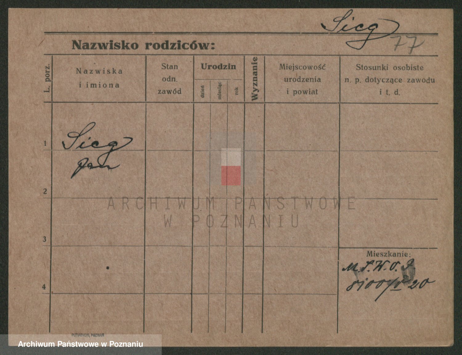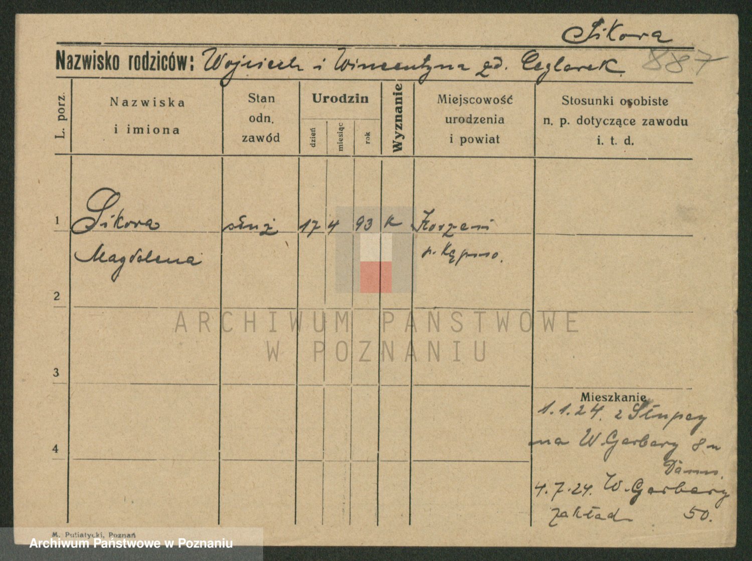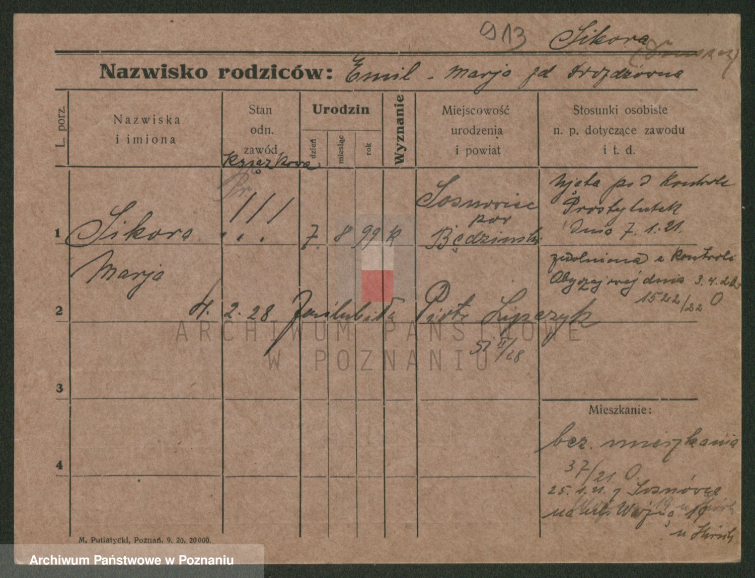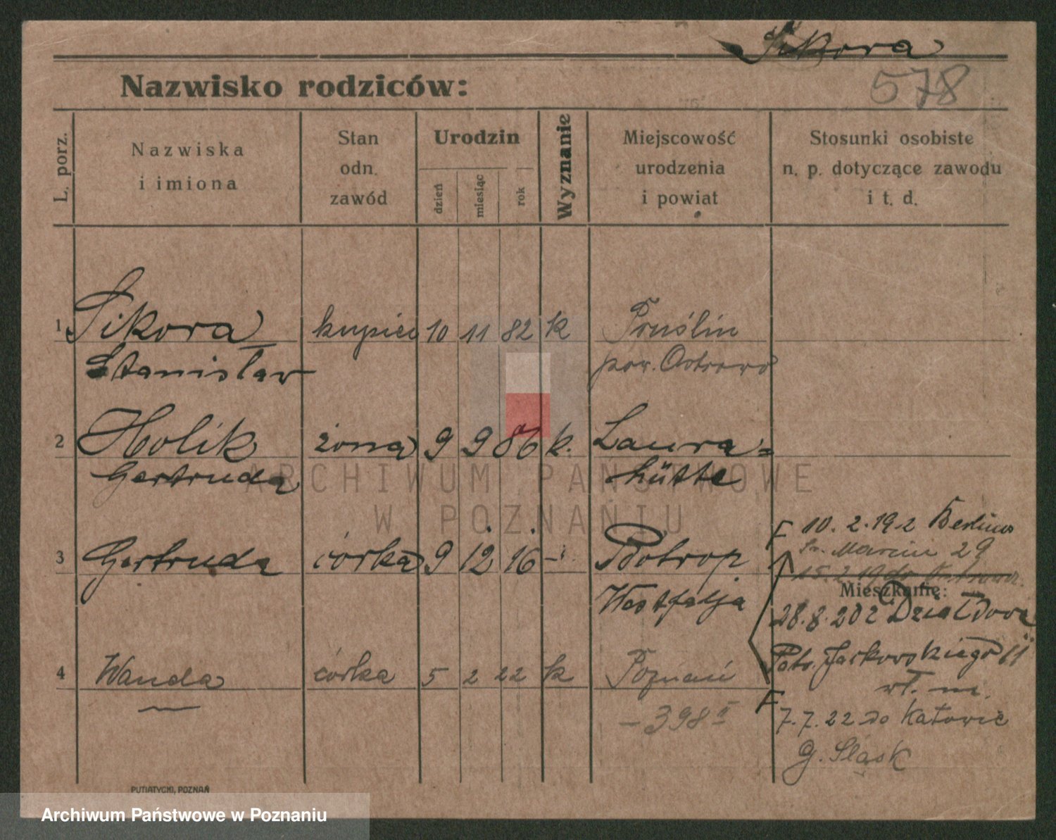 Podgląd karty osobowej dostępny jest po kliknięciu na nazwisko lub ikonkę karty. Można dokonywać powiększenia (ikony na górze) lub przechodzić między kolejnymi skanami (strzałki po bokach).