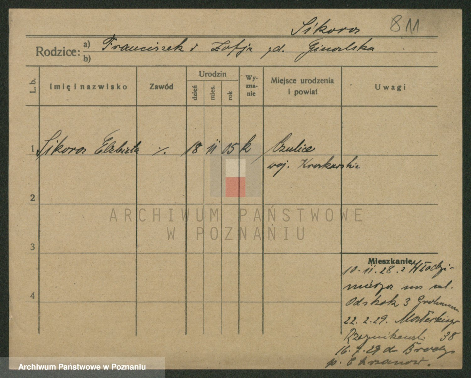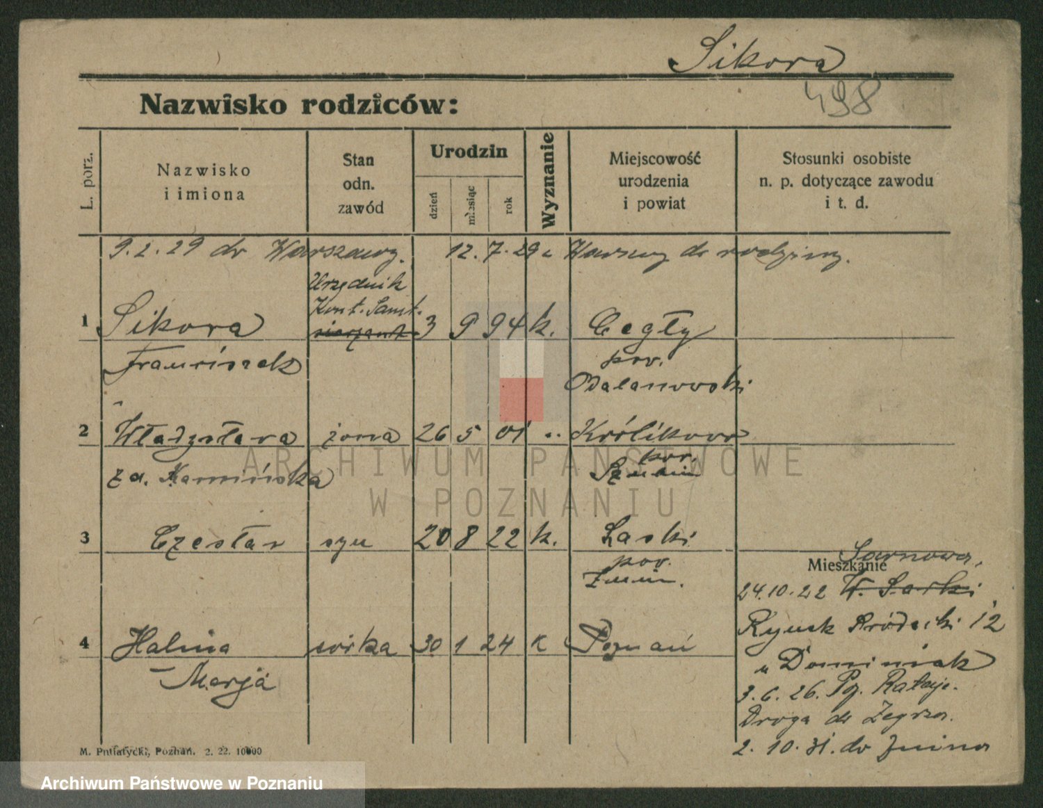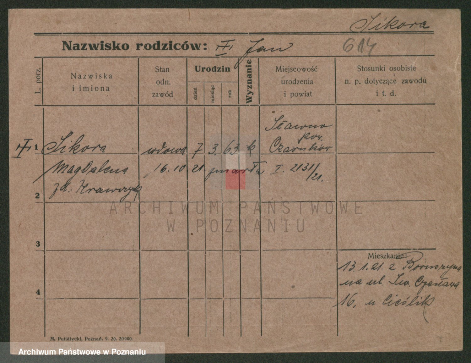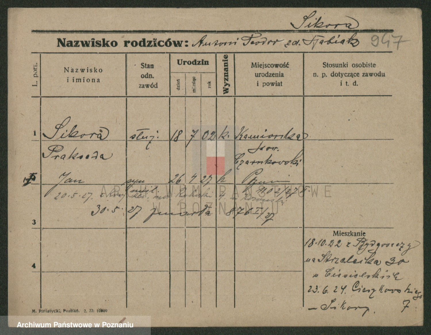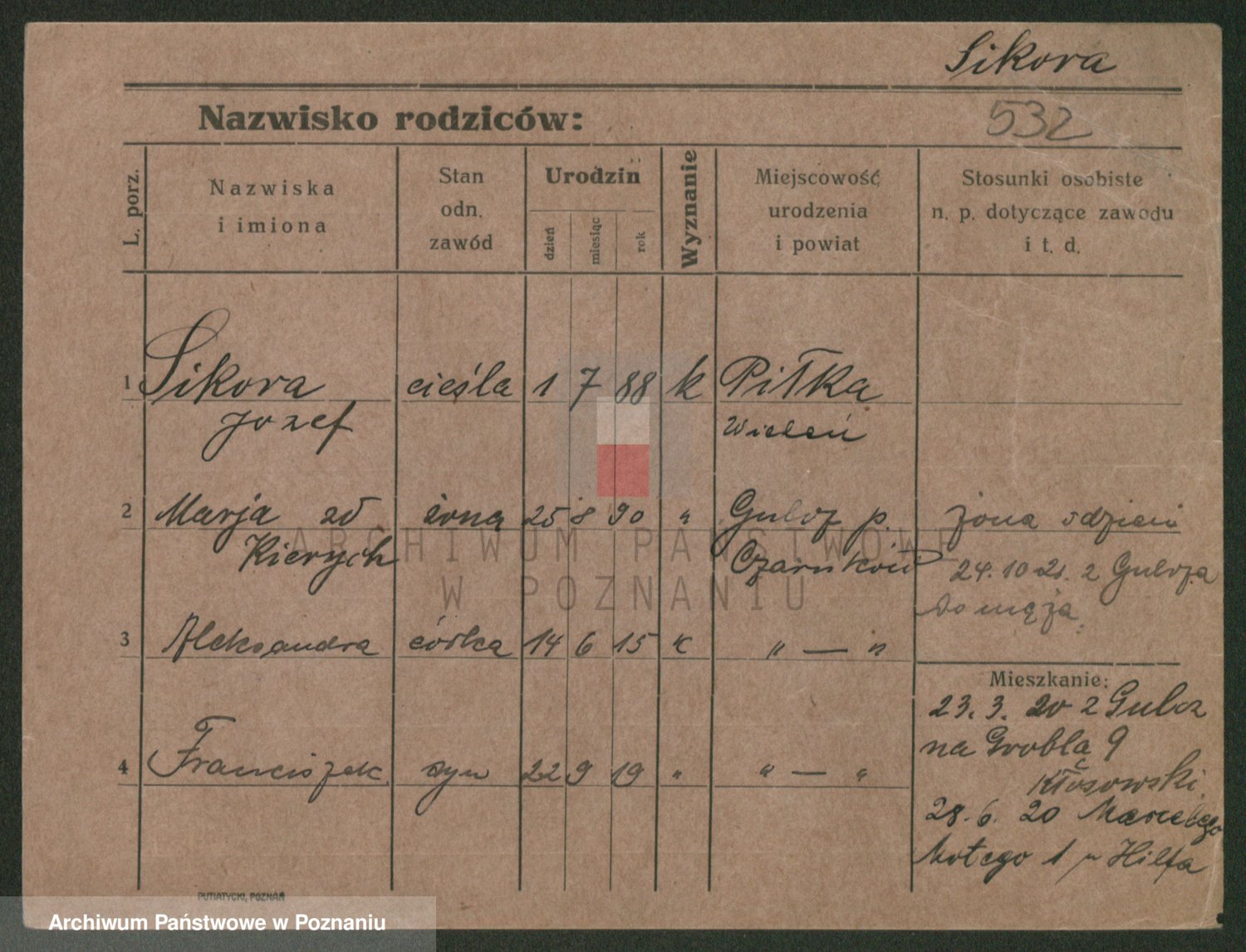 Podgląd karty osobowej dostępny jest po kliknięciu na nazwisko lub ikonkę karty. Można dokonywać powiększenia (ikony na górze) lub przechodzić między kolejnymi skanami (strzałki po bokach).