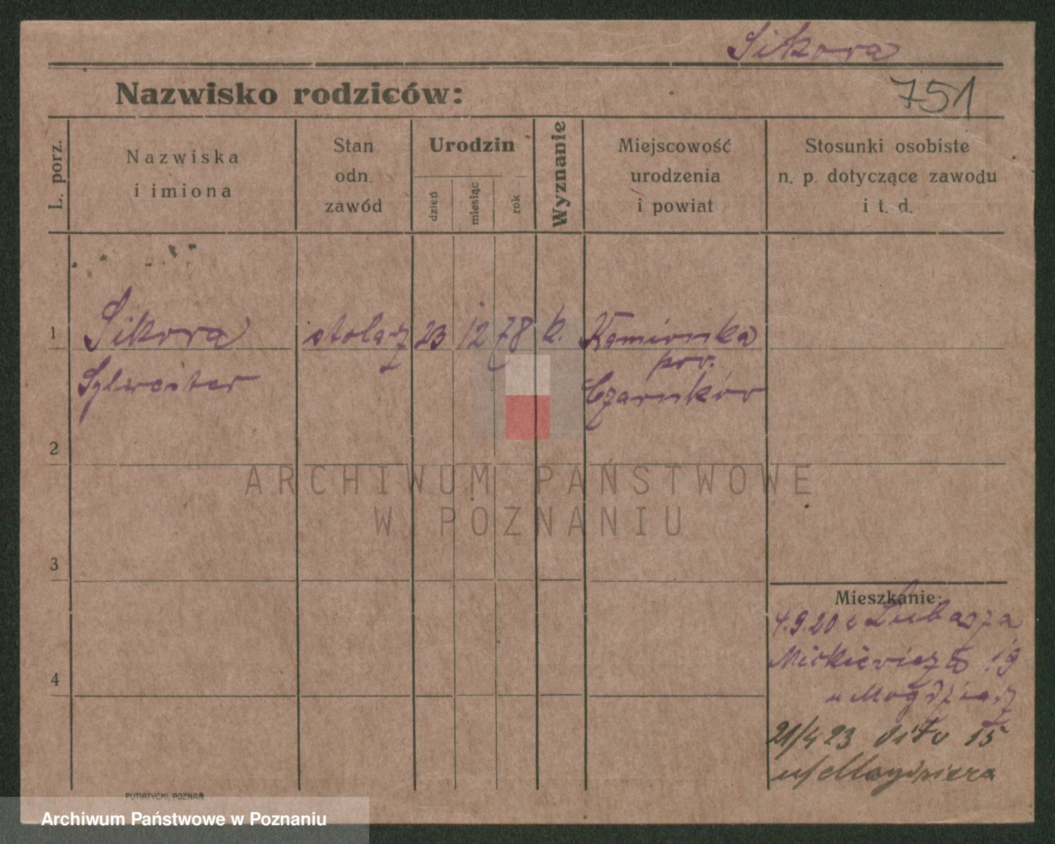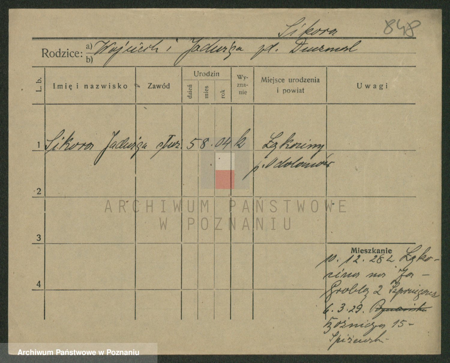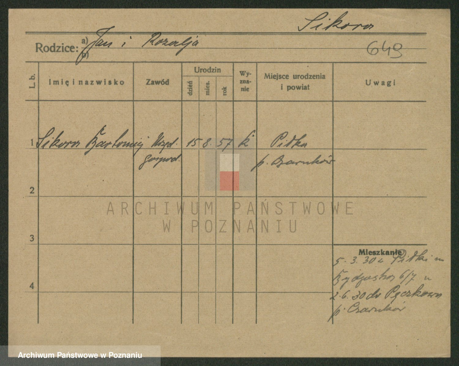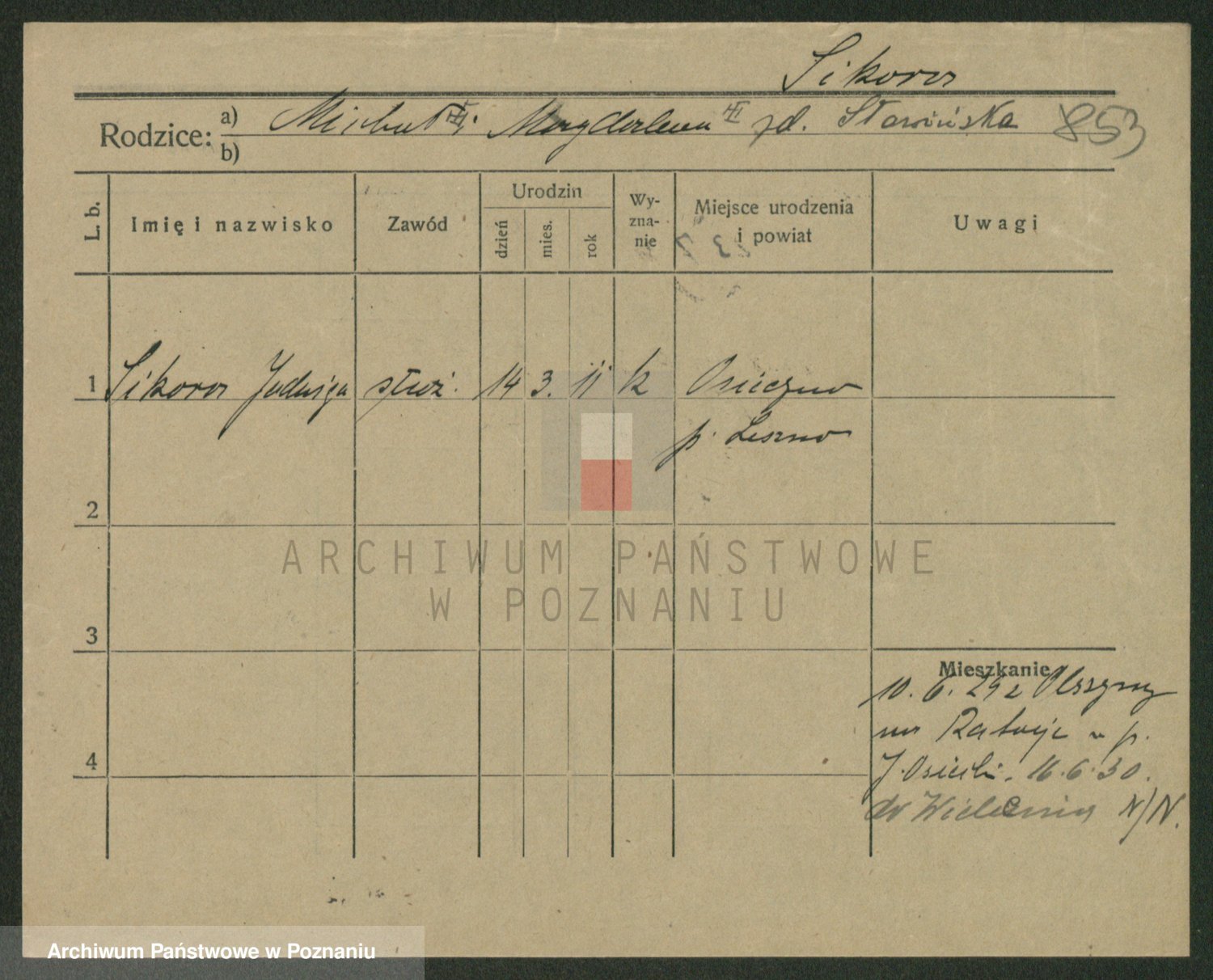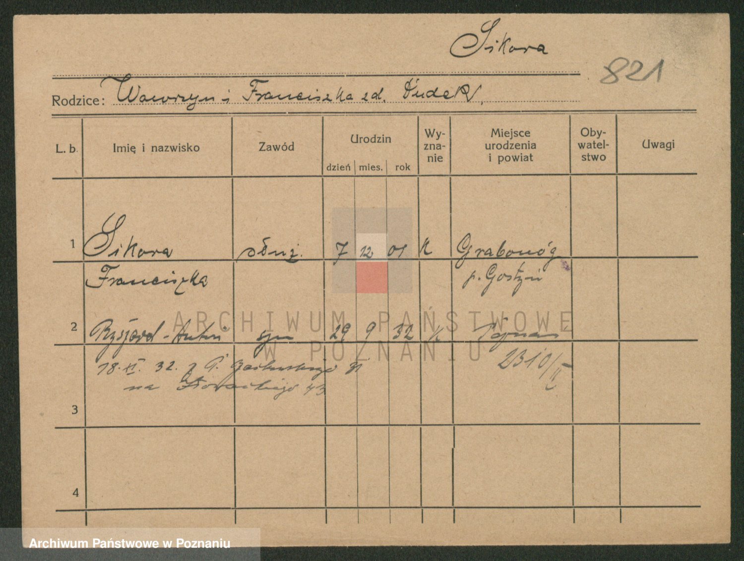 Podgląd karty osobowej dostępny jest po kliknięciu na nazwisko lub ikonkę karty. Można dokonywać powiększenia (ikony na górze) lub przechodzić między kolejnymi skanami (strzałki po bokach).