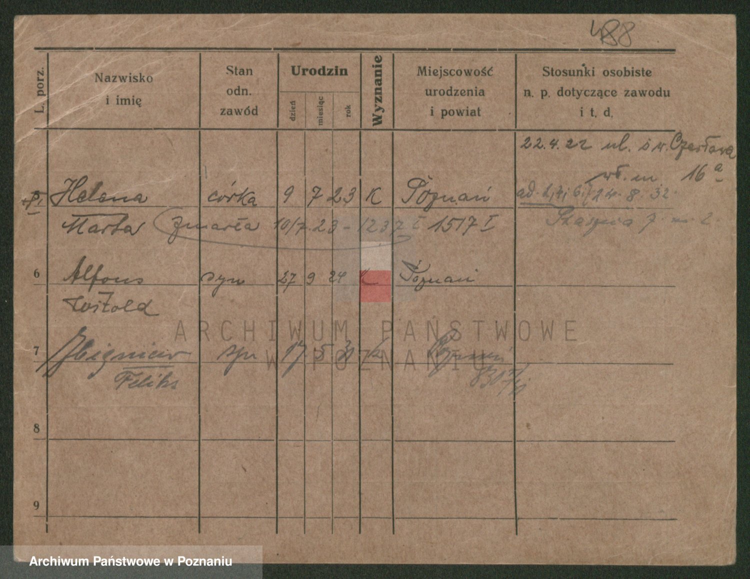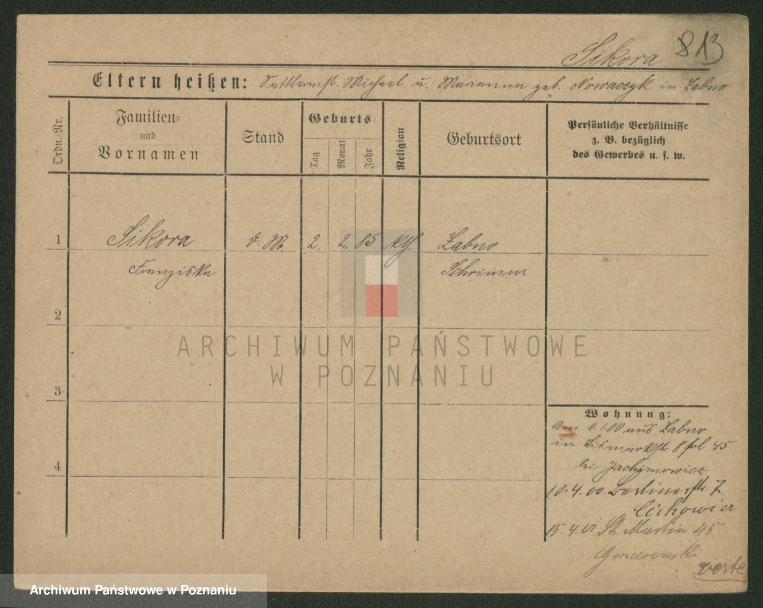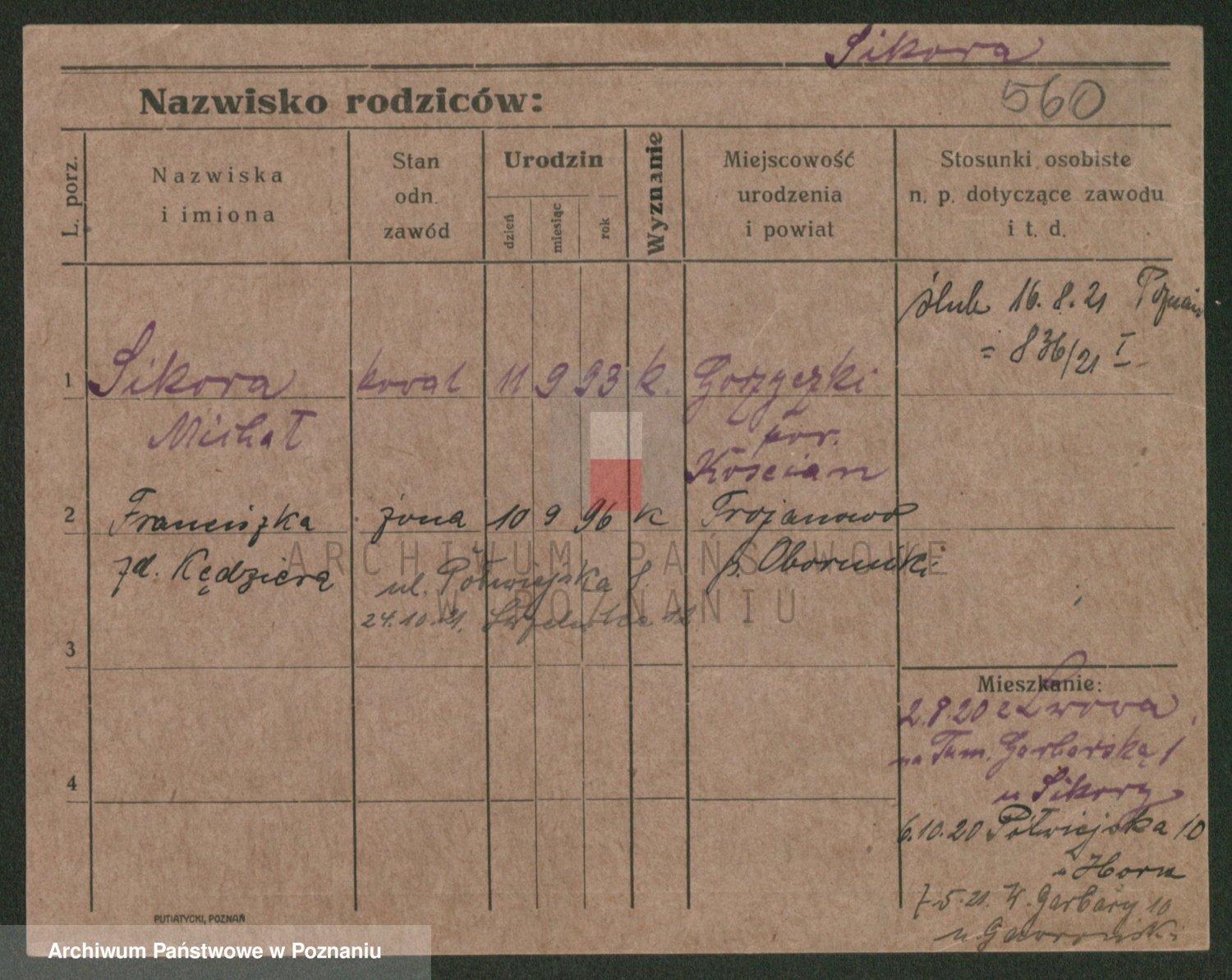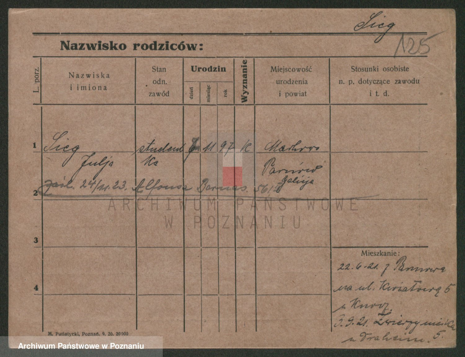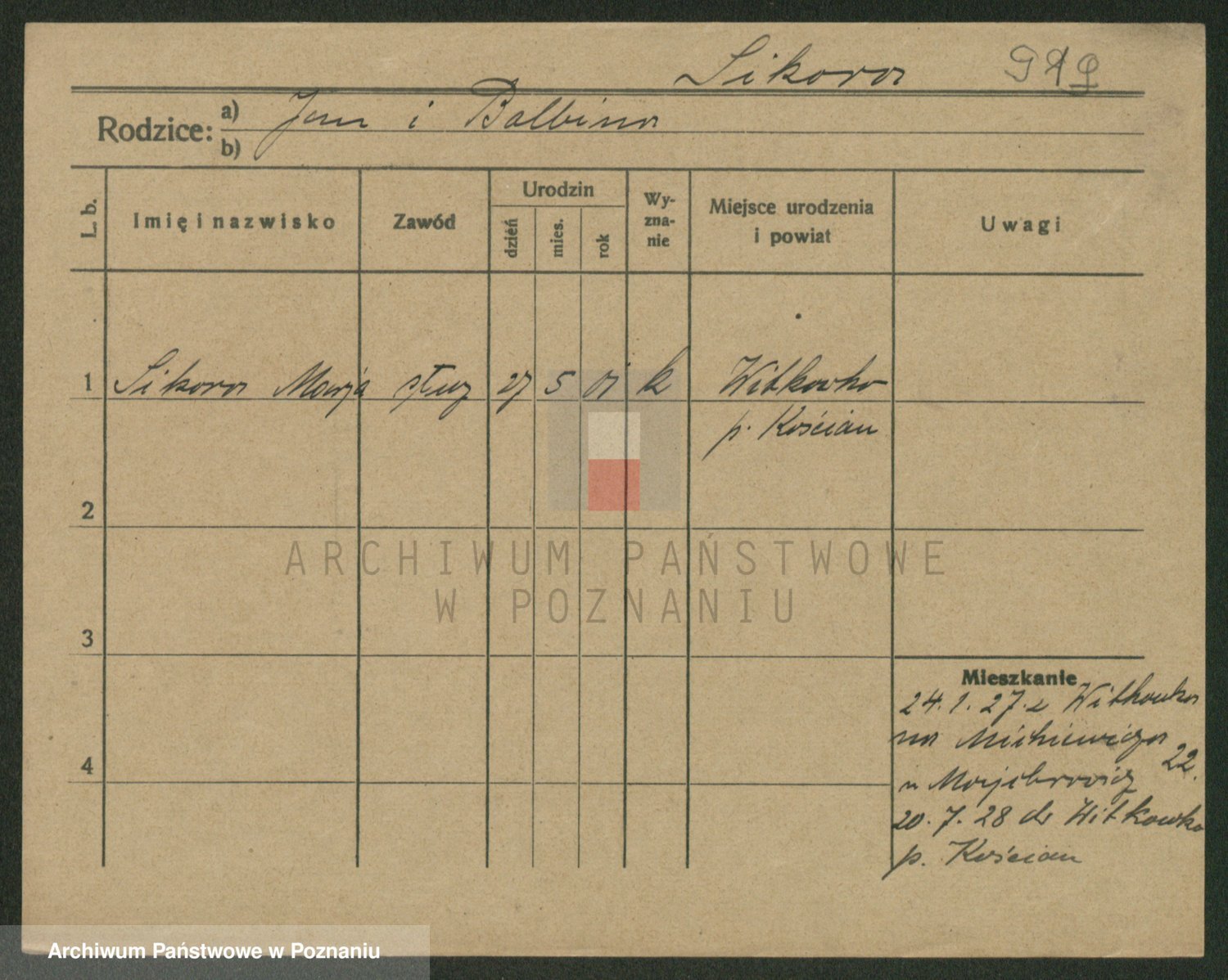 Podgląd karty osobowej dostępny jest po kliknięciu na nazwisko lub ikonkę karty. Można dokonywać powiększenia (ikony na górze) lub przechodzić między kolejnymi skanami (strzałki po bokach).