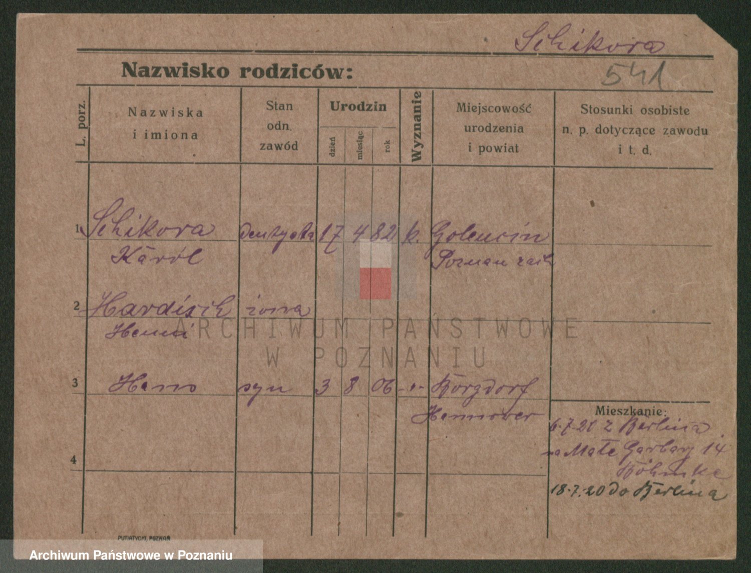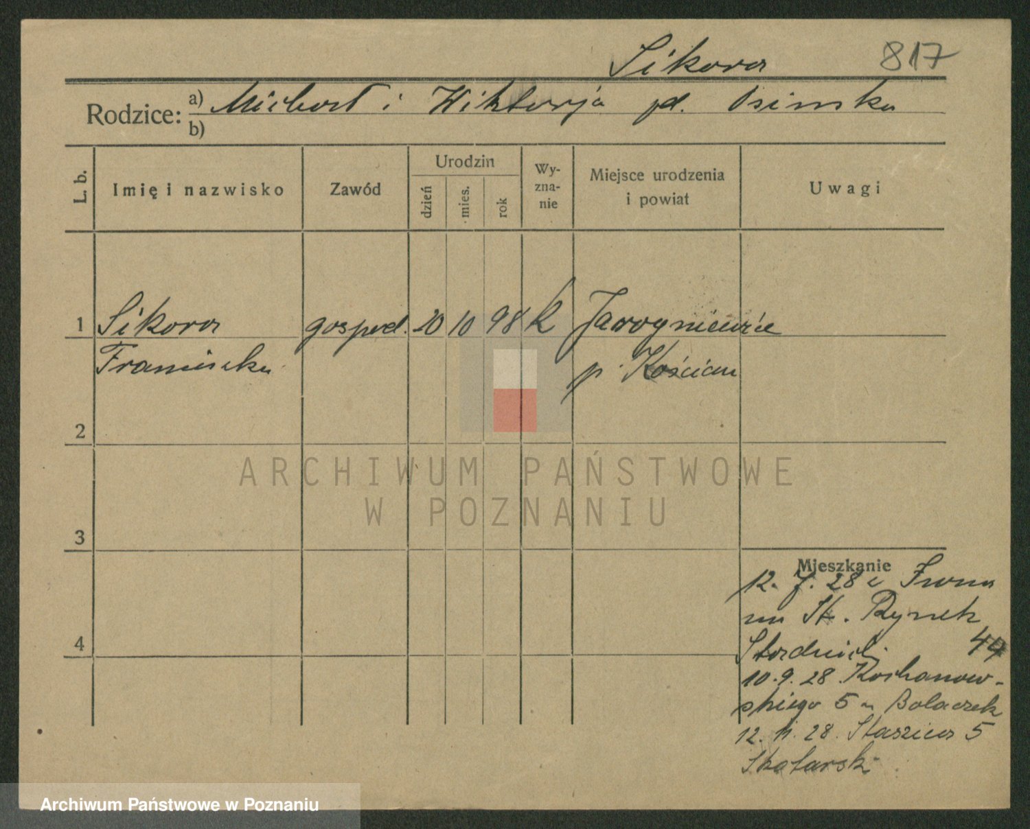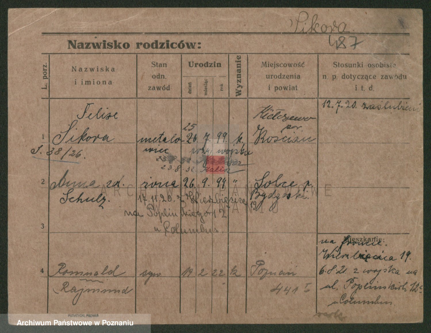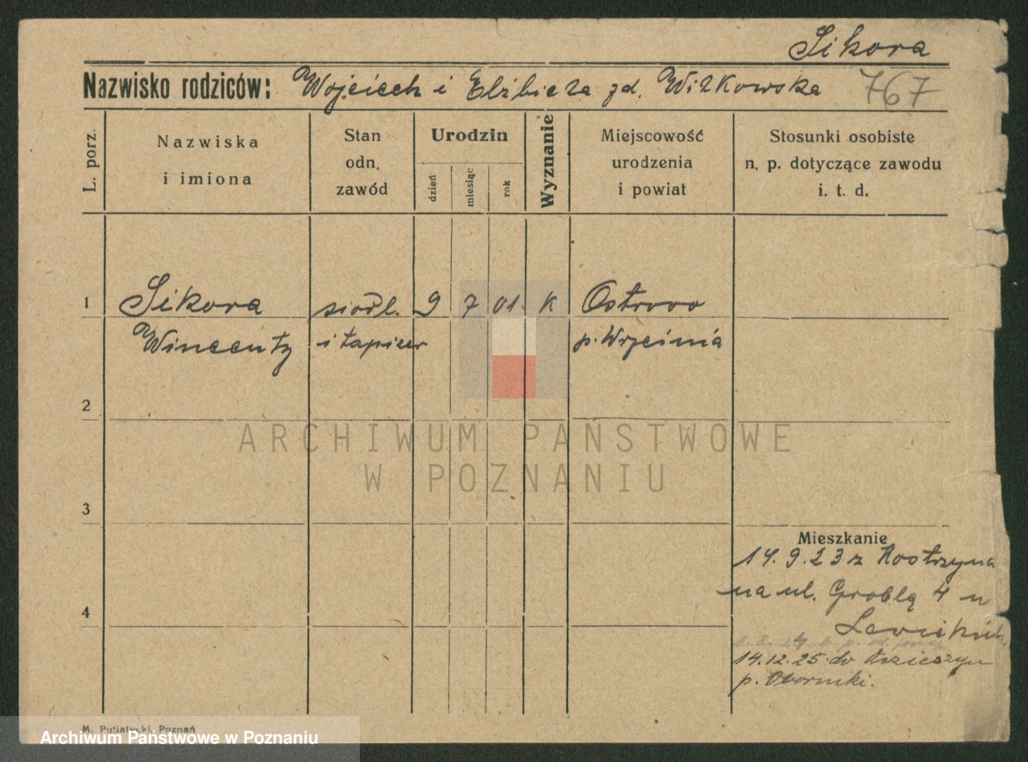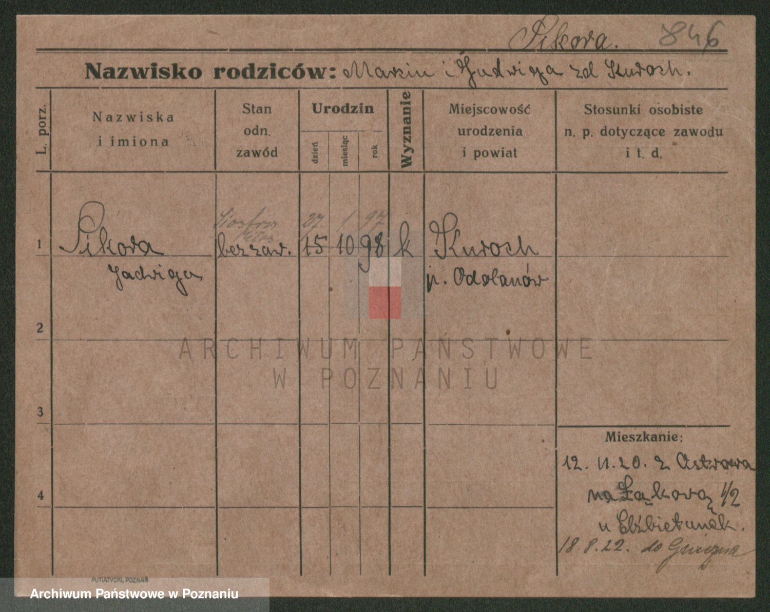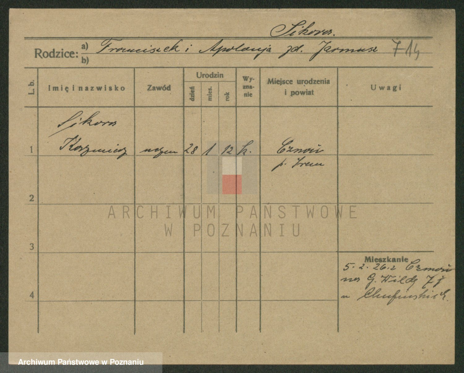 Podgląd karty osobowej dostępny jest po kliknięciu na nazwisko lub ikonkę karty. Można dokonywać powiększenia (ikony na górze) lub przechodzić między kolejnymi skanami (strzałki po bokach).