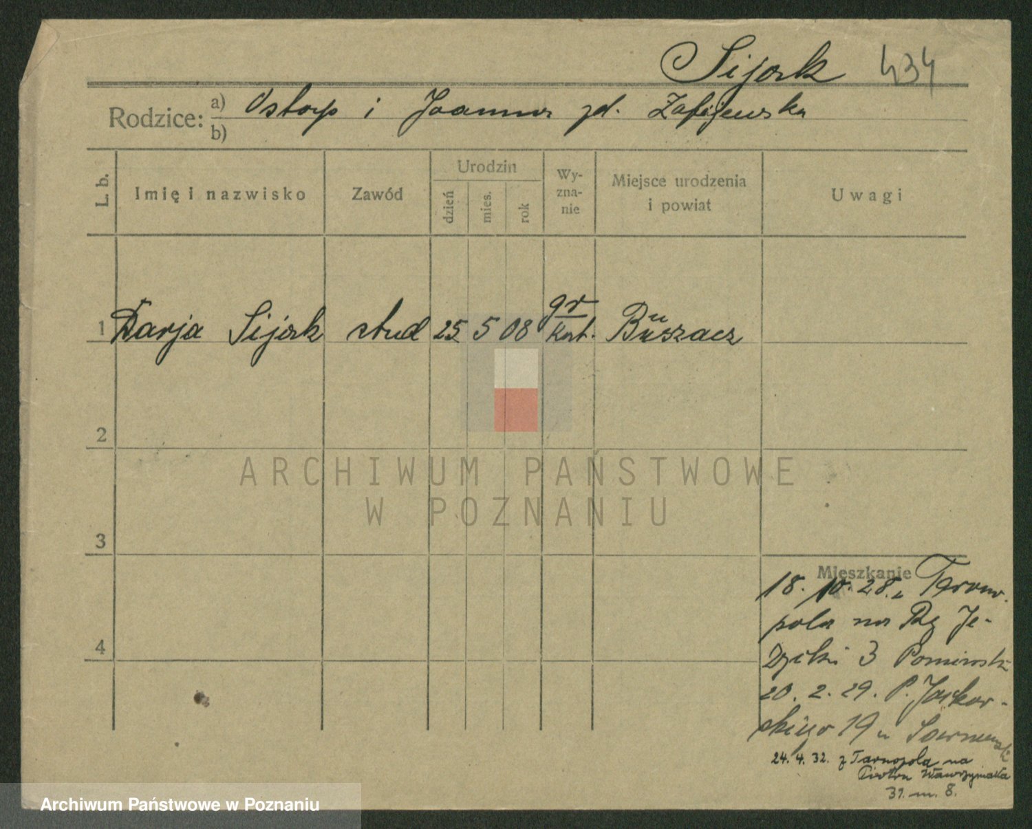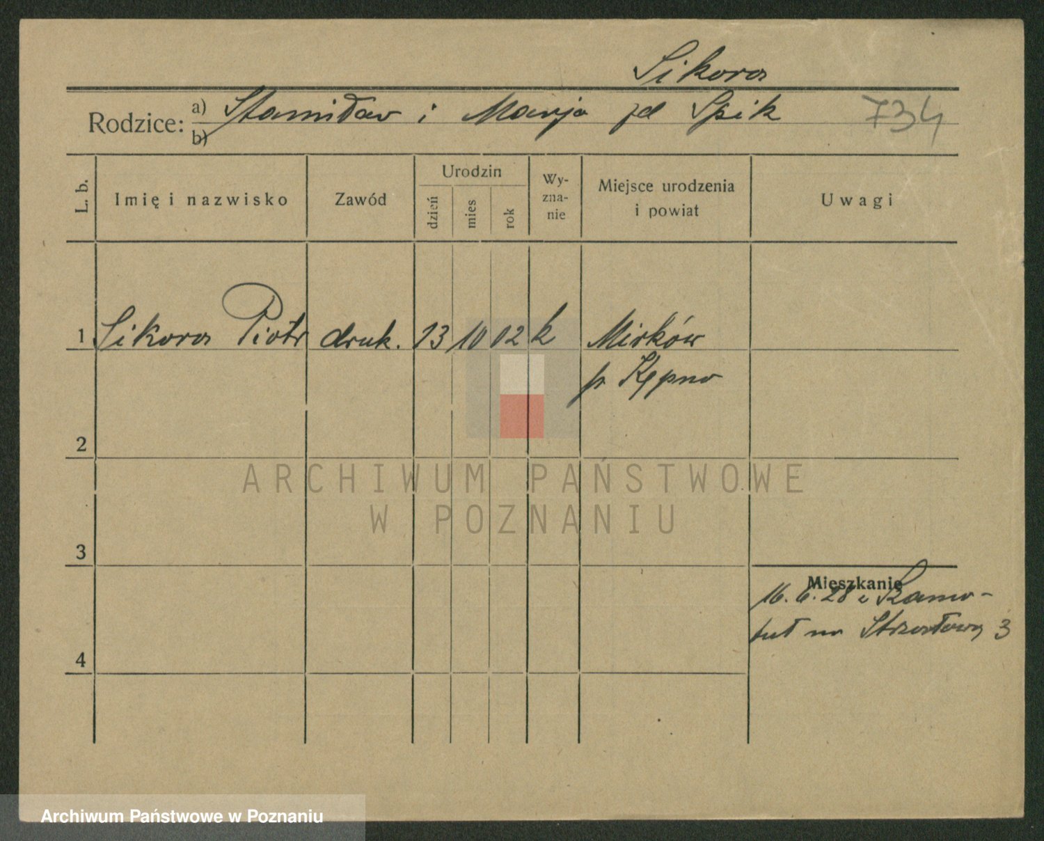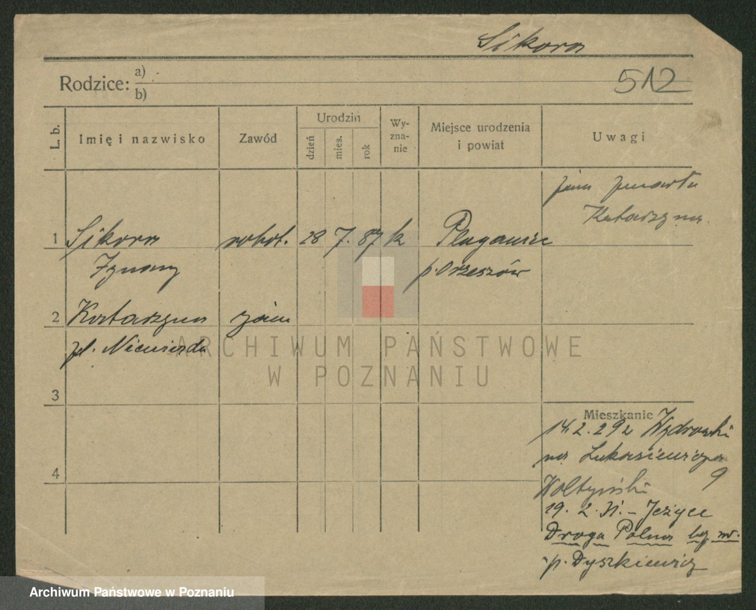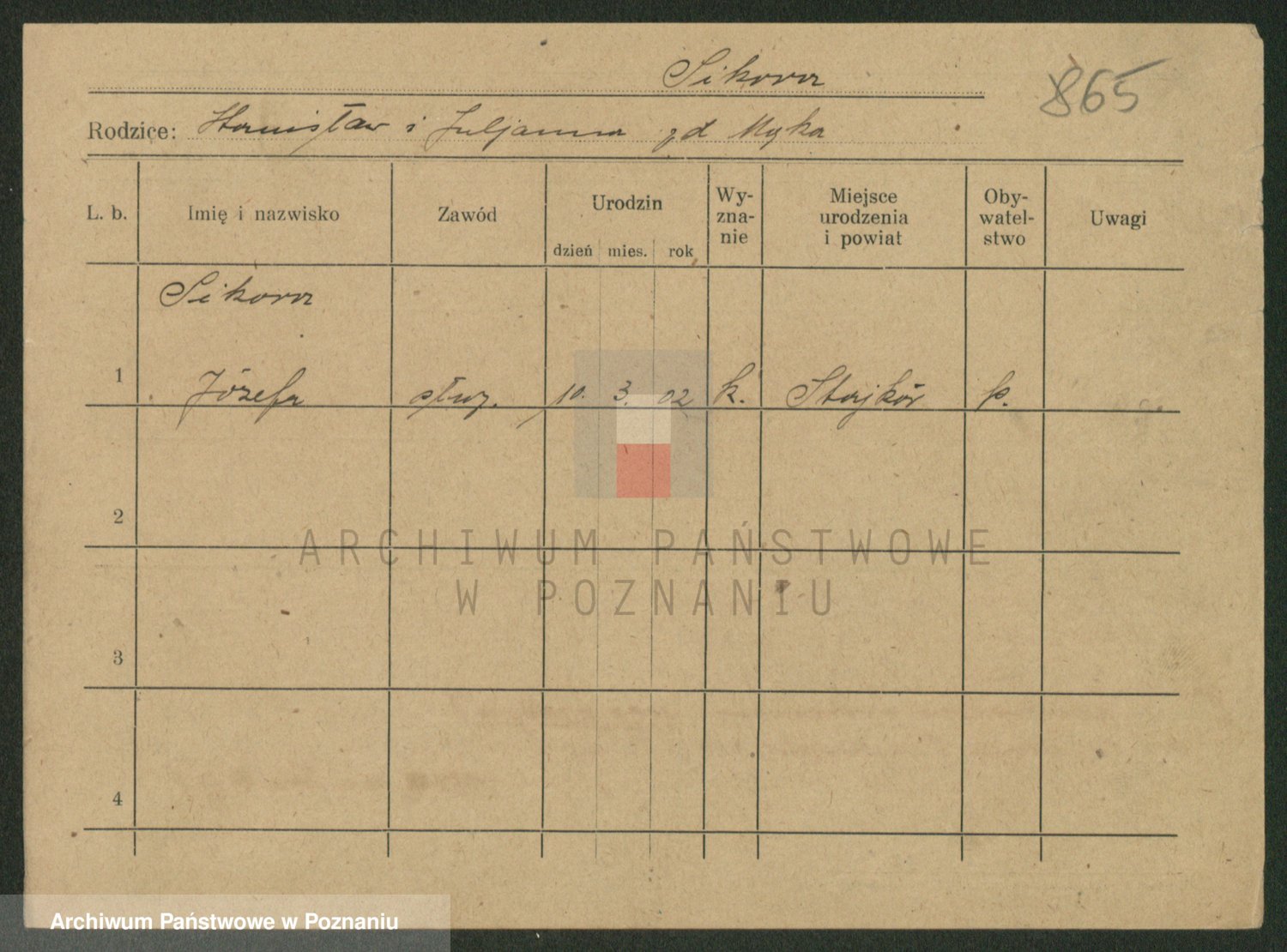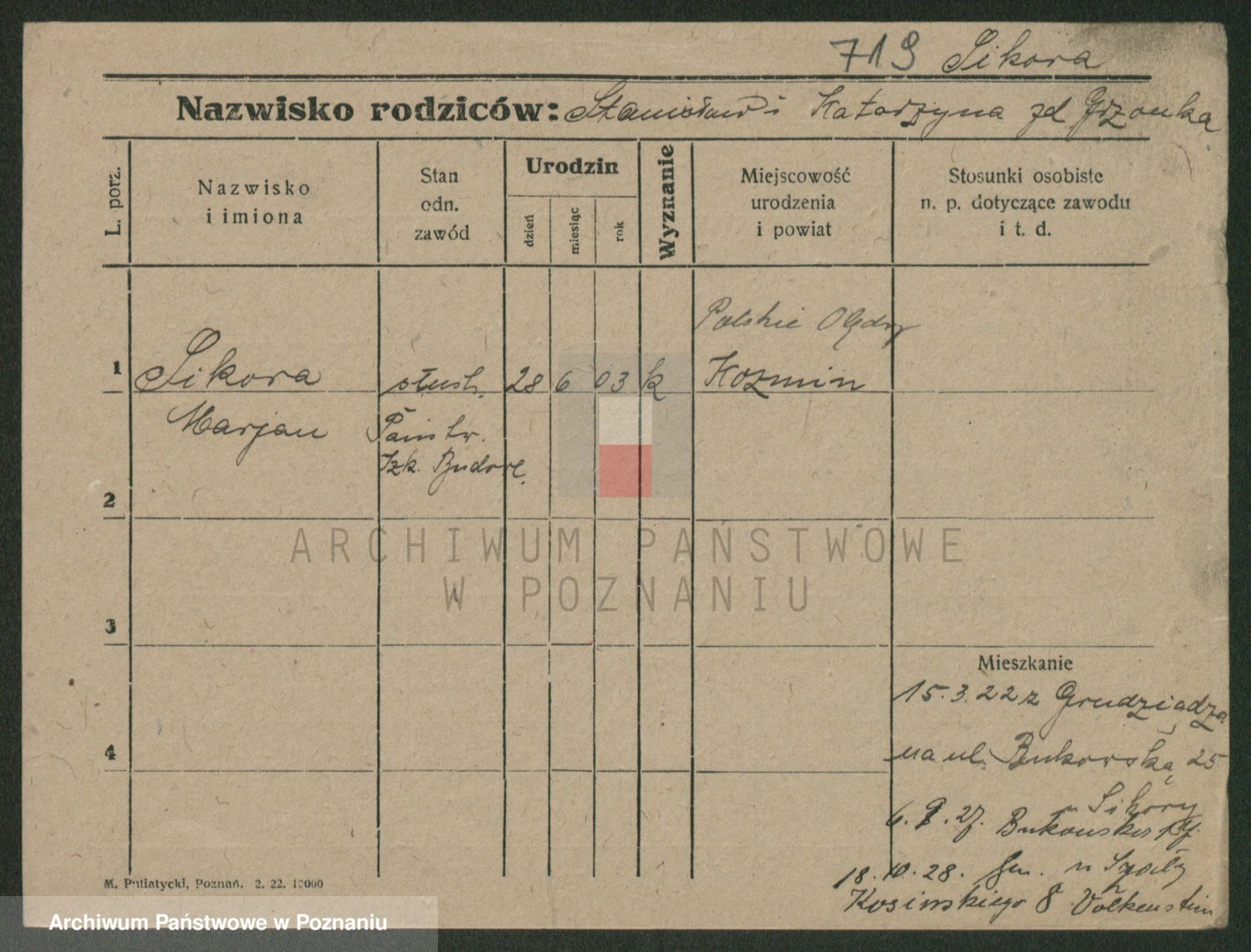 Podgląd karty osobowej dostępny jest po kliknięciu na nazwisko lub ikonkę karty. Można dokonywać powiększenia (ikony na górze) lub przechodzić między kolejnymi skanami (strzałki po bokach).