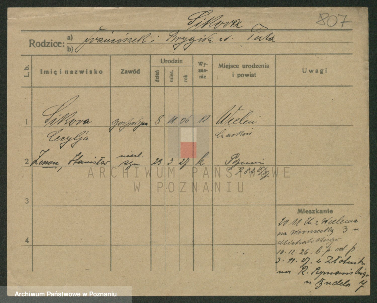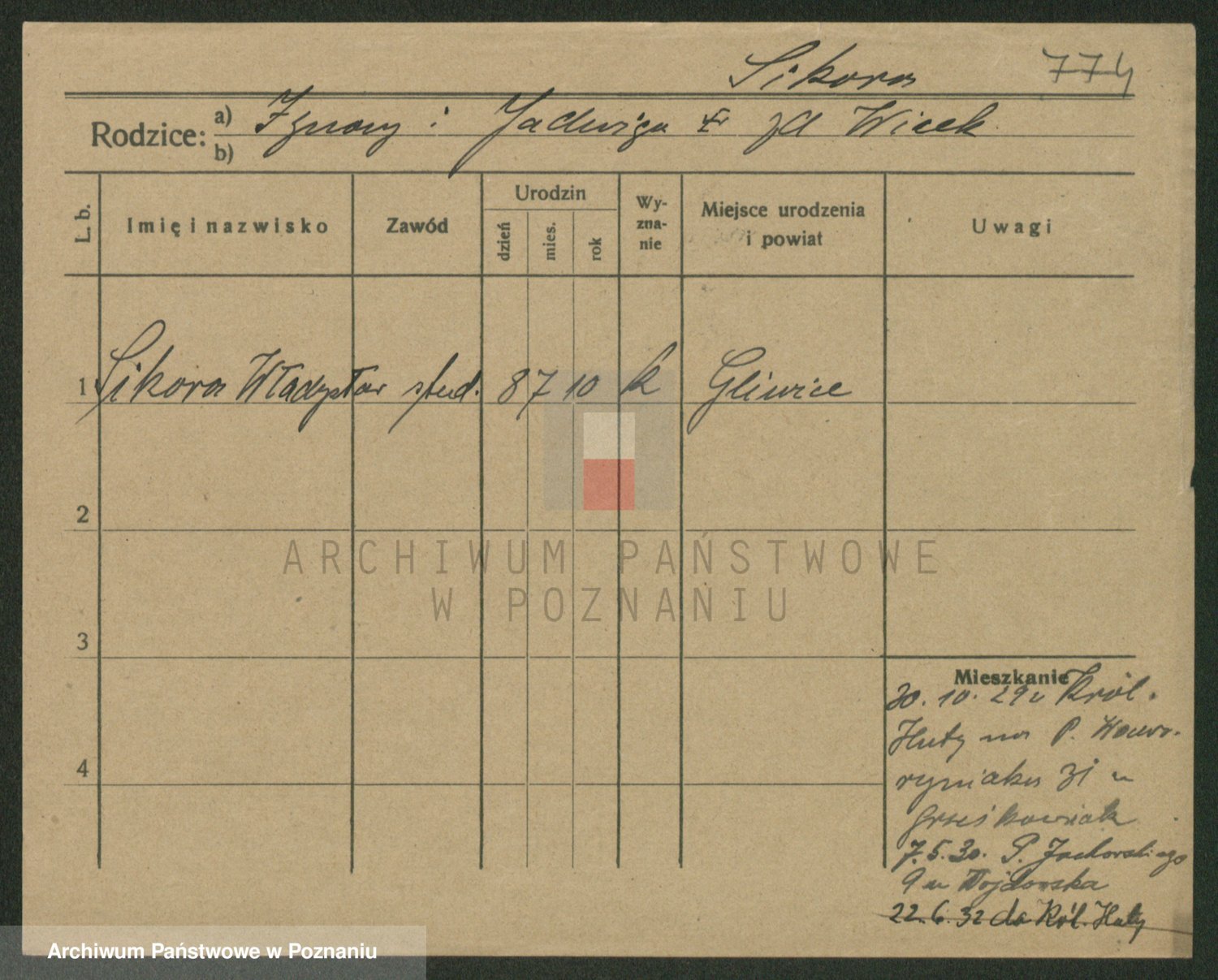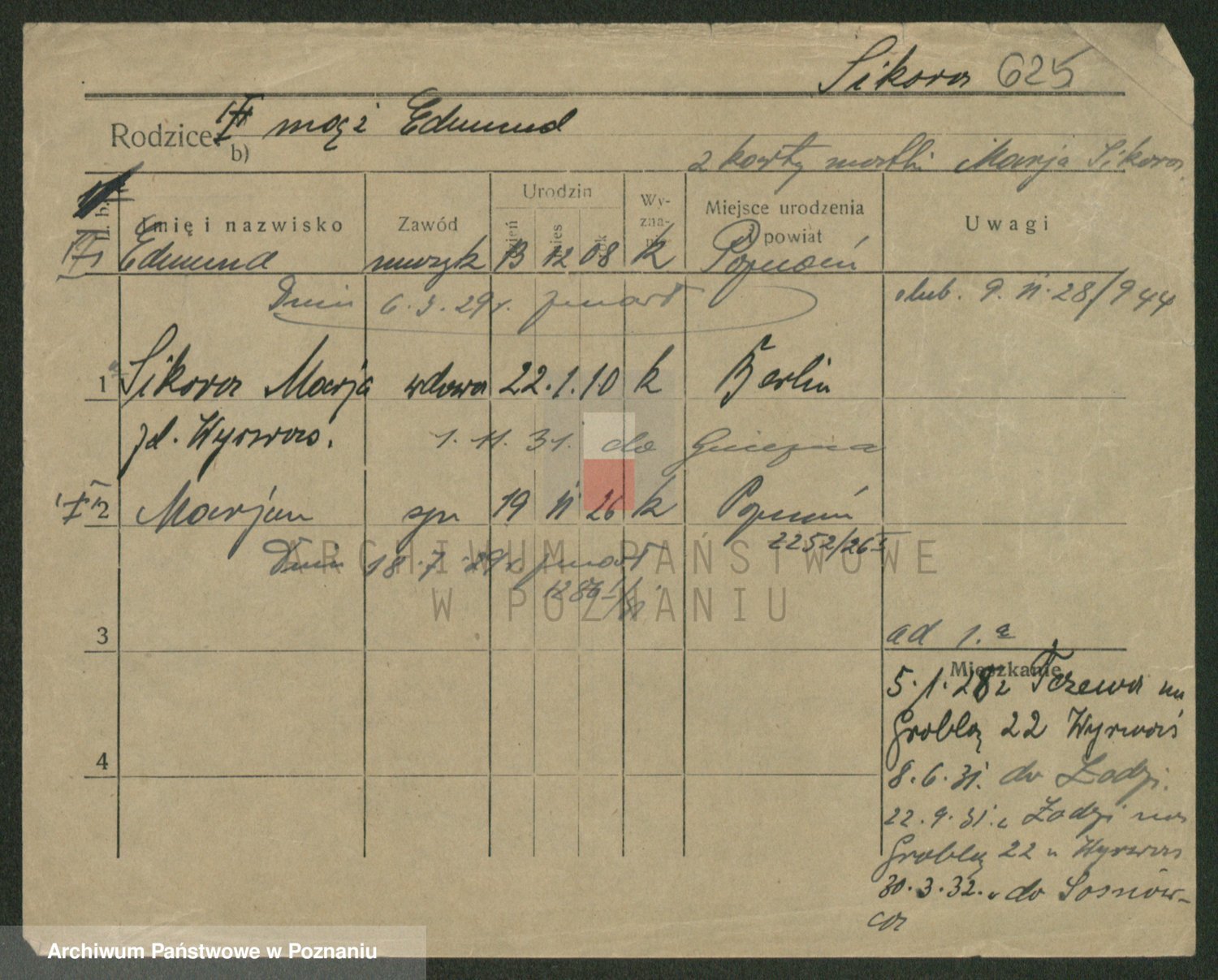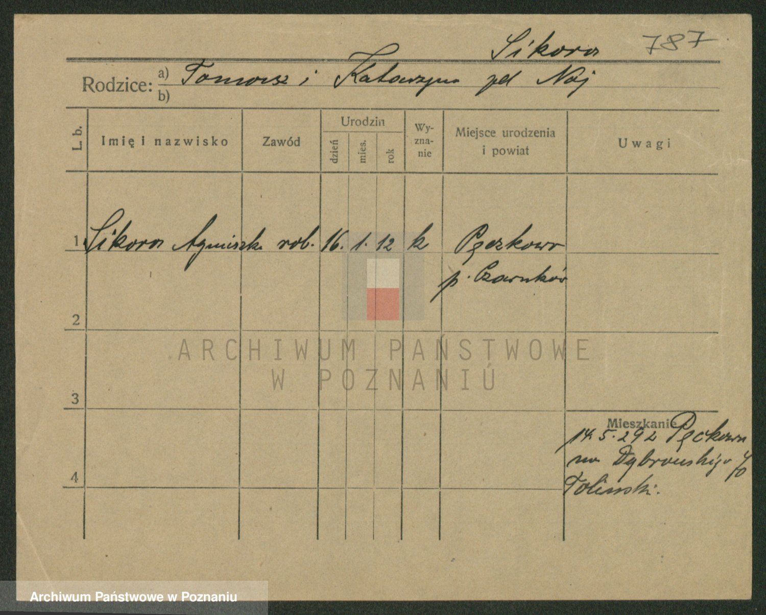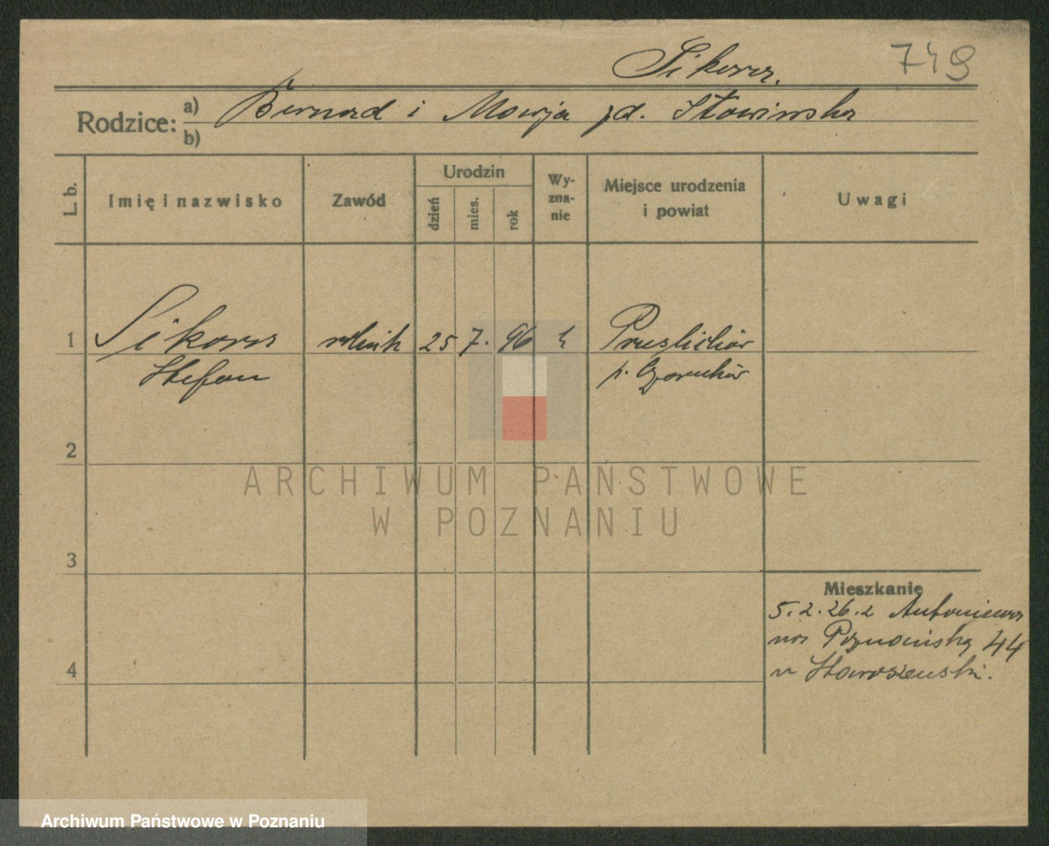 Podgląd karty osobowej dostępny jest po kliknięciu na nazwisko lub ikonkę karty. Można dokonywać powiększenia (ikony na górze) lub przechodzić między kolejnymi skanami (strzałki po bokach).