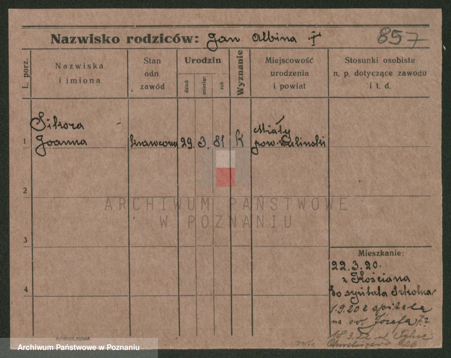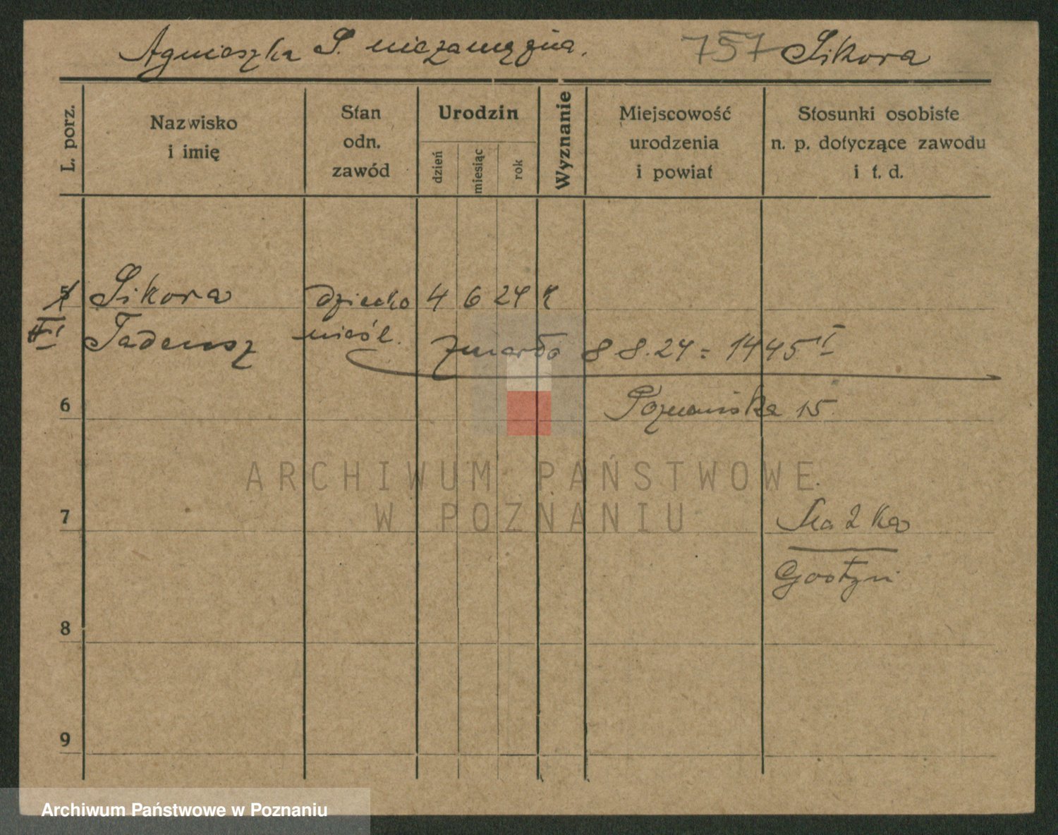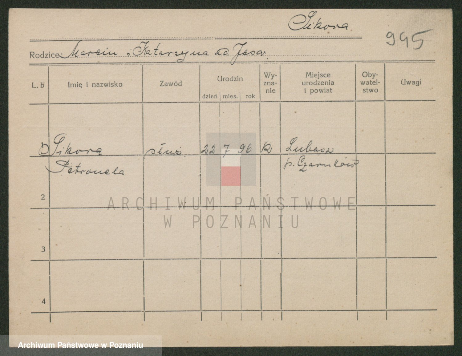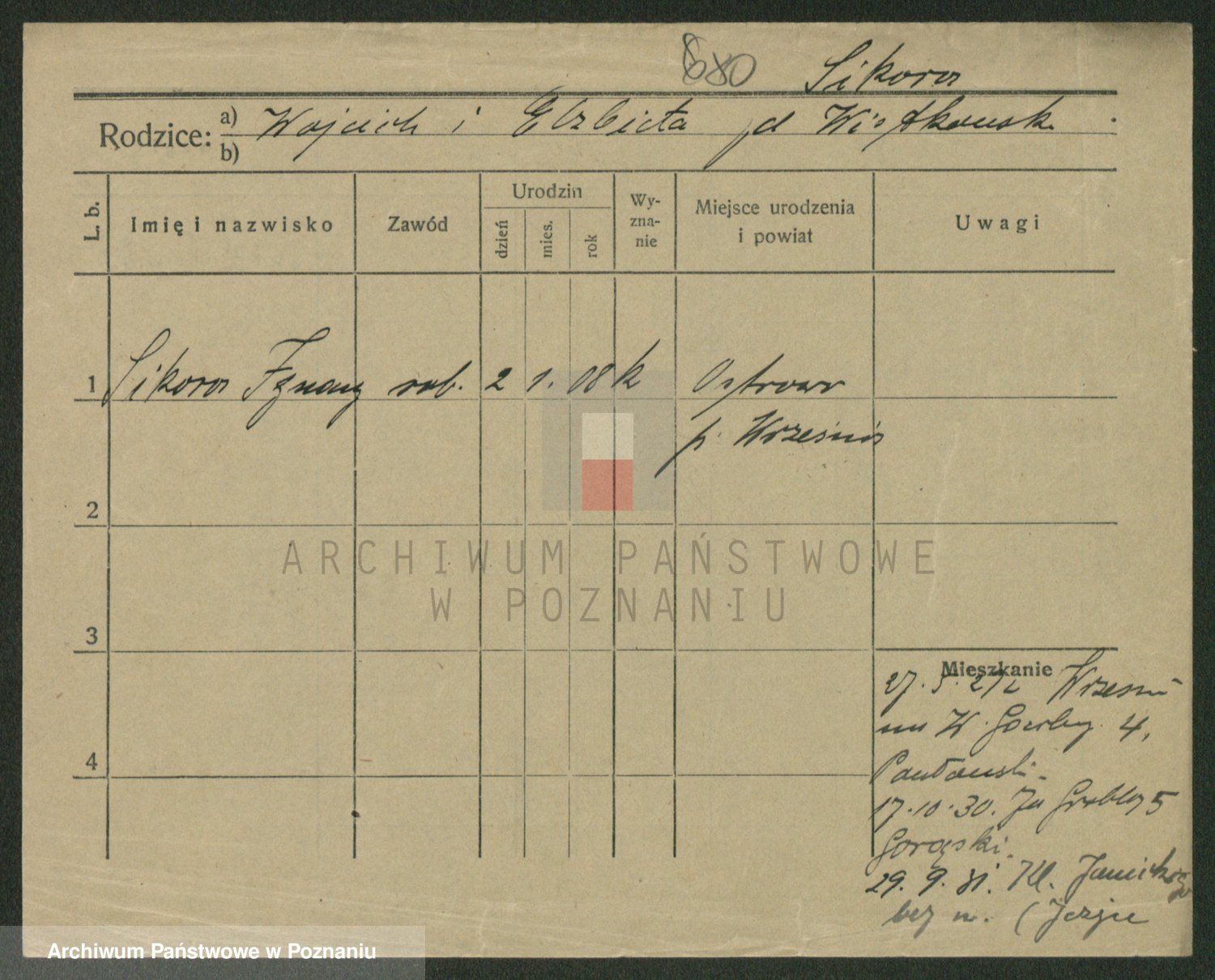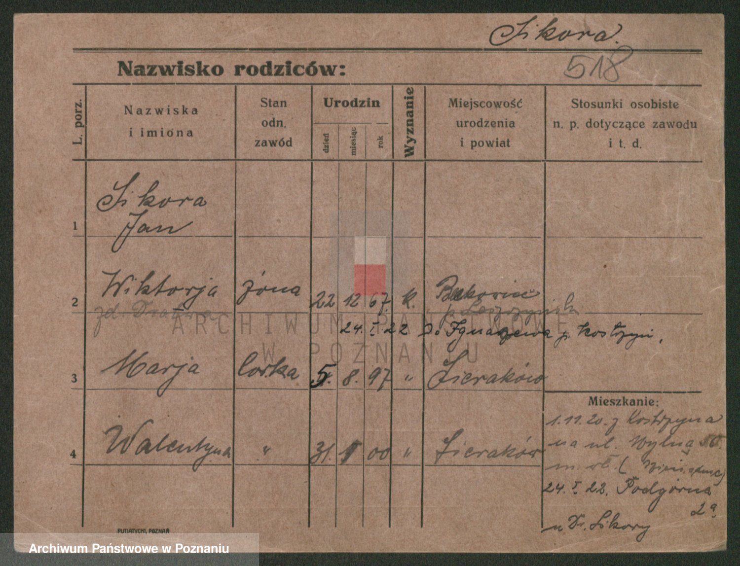 Podgląd karty osobowej dostępny jest po kliknięciu na nazwisko lub ikonkę karty. Można dokonywać powiększenia (ikony na górze) lub przechodzić między kolejnymi skanami (strzałki po bokach).